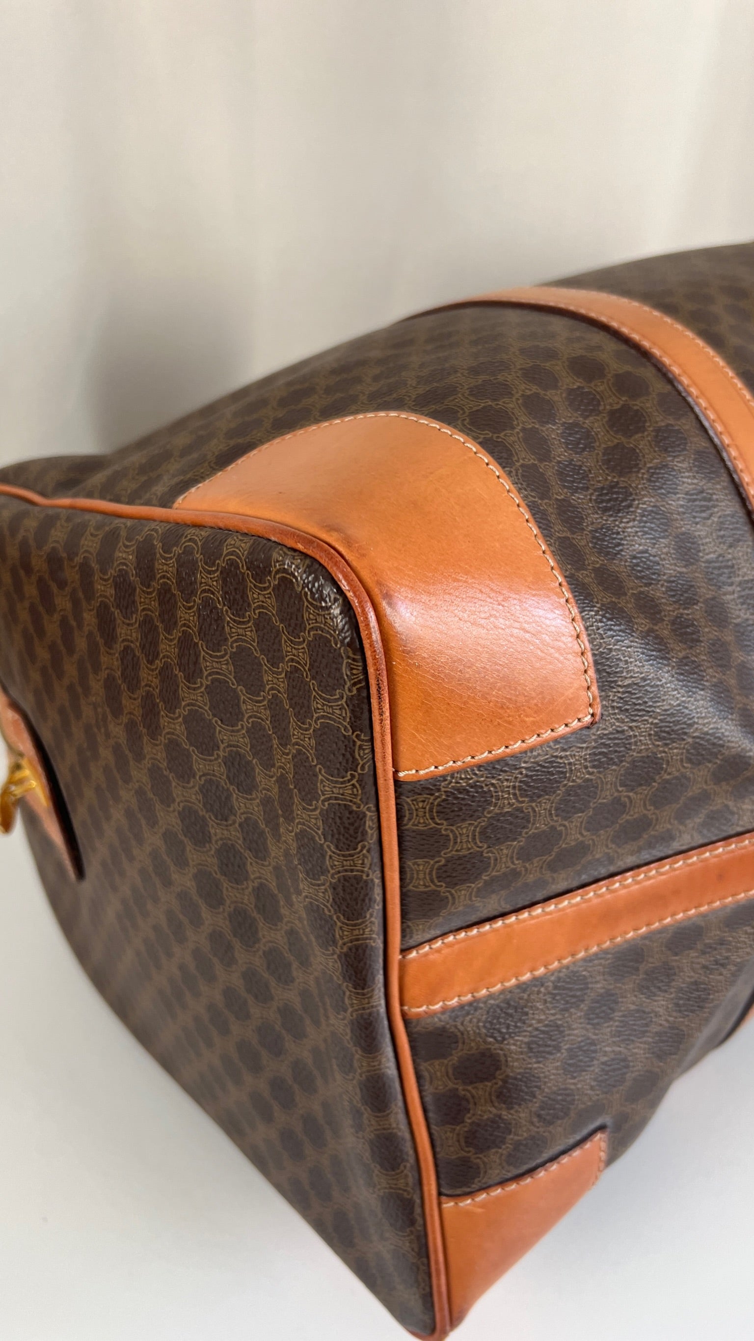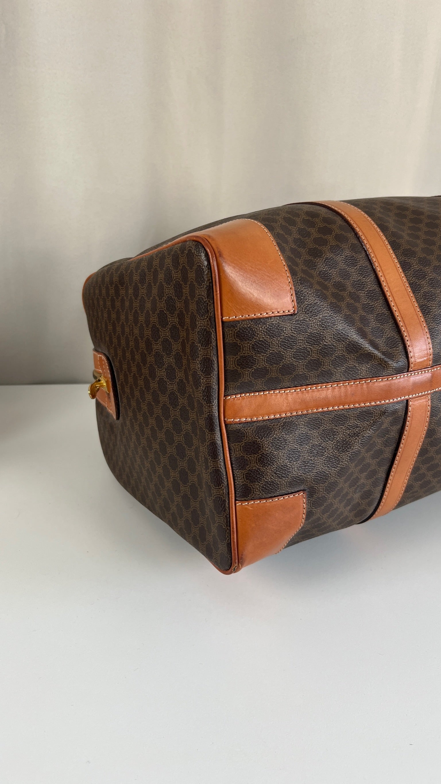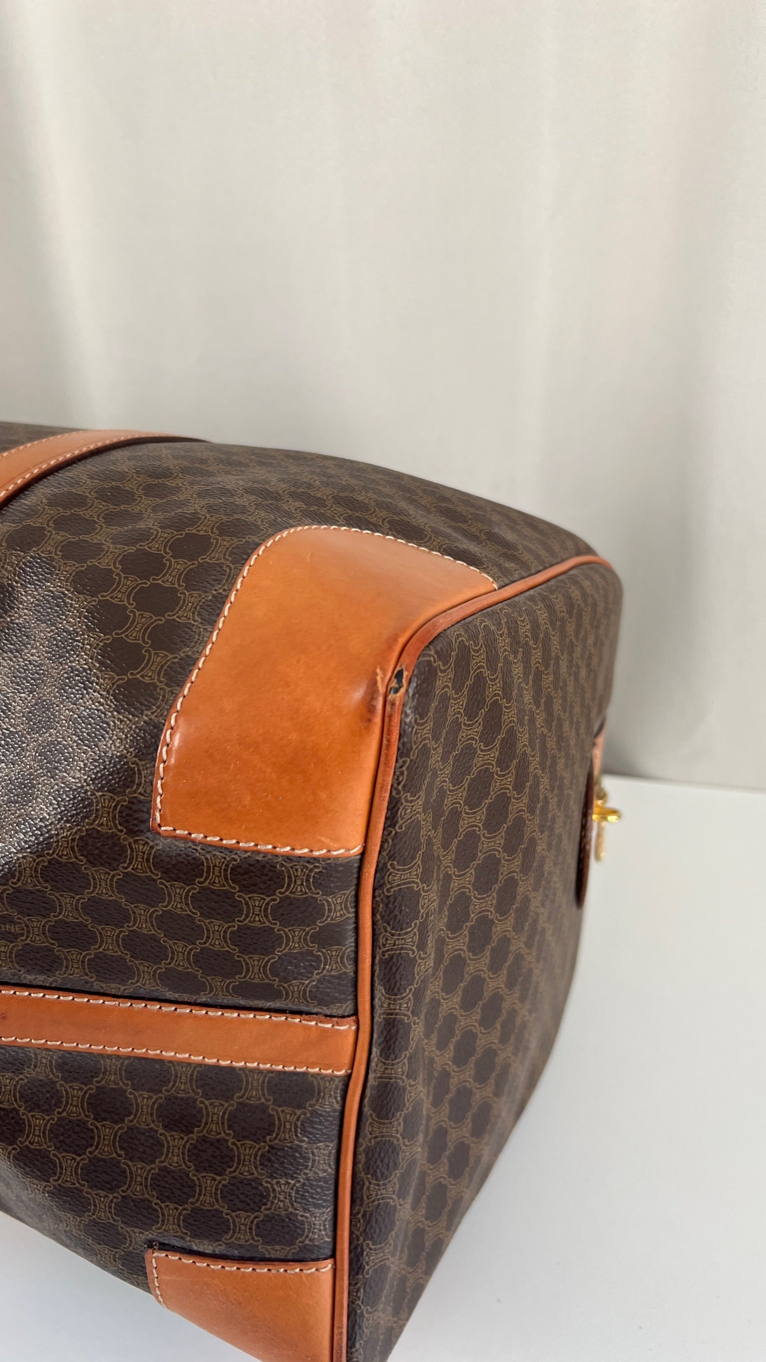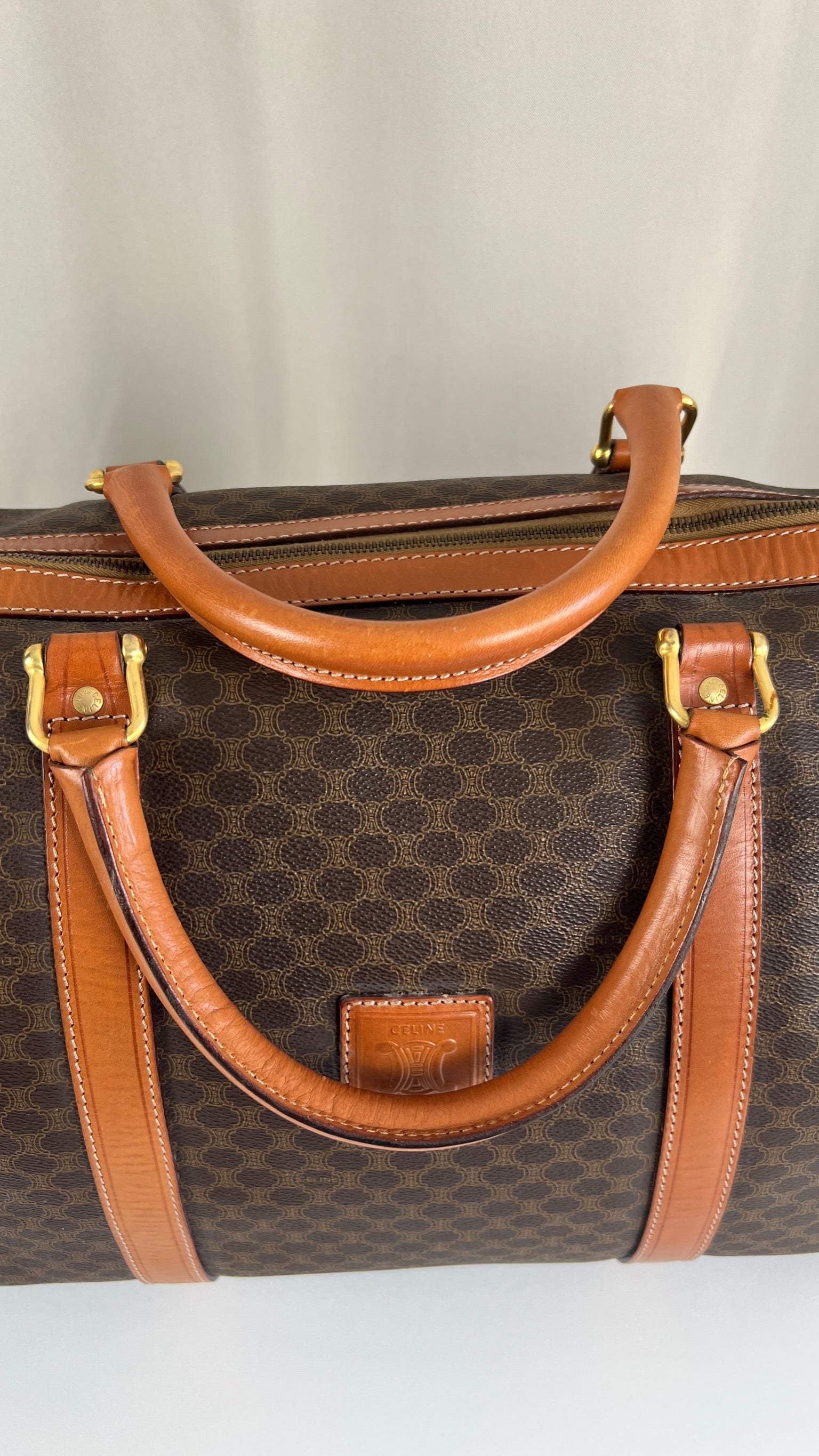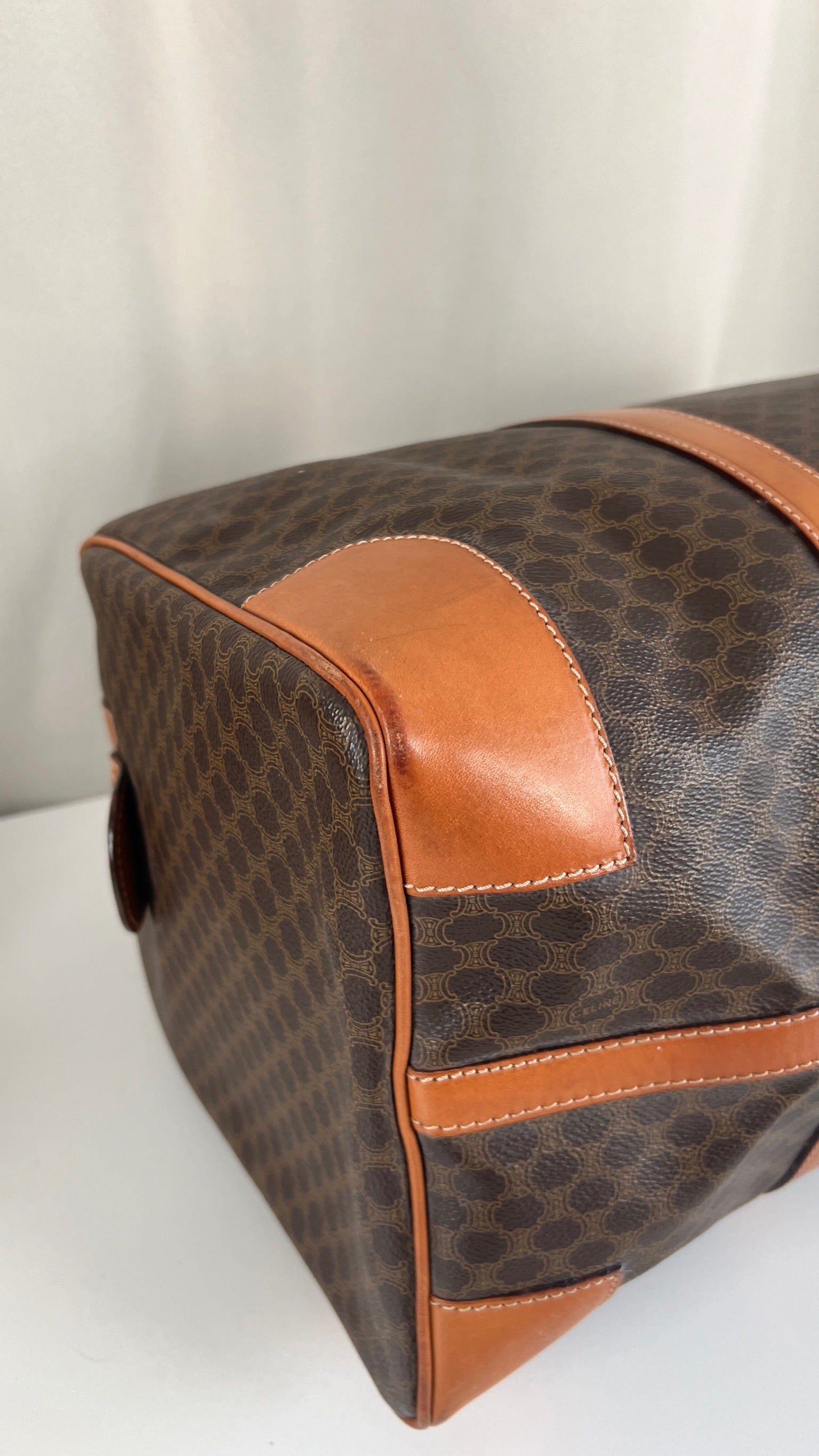 Le sac de voyage Céline Triomphe est en bon/très bon état. Le cuir, les poignées et les coins présentent également des traces d'usure sur le bas. L'intérieur est en très bon état. Un coin est plus abîmé (vous pouvez le vérifier sur les photos). La toile est également en très bon état. La bijouterie est un peu usé.