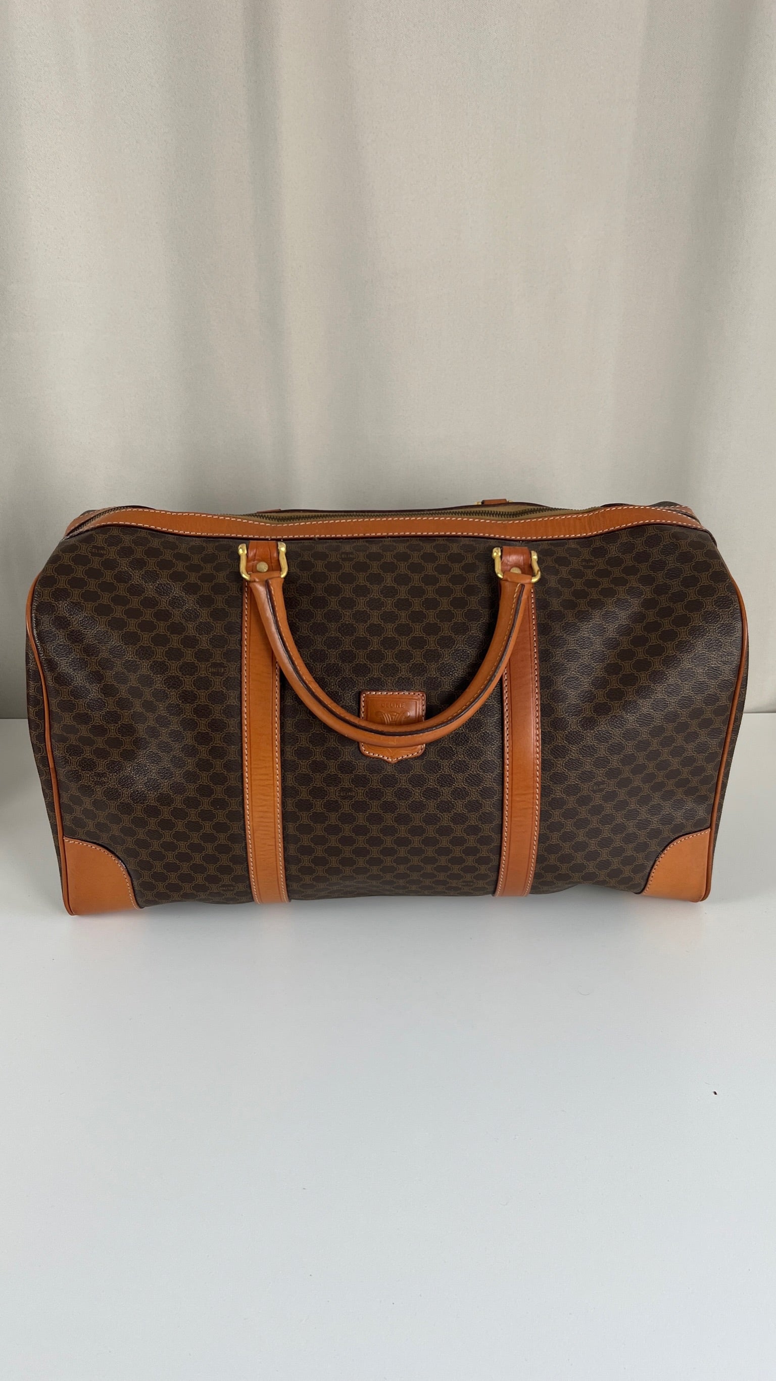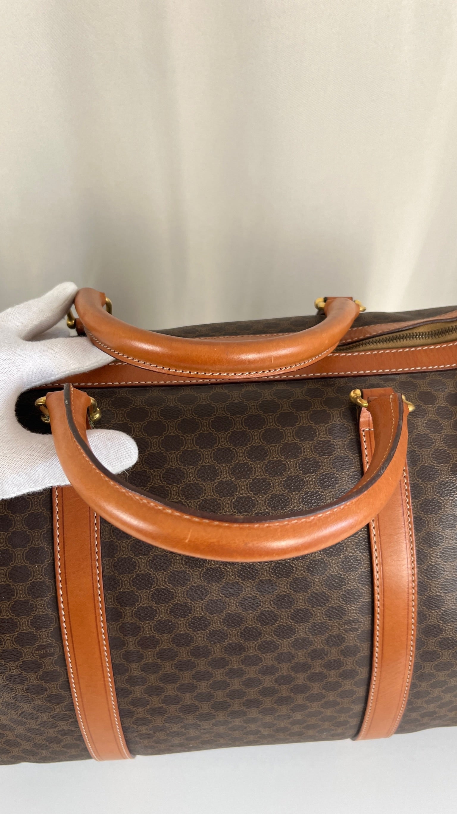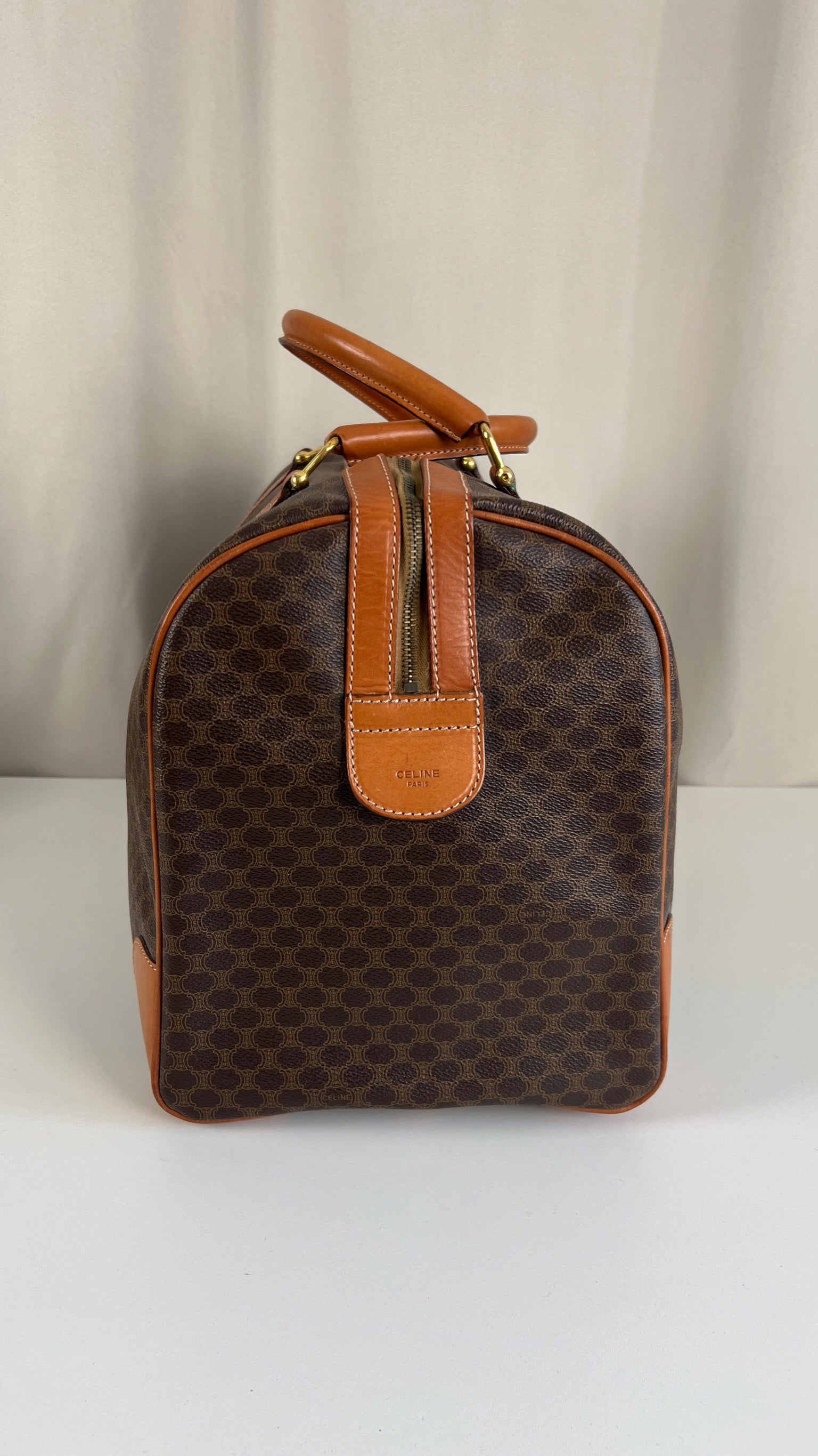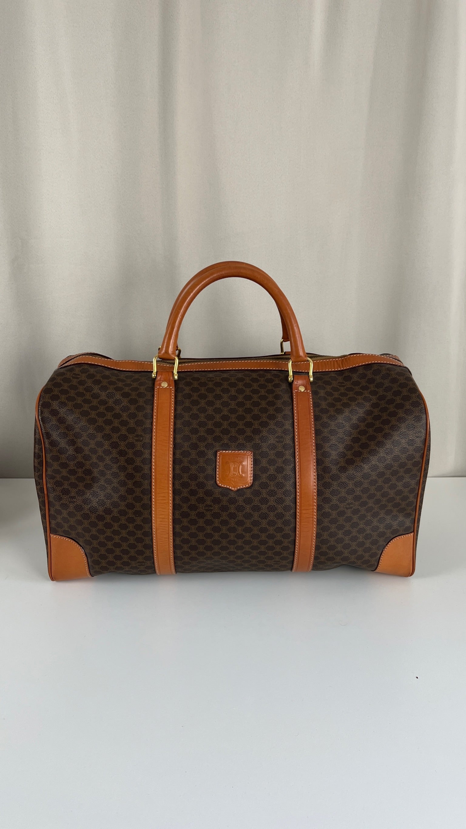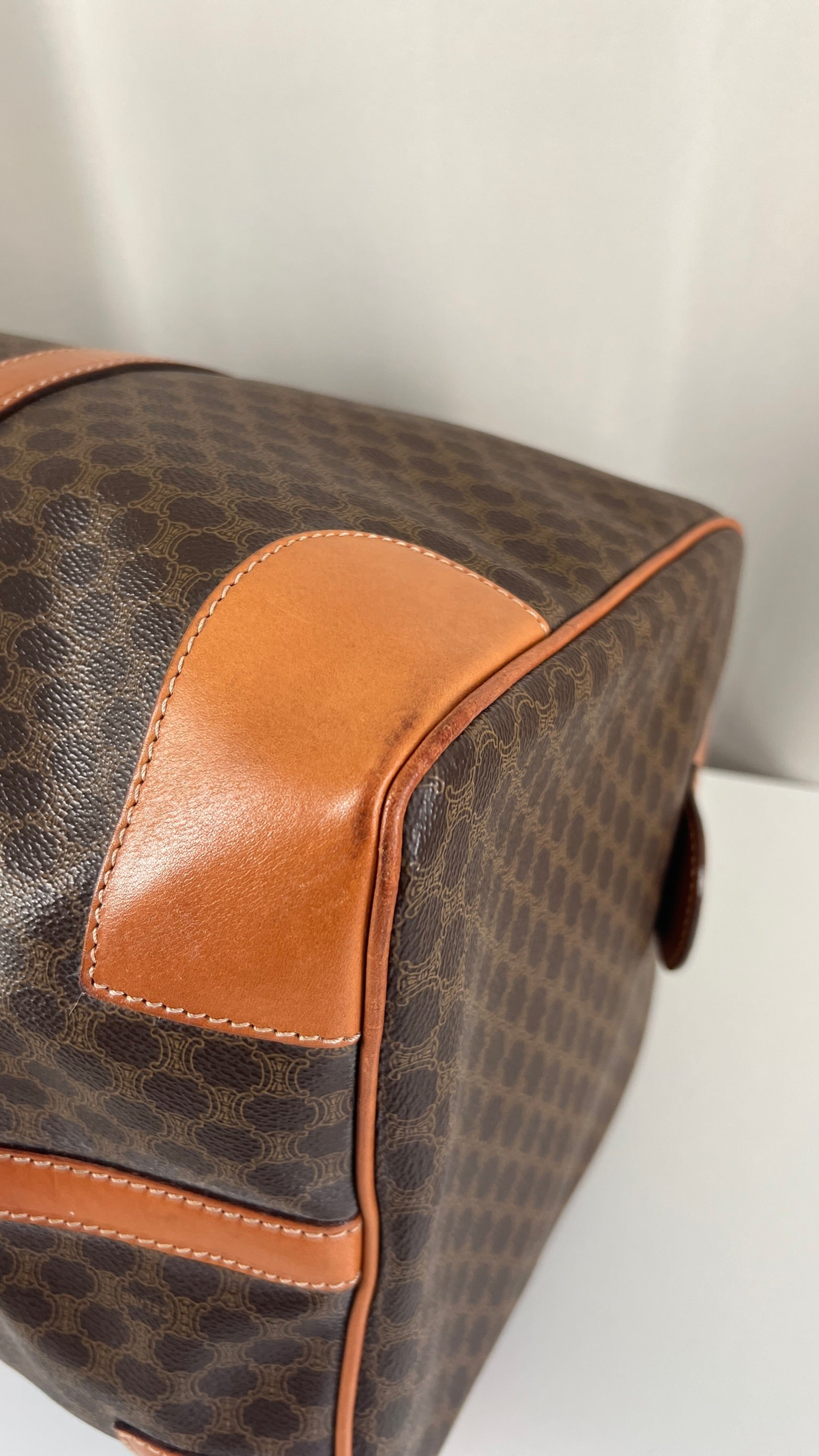 Le sac de voyage Céline Triomphe est en bon/très bon état. Le cuir, les poignées et les coins présentent également des traces d'usure sur le bas. L'intérieur est en très bon état. Un coin est plus abîmé (vous pouvez le vérifier sur les photos). La toile est également en très bon état. La bijouterie est un peu usé.