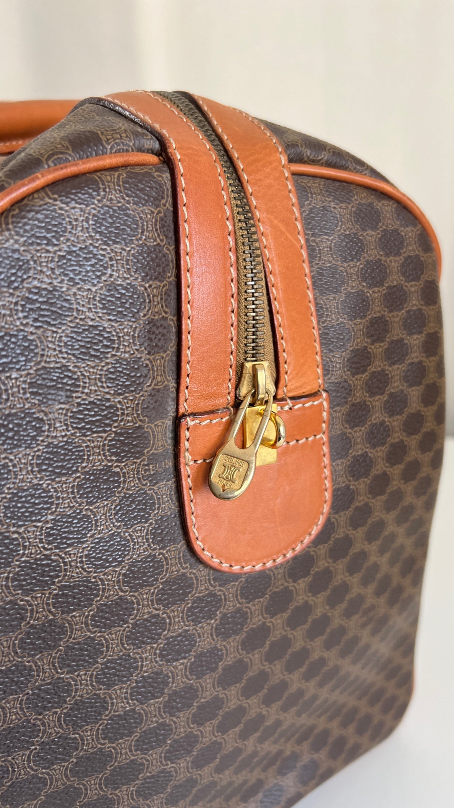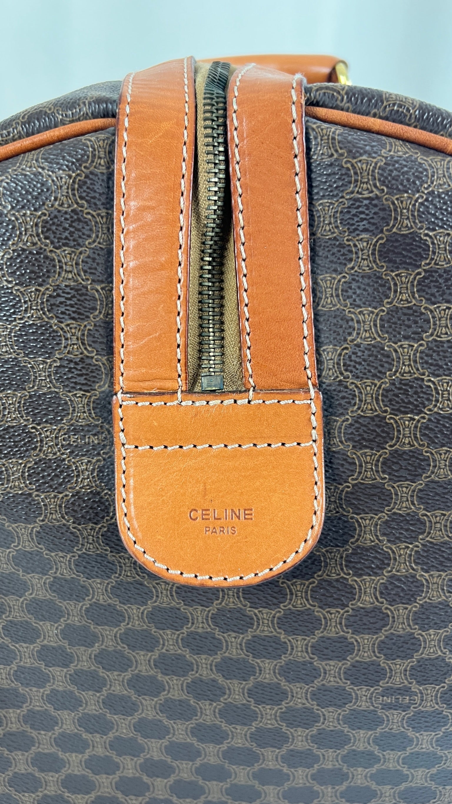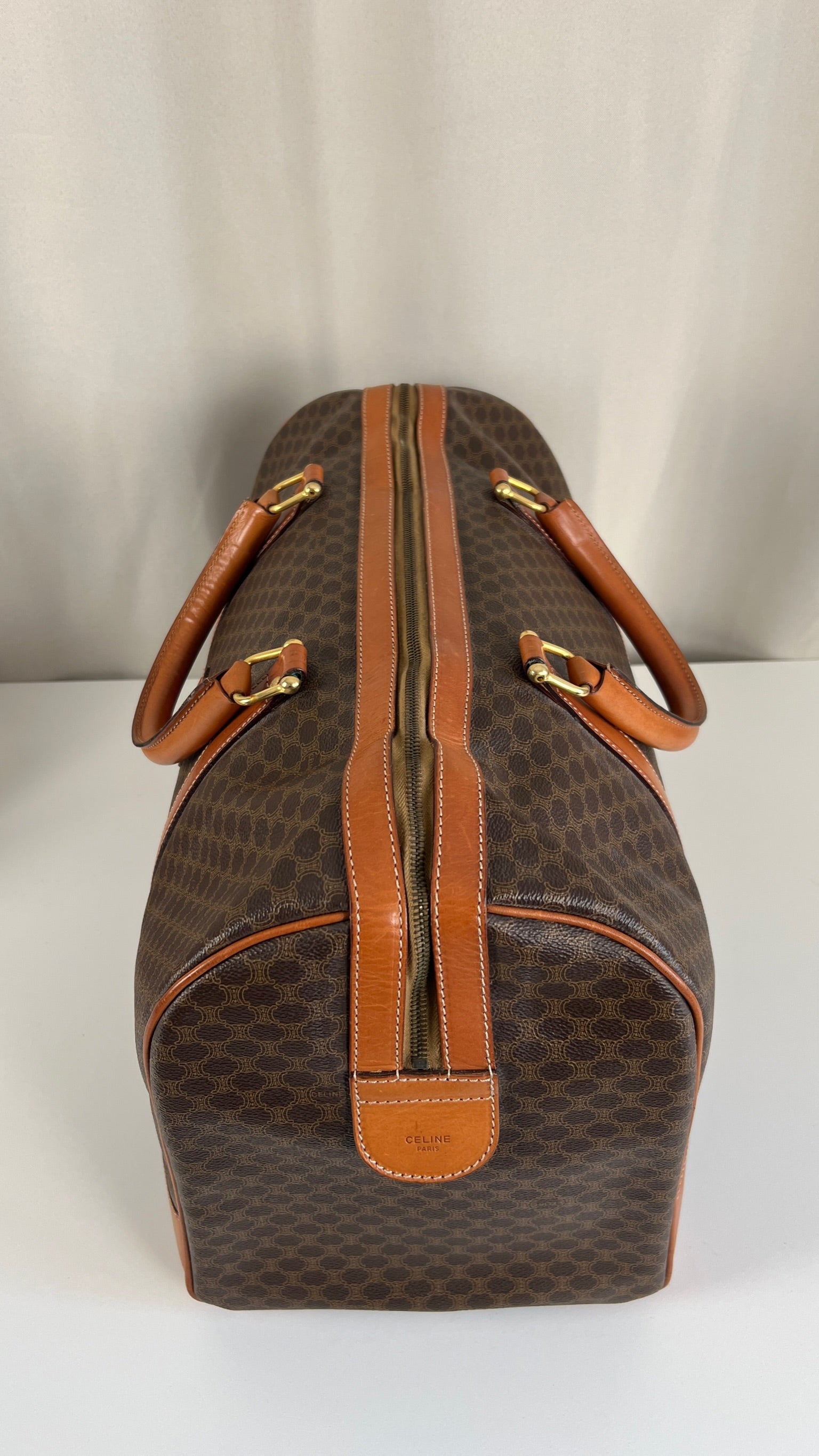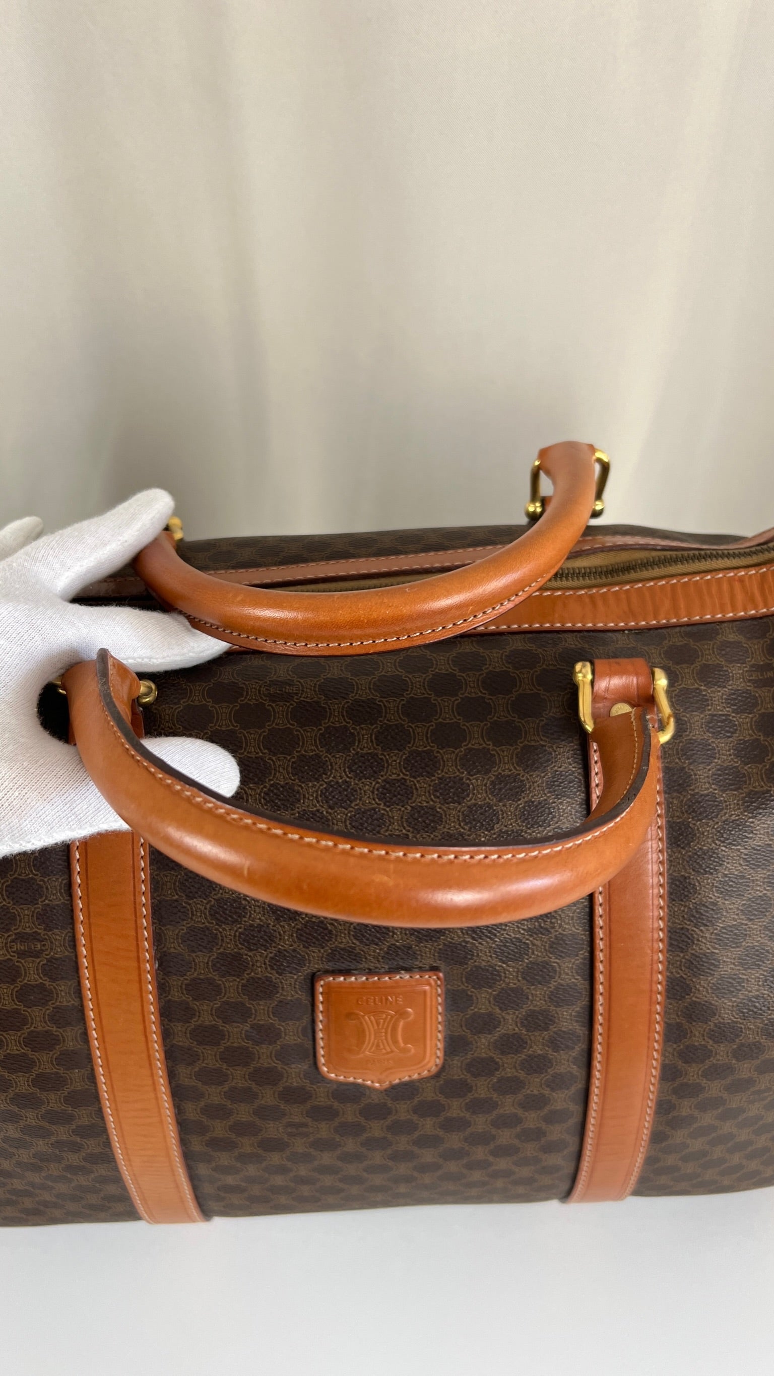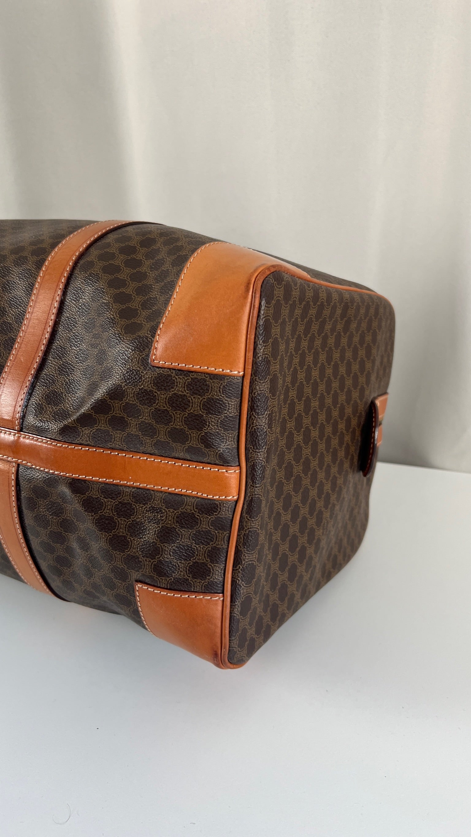 Le sac de voyage Céline Triomphe est en bon/très bon état. Le cuir, les poignées et les coins présentent également des traces d'usure sur le bas. L'intérieur est en très bon état. Un coin est plus abîmé (vous pouvez le vérifier sur les photos). La toile est également en très bon état. La bijouterie est un peu usé.