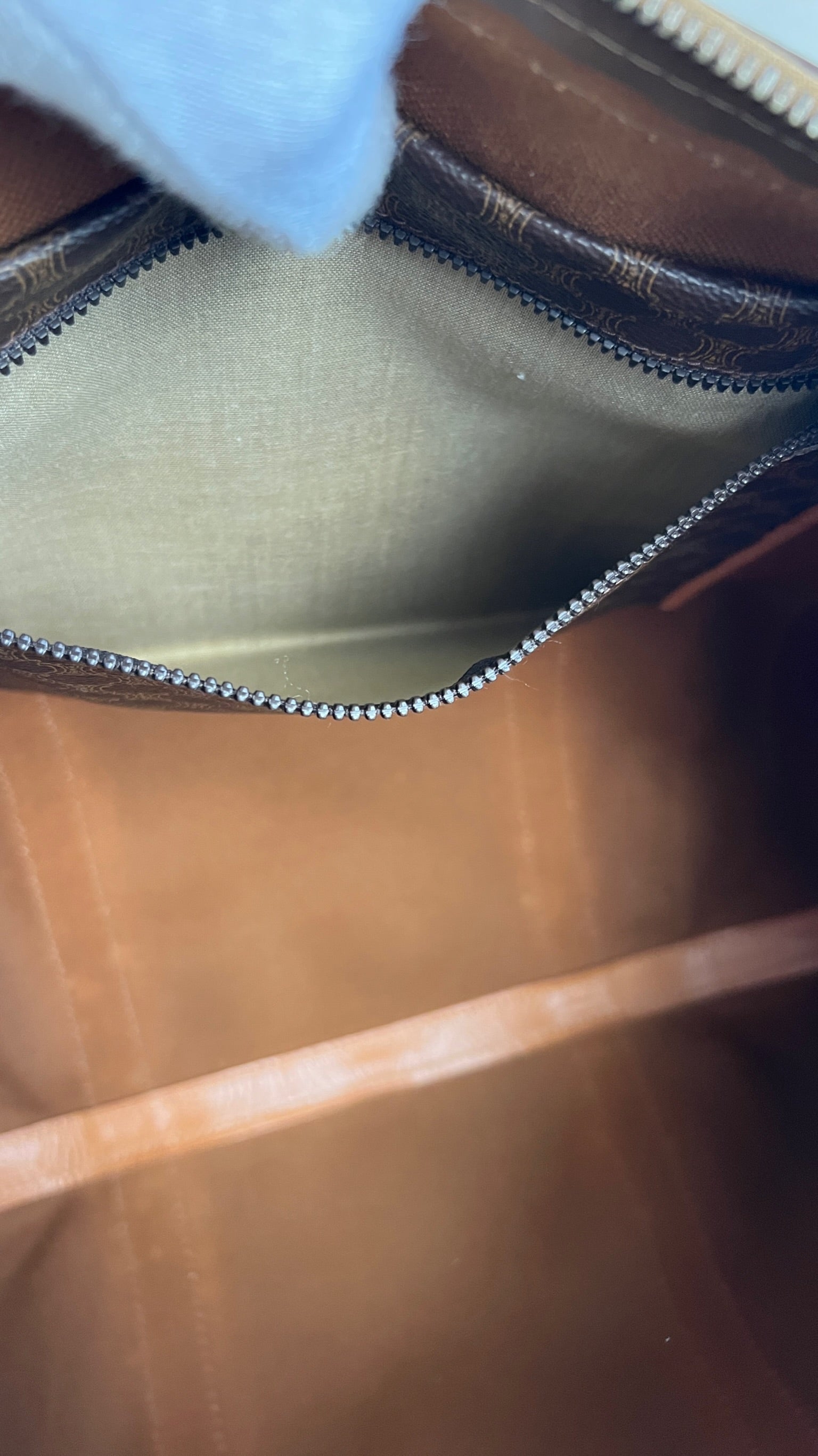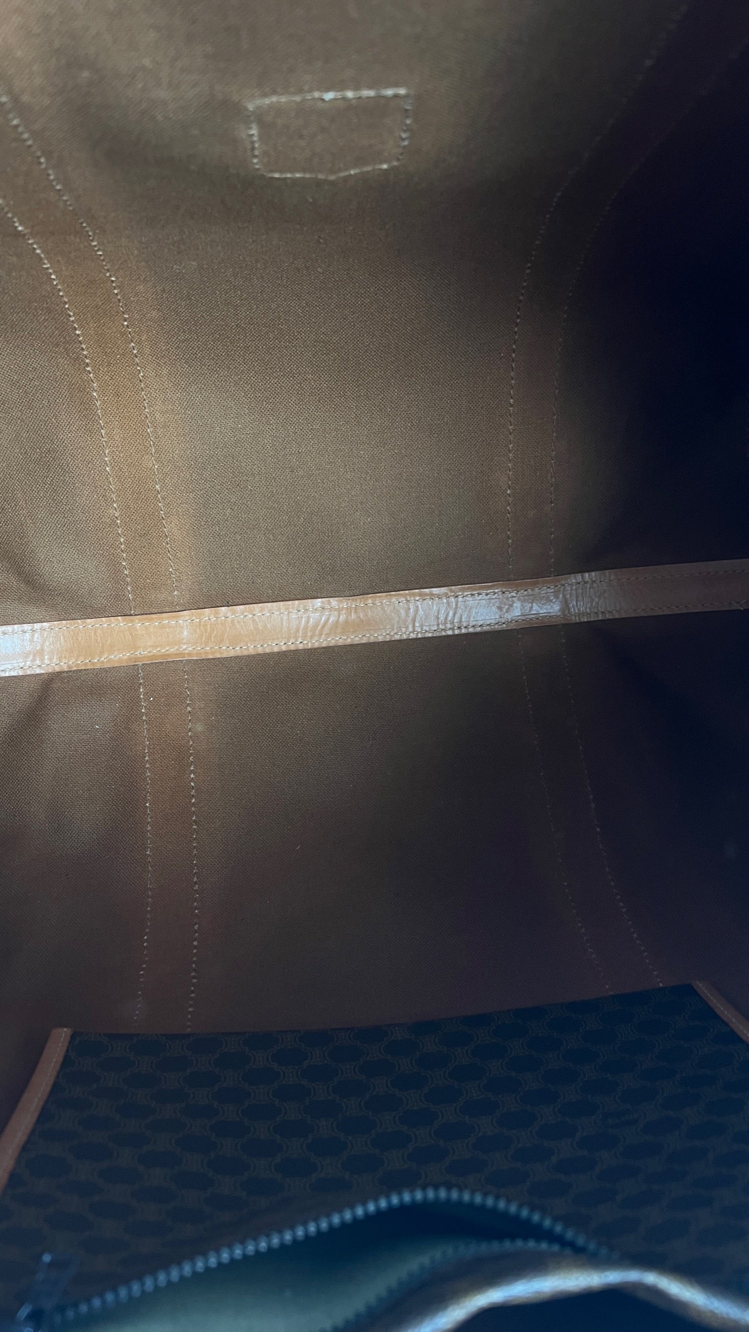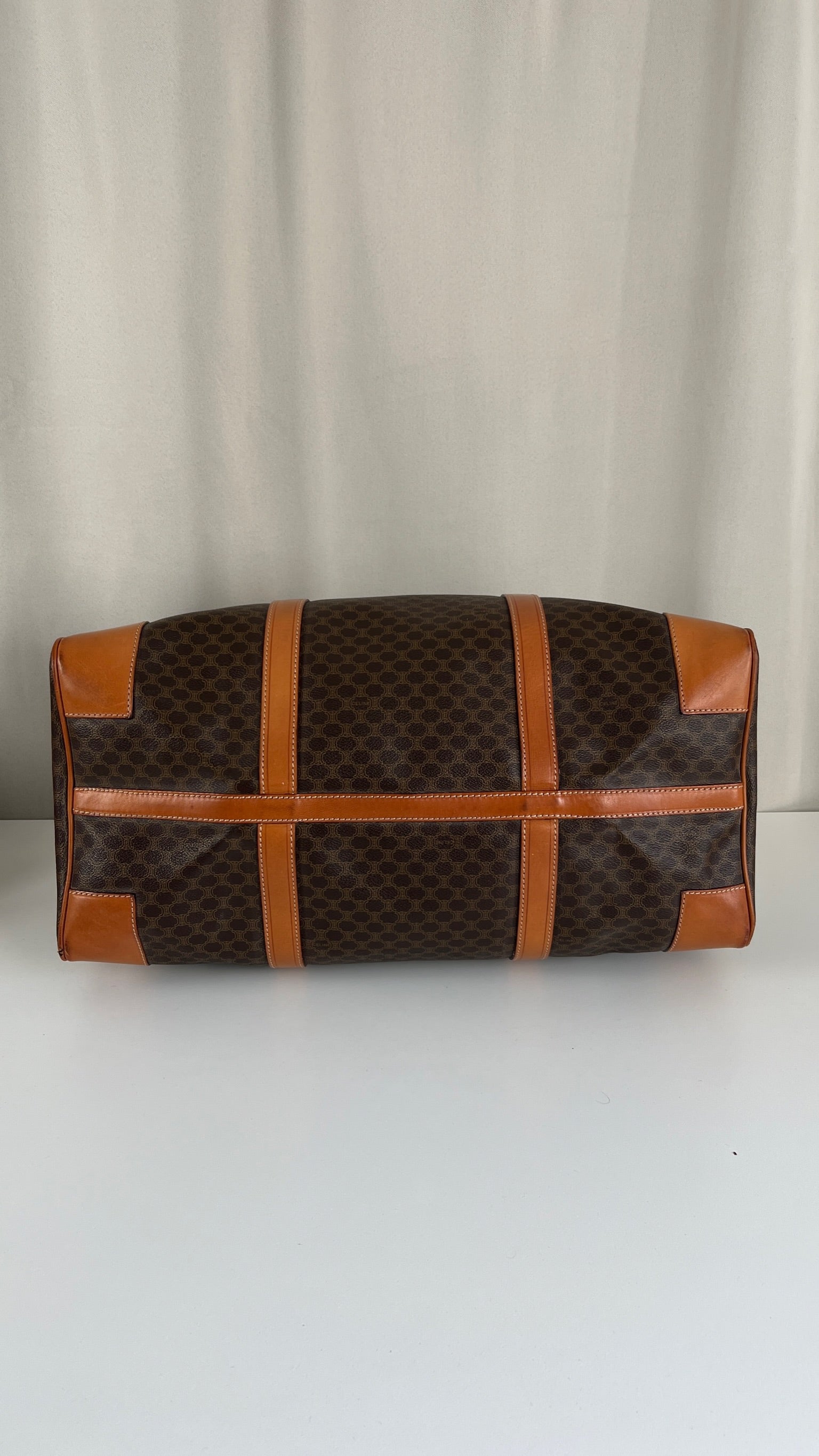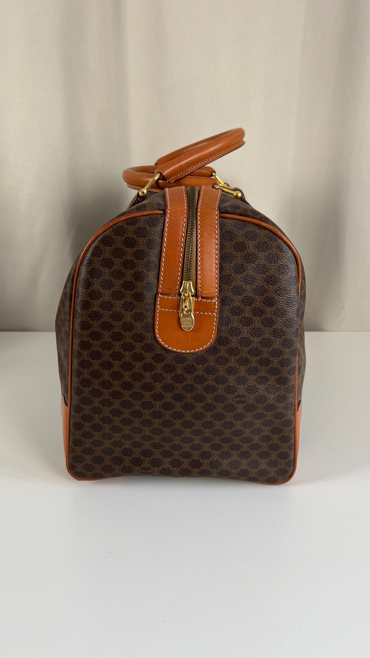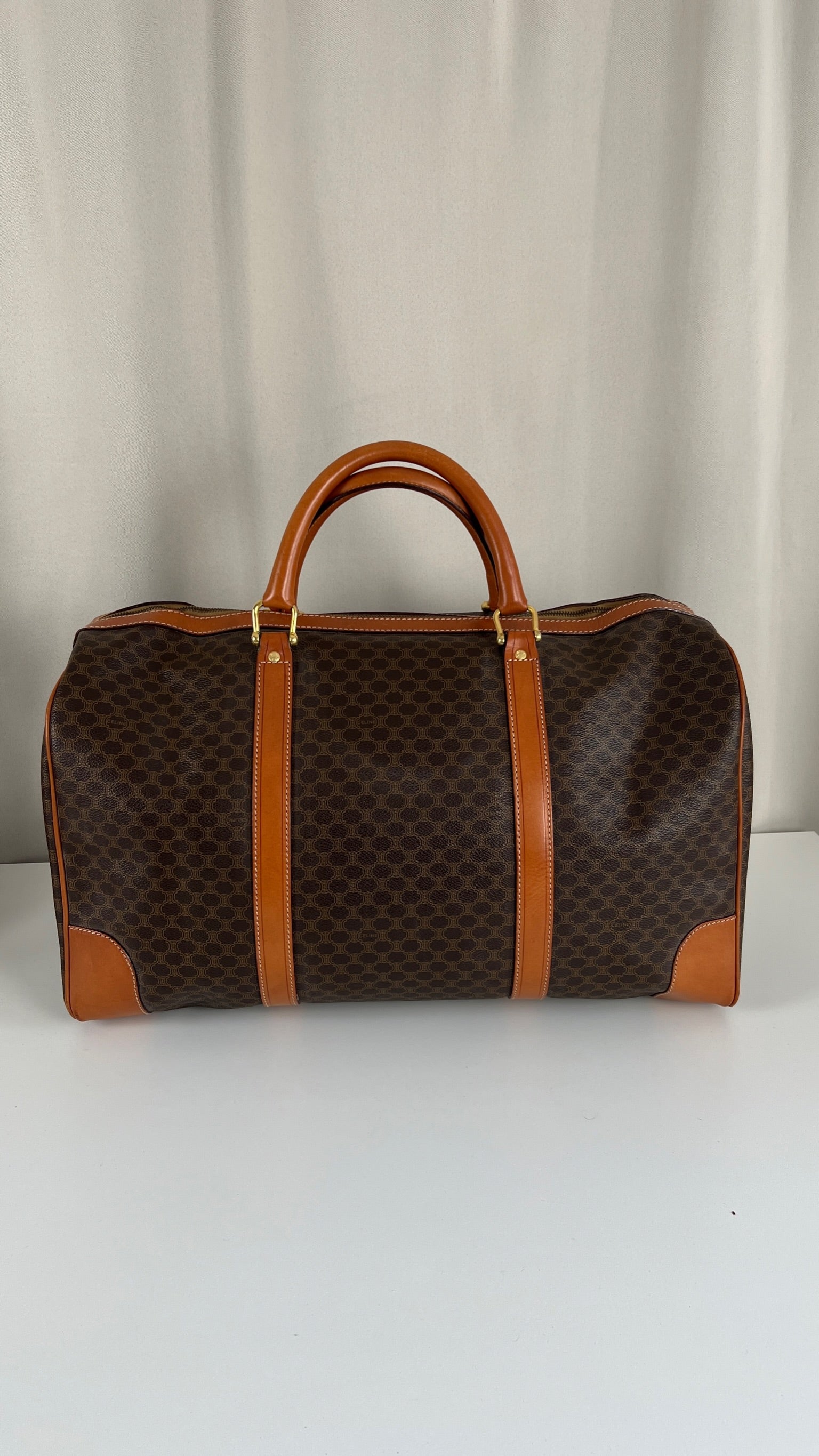 Le sac de voyage Céline Triomphe est en bon/très bon état. Le cuir, les poignées et les coins présentent également des traces d'usure sur le bas. L'intérieur est en très bon état. Un coin est plus abîmé (vous pouvez le vérifier sur les photos). La toile est également en très bon état. La bijouterie est un peu usé.