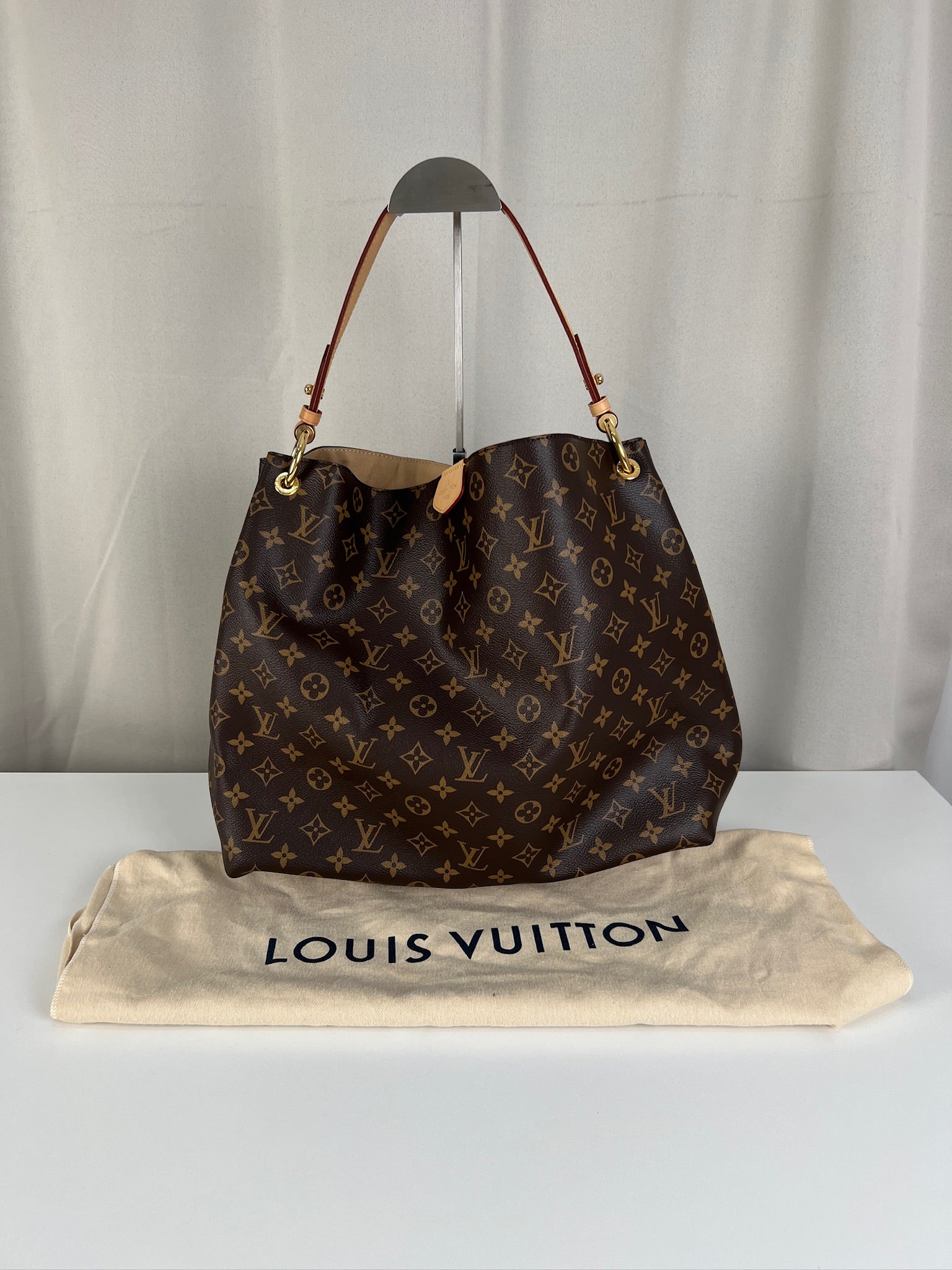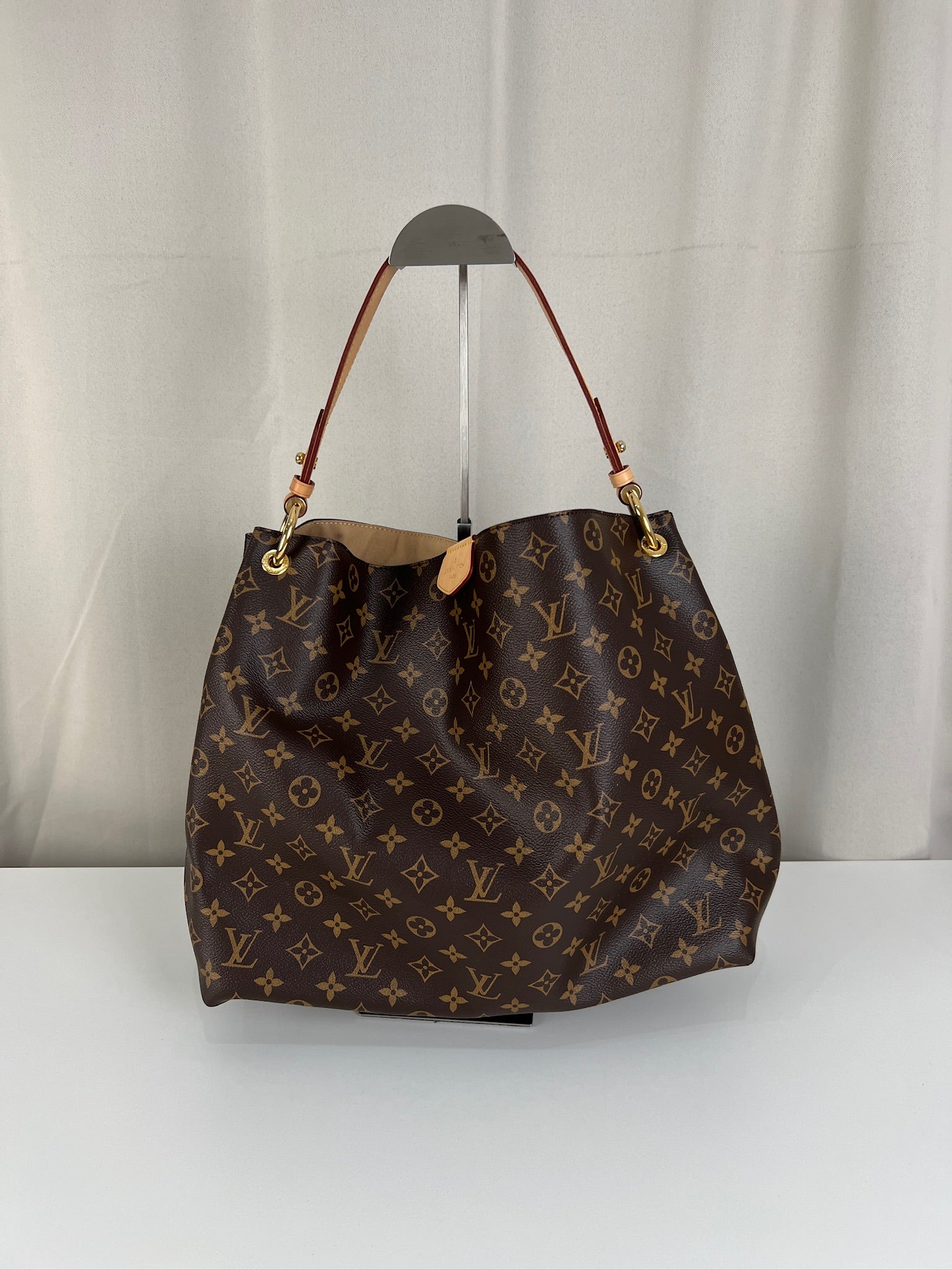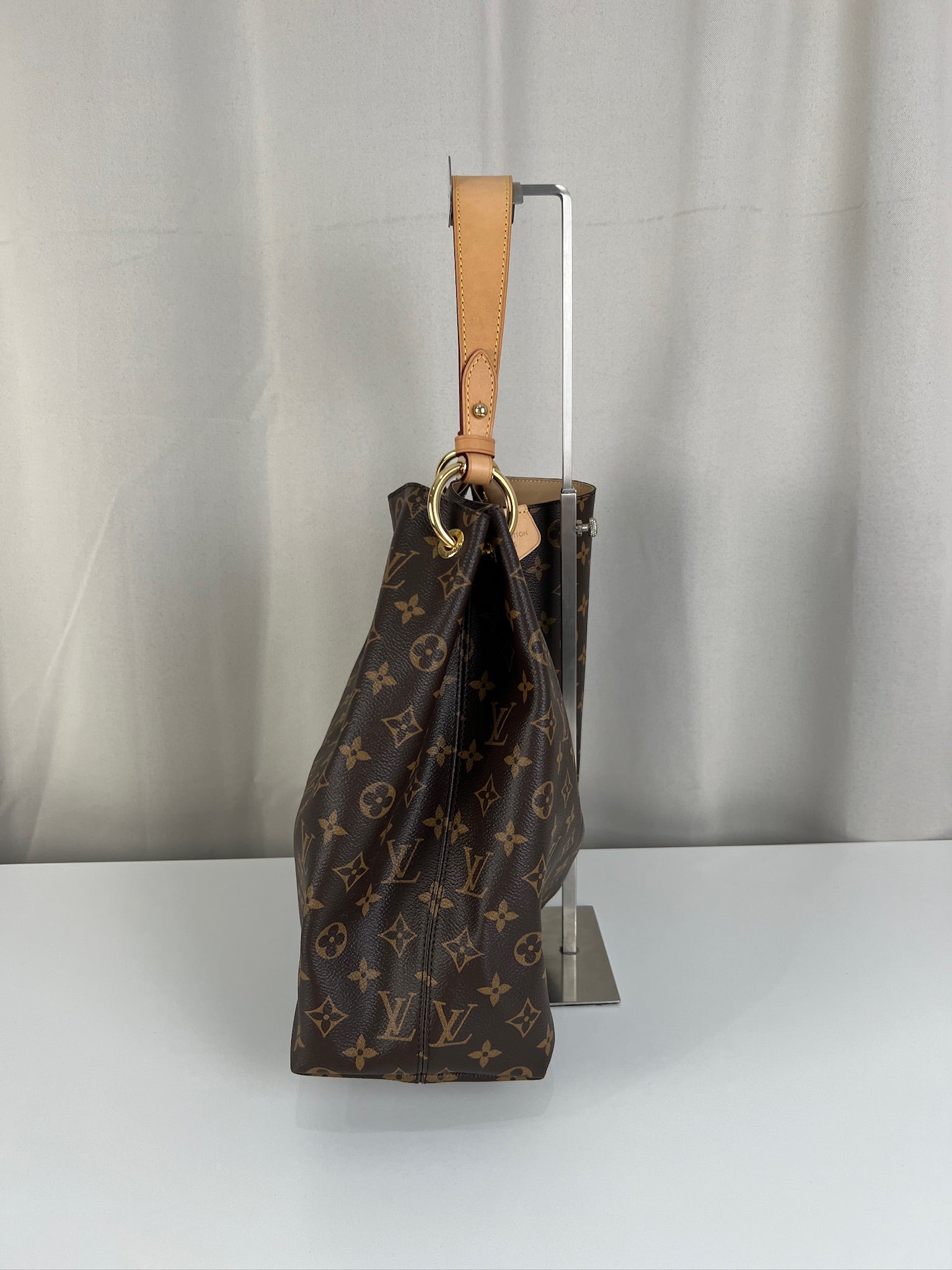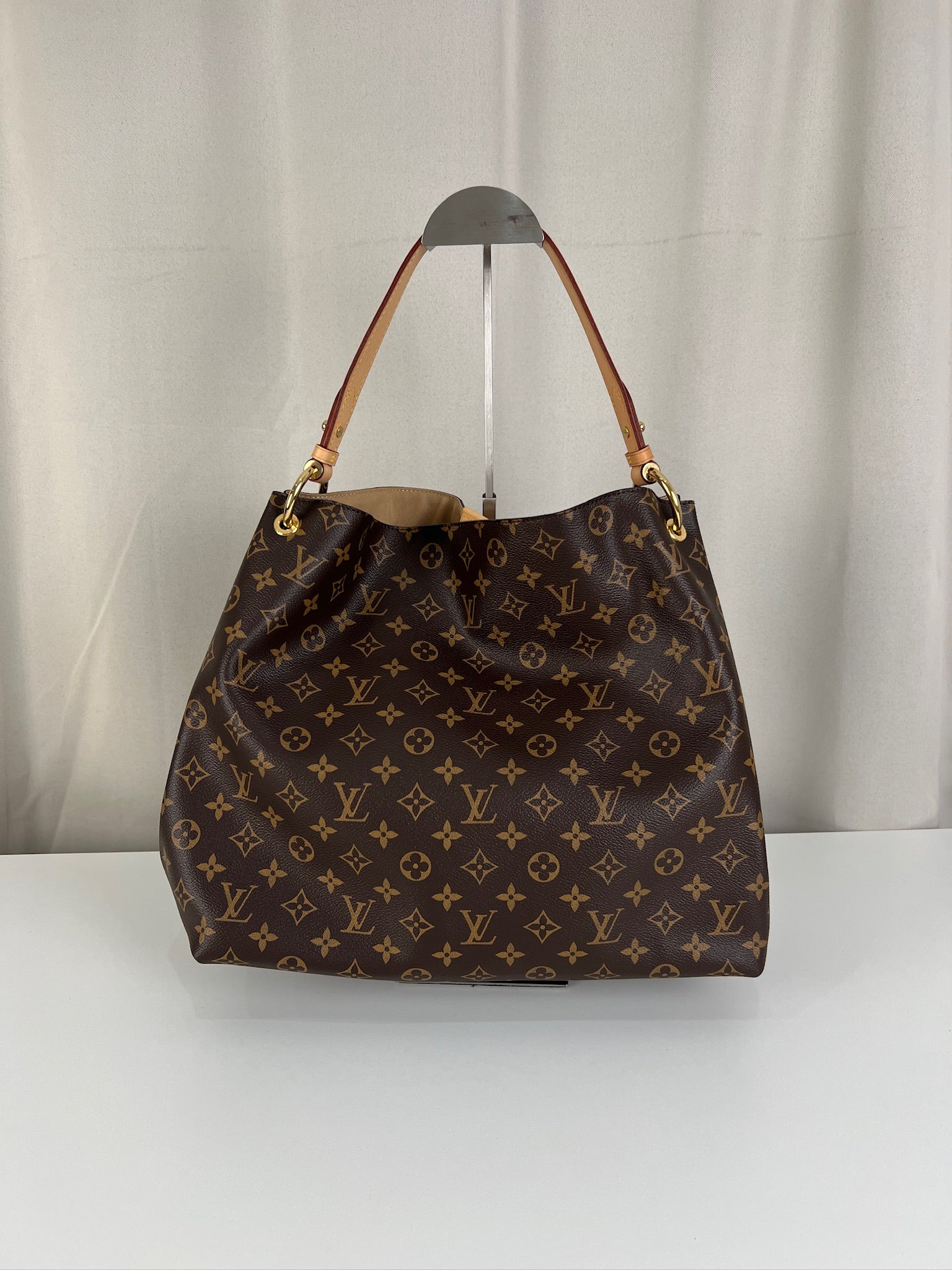 Ce sac Louis Vuitton Graceful MM est en parfait état, comme neuf. La toile et les coins sont en très bon état. La poignée est en parfait état. La bijouterie est un peu usé (temps d'utilisation normal). L'intérieur est en très bon état comme neuf. Il est livré avec le dustbag.