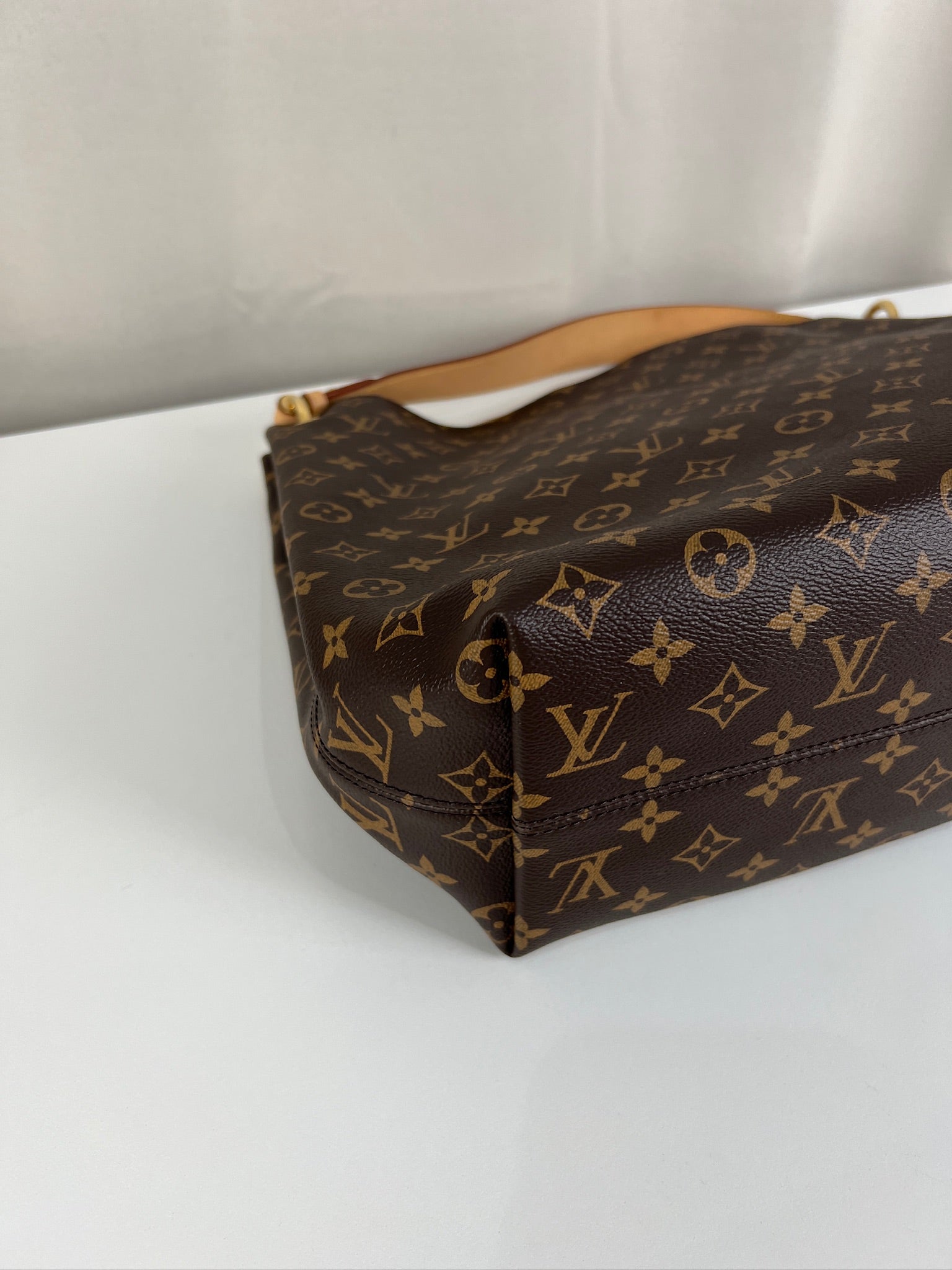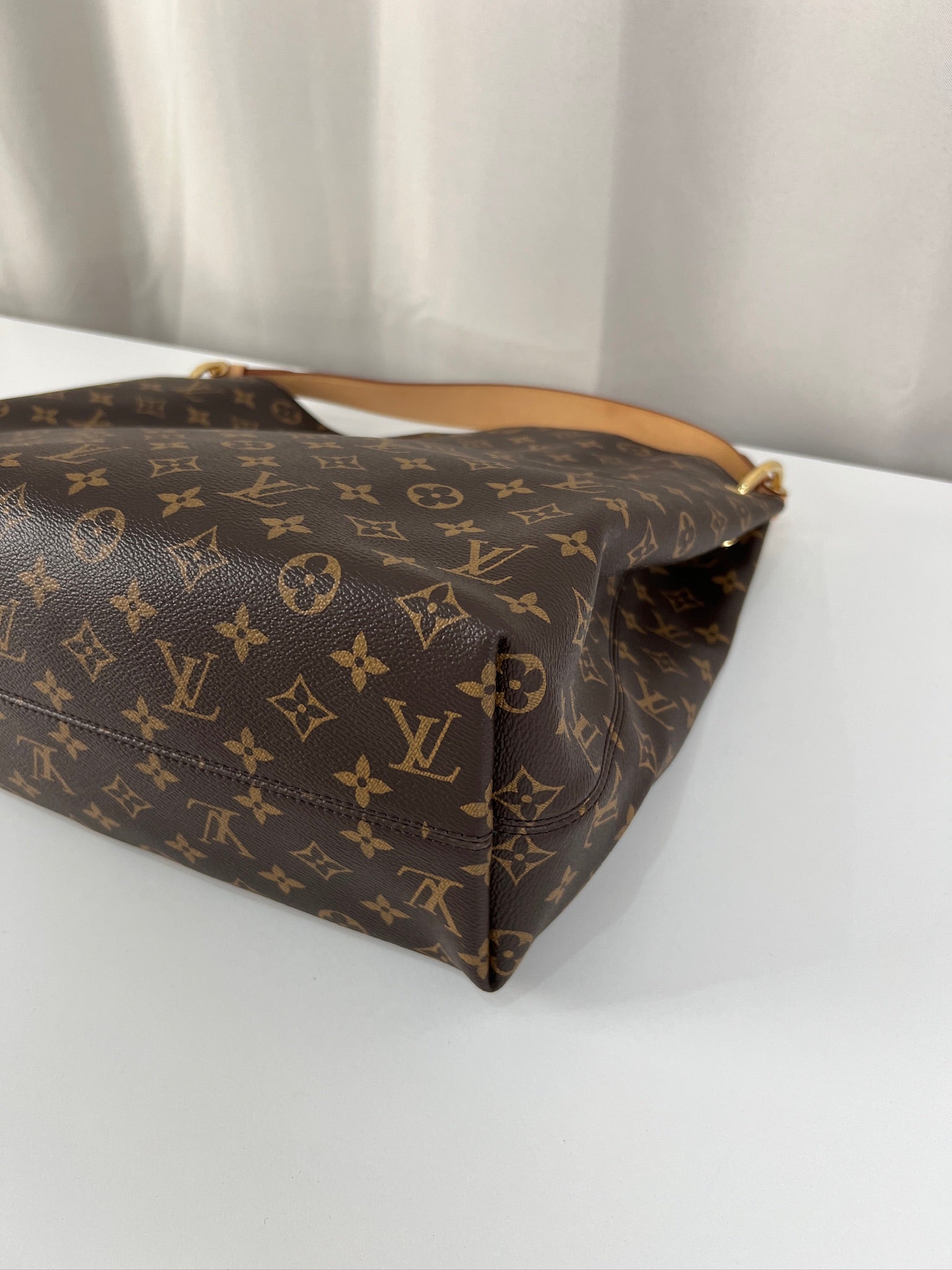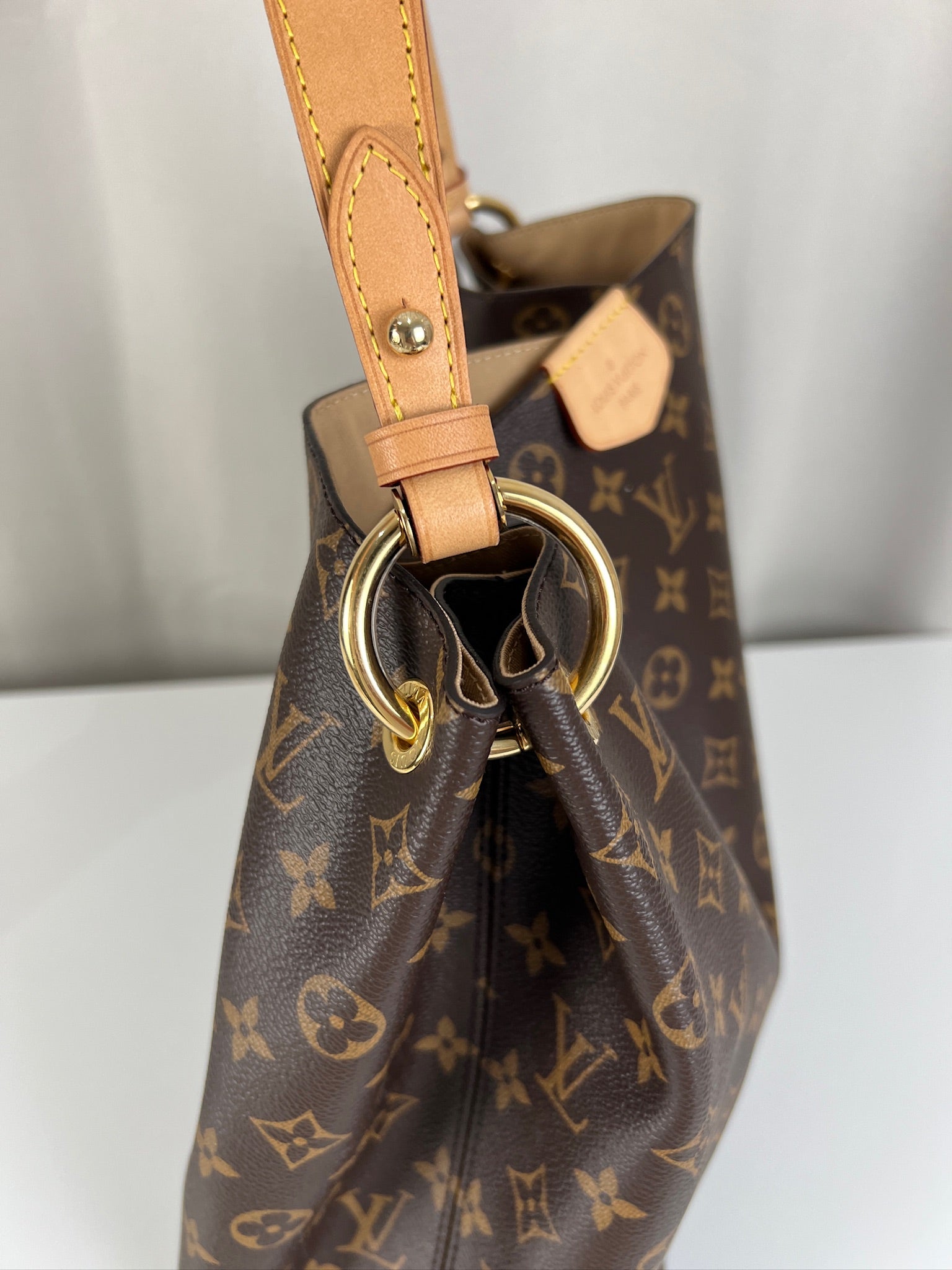 Ce sac Louis Vuitton Graceful MM est en parfait état, comme neuf. La toile et les coins sont en très bon état. La poignée est en parfait état. La bijouterie est un peu usé (temps d'utilisation normal). L'intérieur est en très bon état comme neuf. Il est livré avec le dustbag.