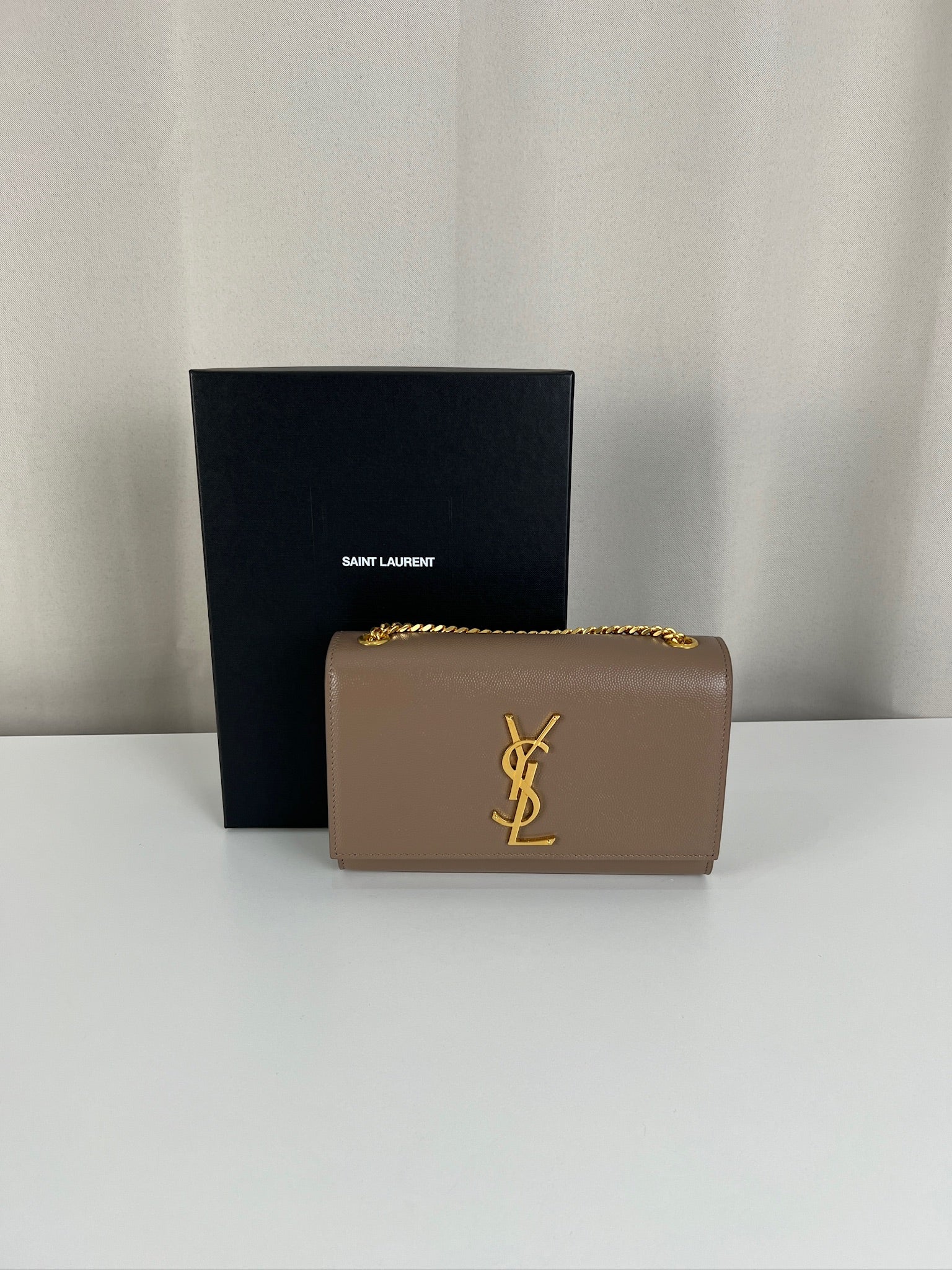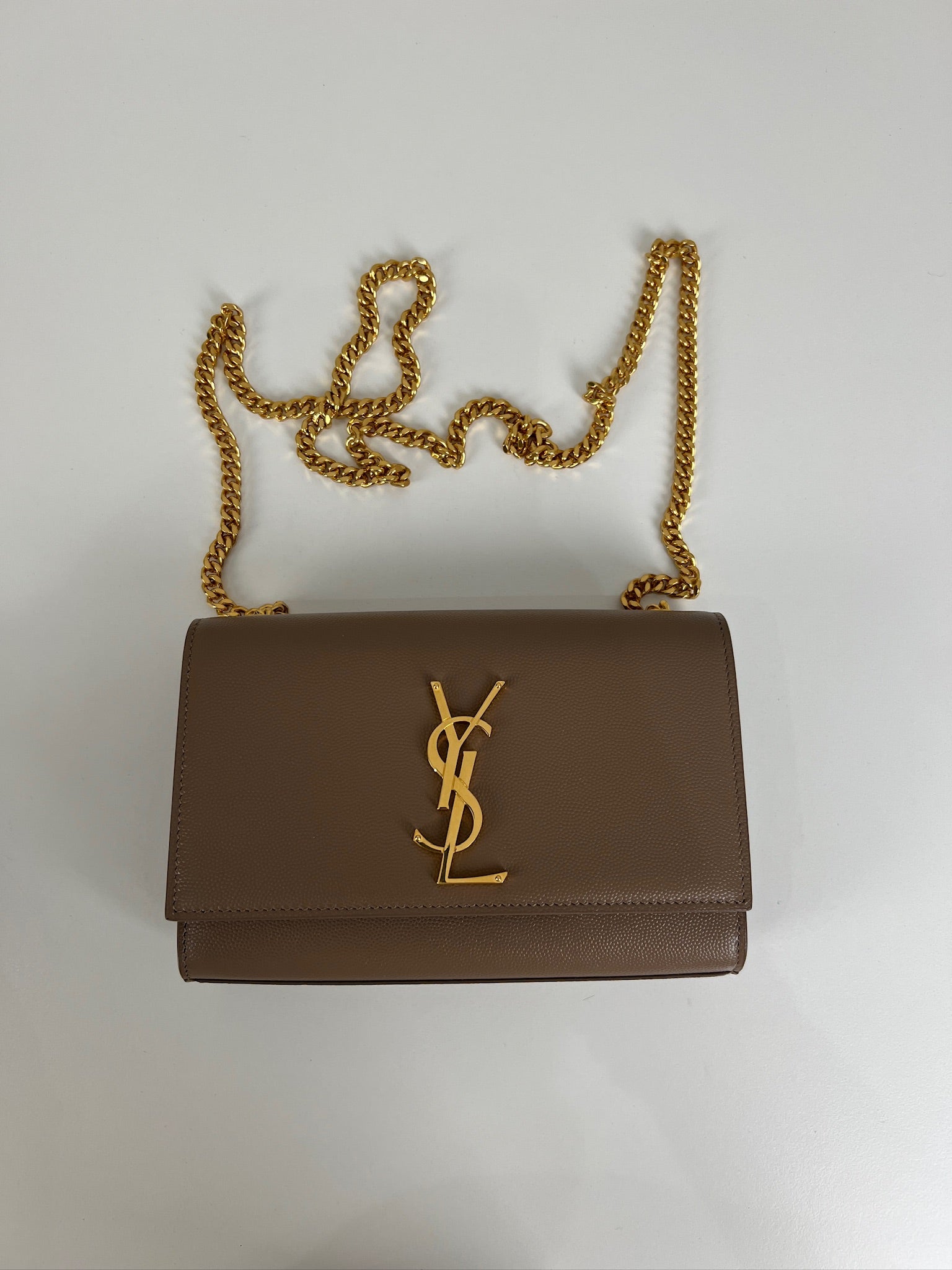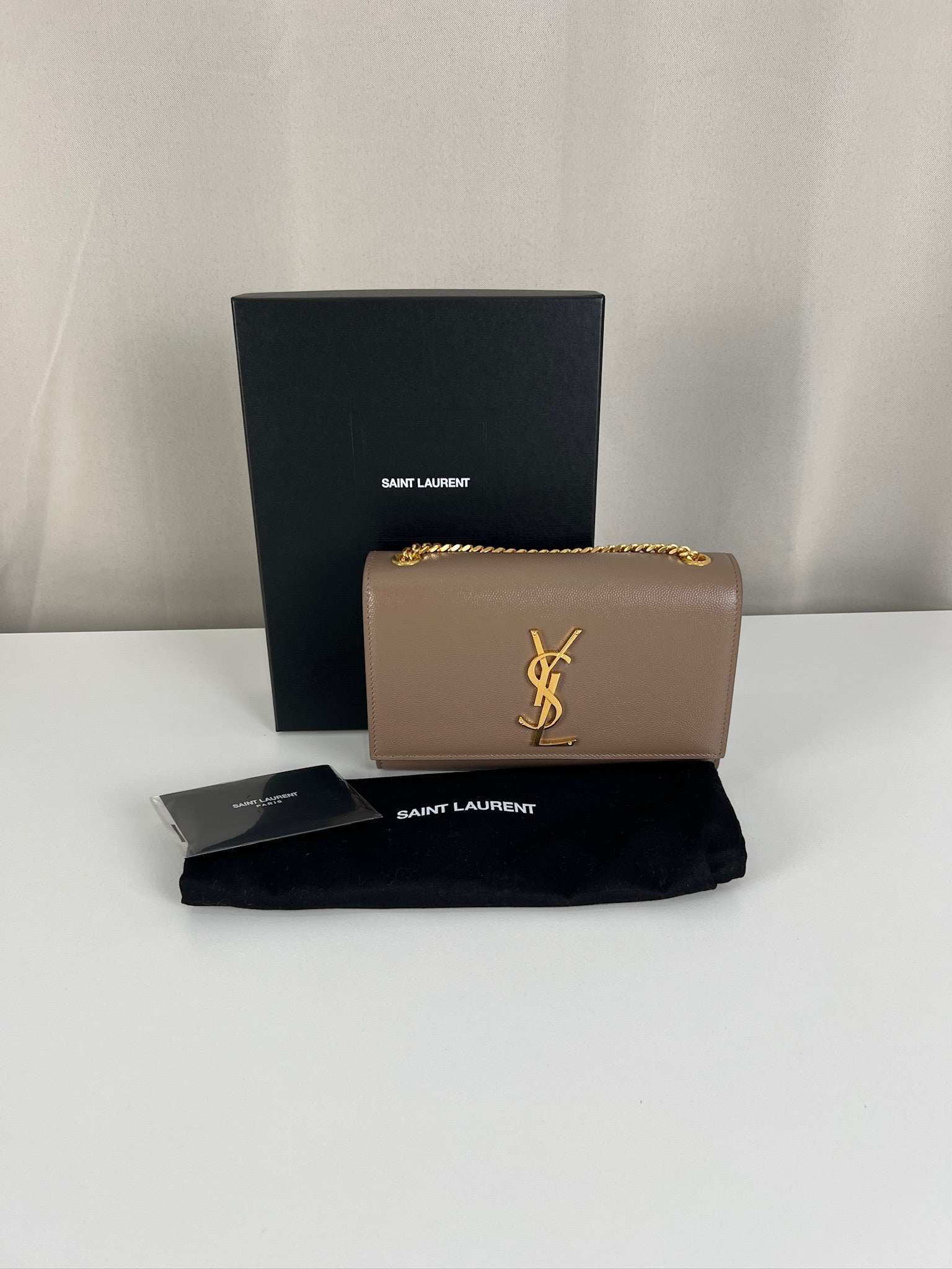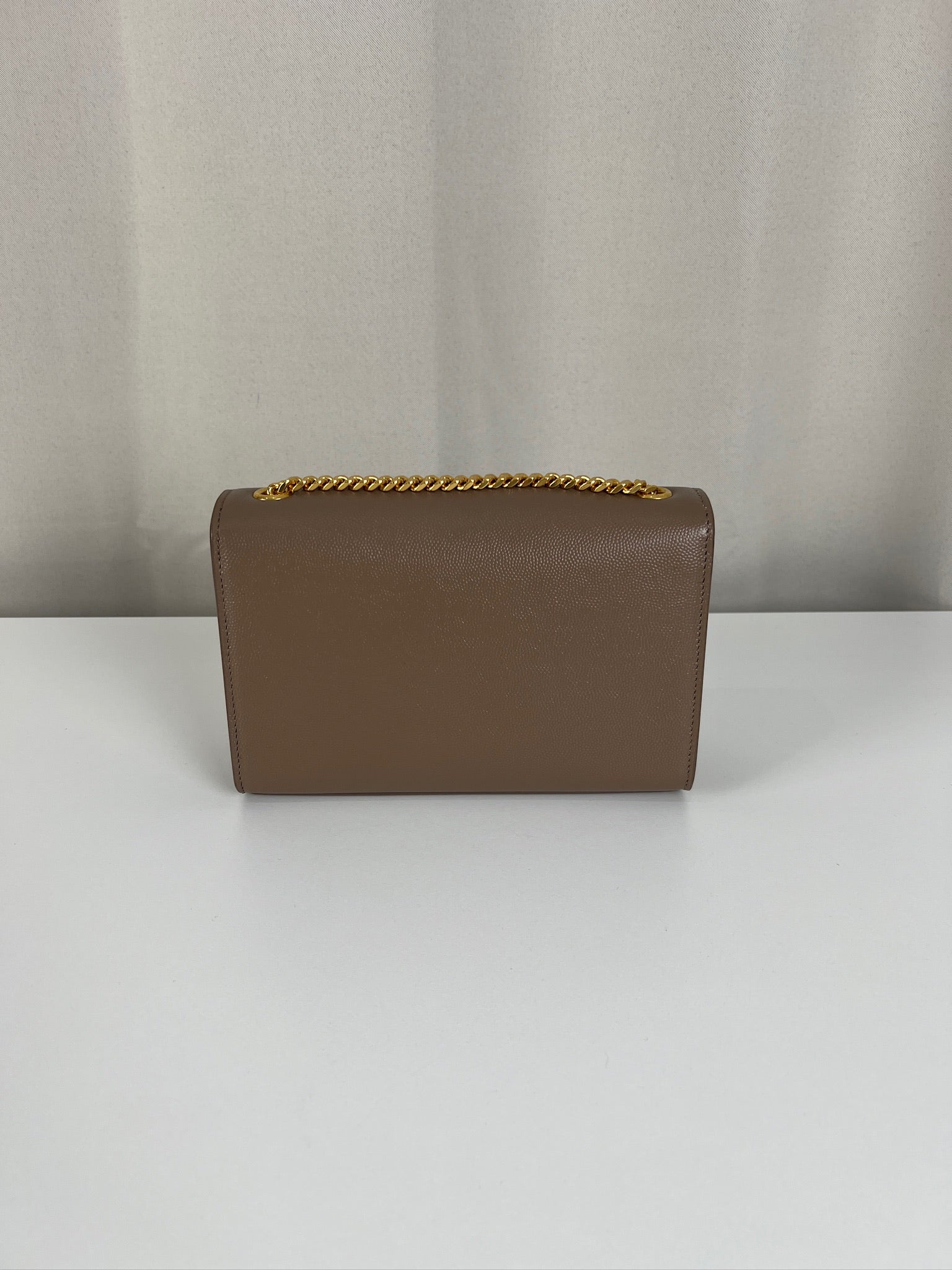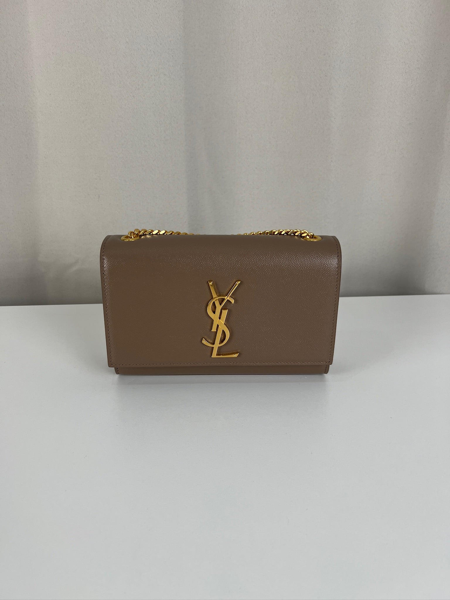 Ce sac Saint Laurent Kate small beige foncé est comme neuf. Le cuir, la garniture et les coins sont en parfait état. L'intérieur est en parfait état. Il est livré avec boite + dustbag + copie de la facture + papiers + Certificat Entrupy.