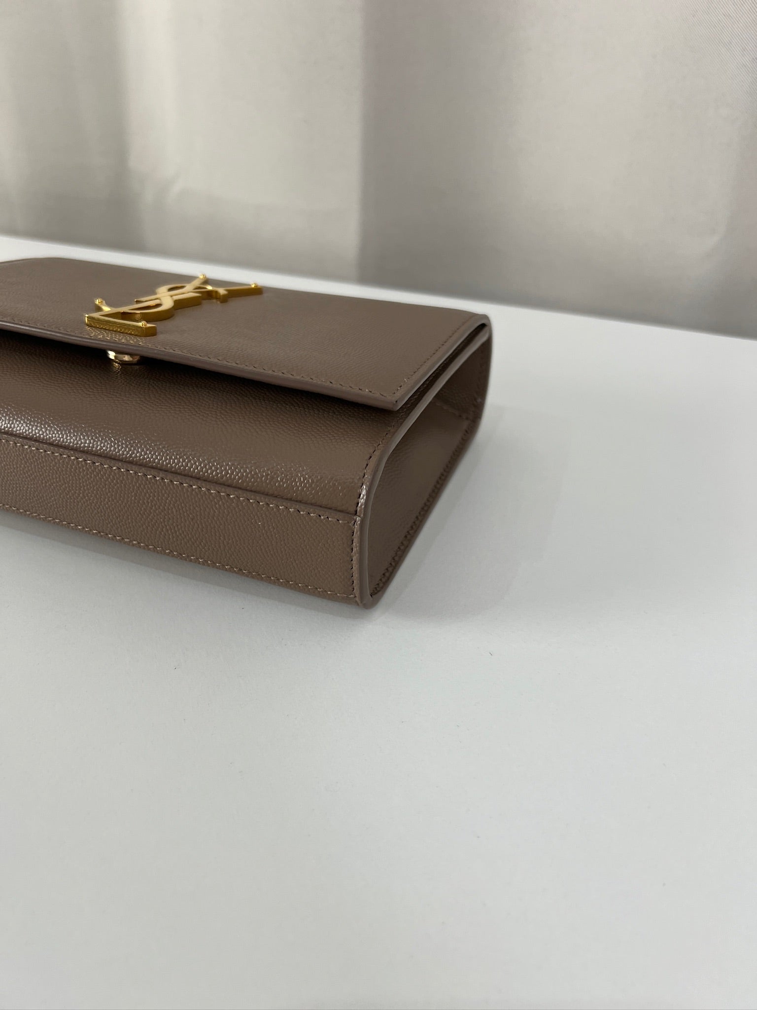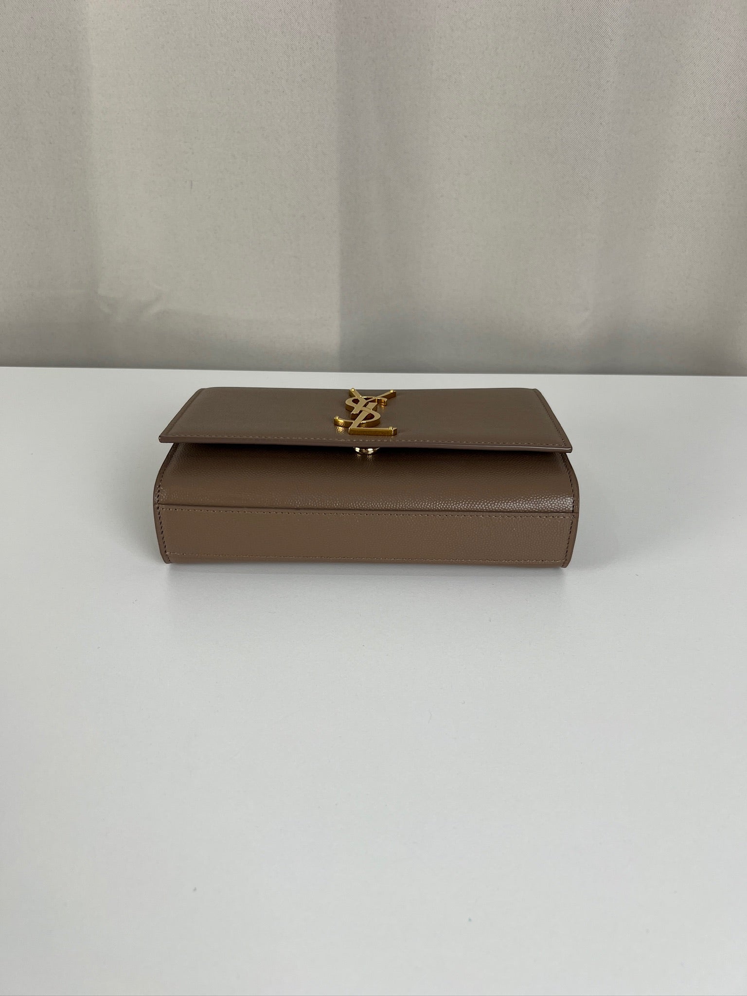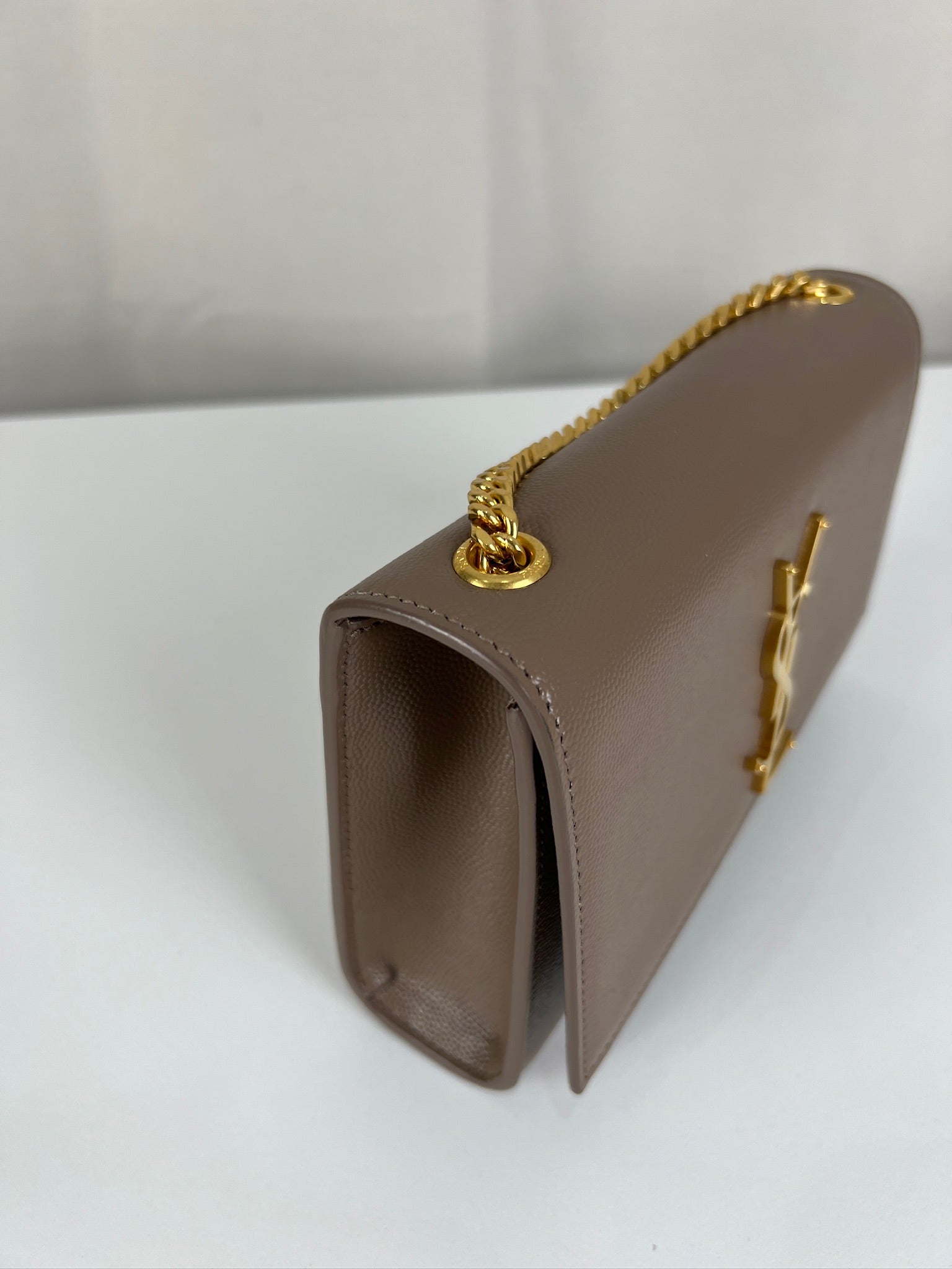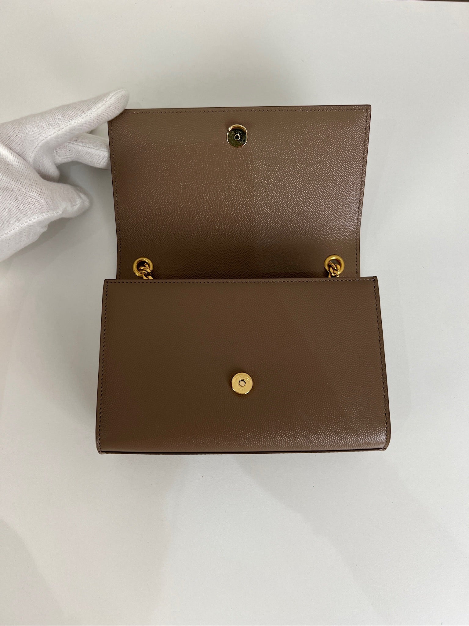 Ce sac Saint Laurent Kate small beige foncé est comme neuf. Le cuir, la garniture et les coins sont en parfait état. L'intérieur est en parfait état. Il est livré avec boite + dustbag + copie de la facture + papiers + Certificat Entrupy.