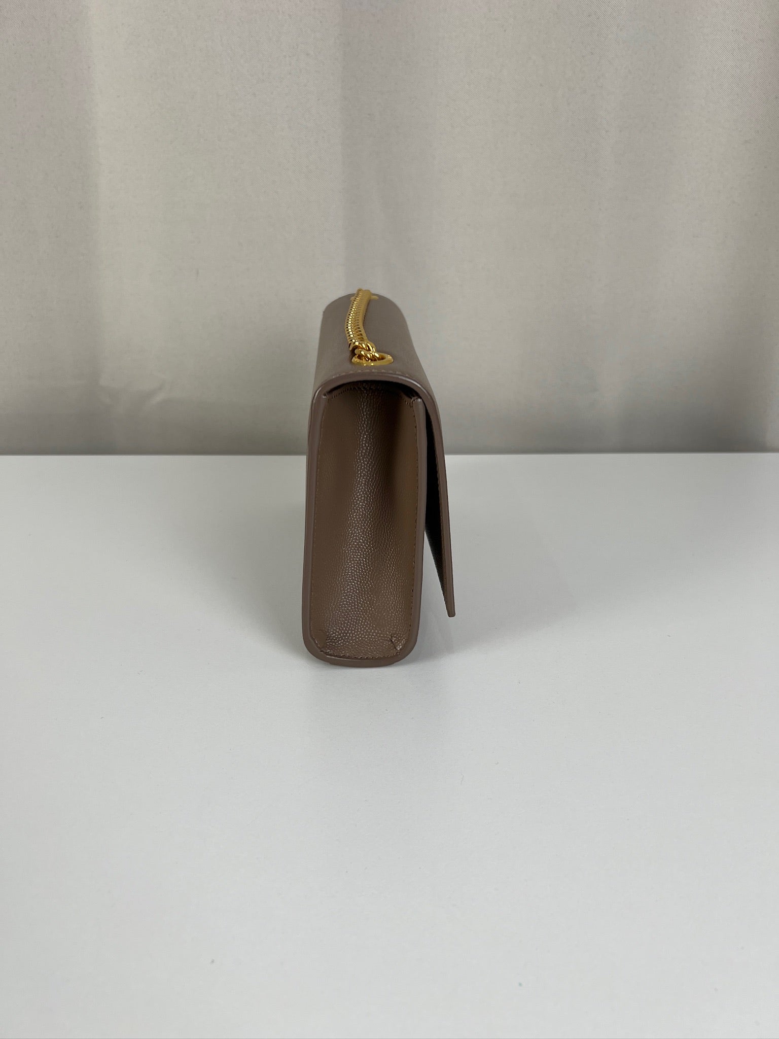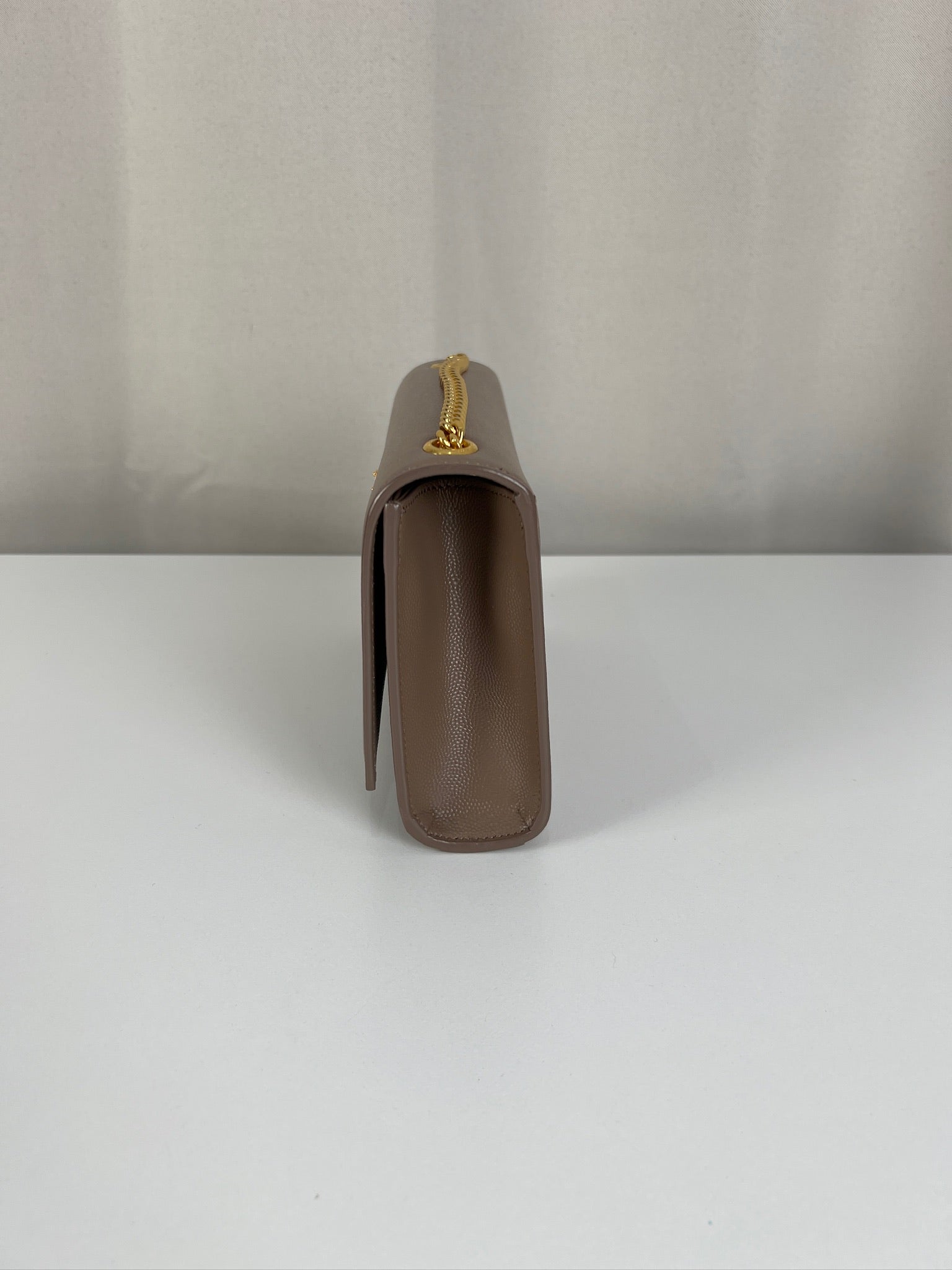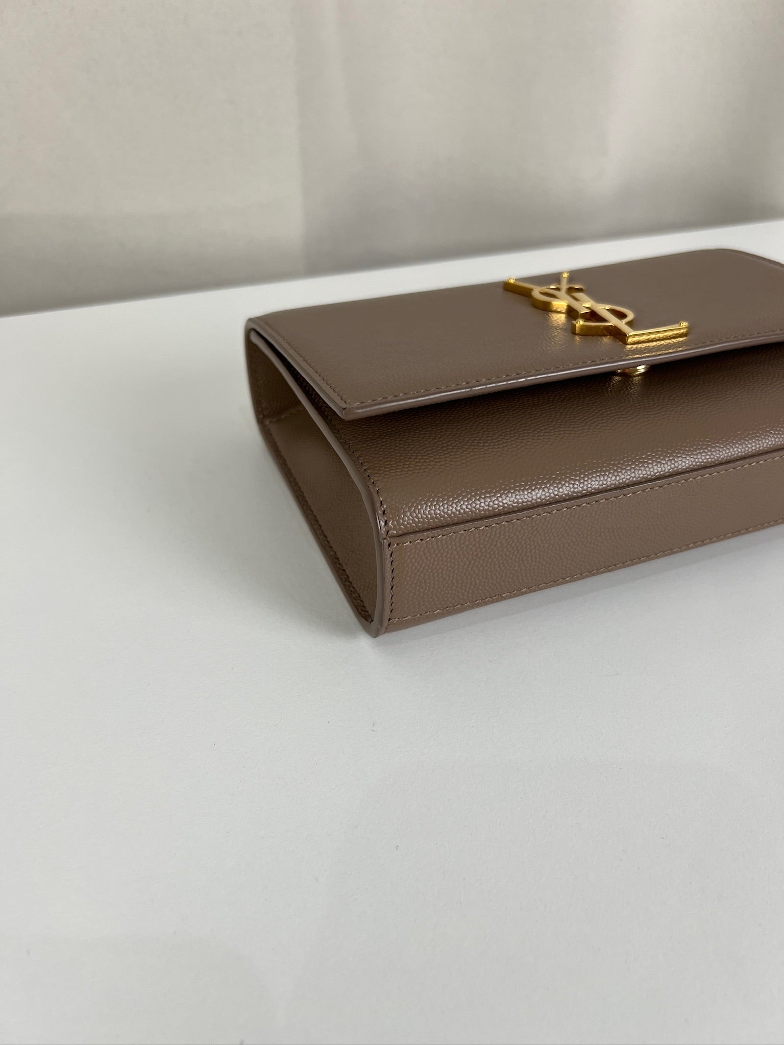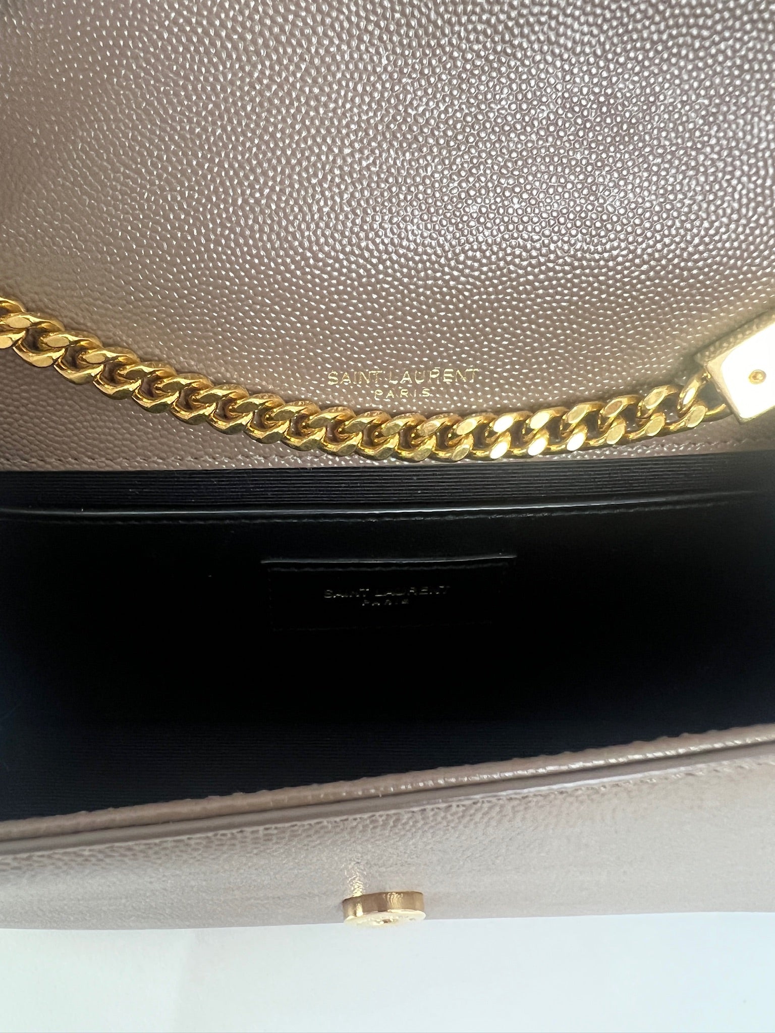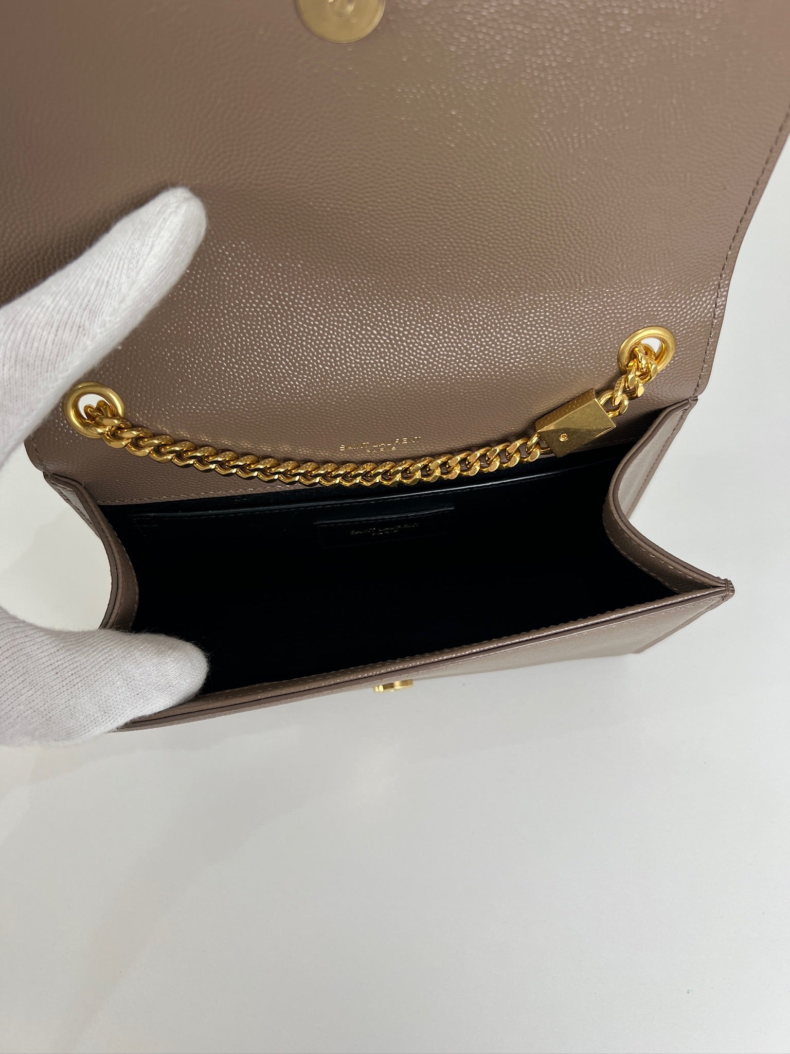 Ce sac Saint Laurent Kate small beige foncé est comme neuf. Le cuir, la garniture et les coins sont en parfait état. L'intérieur est en parfait état. Il est livré avec boite + dustbag + copie de la facture + papiers + Certificat Entrupy.