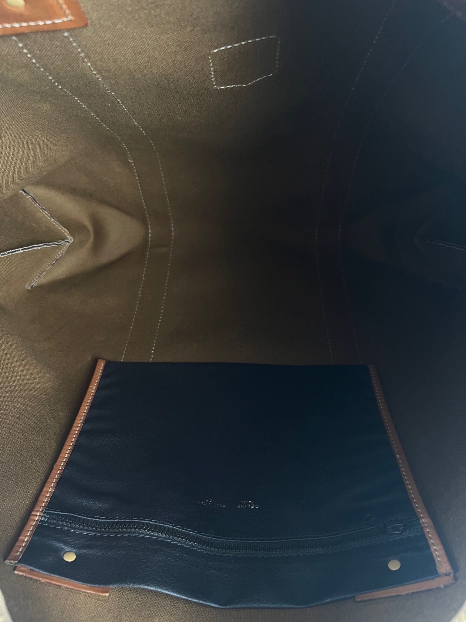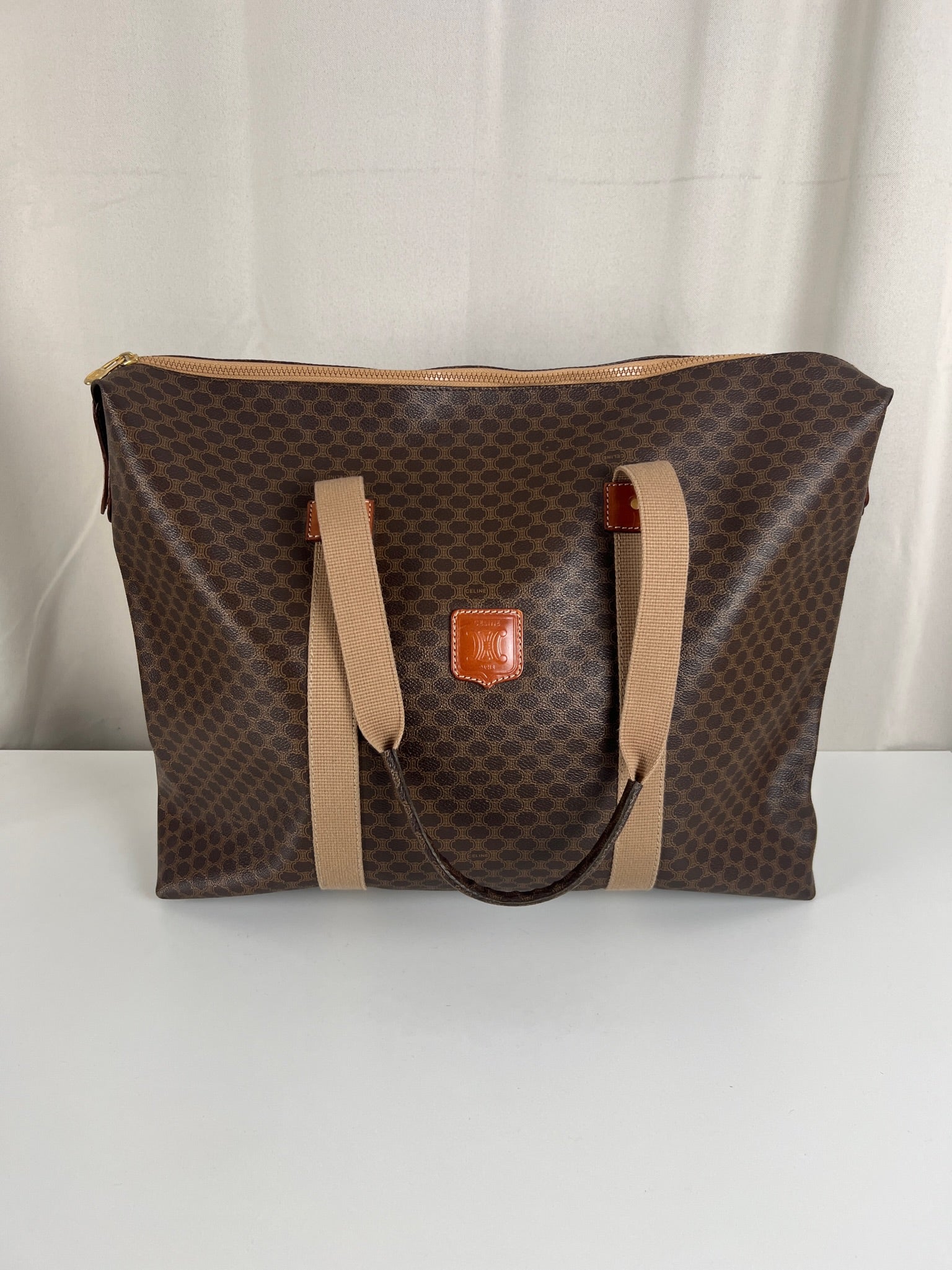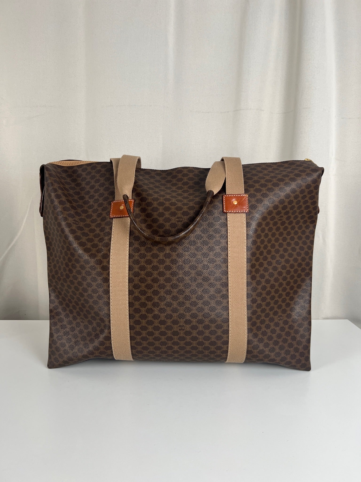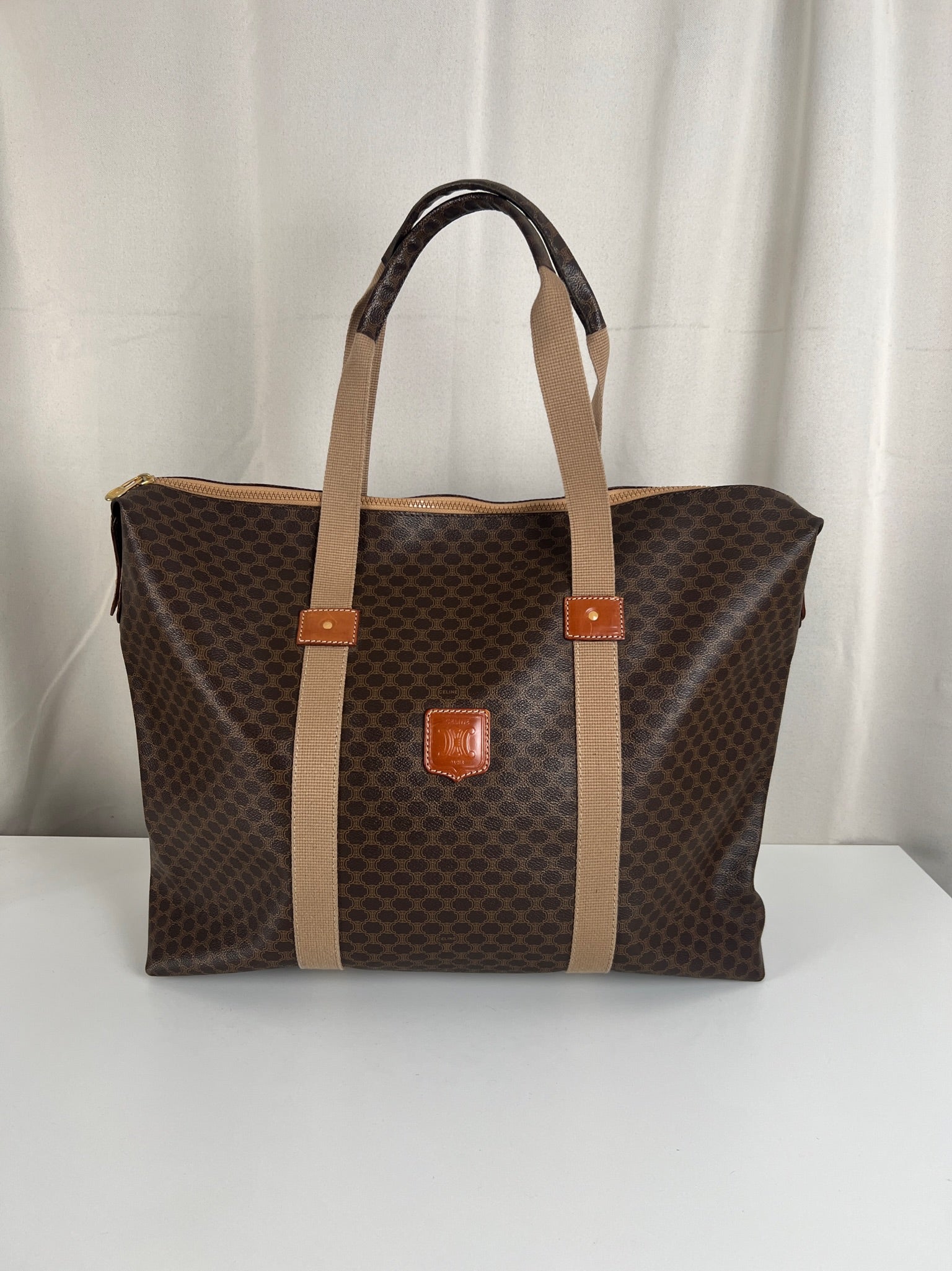 Le cabas de voyage Céline Triomphe est en très bon état. Le cuir est en très bon état. Les poignées sont superbes et les coins présentent également des signes d'usure et sont un peu frottés. L'intérieur est en très bon état. Vous avez une poche zippée à l'intérieur. Le matériel est légèrement utilisé.