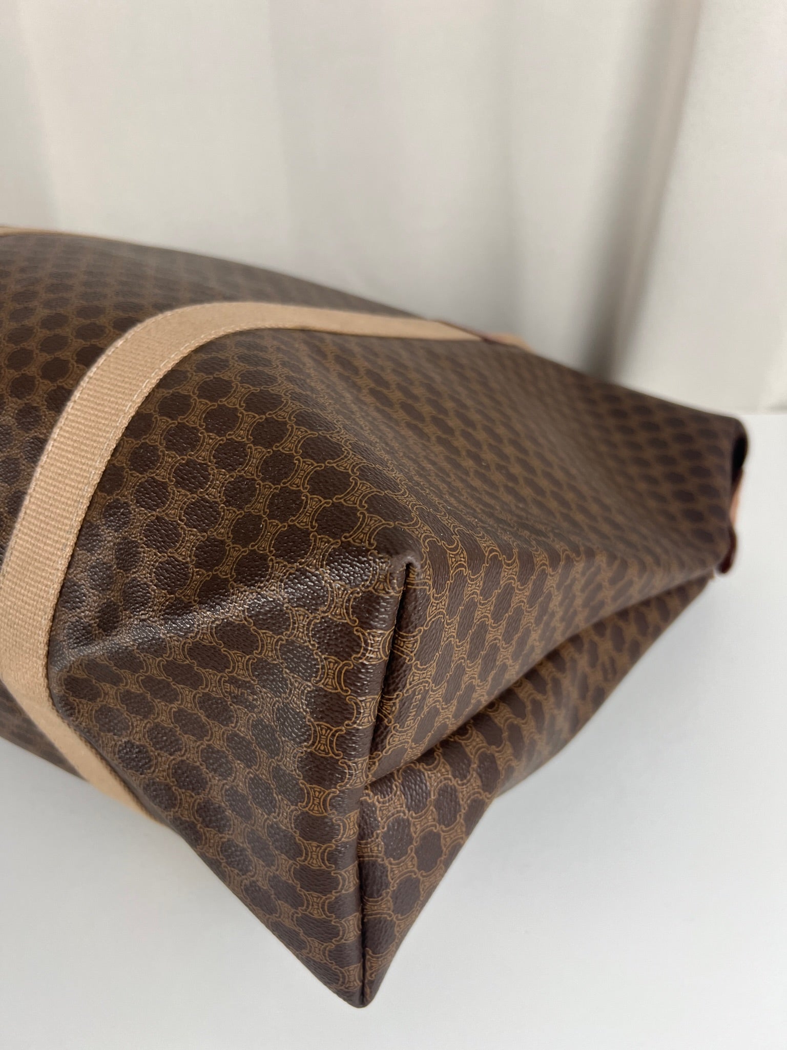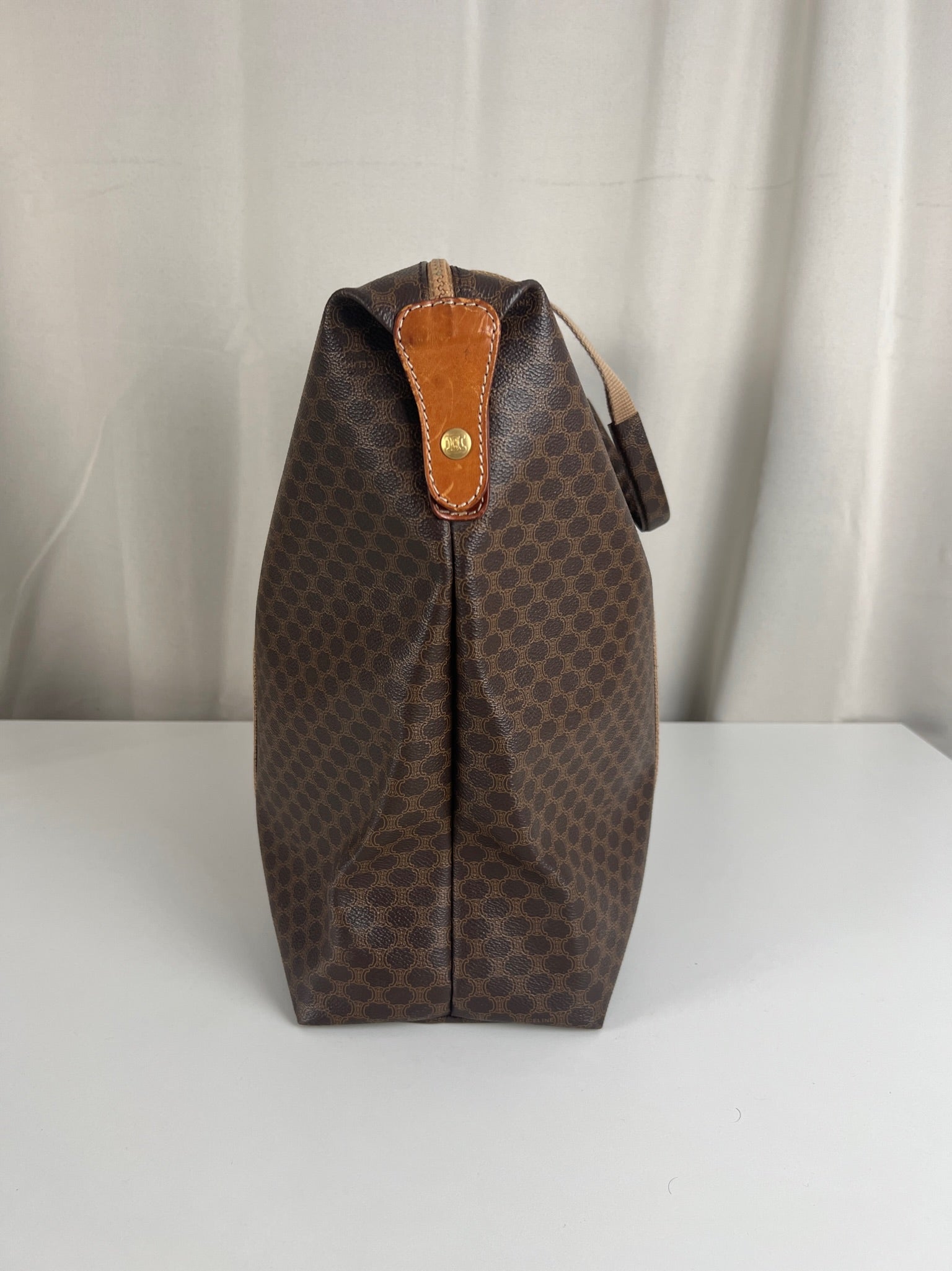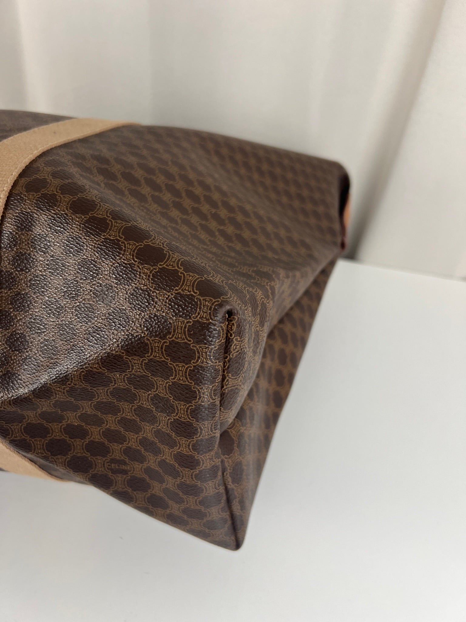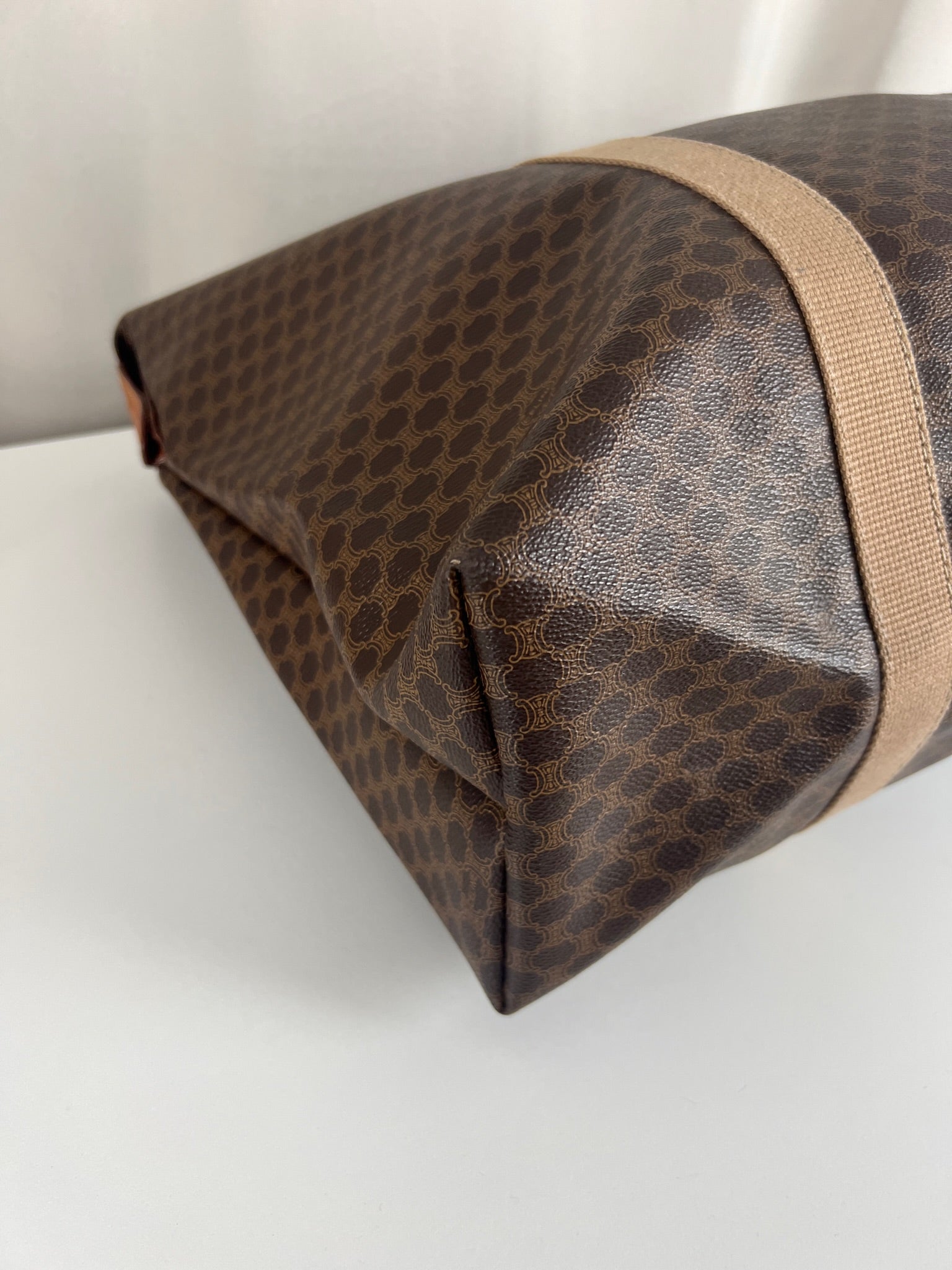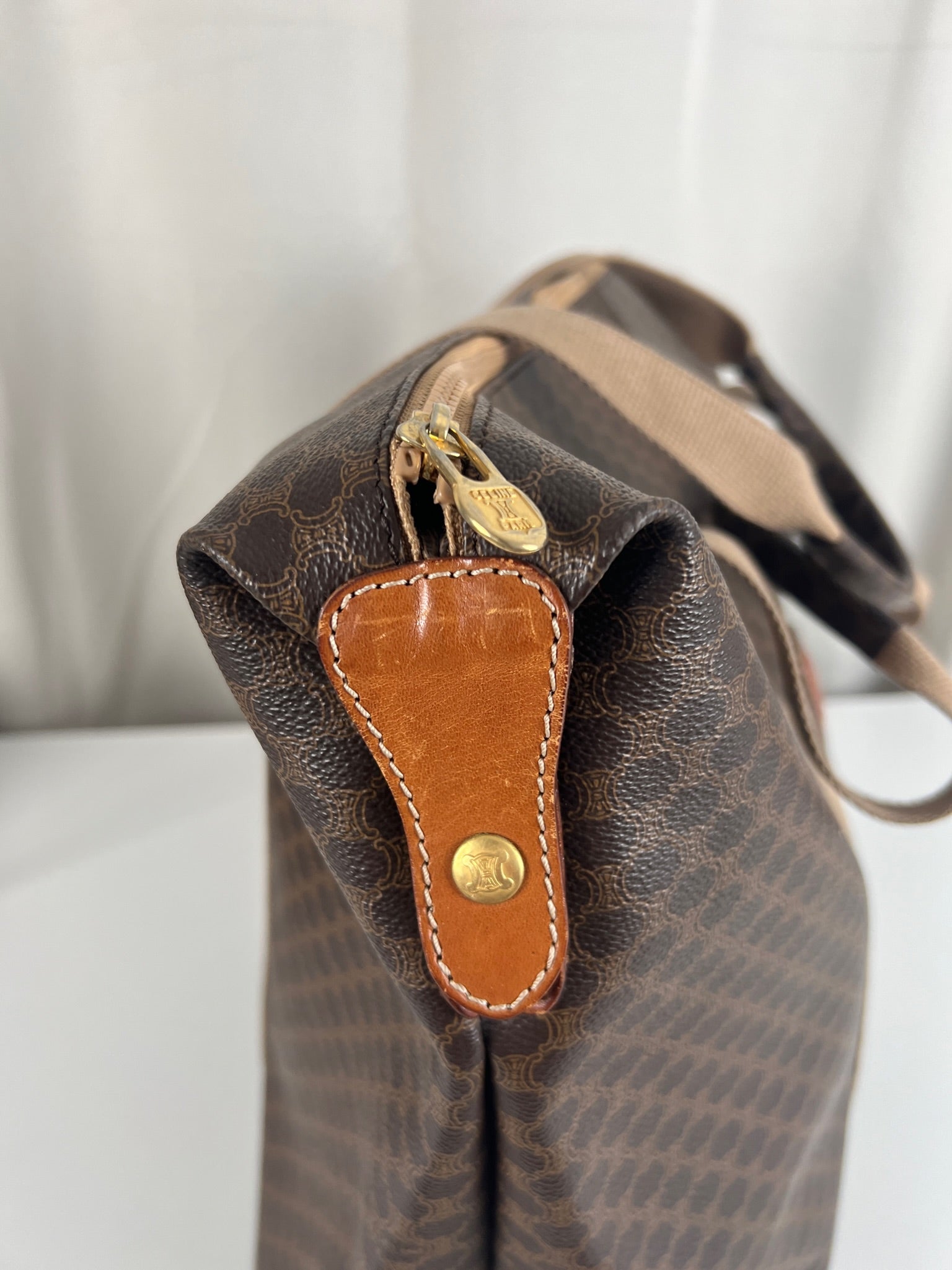Le cabas de voyage Céline Triomphe est en très bon état. Le cuir est en très bon état. Les poignées sont superbes et les coins présentent également des signes d'usure et sont un peu frottés. L'intérieur est en très bon état. Vous avez une poche zippée à l'intérieur. Le matériel est légèrement utilisé.