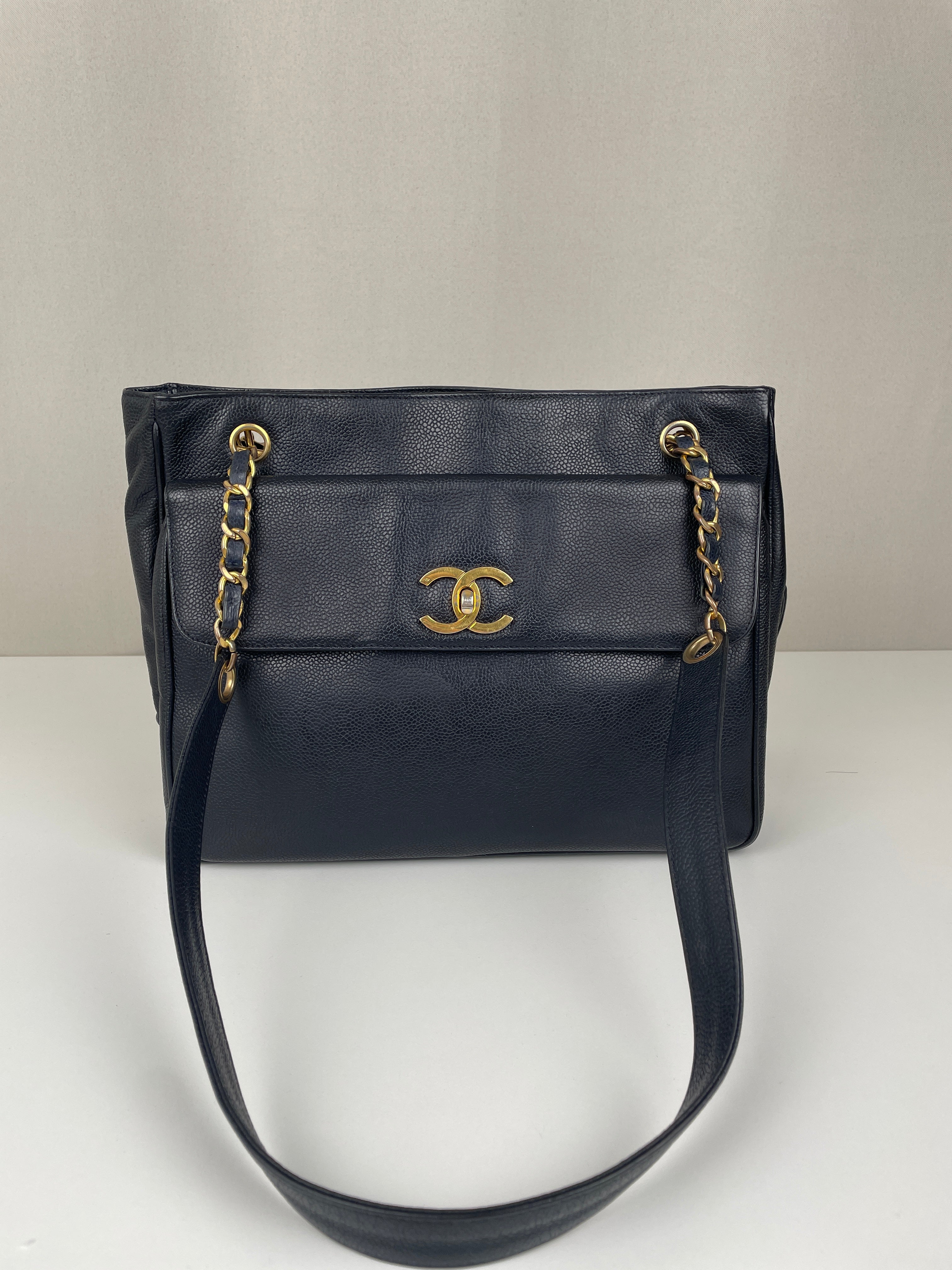 Sac cabas Chanel en cuir grainé bleu marine