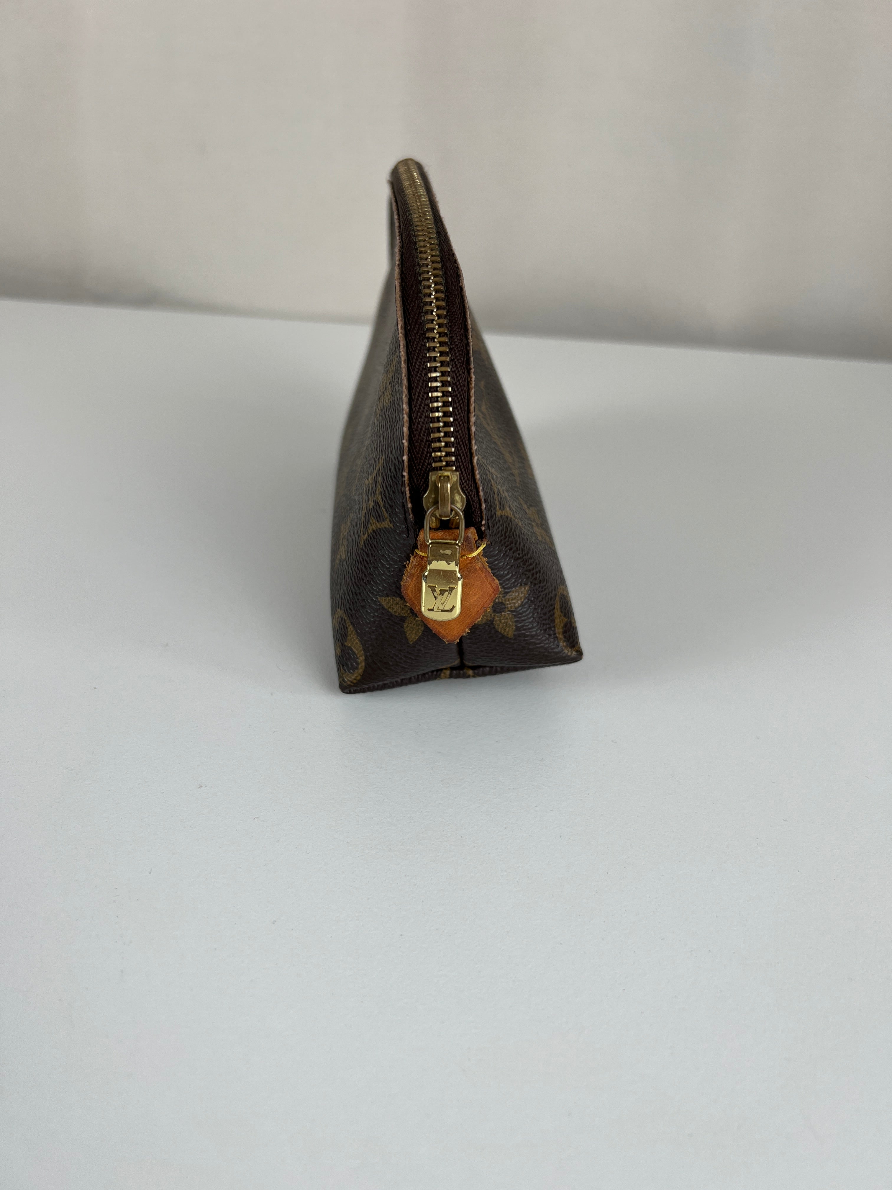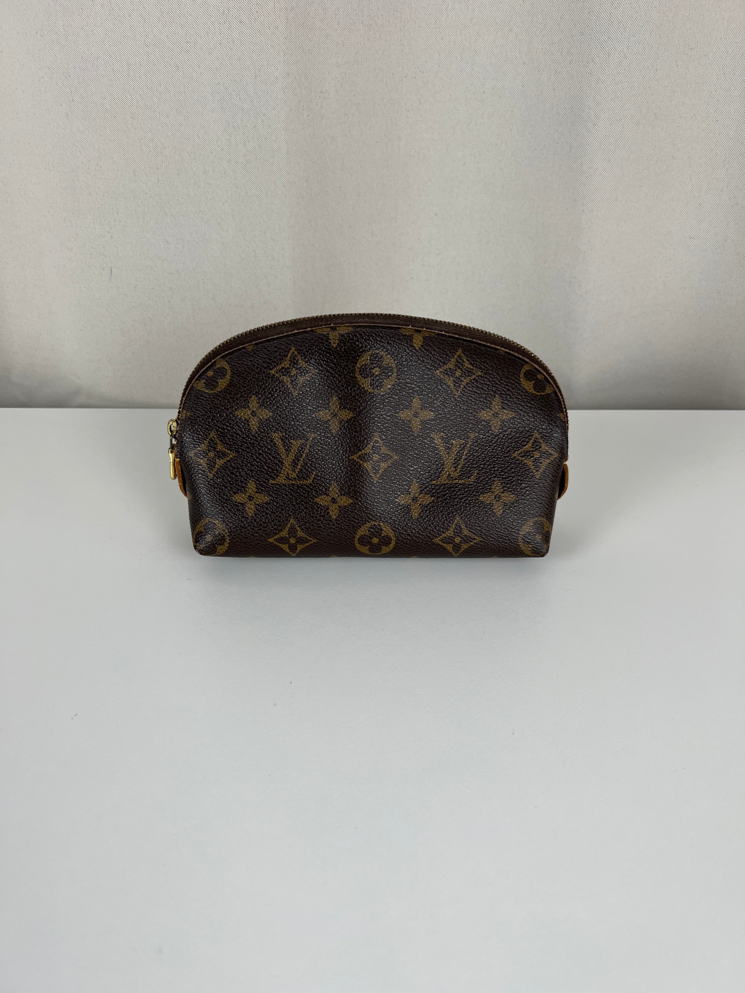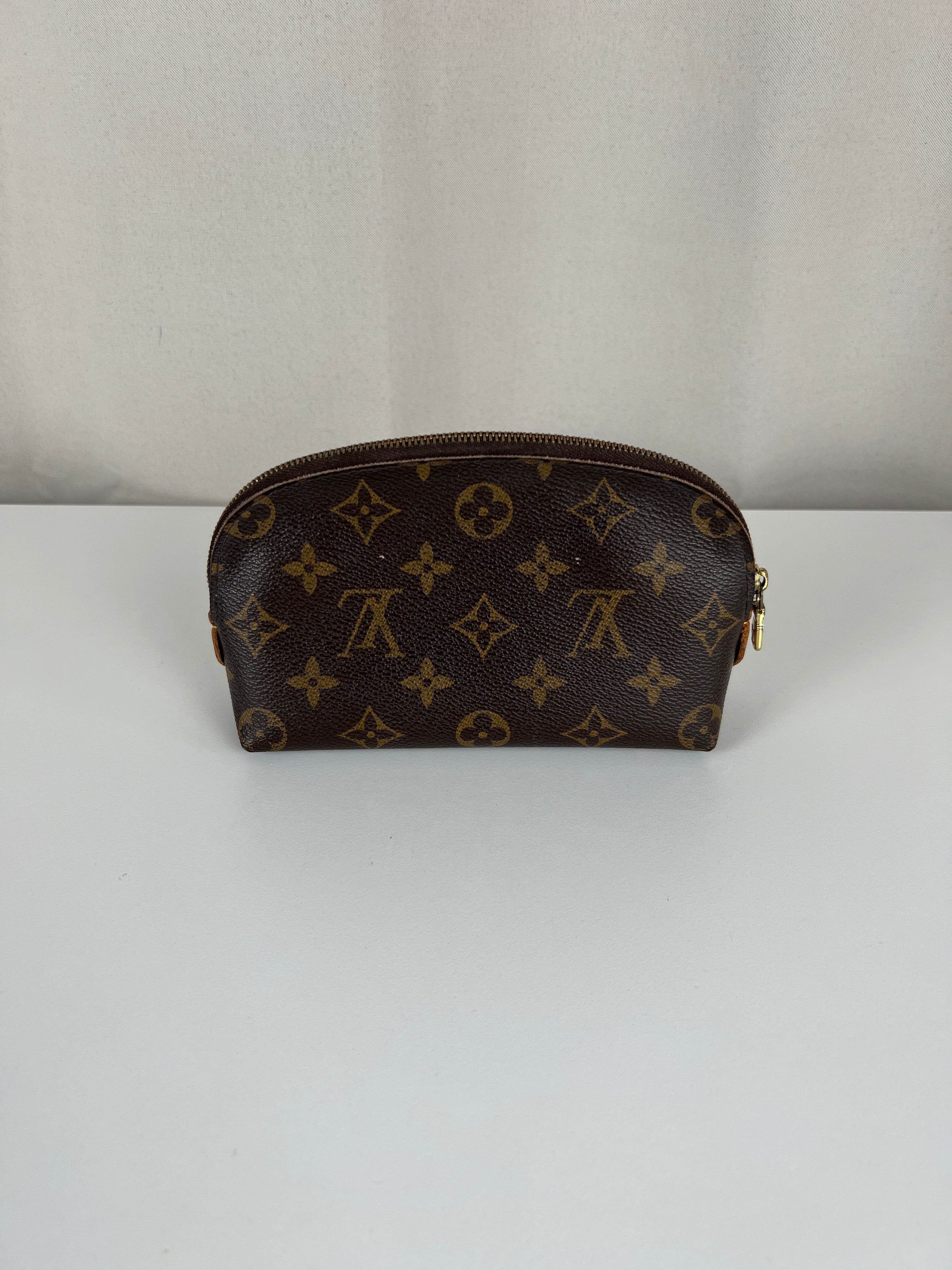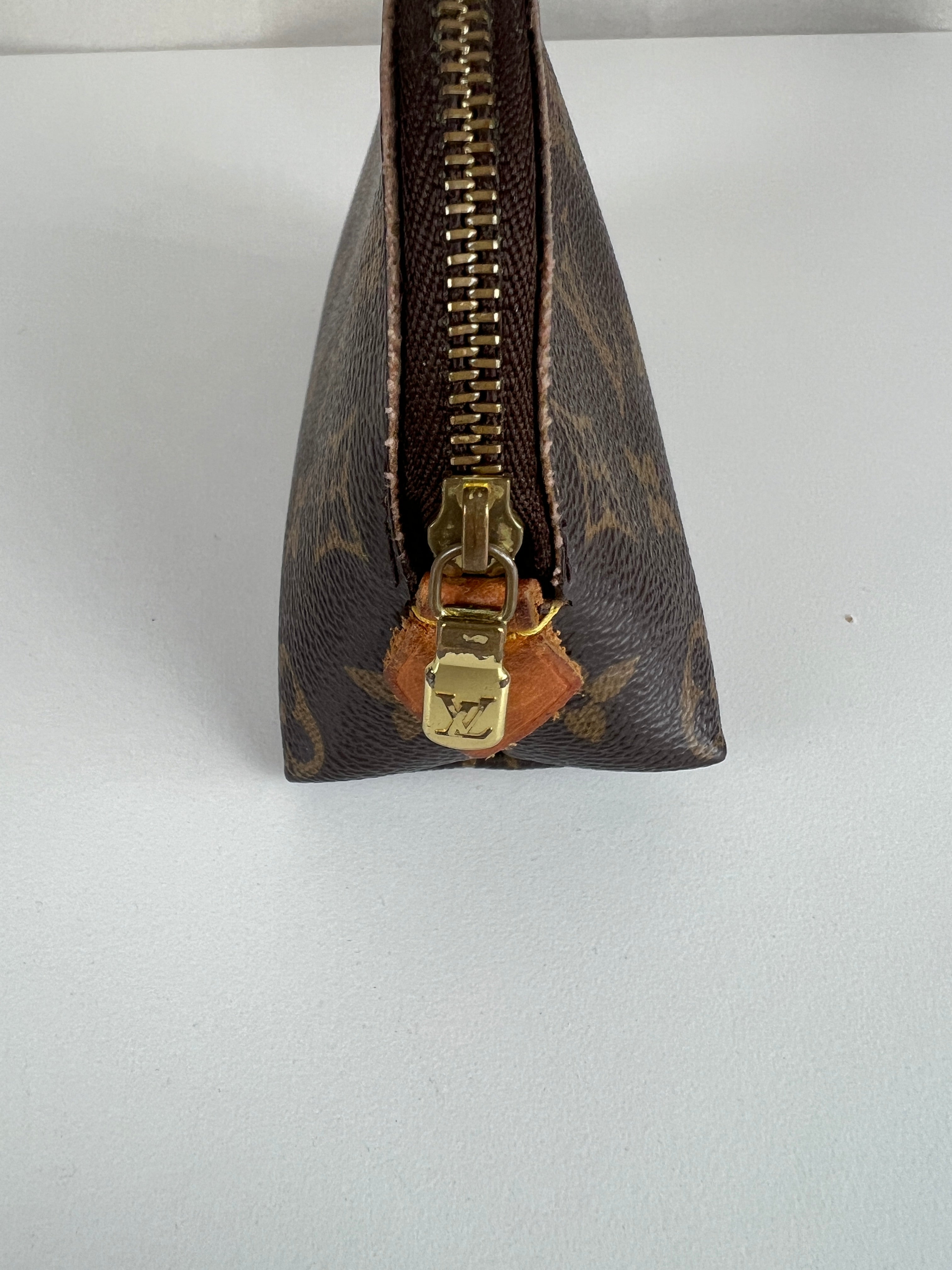 Cette pochette cosmétique Louis Vuitton est en très bon état. La toile est en très bon état. Les coins sont un peu frottés. L'intérieur est en bon état. La bijouterie est rayé. Les parties en cuir proches de la fermeture éclair sont un peu abîmées comme d'habitude sur ce type de pochette.