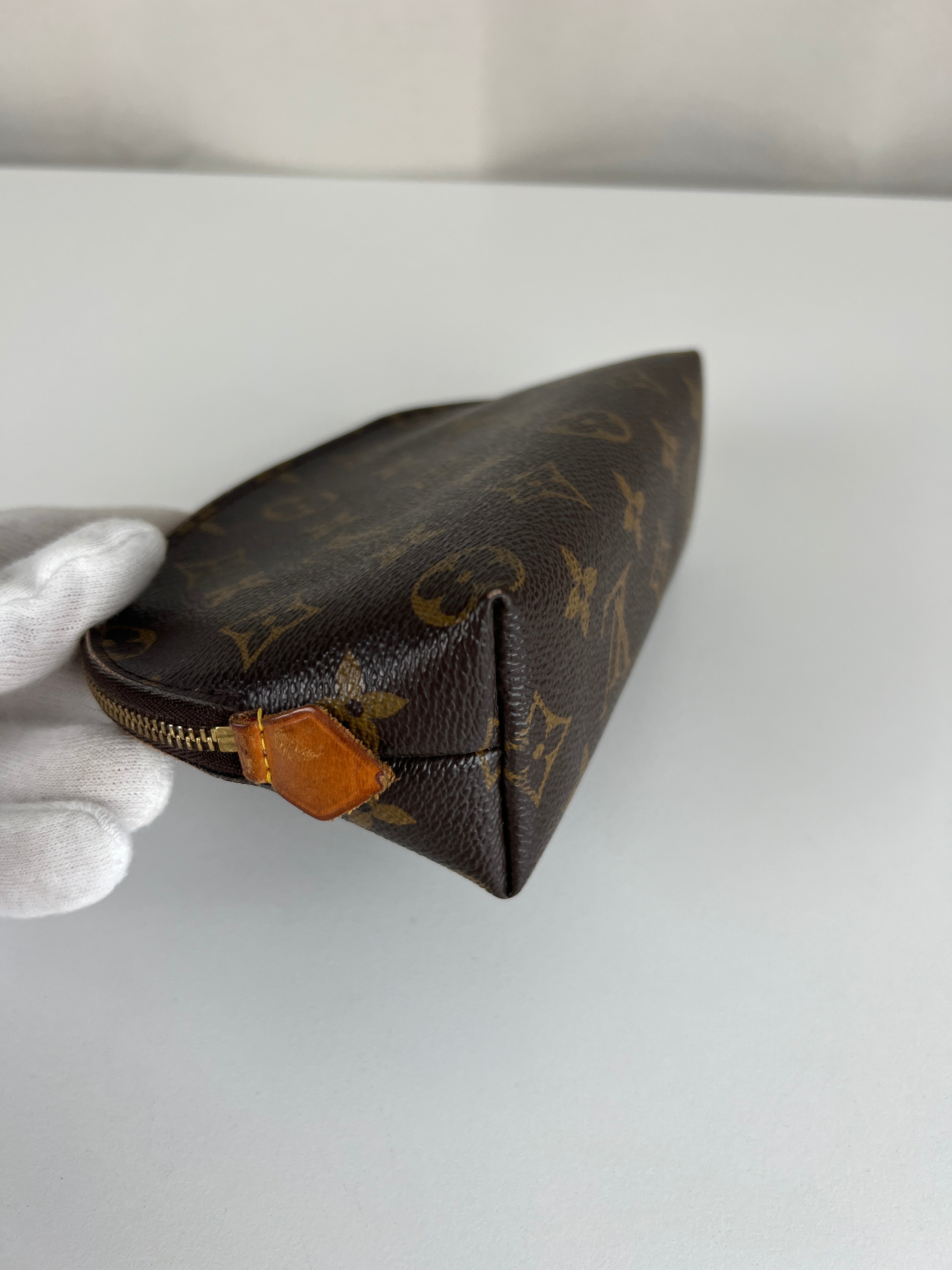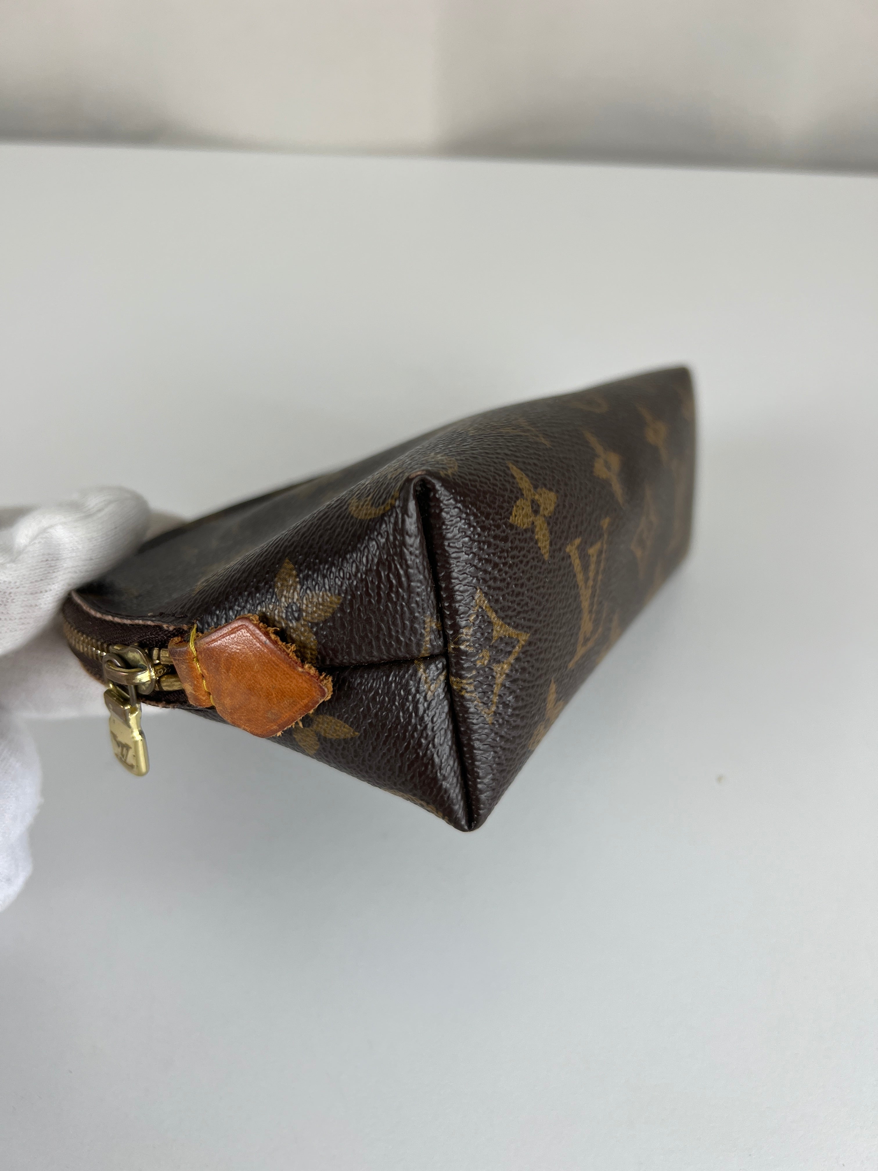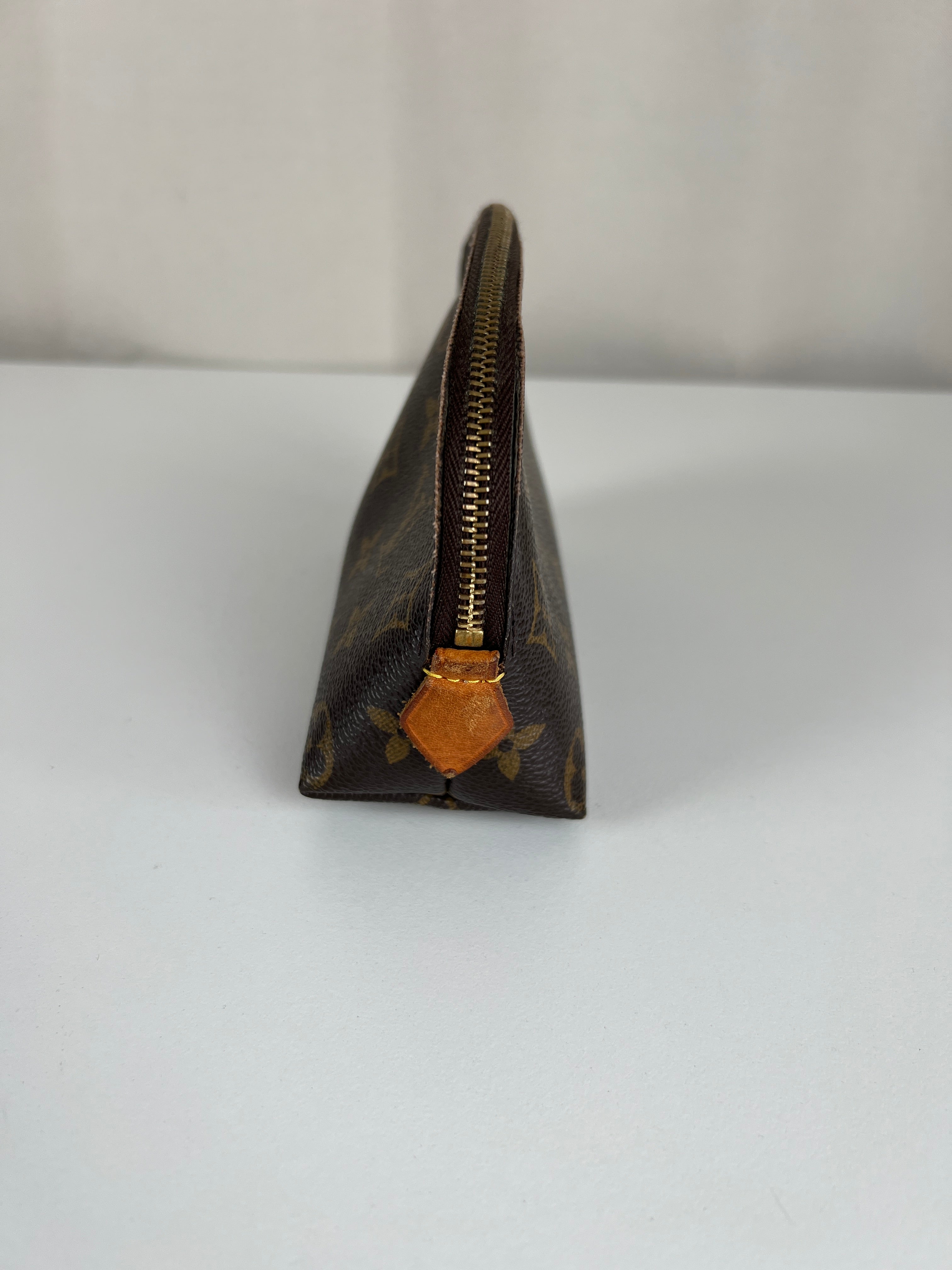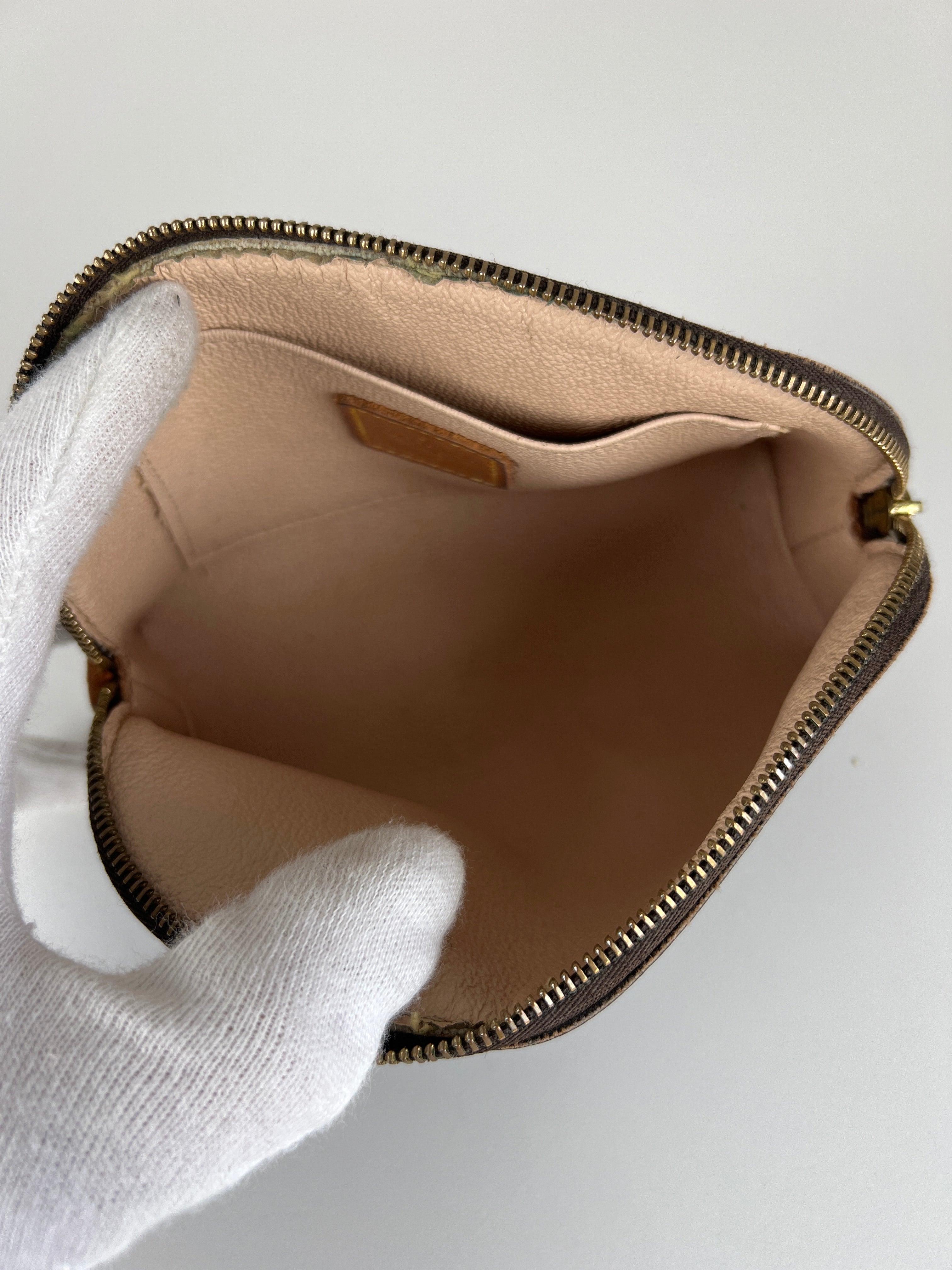 Cette pochette cosmétique Louis Vuitton est en très bon état. La toile est en très bon état. Les coins sont un peu frottés. L'intérieur est en bon état. La bijouterie est rayé. Les parties en cuir proches de la fermeture éclair sont un peu abîmées comme d'habitude sur ce type de pochette.