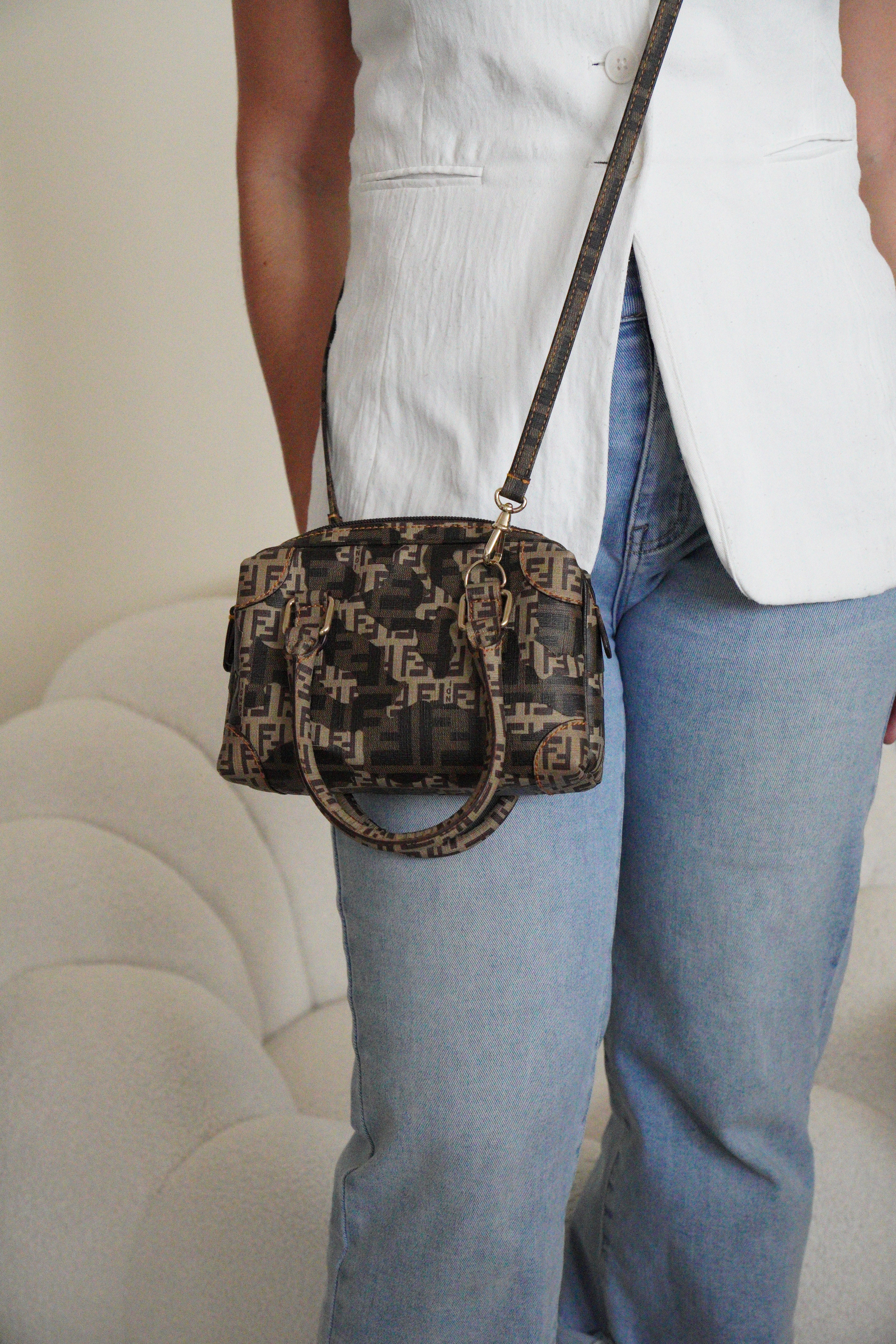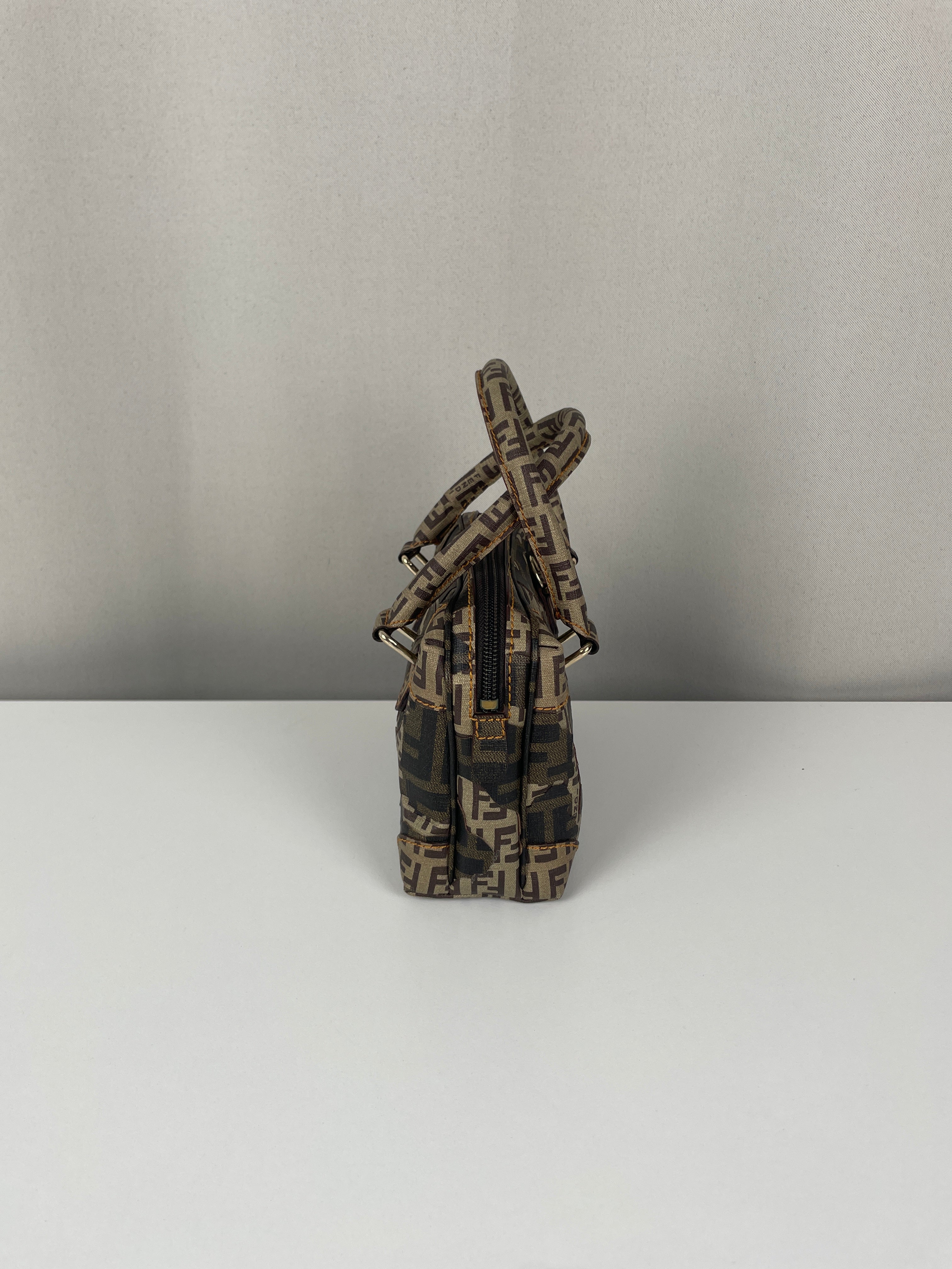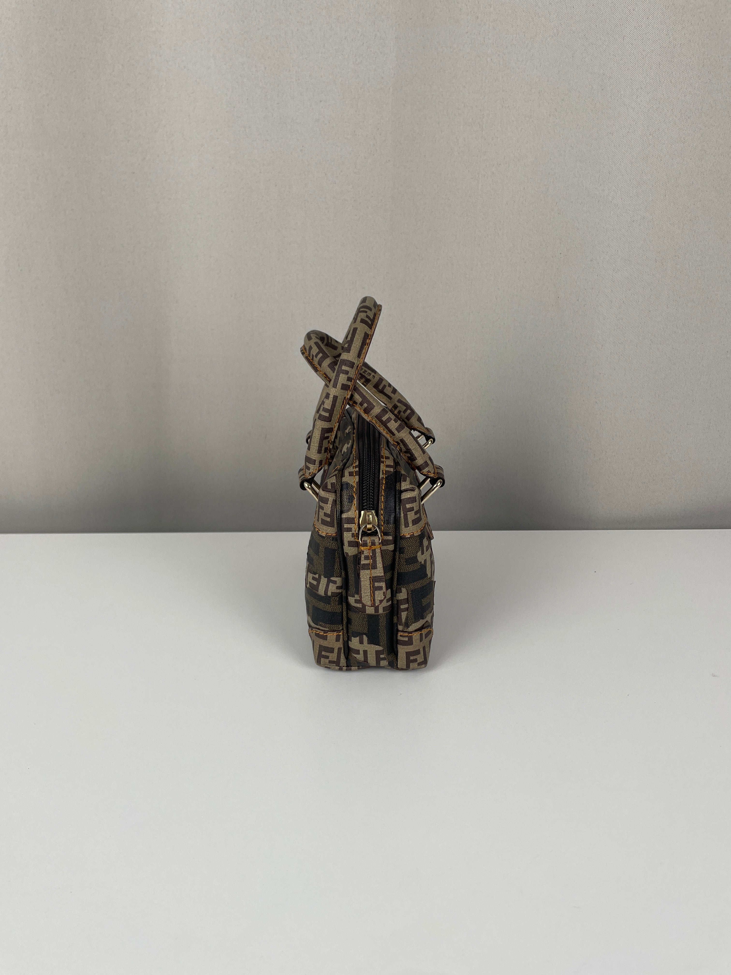 Petit bijou signé Fendi, le Mini Zucchino Militaire met en avant le célèbre motif à double F dans une teinte kaki subtilement inspirée du style militaire. Réalisé en toile résistante et rehaussé d’une bijouterie argentée, il allie élégance et praticité. Parfait pour le jour comme pour le soir, il reflète toute la sophistication italienne et intemporelle de la Maison Fendi.