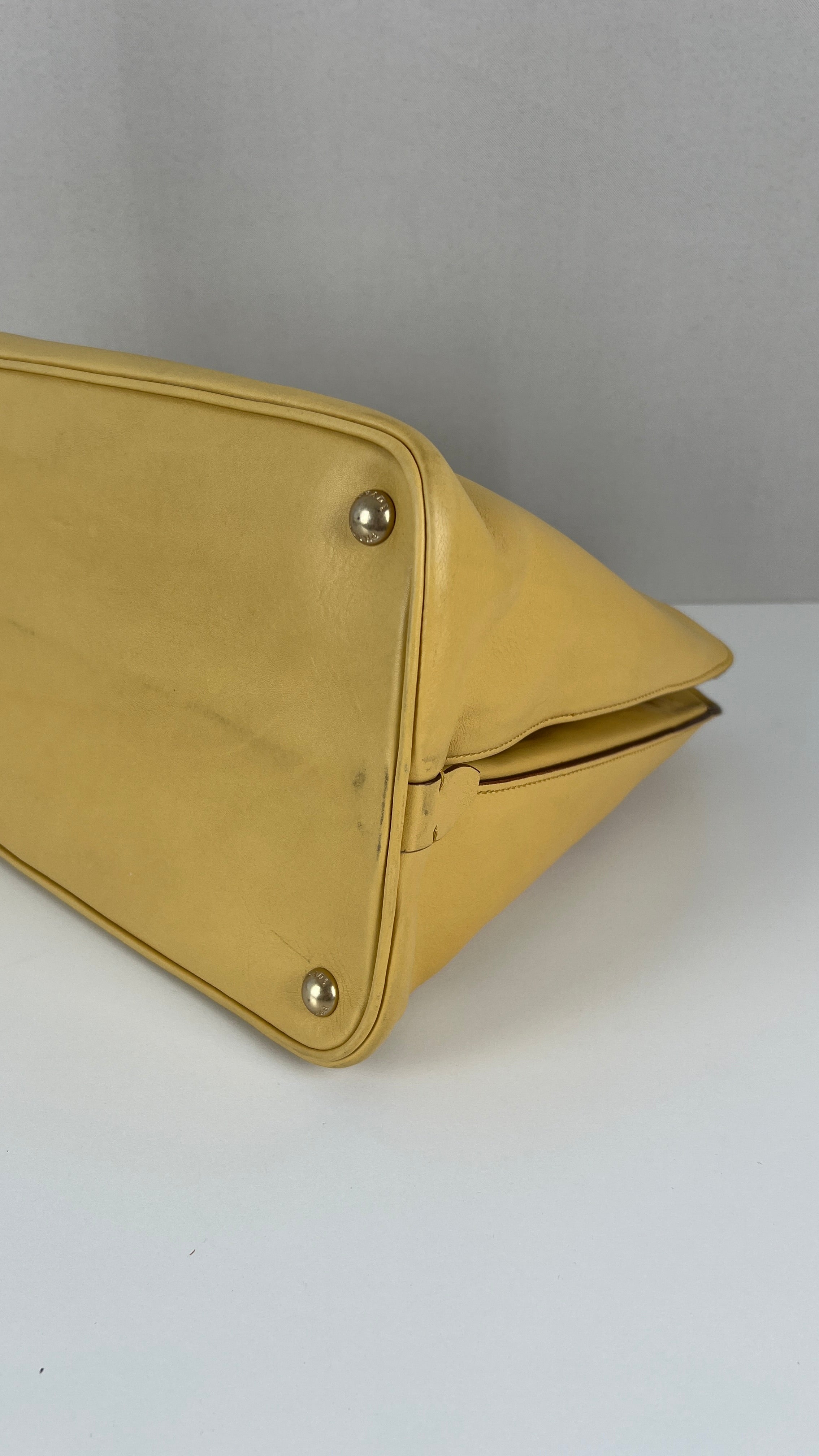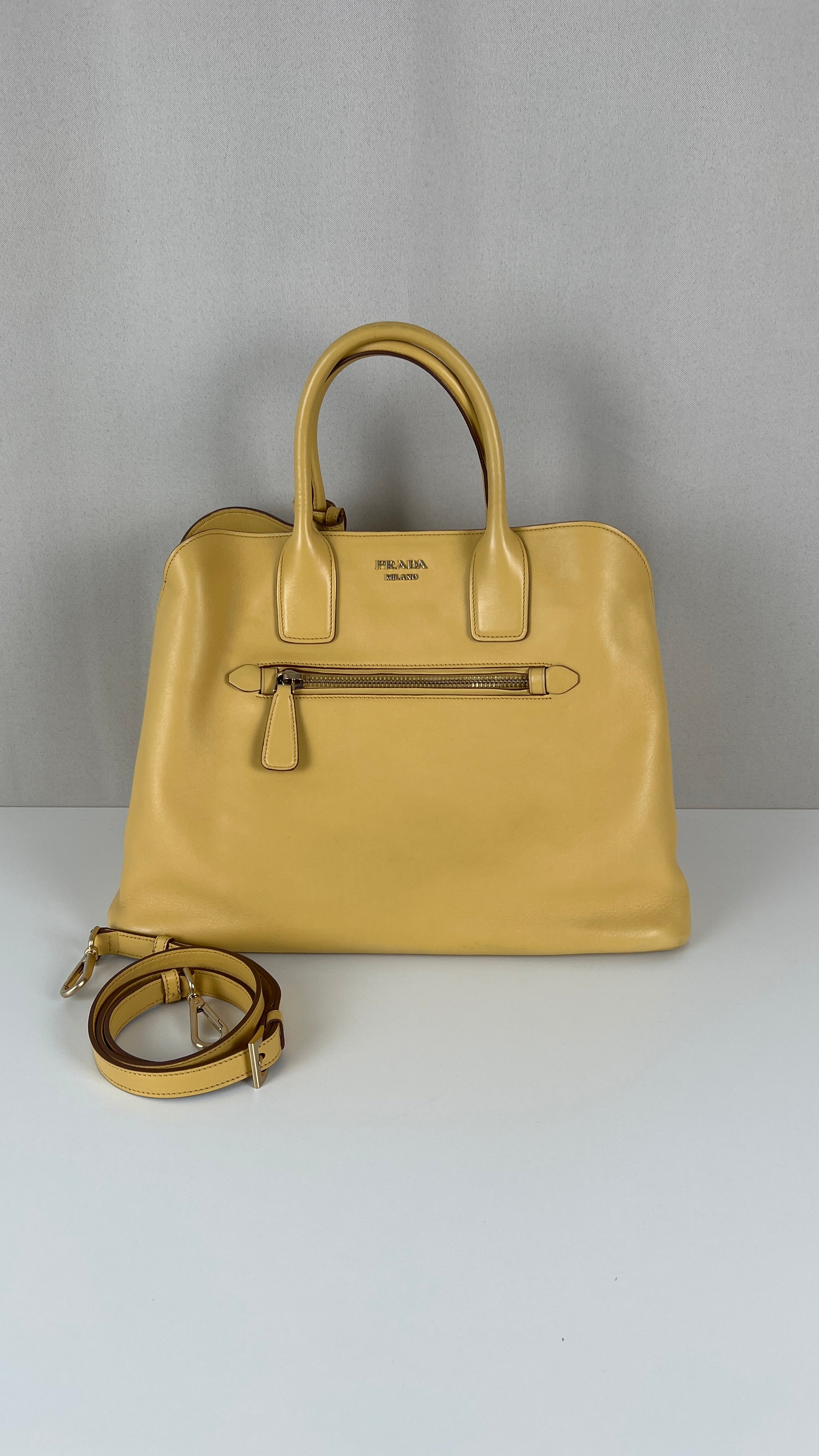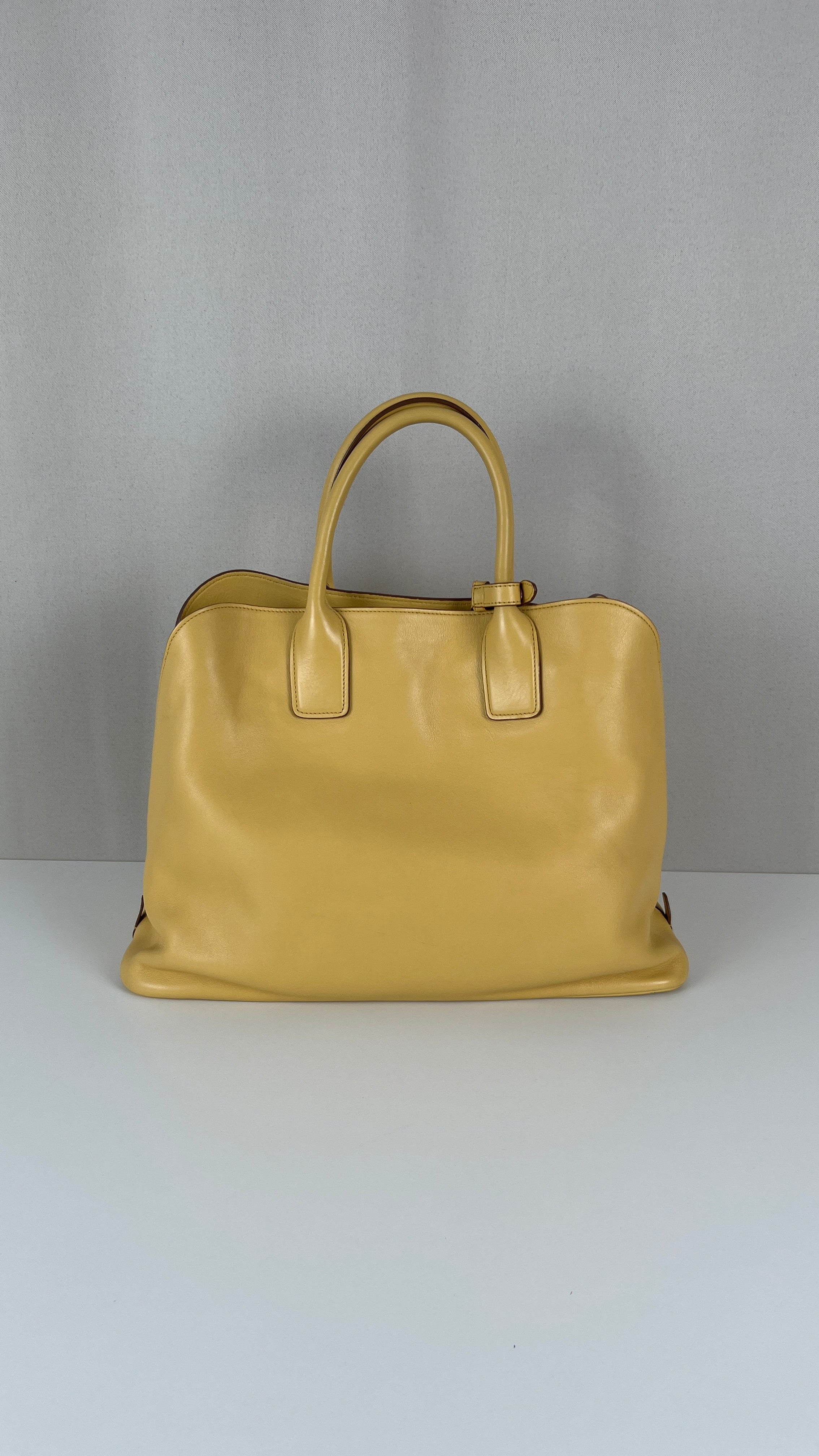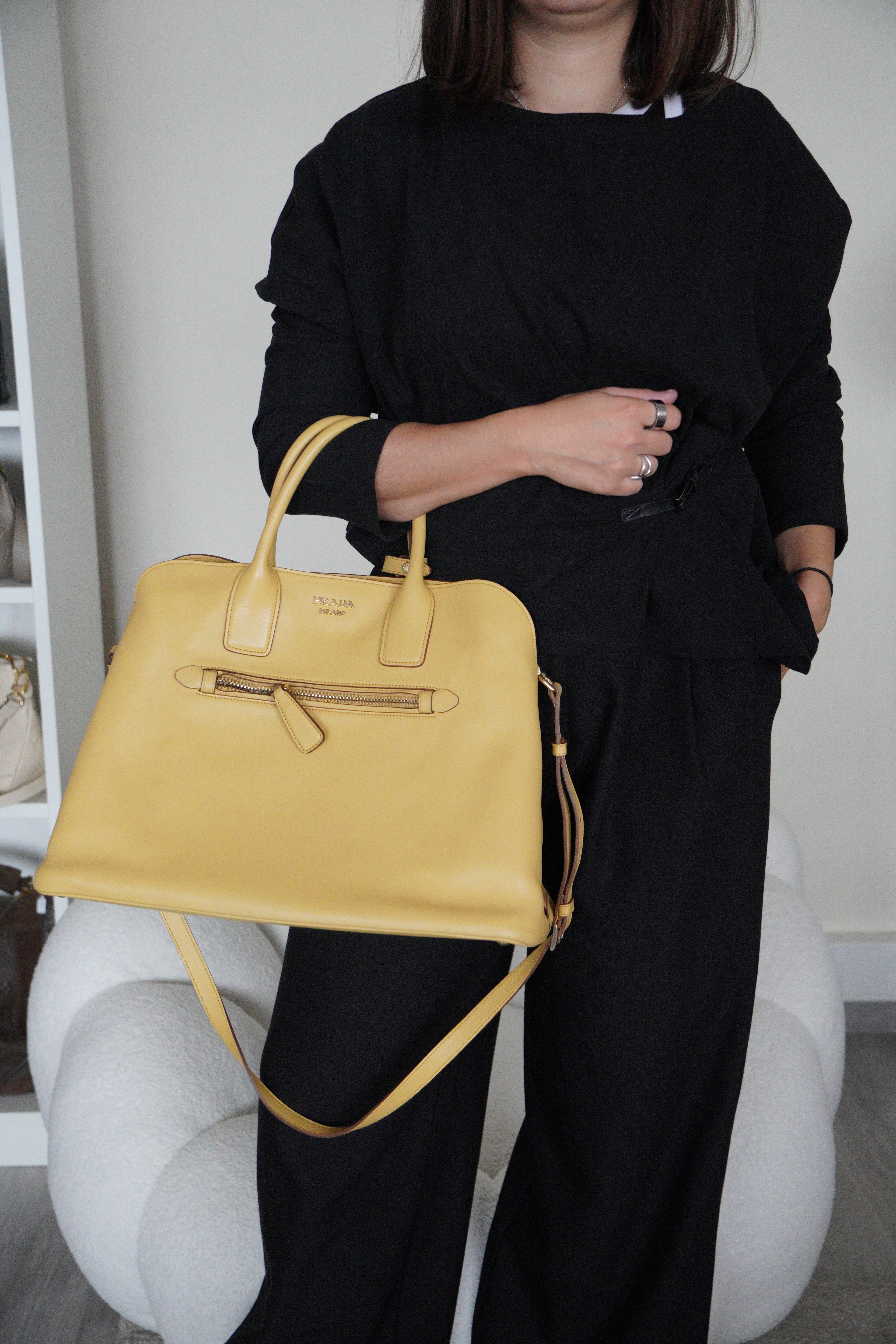 Avec son design minimaliste et son excellent état, ce cabas Prada est une trouvaille d'occasion raffinée, alliant élégance, fonctionnalité et valeur durable. Sa couleur jaune pâle est parfaite pour la saison printemps-été. Ce sac Prada est donc idéal pour le printemps-été.