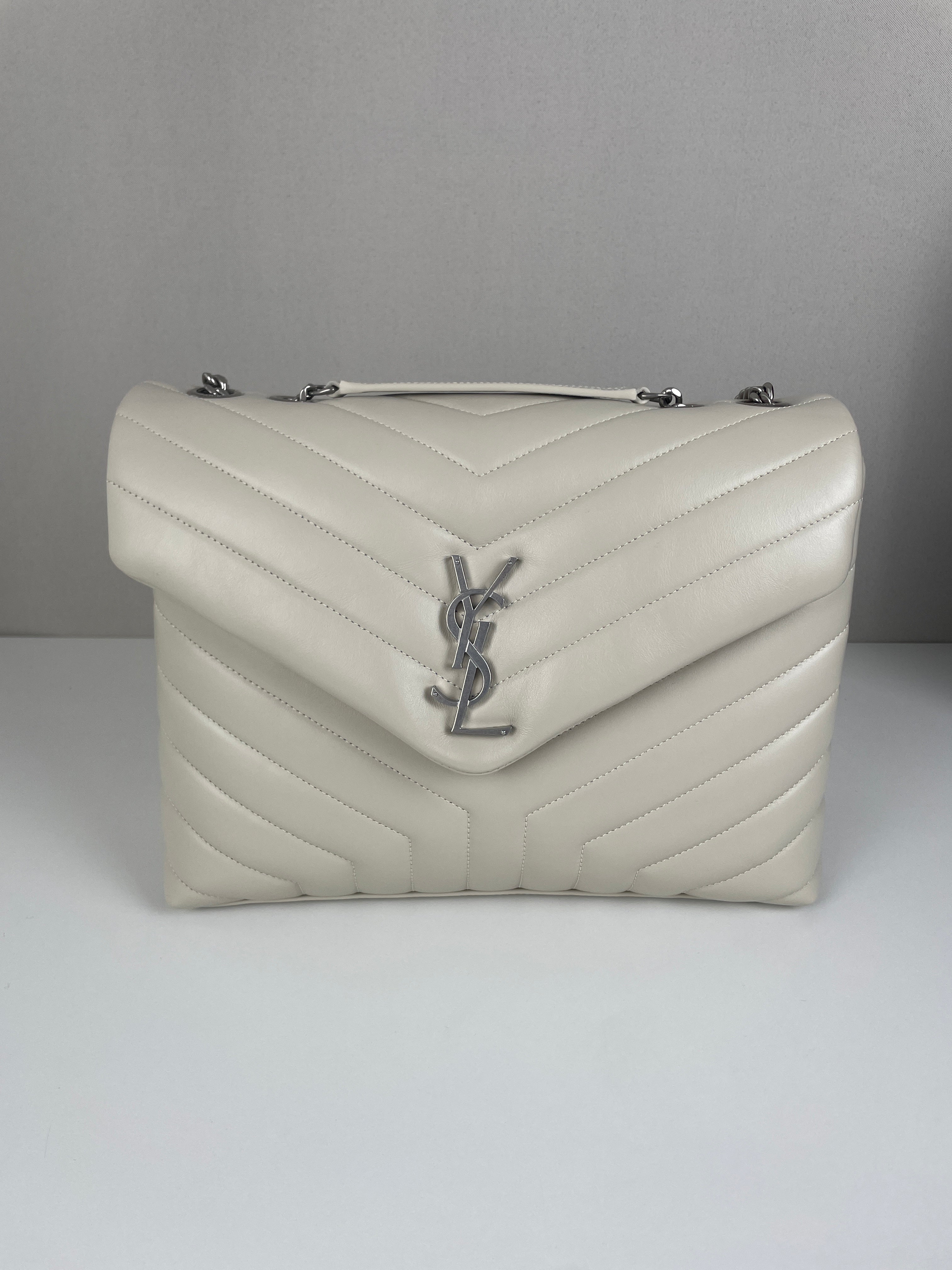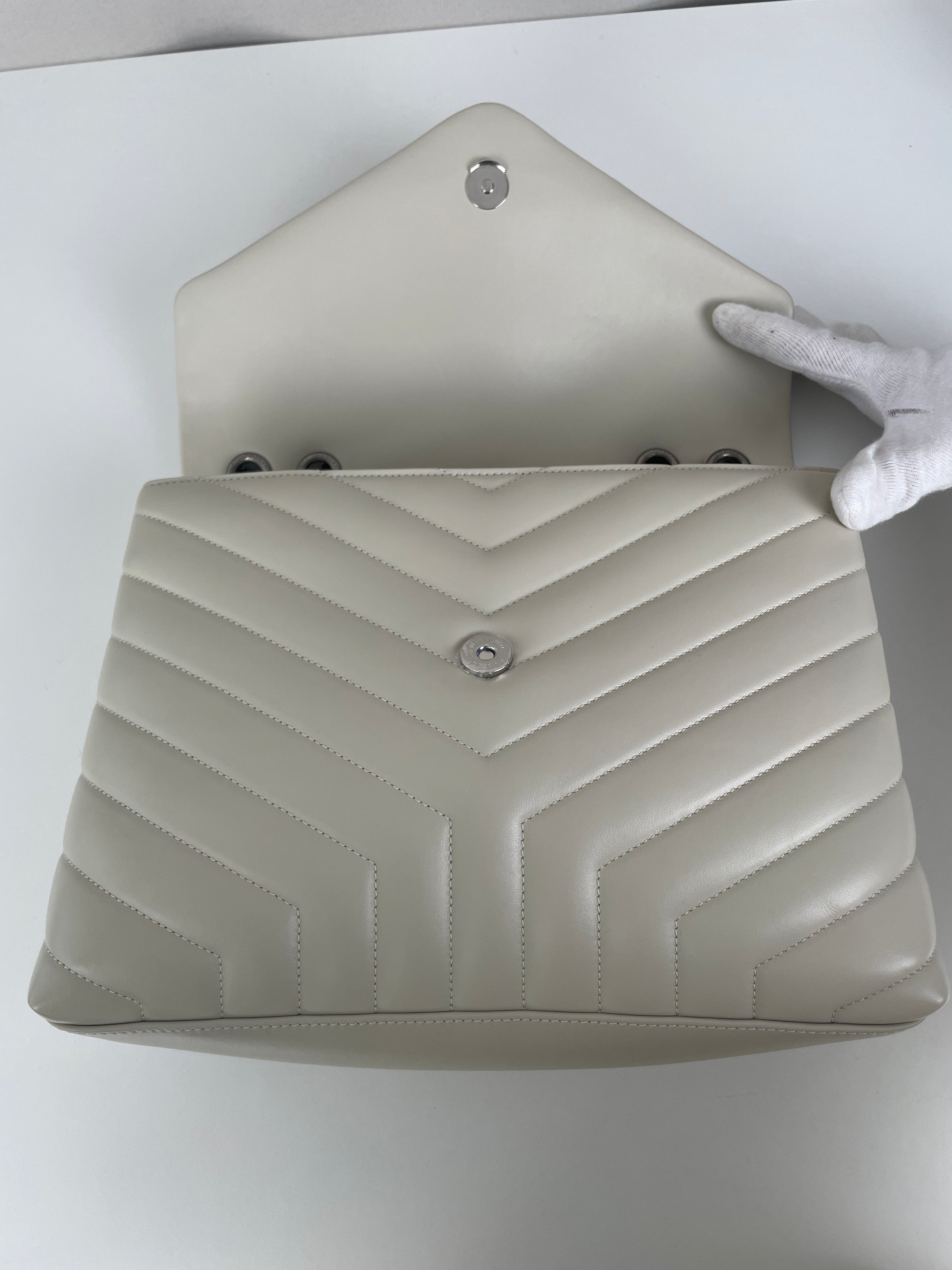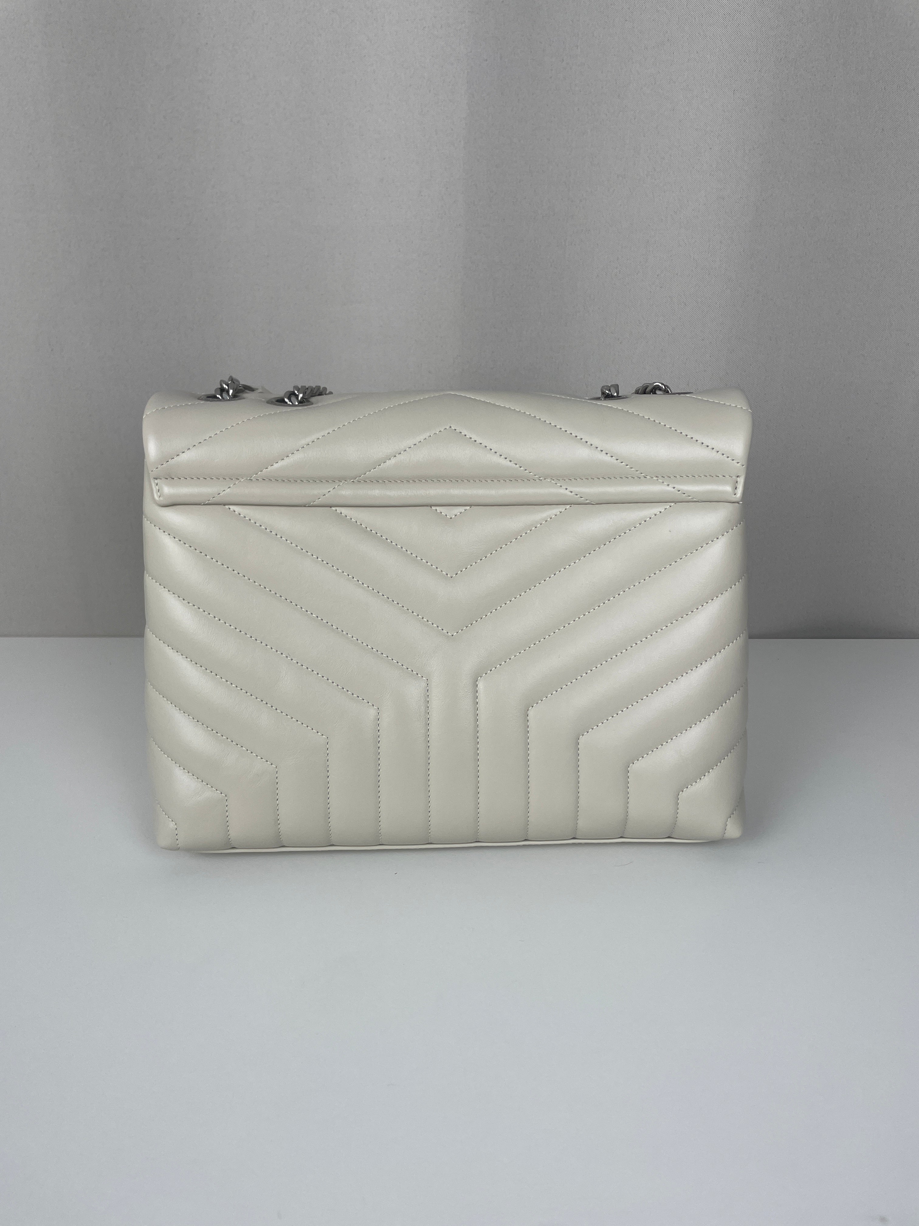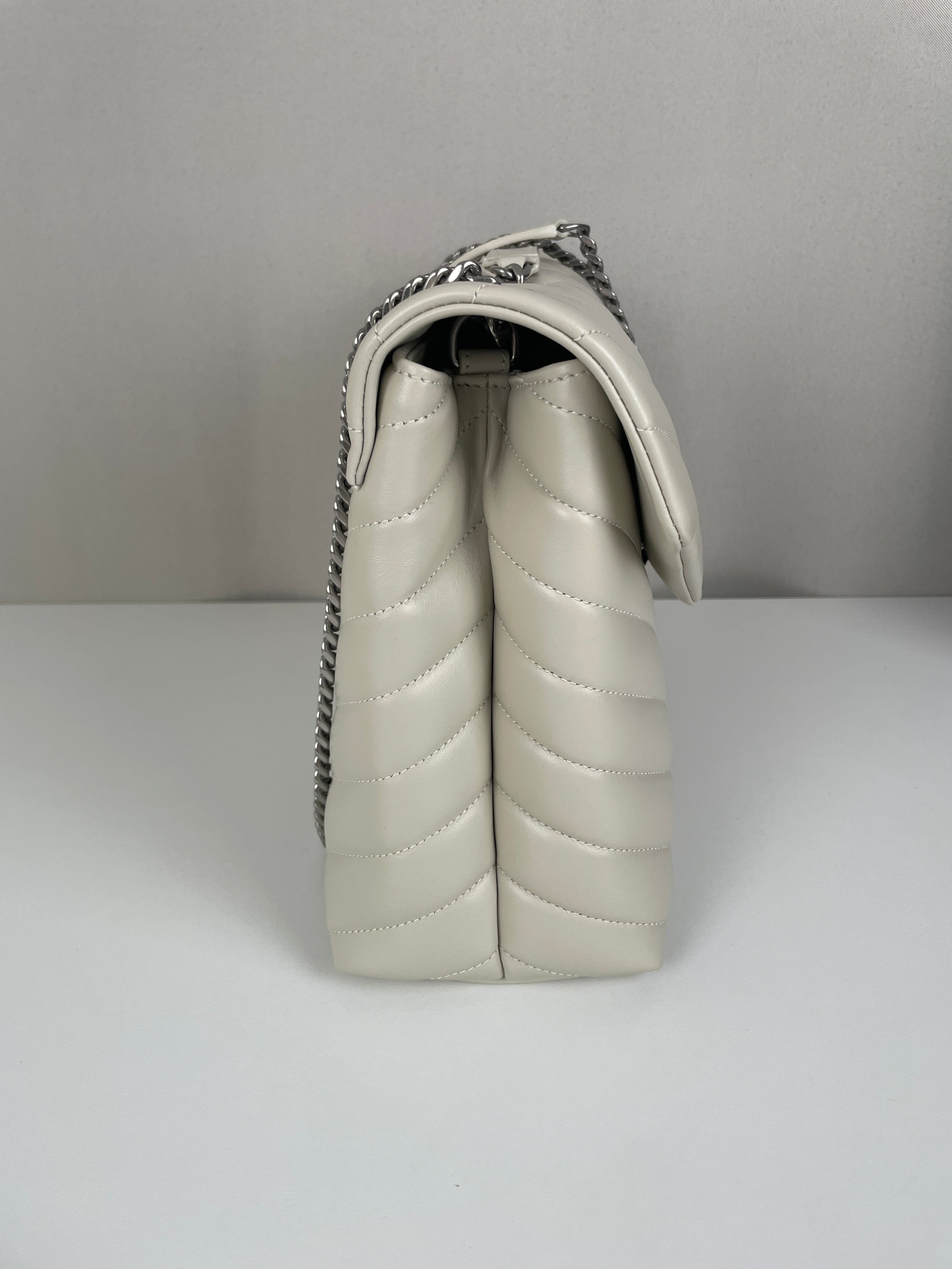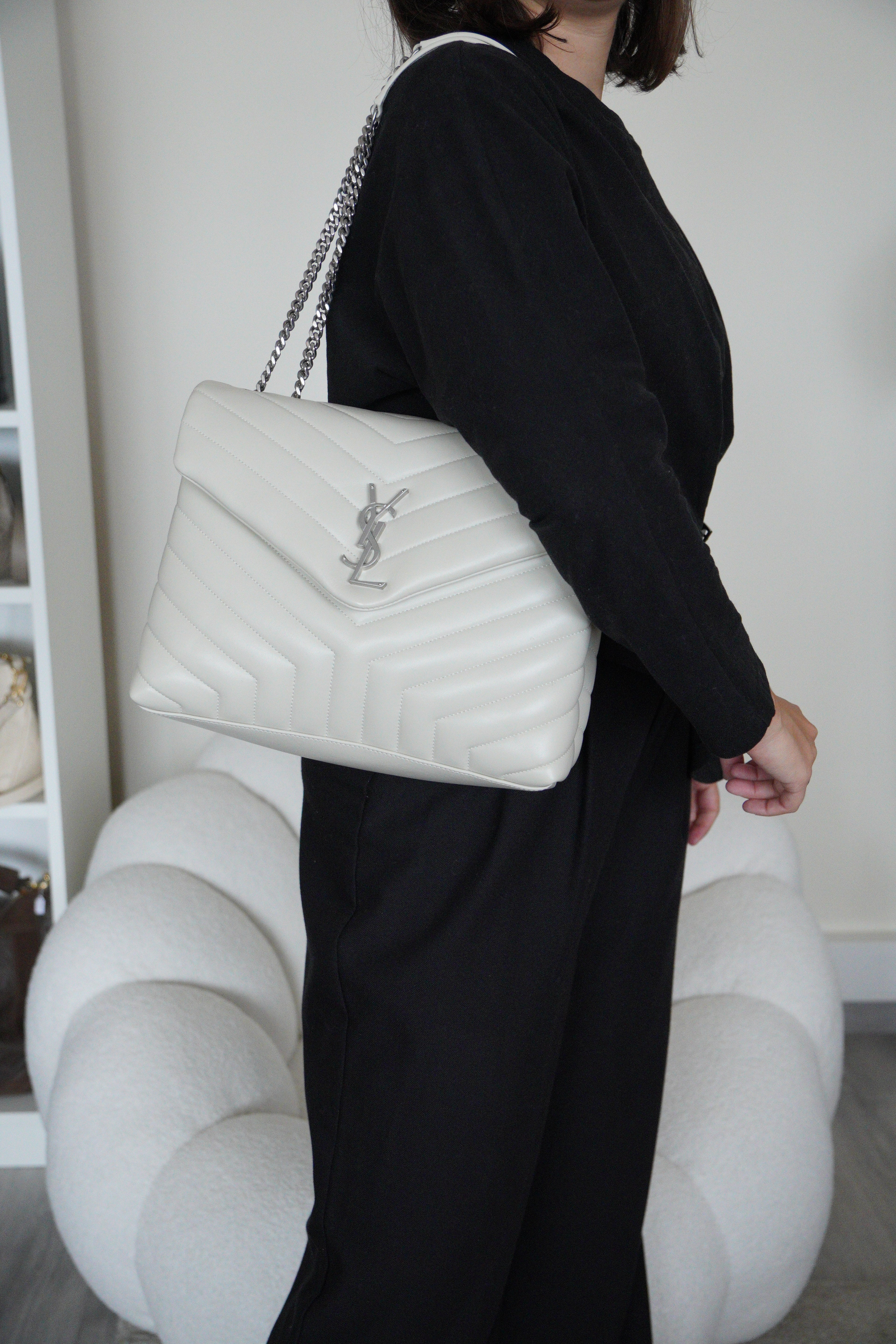 Le sac Loulou taille large de Saint Laurent est une icône de la maison, reconnaissable à son cuir matelassé, sa silhouette moelleuse et son logo YSL ton sur ton. Spacieux et raffiné, il offre un équilibre parfait entre confort et sophistication.