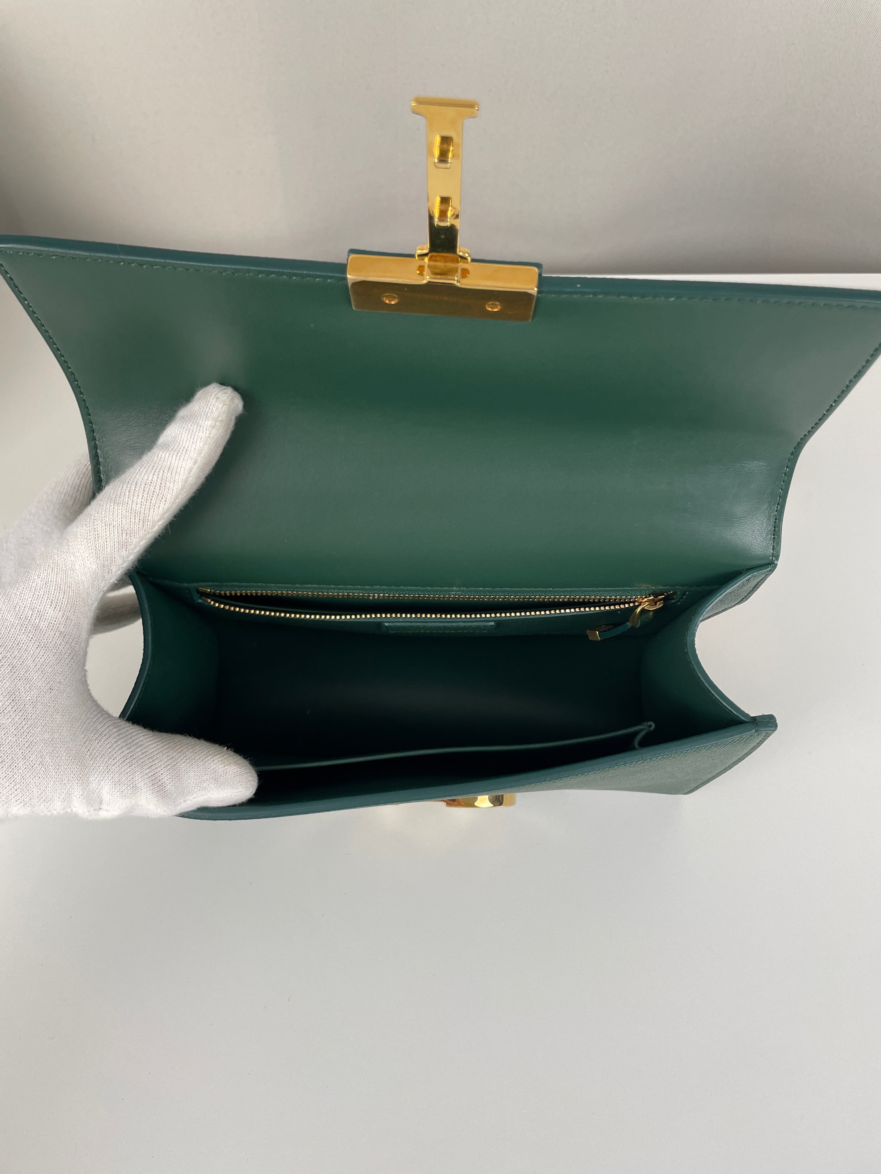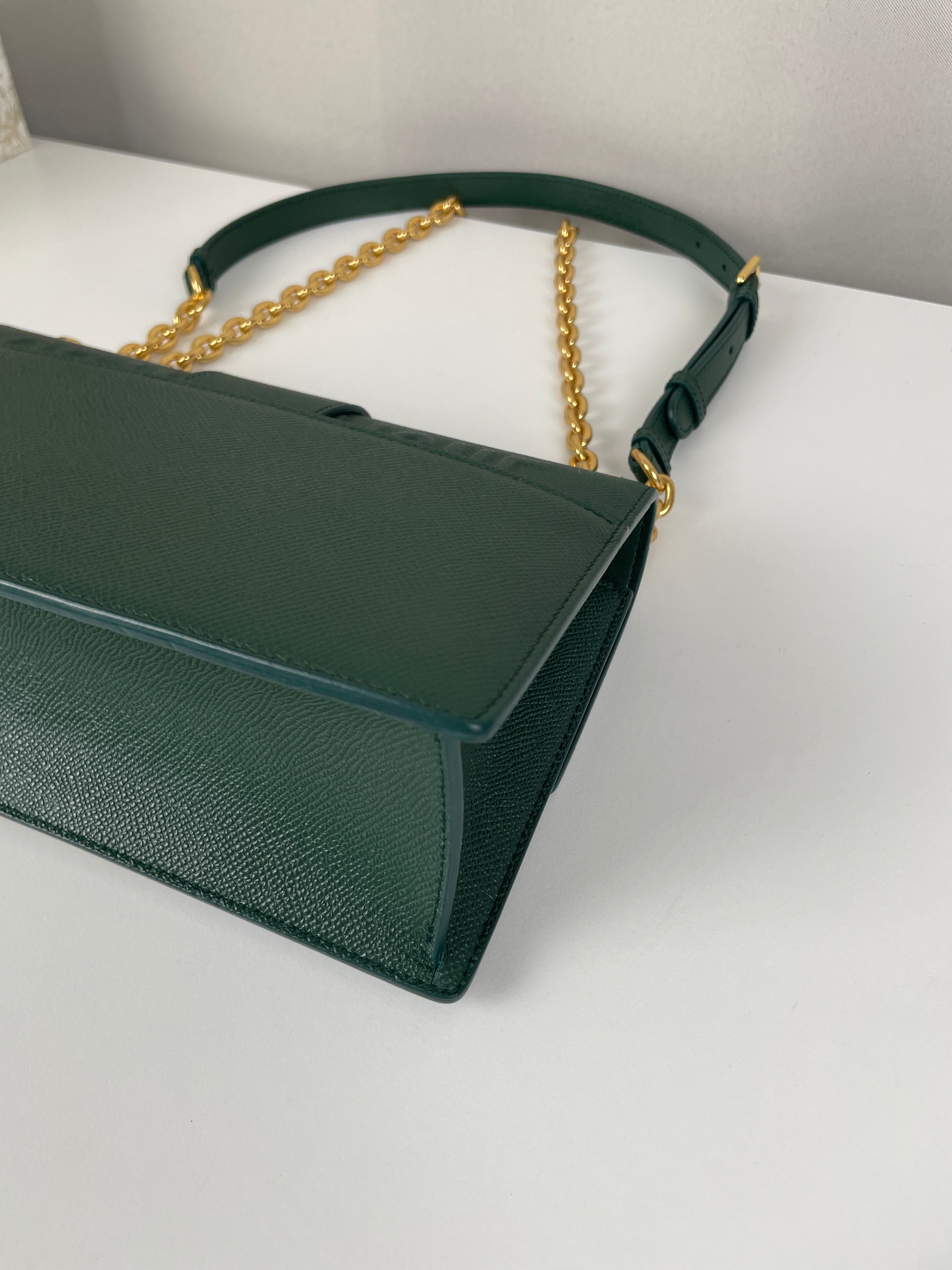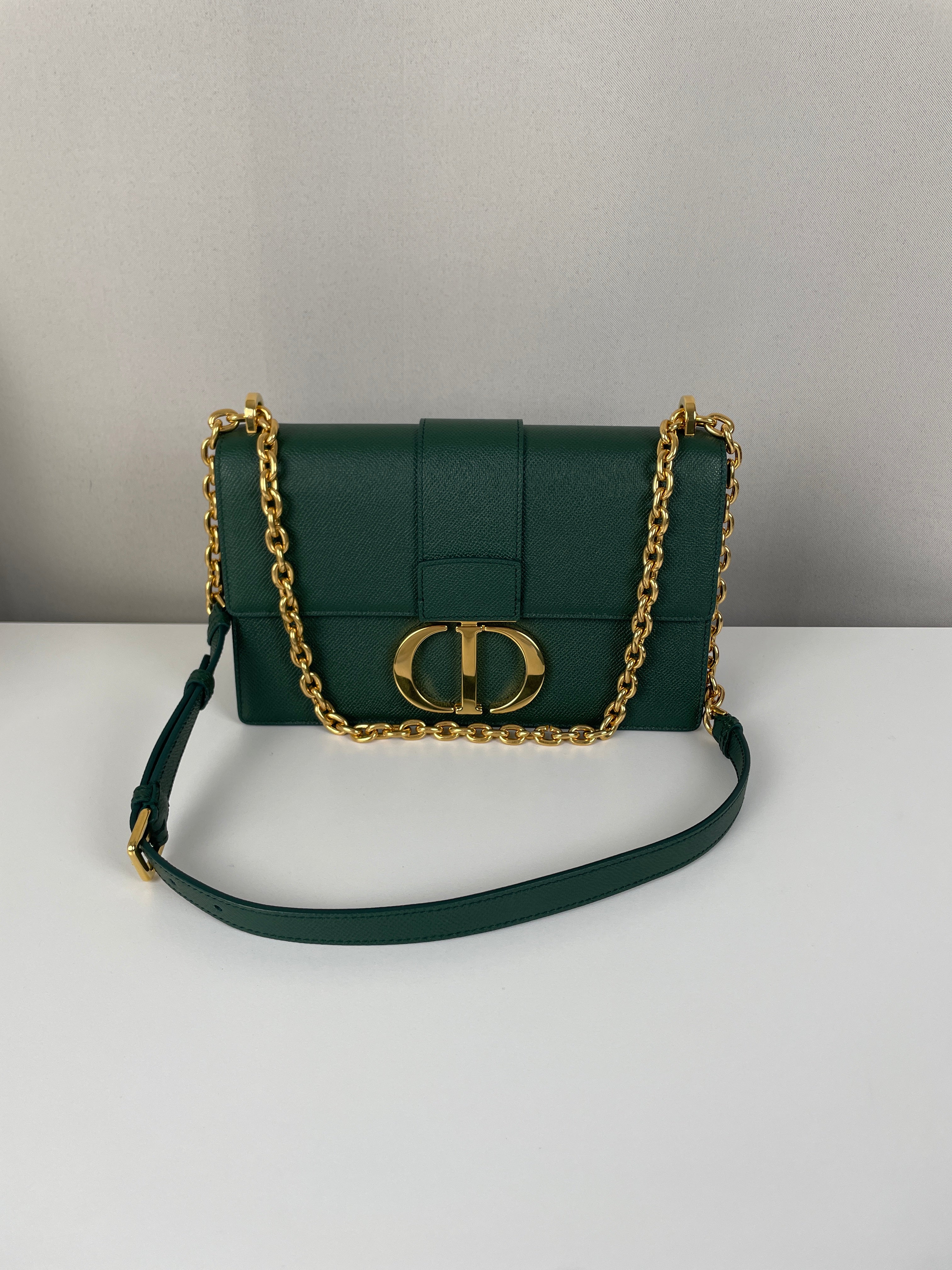 Ce sac Dior Montaigne Vert est en très bon état, comme neuf. Le cuir est en très bon état. Les coins sont en très bon état. La bijouterie est en très bon état, très peu de petites rayures. La bandoulière est en très bon état. L'intérieur est en très bon état. Porté épaule et bandoulière.