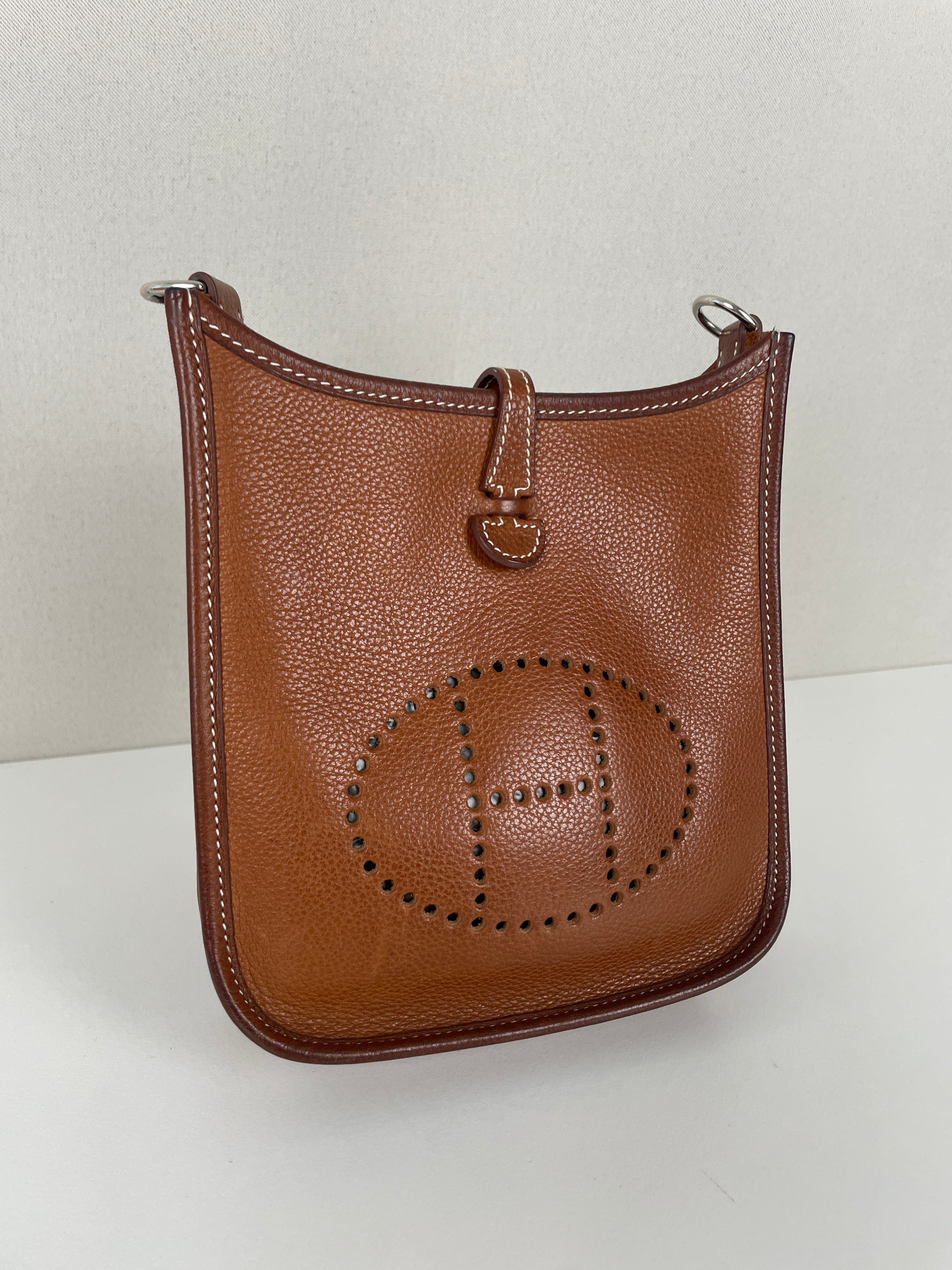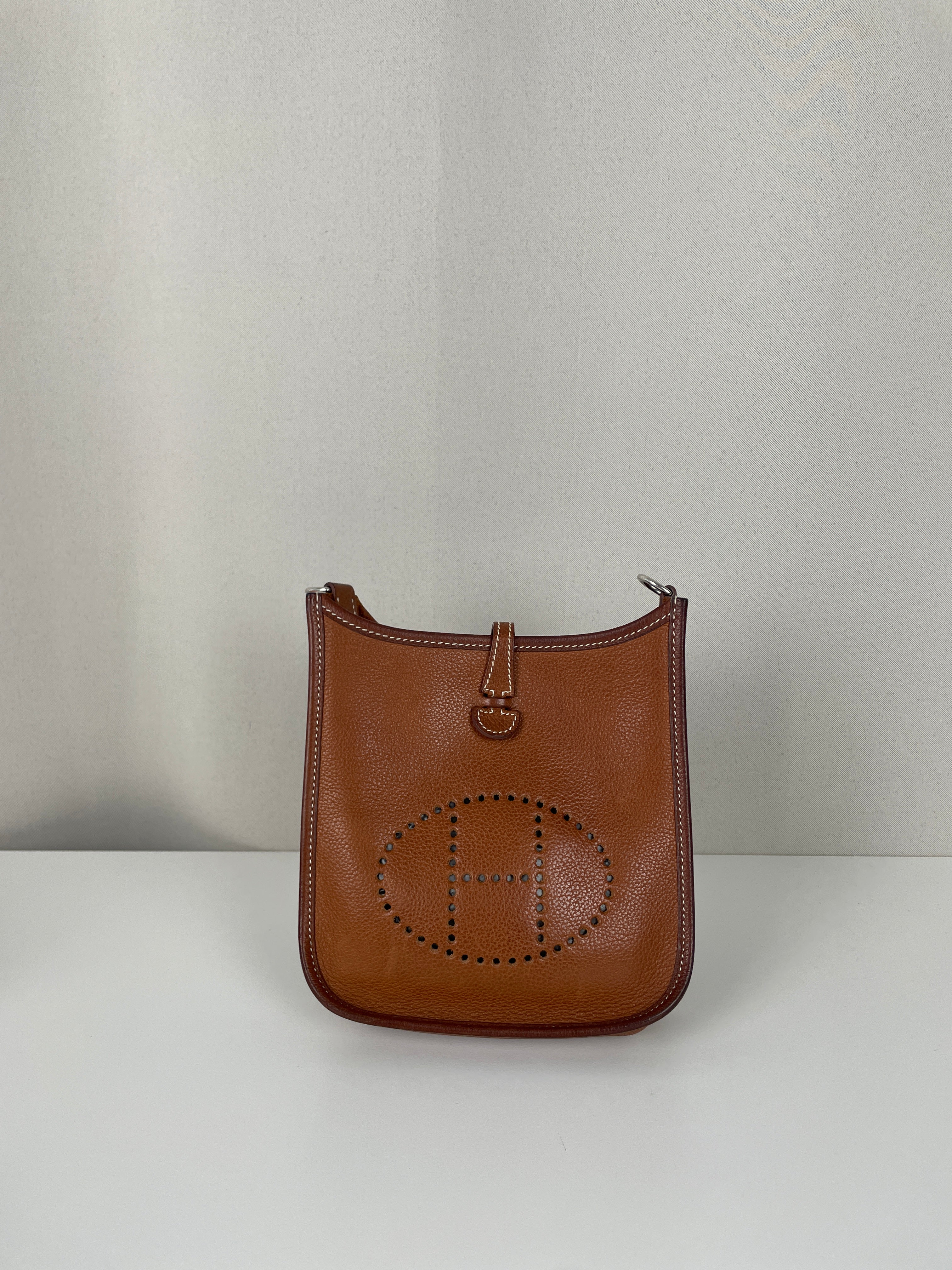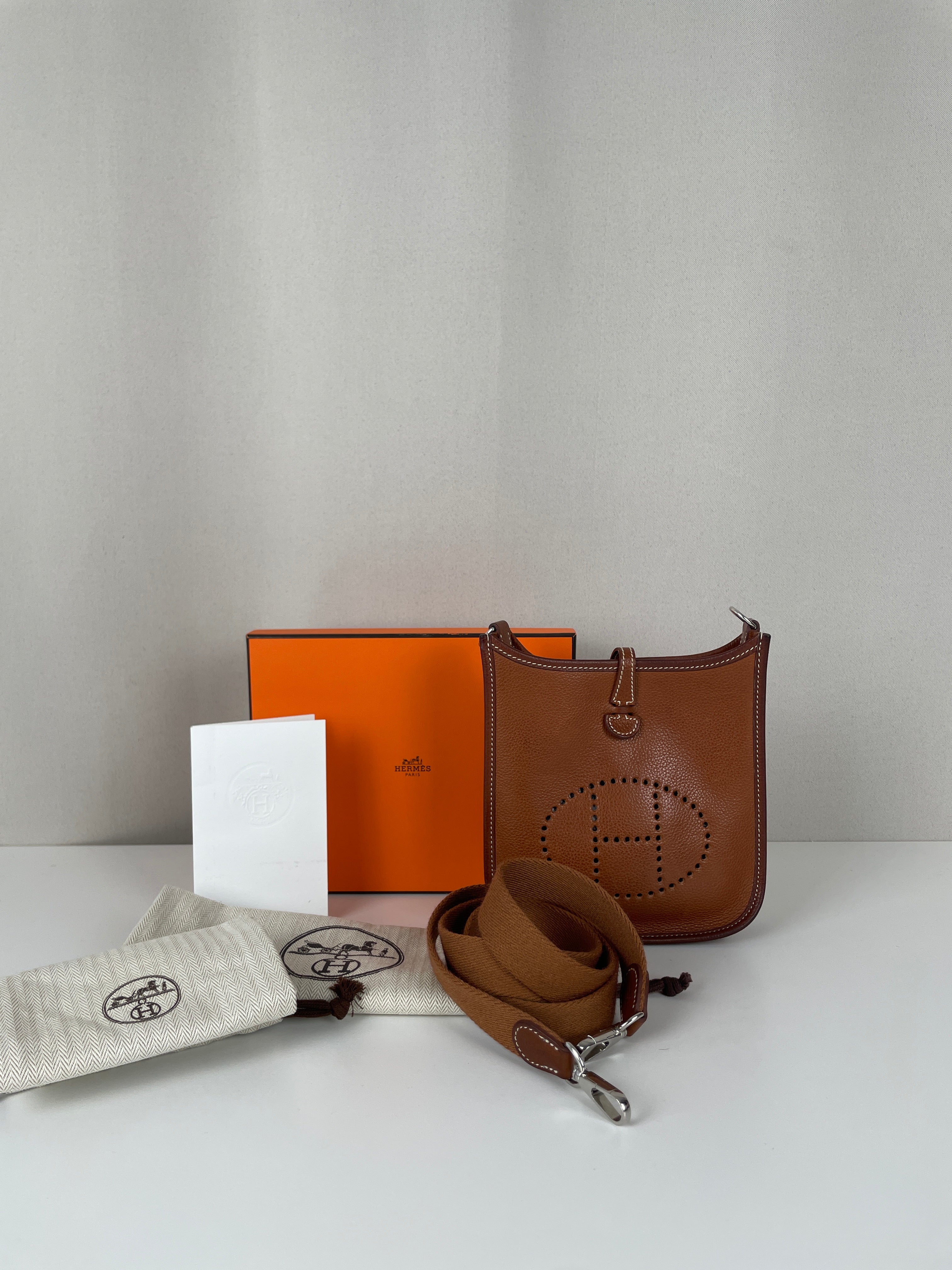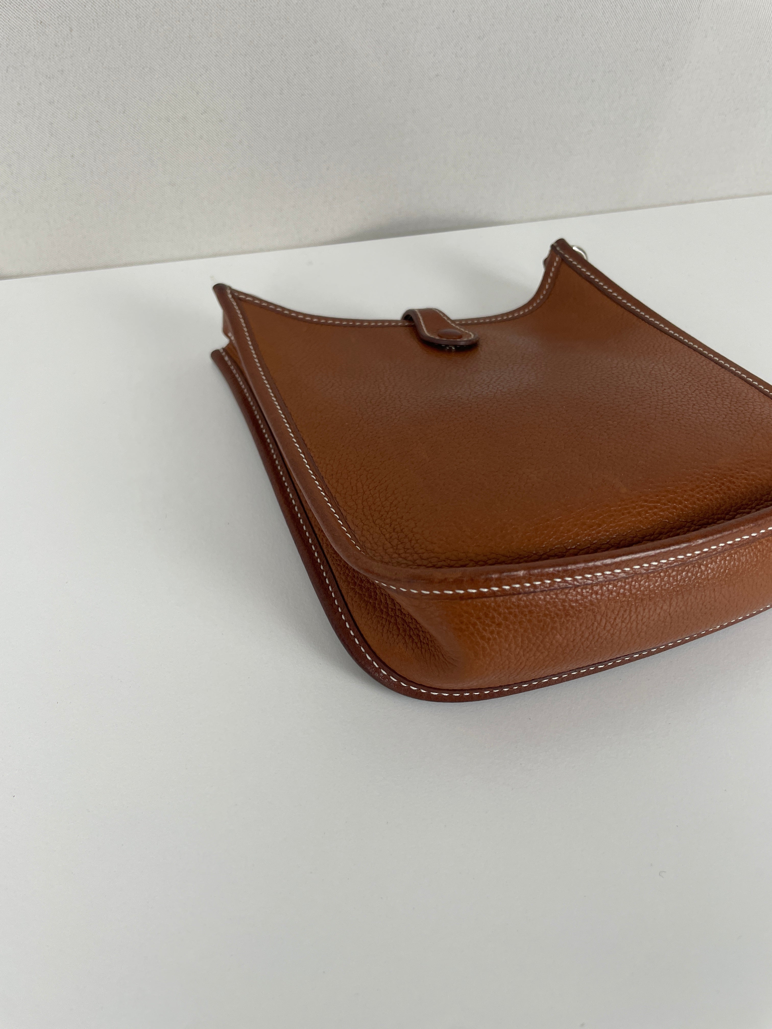 Ce Hermès Mini Evelyne est en très bon état. Le cuir et les coins sont en bon état, un peu noircis. Quelques mini traces sur le cuir. Le cuir est sublime, cuir qu'on ne vois pas souvent chez Hermès. L'intérieur est en parfait état. La bandoulière est en parfait état. Il est livré avec boite + dustbag + facture + Notre certificat d'authentification.