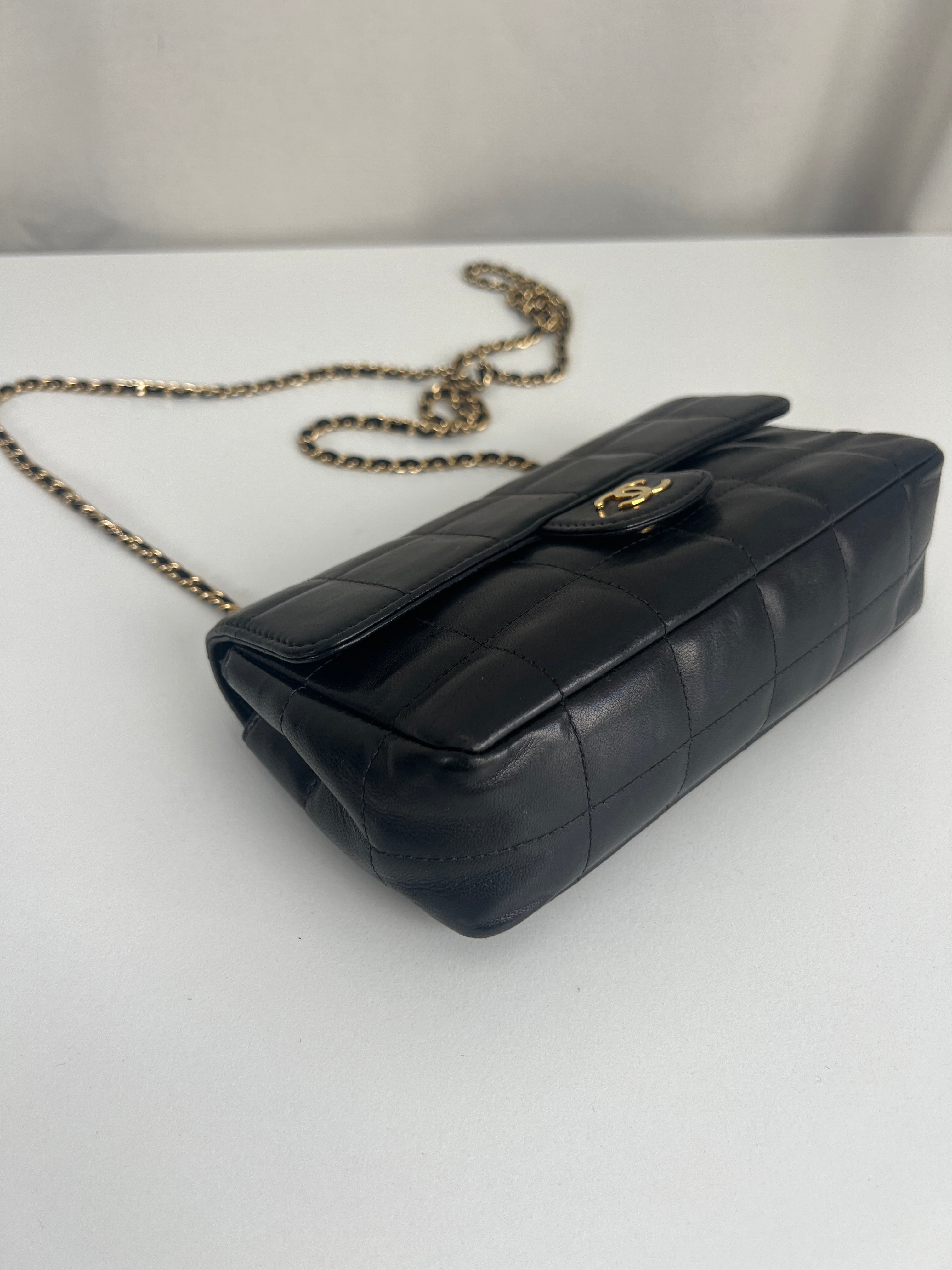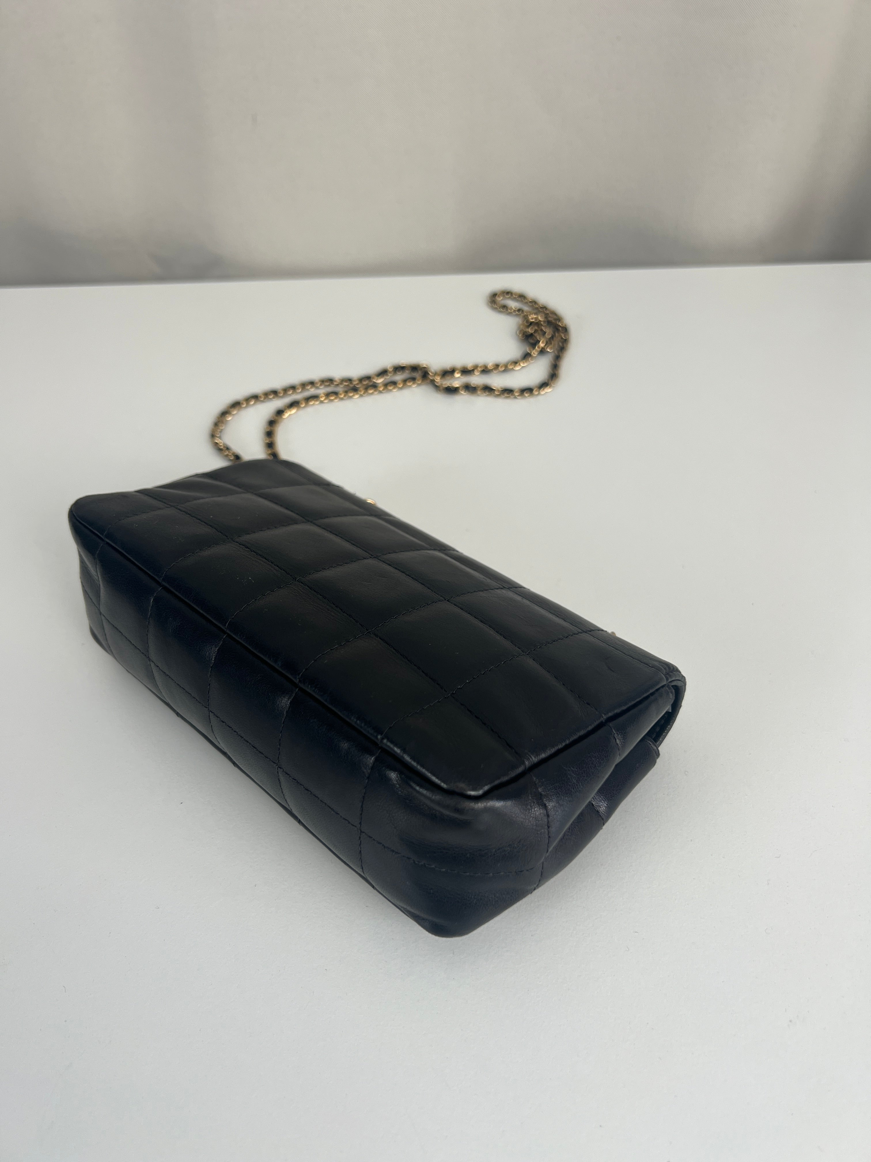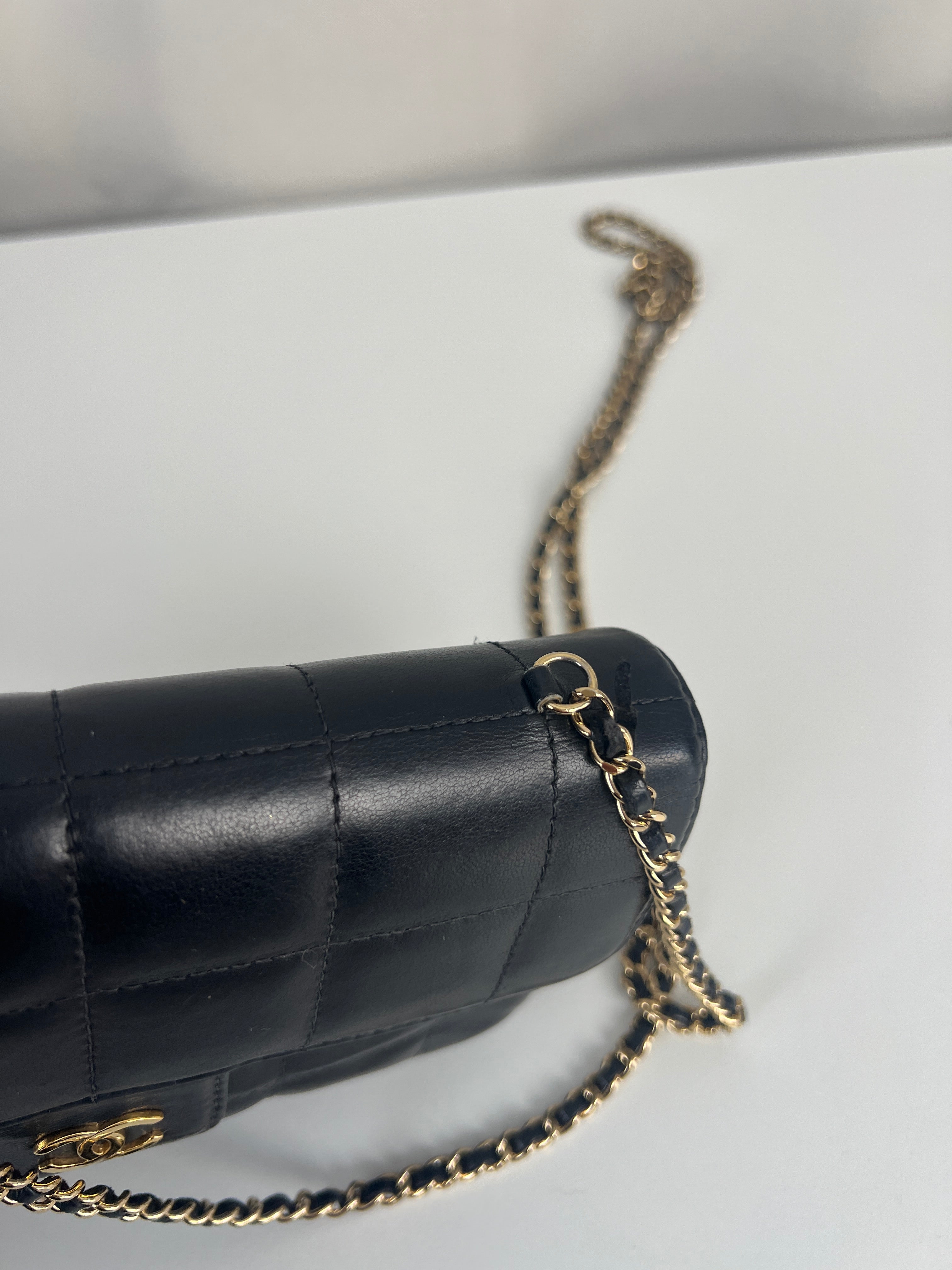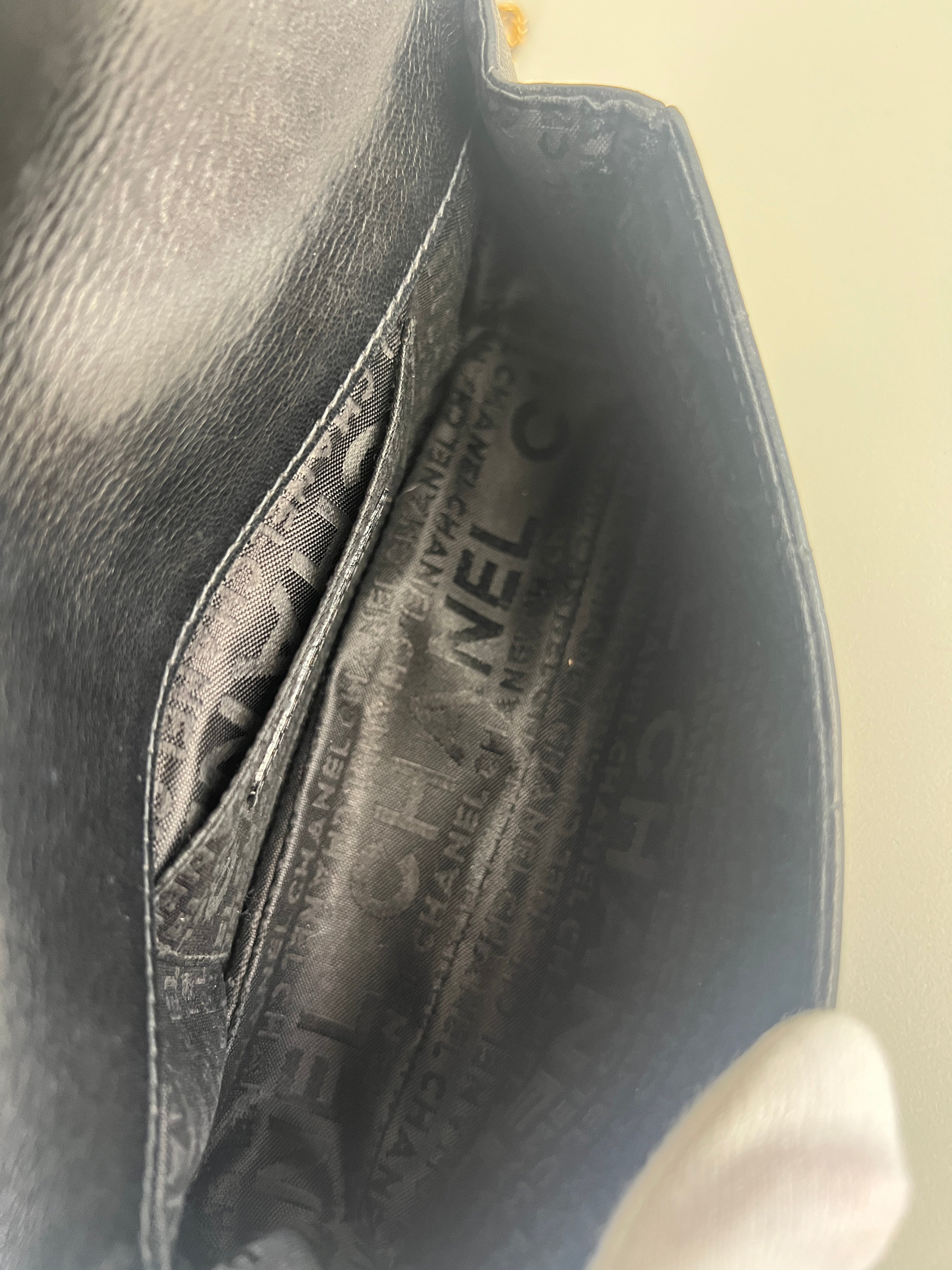 Ce petit sac "barre de chocolat" Chanel est en très bon état. Le cuir est en très bon état. Les coins sont un peu frottés. La bandoulière présente une partie en cuir un peu abîmée, rien de grave cependant. La bijouterie est en bon état. L'intérieur est en bon état. Vous pouvez voir qu'il a été un peu utilisé mais il est toujours en très bon état !