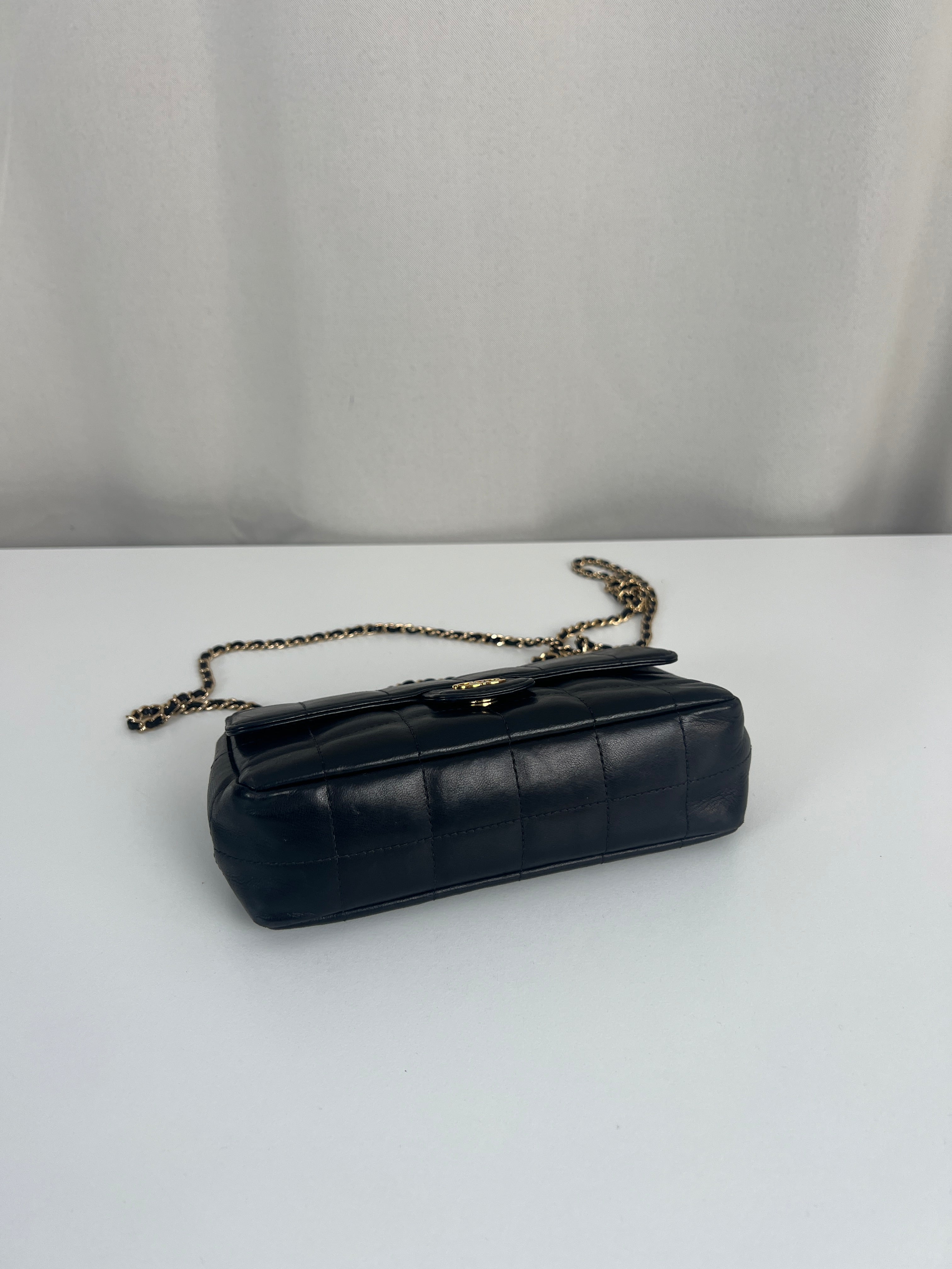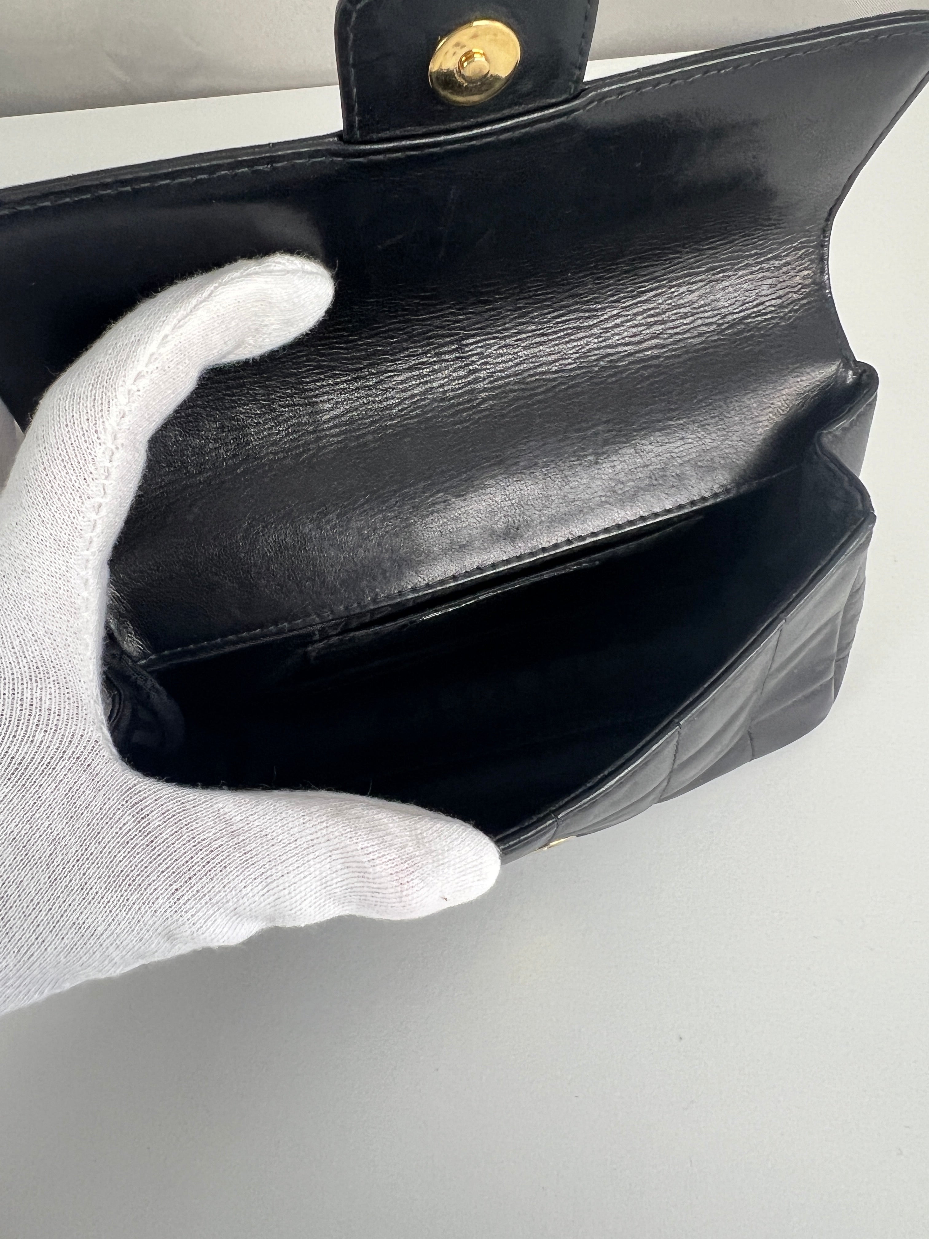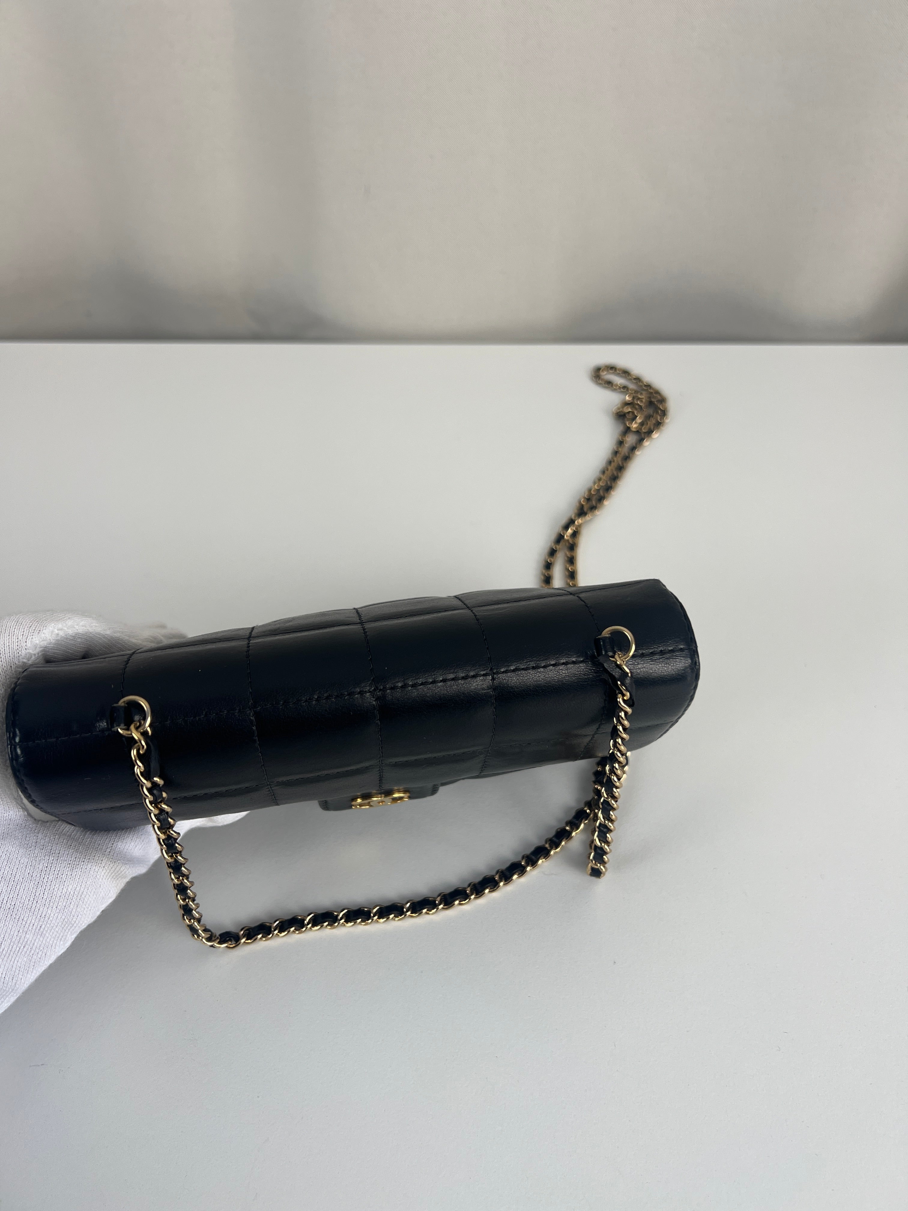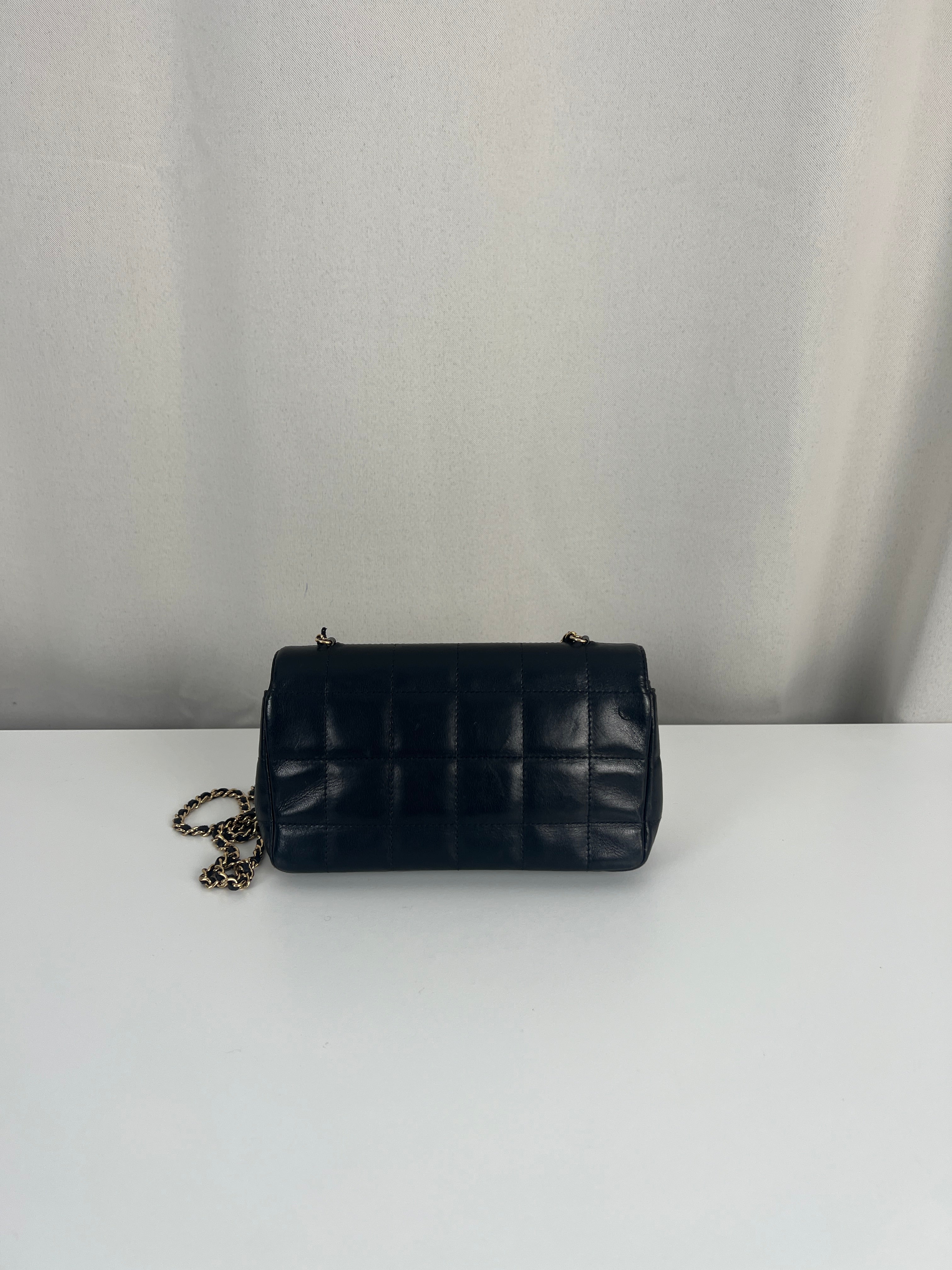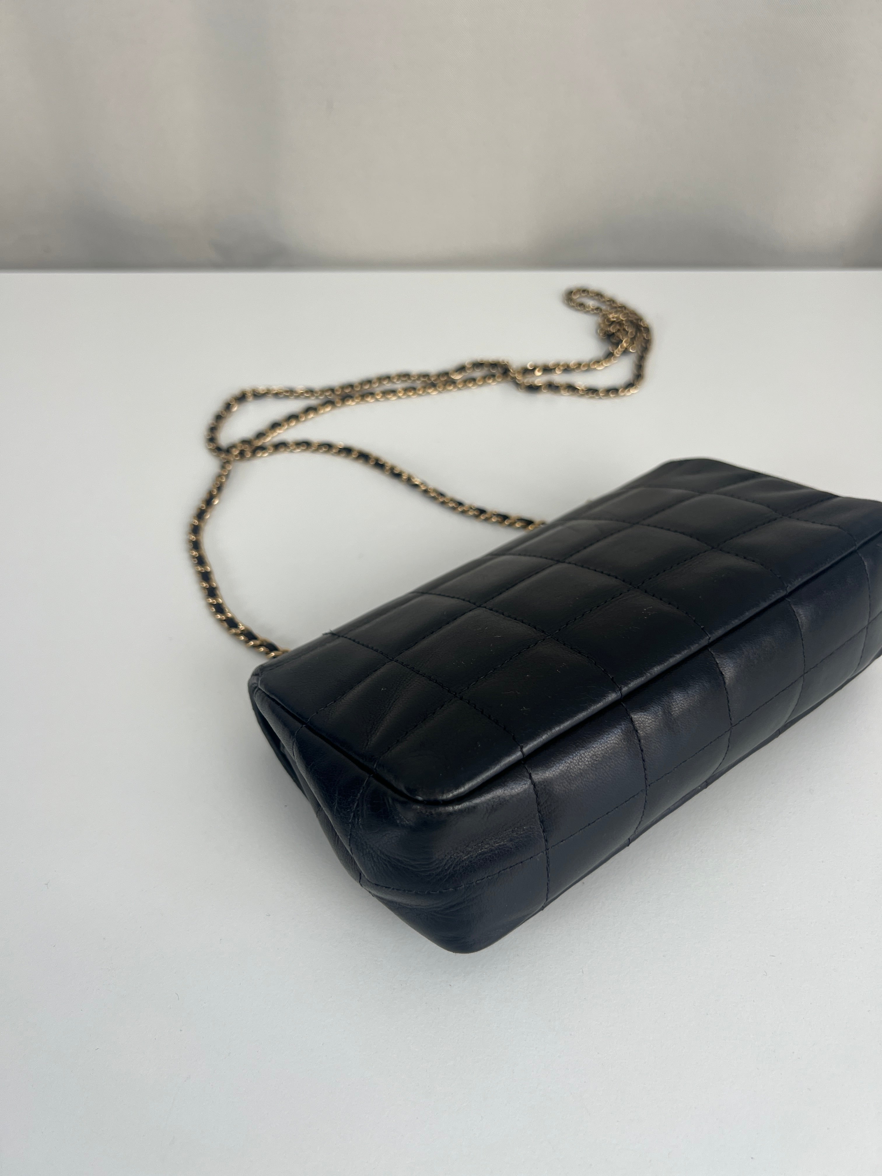 Ce petit sac "barre de chocolat" Chanel est en très bon état. Le cuir est en très bon état. Les coins sont un peu frottés. La bandoulière présente une partie en cuir un peu abîmée, rien de grave cependant. La bijouterie est en bon état. L'intérieur est en bon état. Vous pouvez voir qu'il a été un peu utilisé mais il est toujours en très bon état !