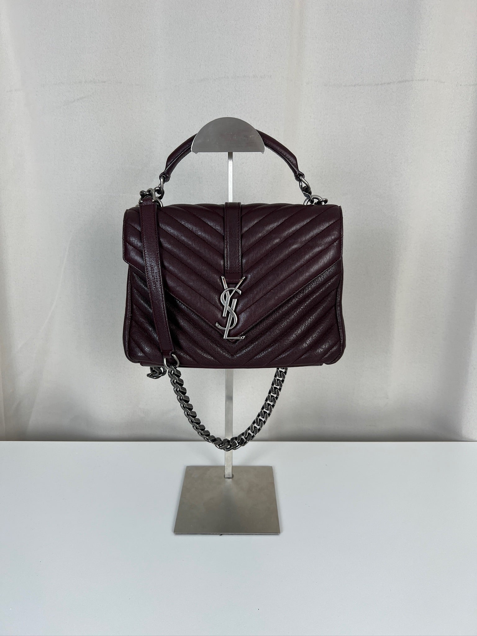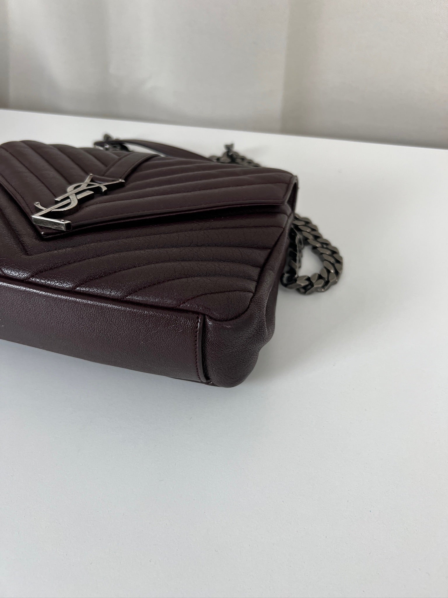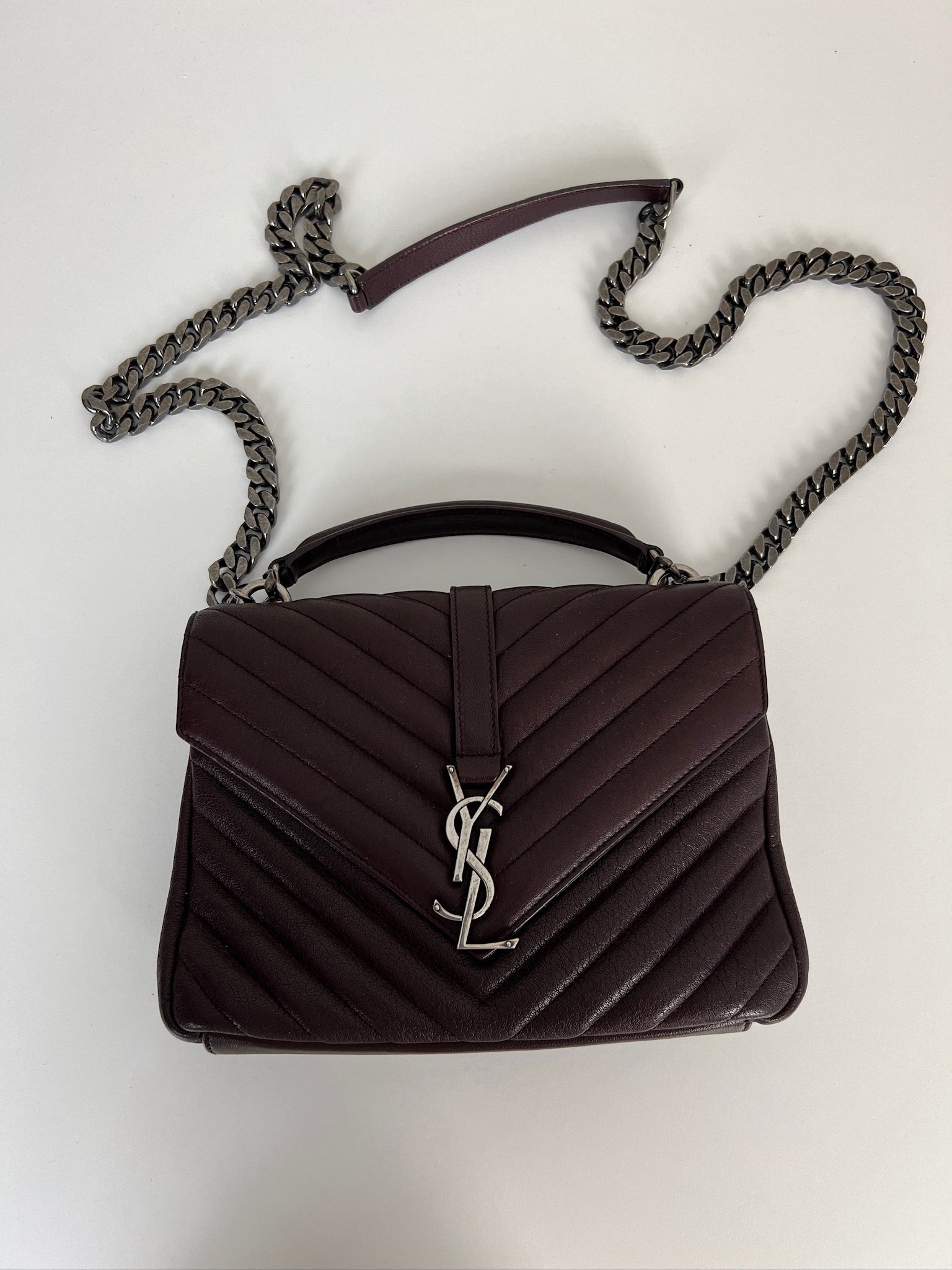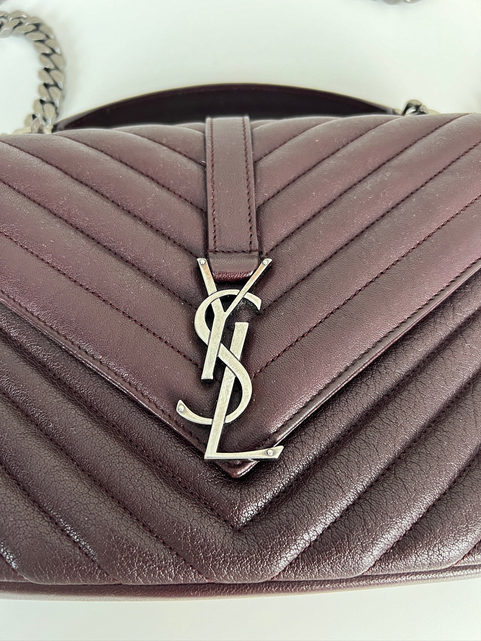 Ce sac College Saint Laurent en cuir d'agneau est en très bon état. Le cuir est en très bon état. Les coins sont en très bon état. La quincaillerie est en très bon état, effet vieilli. L'intérieur est en très bon état.