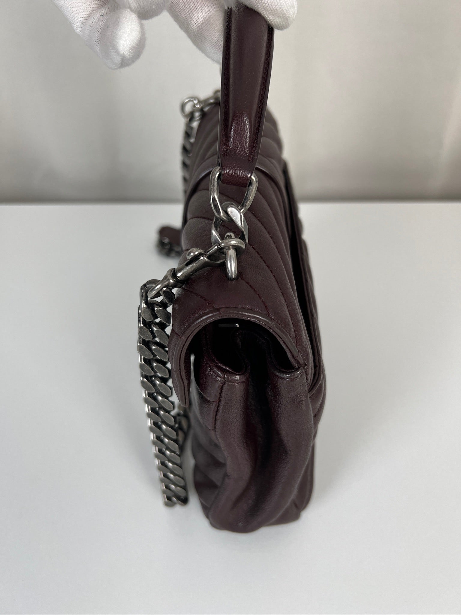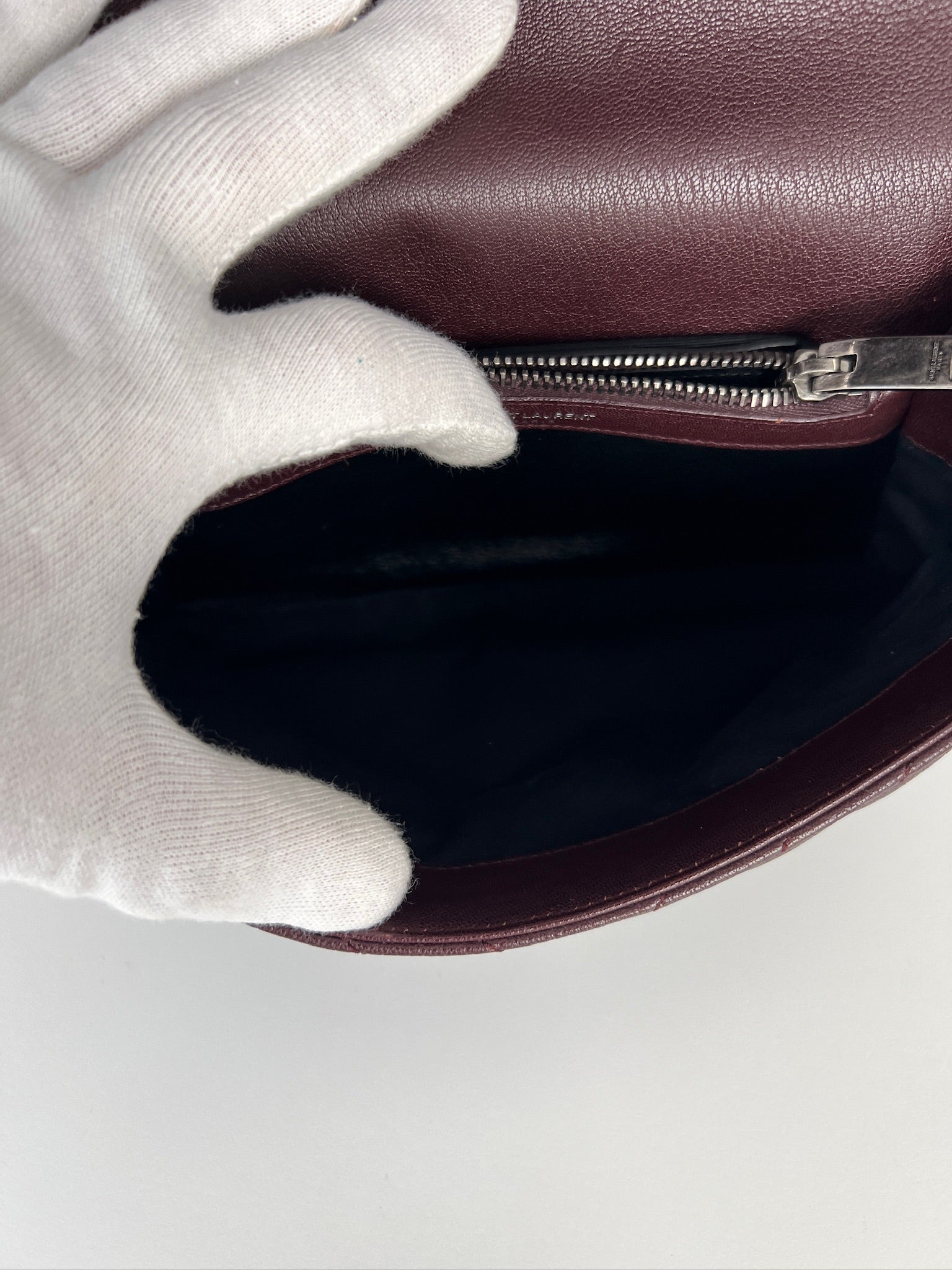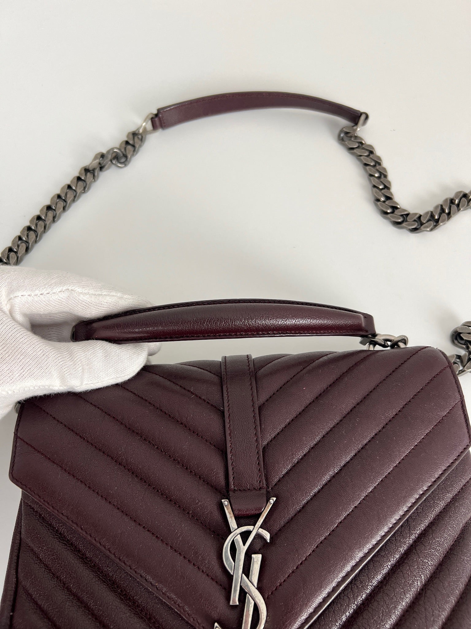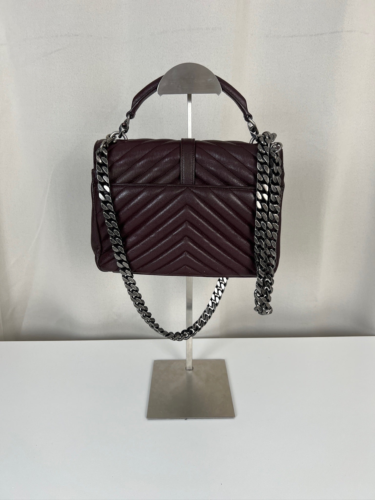 Ce sac College Saint Laurent en cuir d'agneau est en très bon état. Le cuir est en très bon état. Les coins sont en très bon état. La quincaillerie est en très bon état, effet vieilli. L'intérieur est en très bon état.
