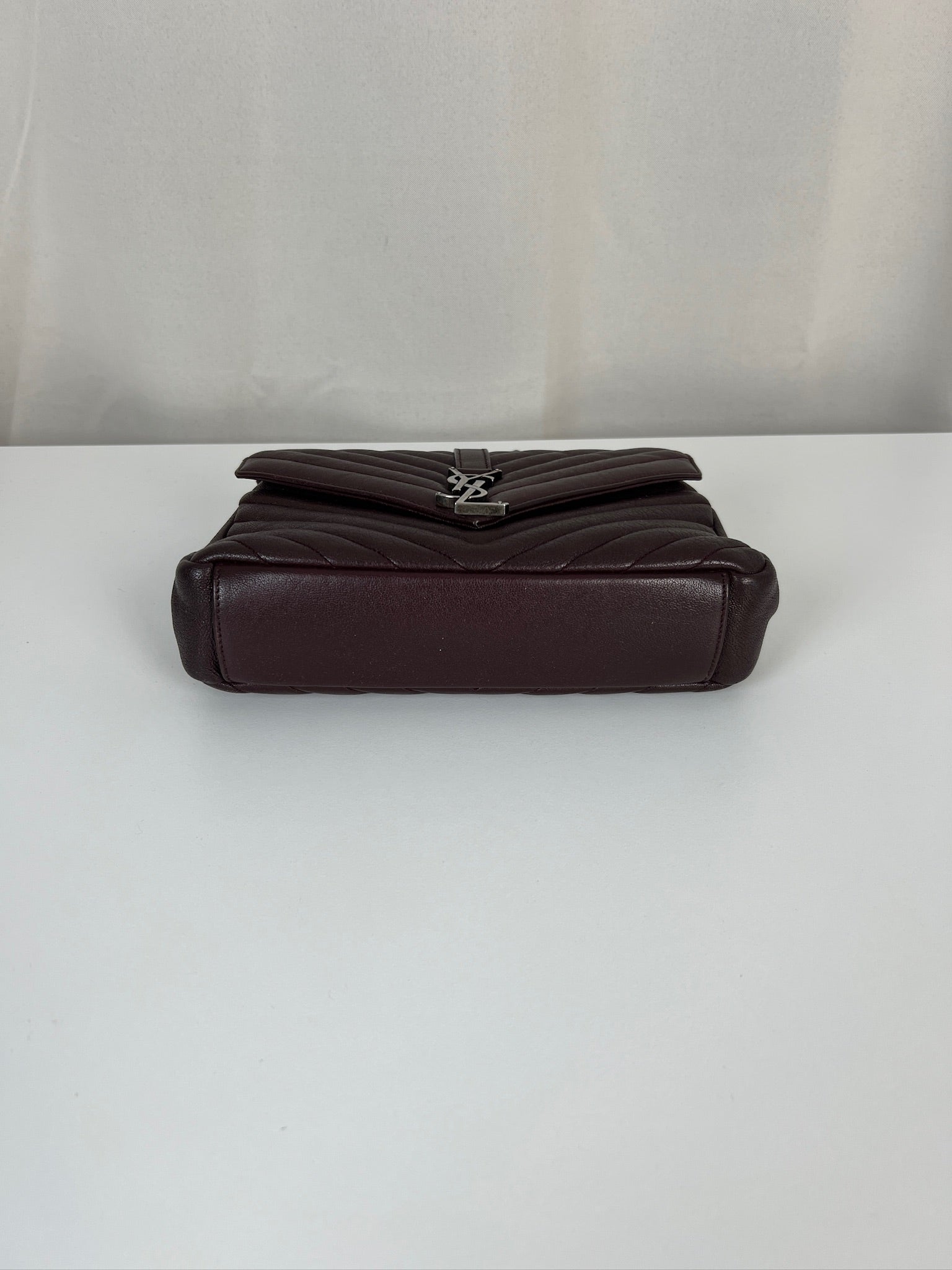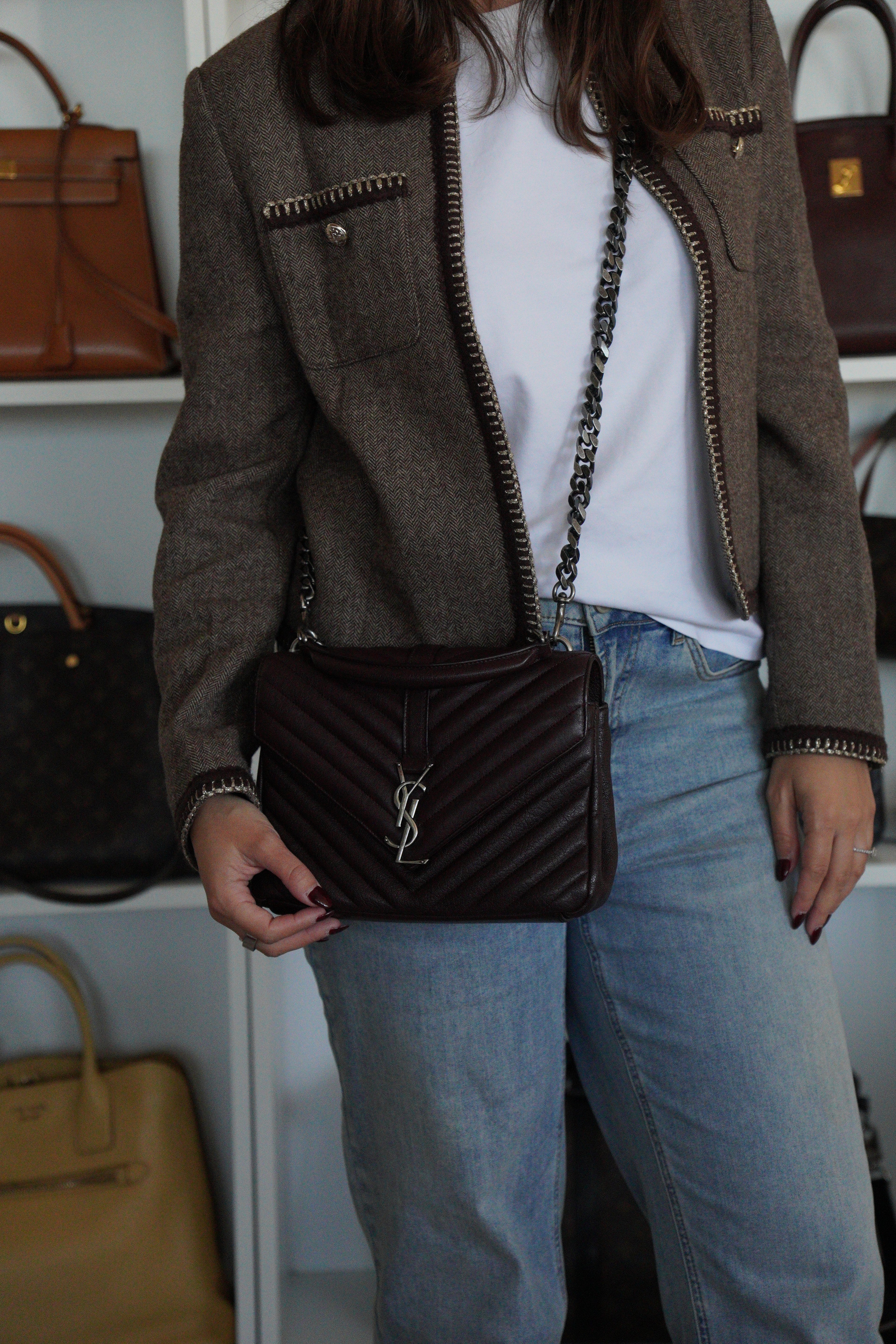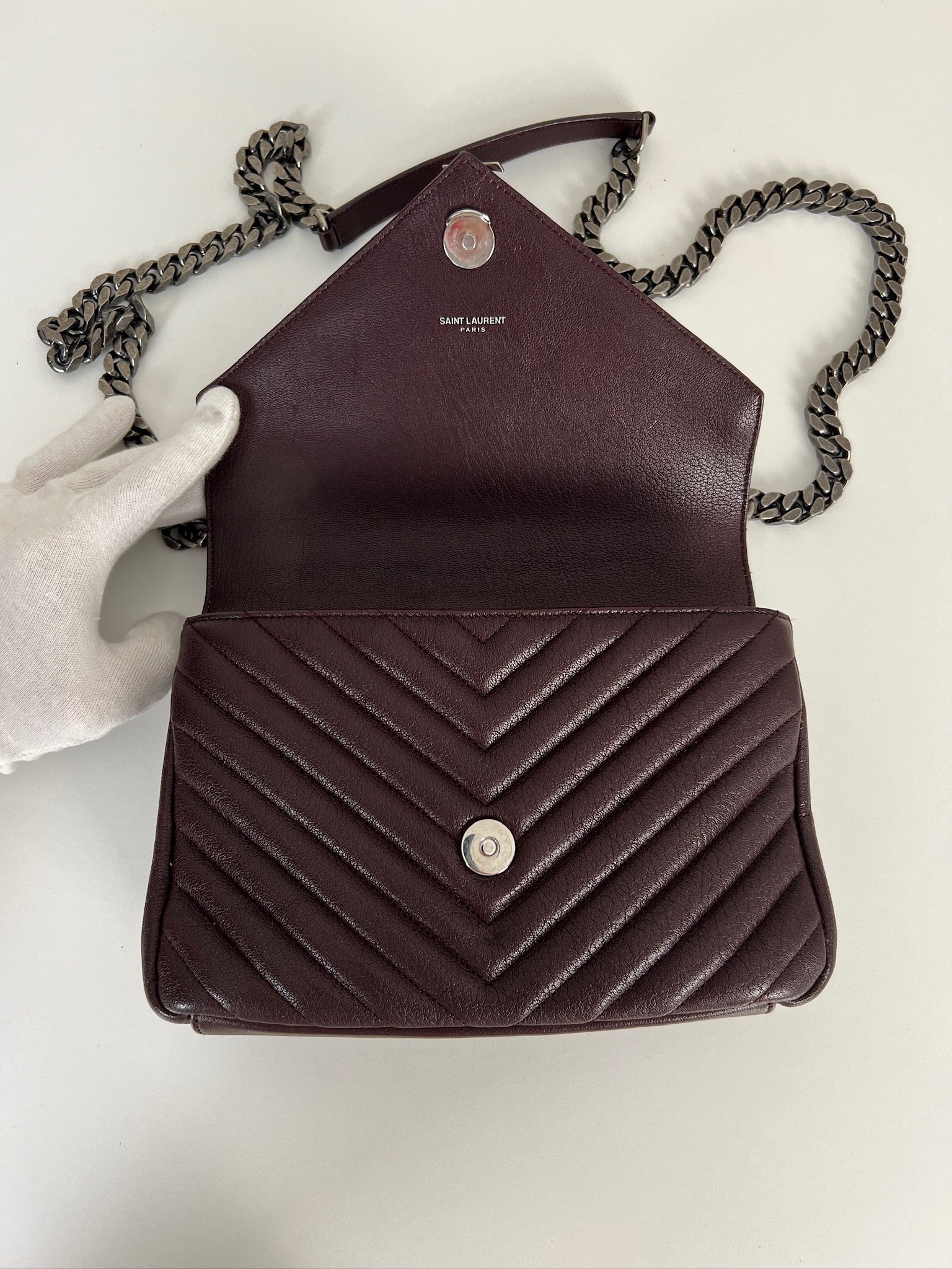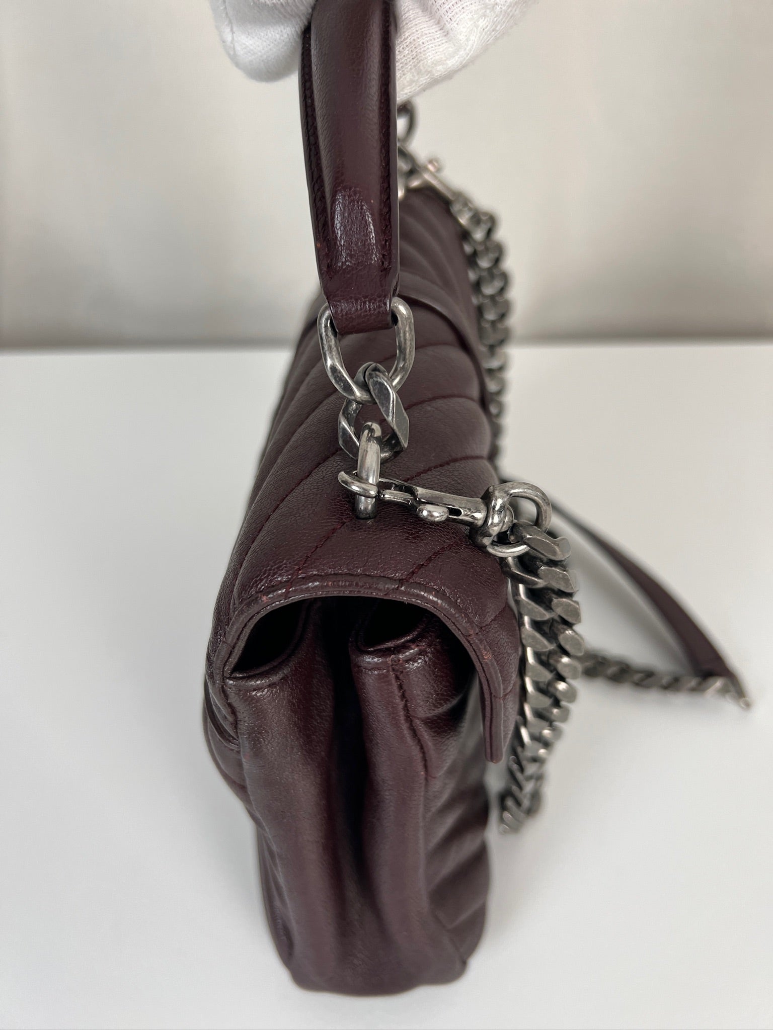 Ce sac College Saint Laurent en cuir d'agneau est en très bon état. Le cuir est en très bon état. Les coins sont en très bon état. La quincaillerie est en très bon état, effet vieilli. L'intérieur est en très bon état.