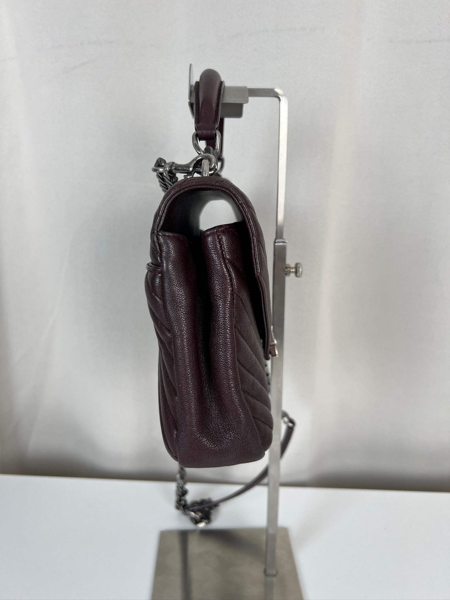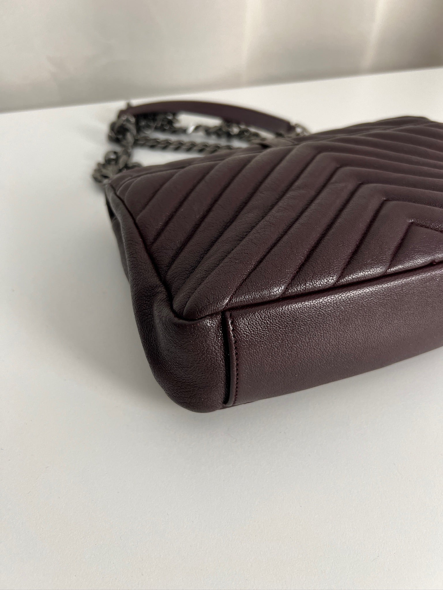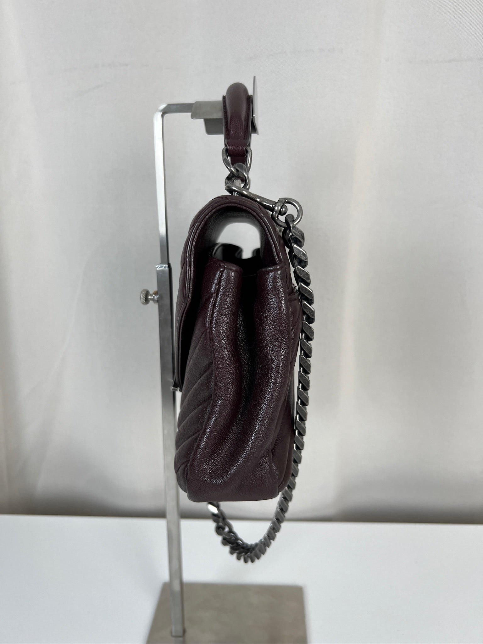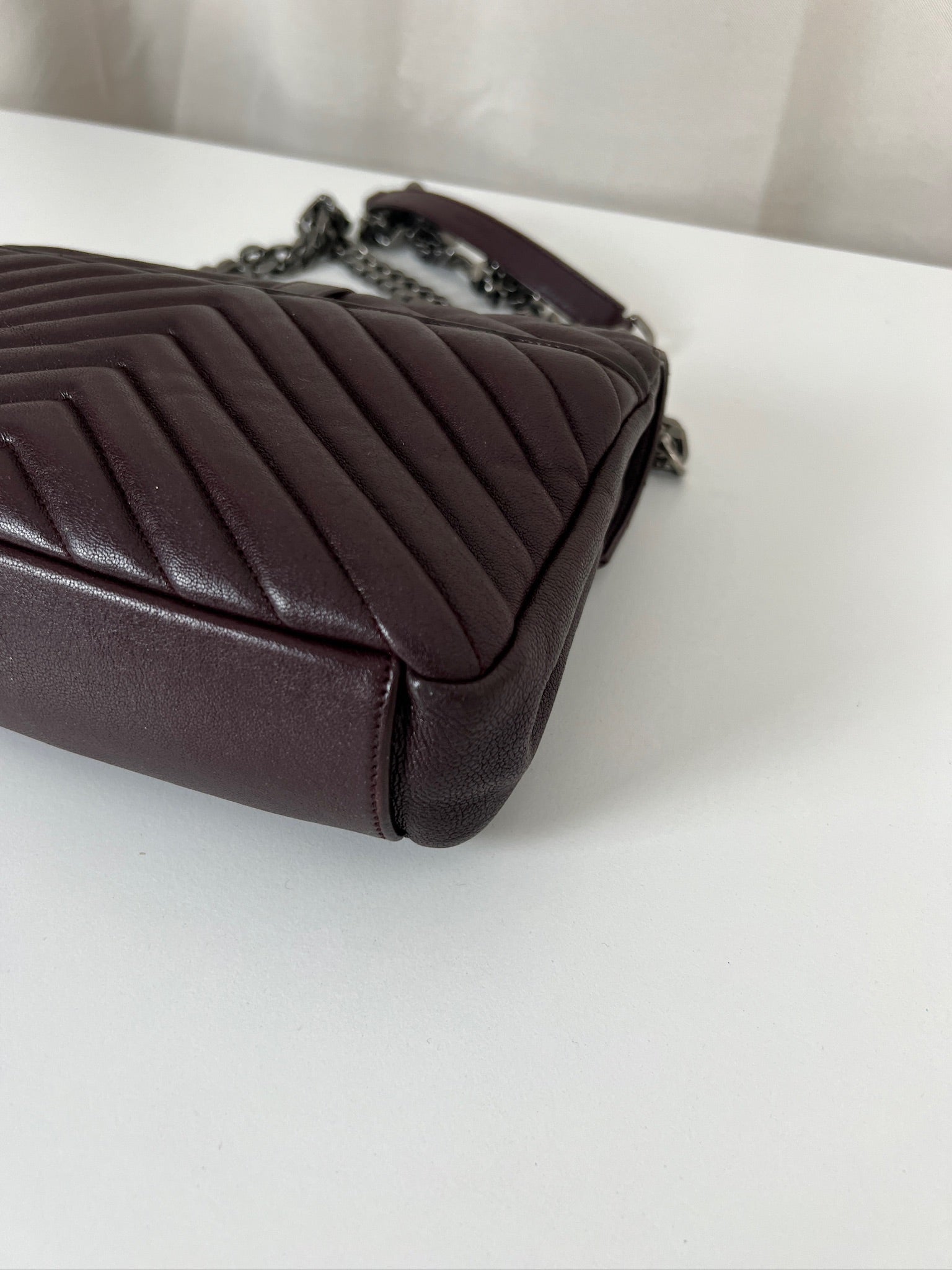 Ce sac College Saint Laurent en cuir d'agneau est en très bon état. Le cuir est en très bon état. Les coins sont en très bon état. La quincaillerie est en très bon état, effet vieilli. L'intérieur est en très bon état.