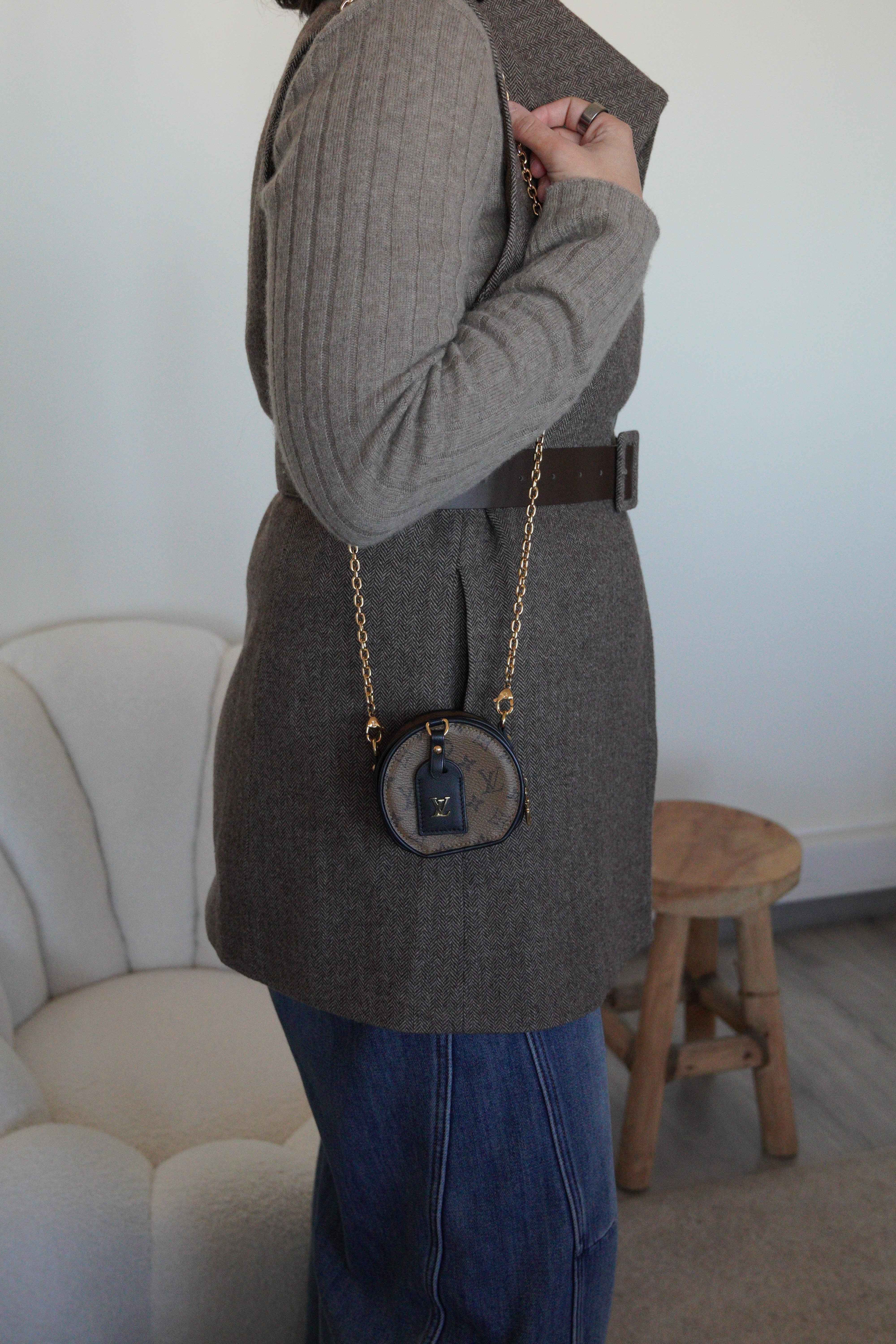 Ce micro-boîte chapeau Louis Vuitton est comme neuf. La toile et les coins sont en très bon état. La partie en cuir du sac est en excellent état. La bijouterie est en très bon état. L'intérieur est en très bon état. Comme neuf.