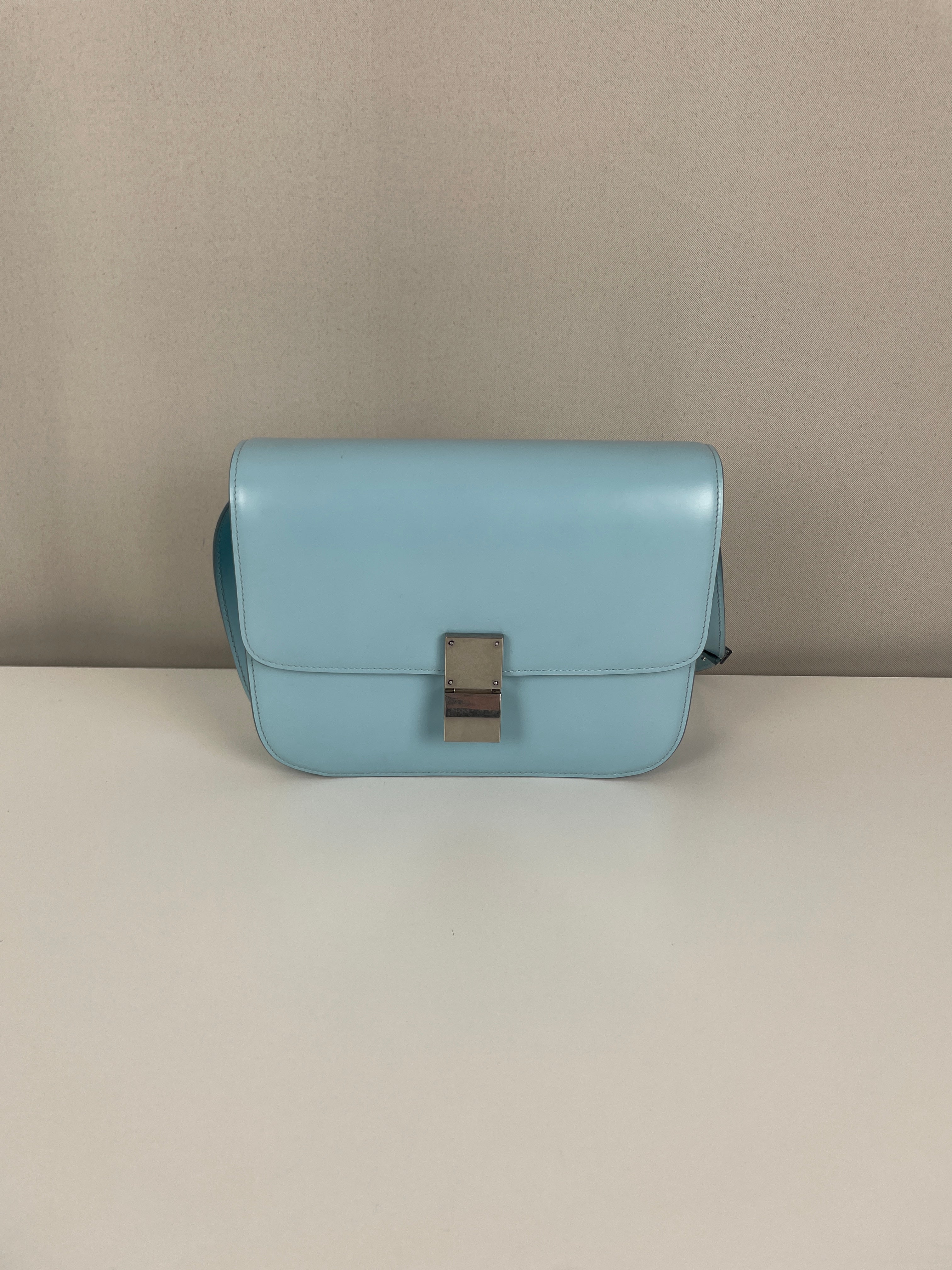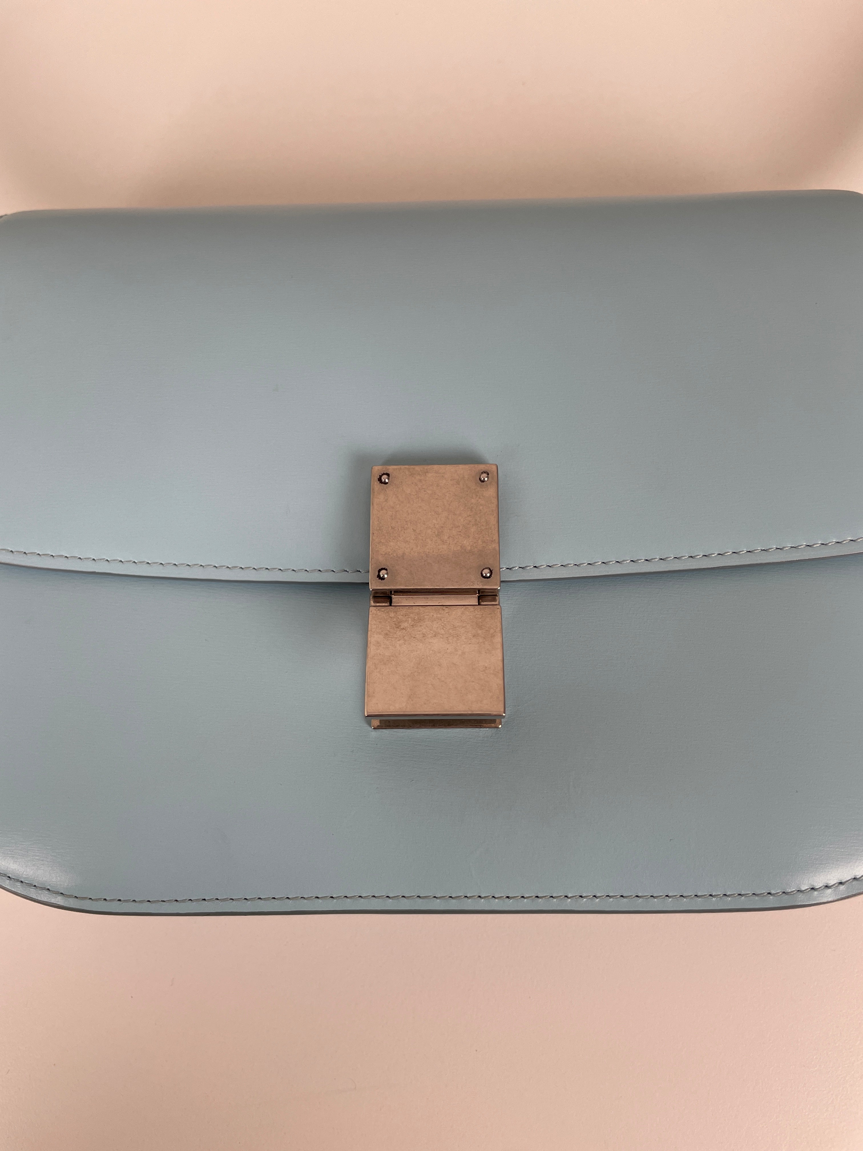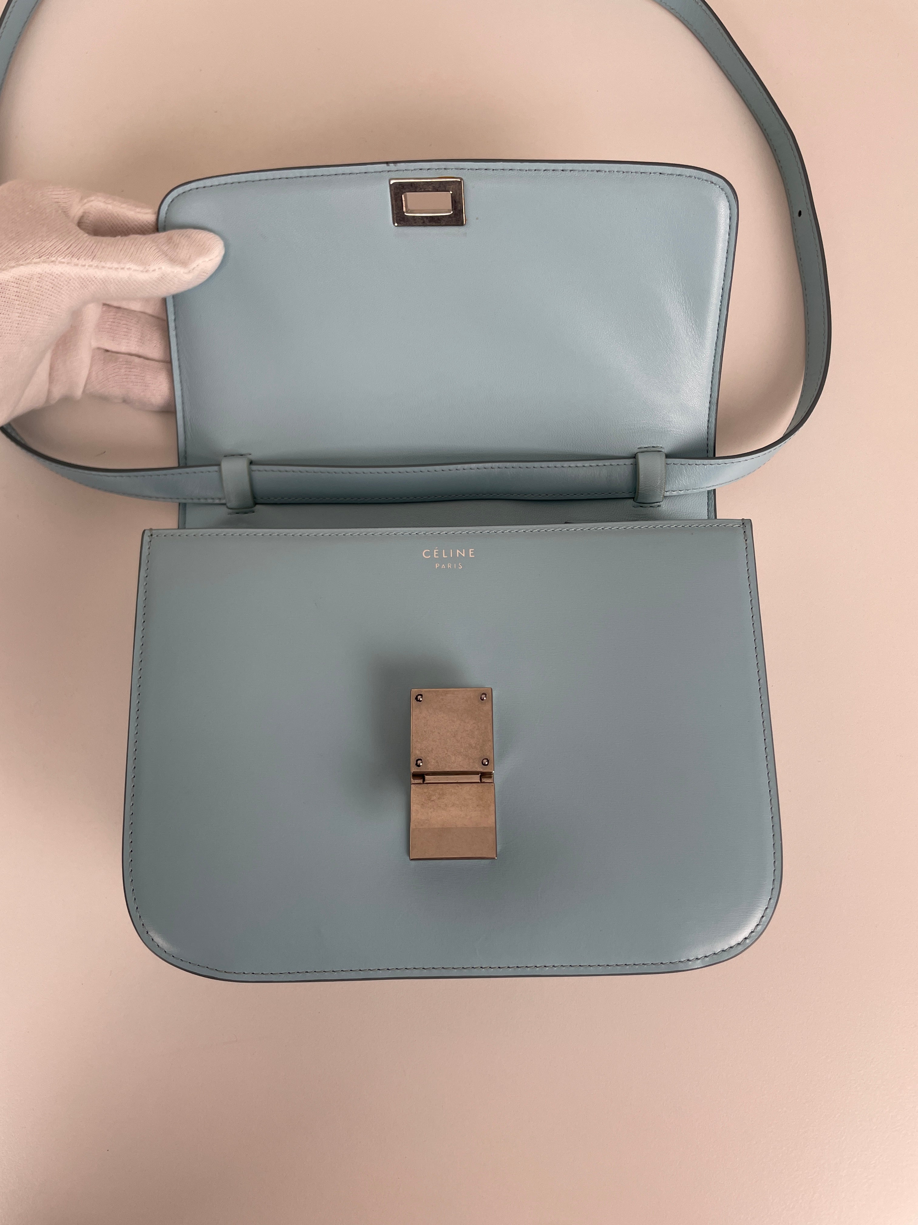 Cet sac Céline Box est en très bon état. Le cuir est en très bon état, on voit qu'il a déjà été porté (pas neuf mais top) mais reste super. Les coins sont en très bon état. La bijouterie présente quelques rayures. La bandoulière est en très bon état. L'intérieur est en très bon état.
