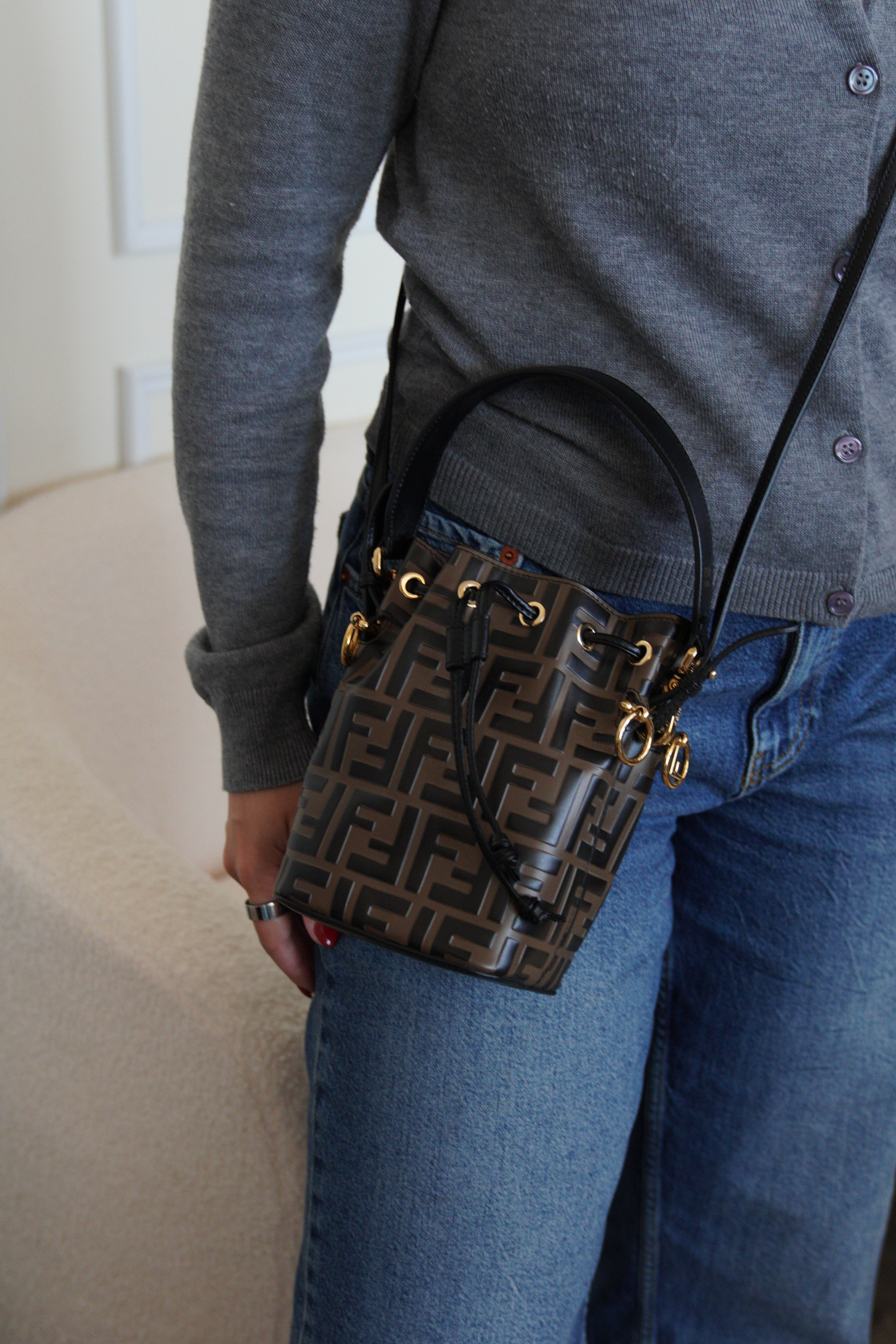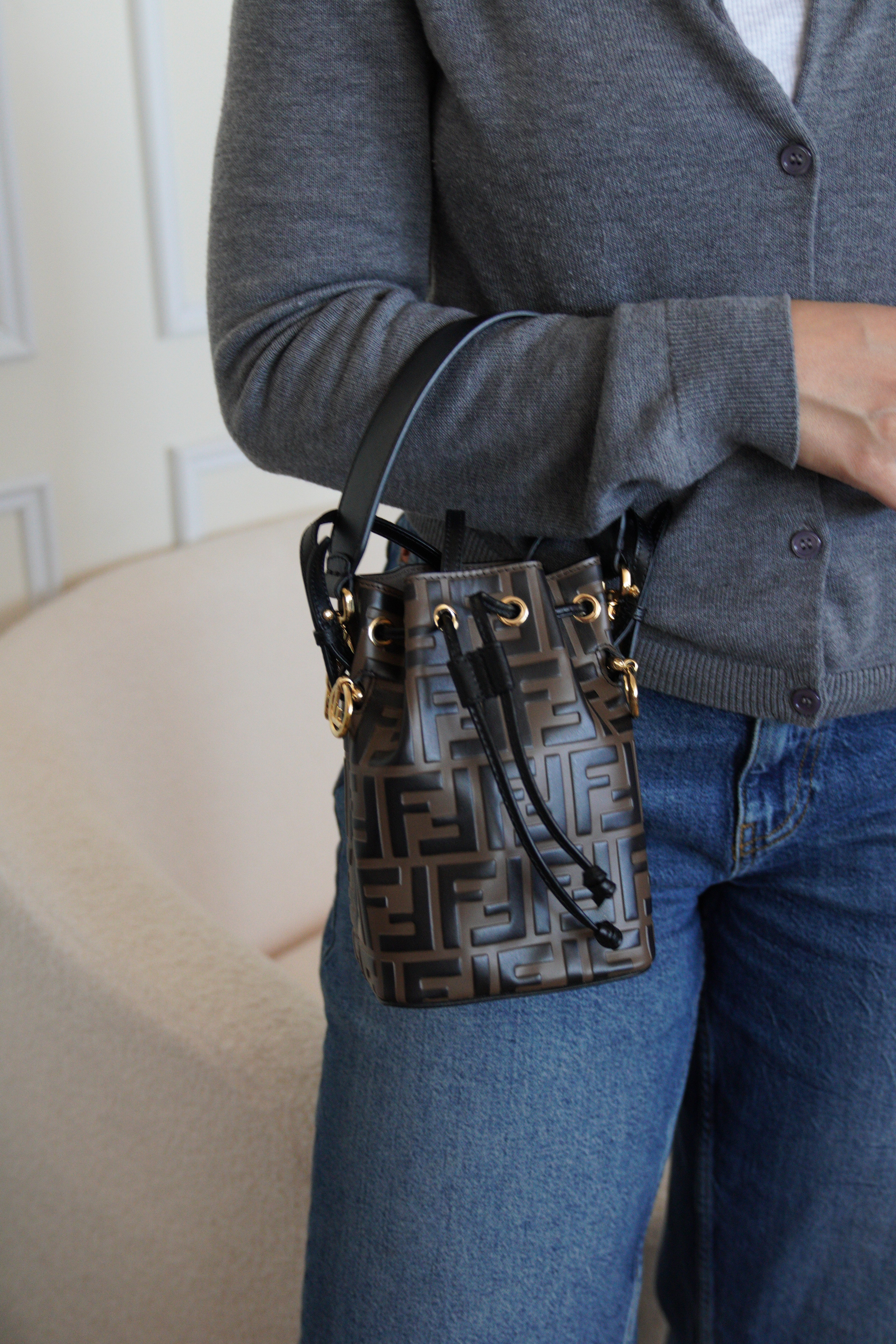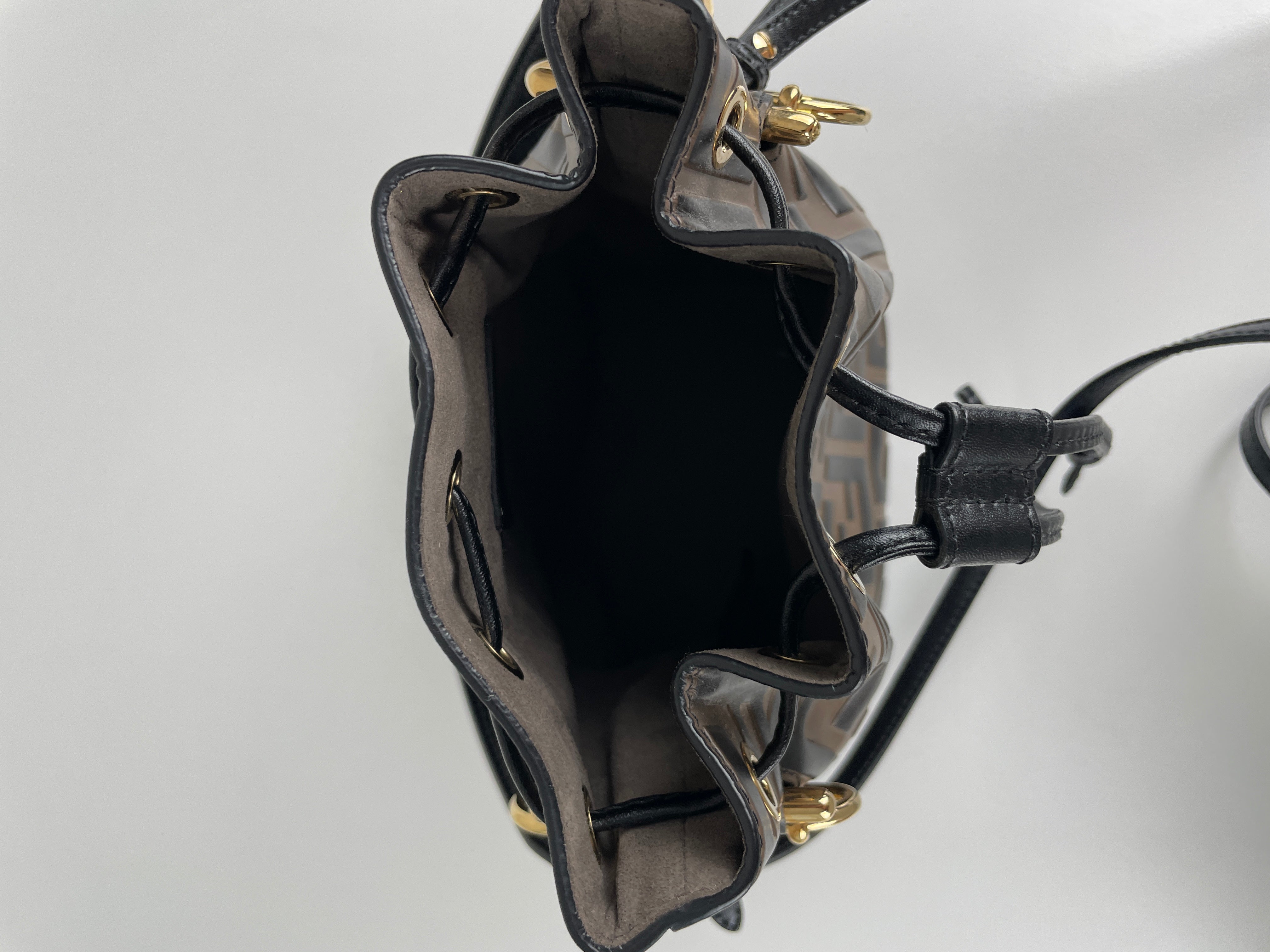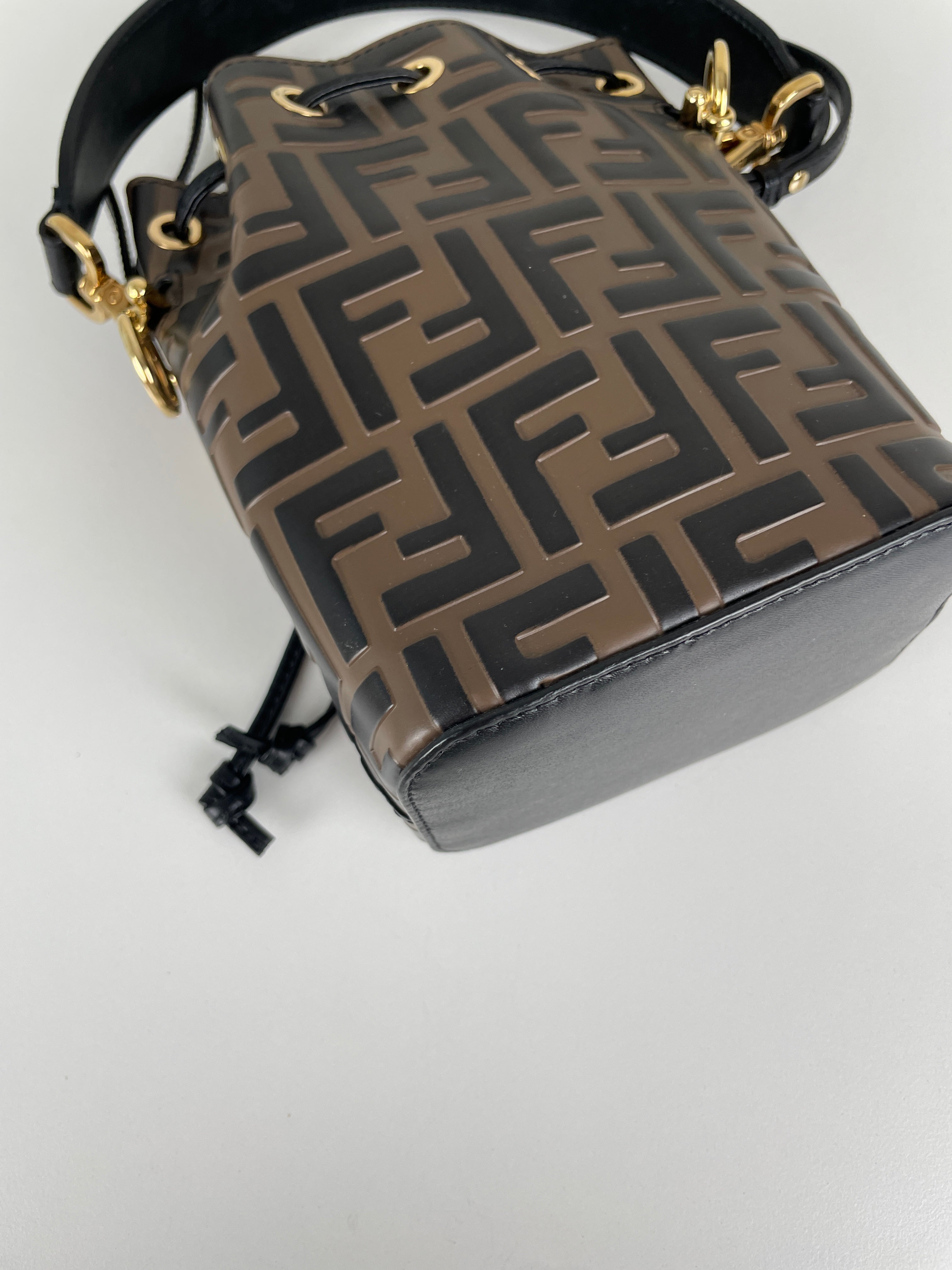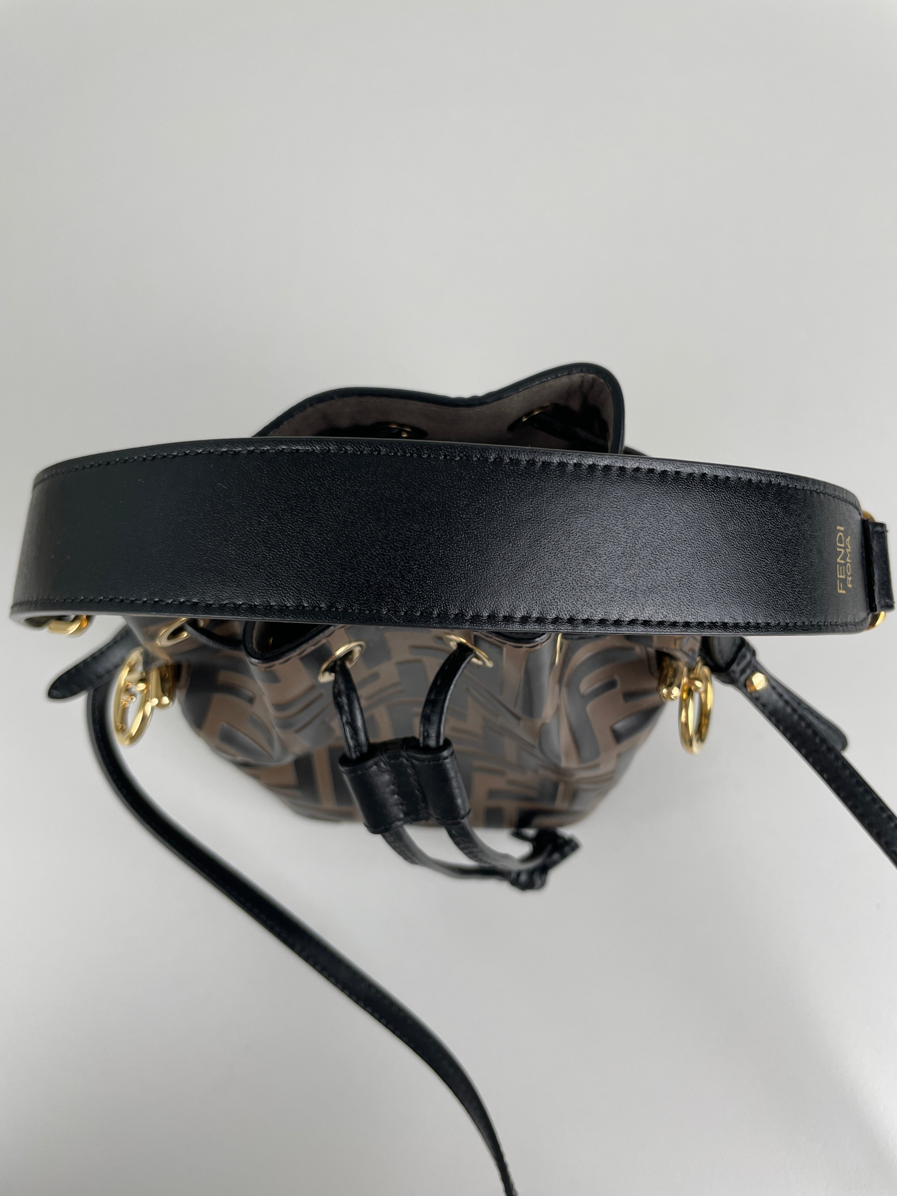 Mini sac Trésor seau Fendi en cuir noir et marron FF