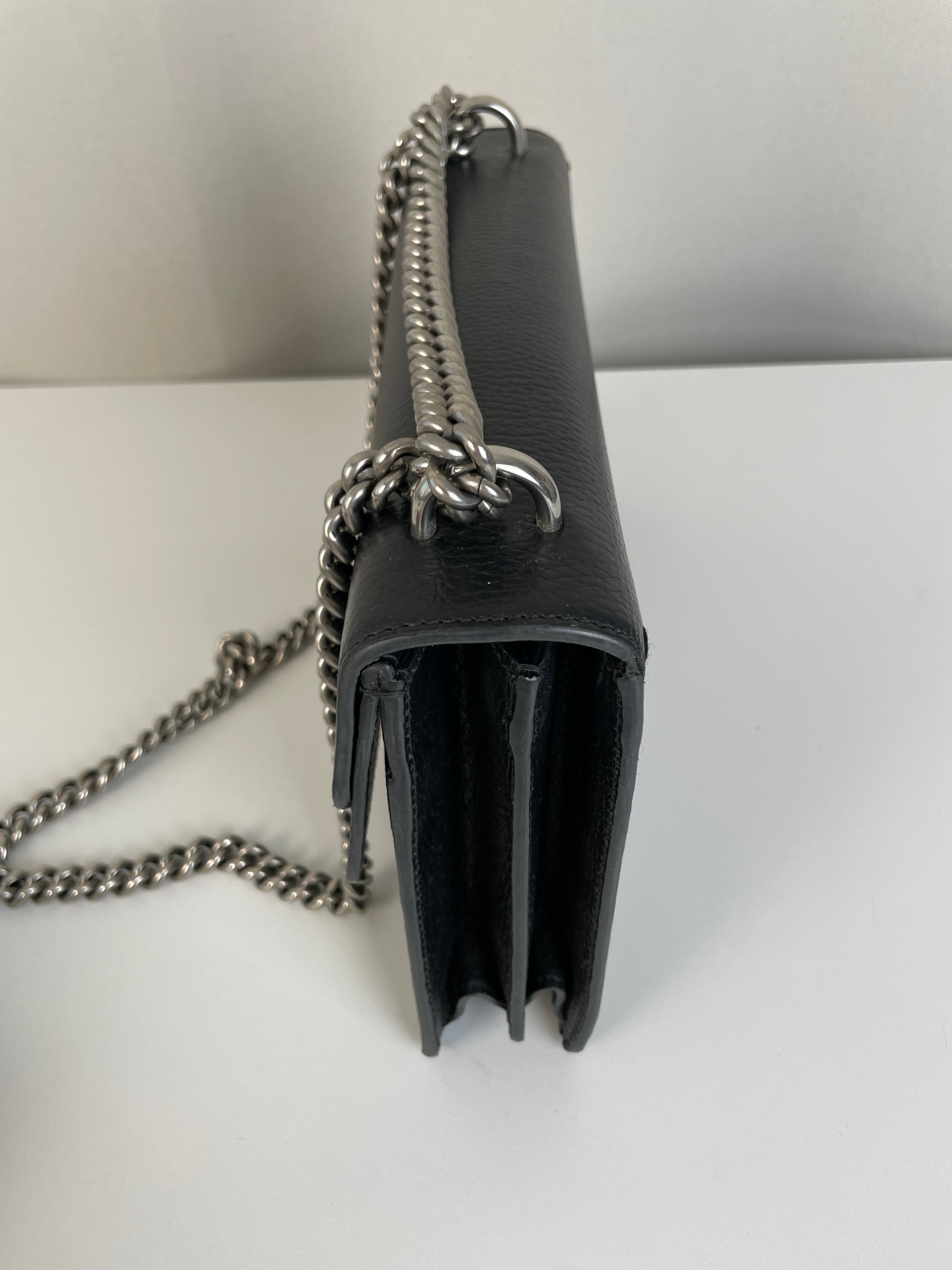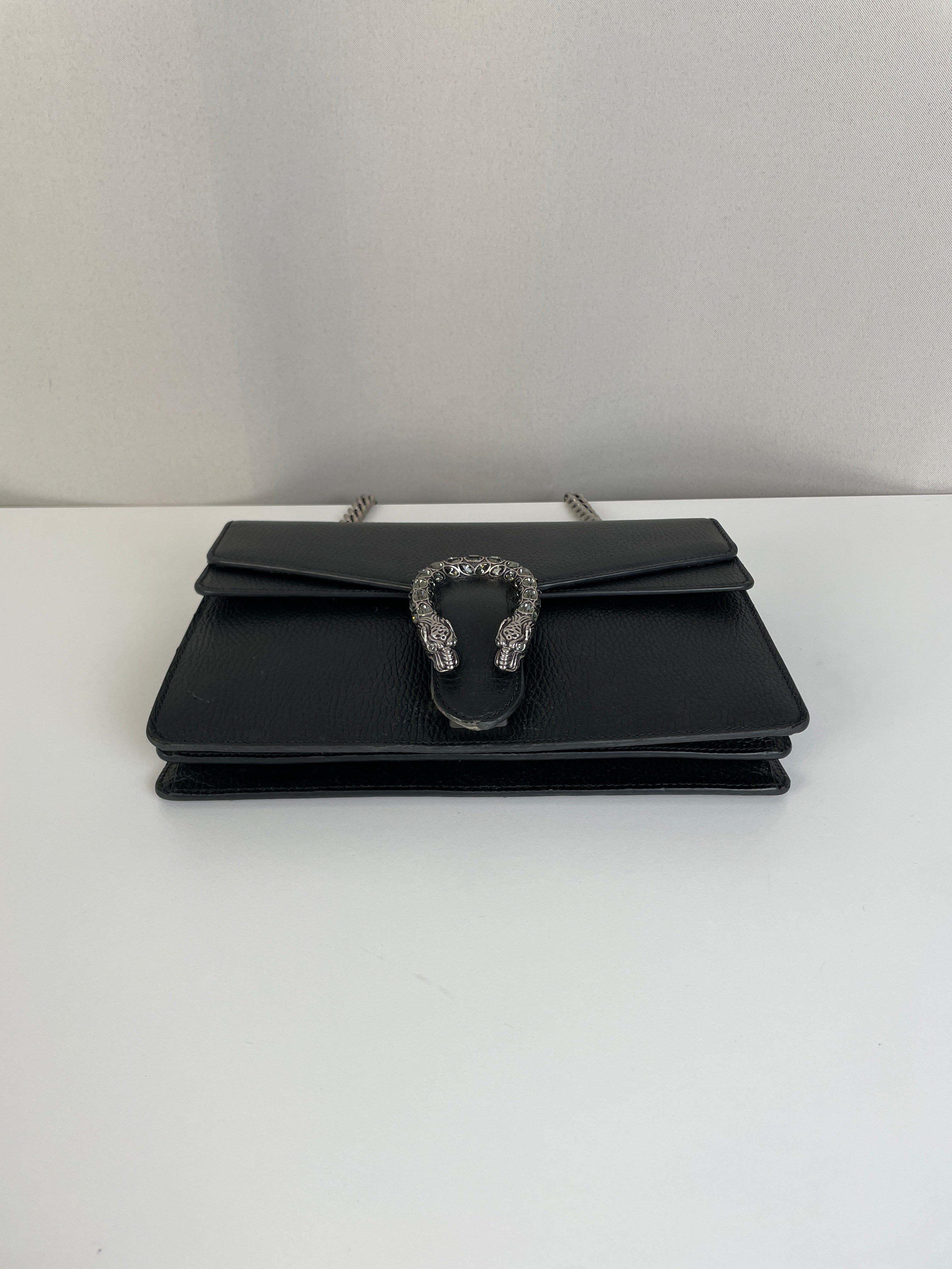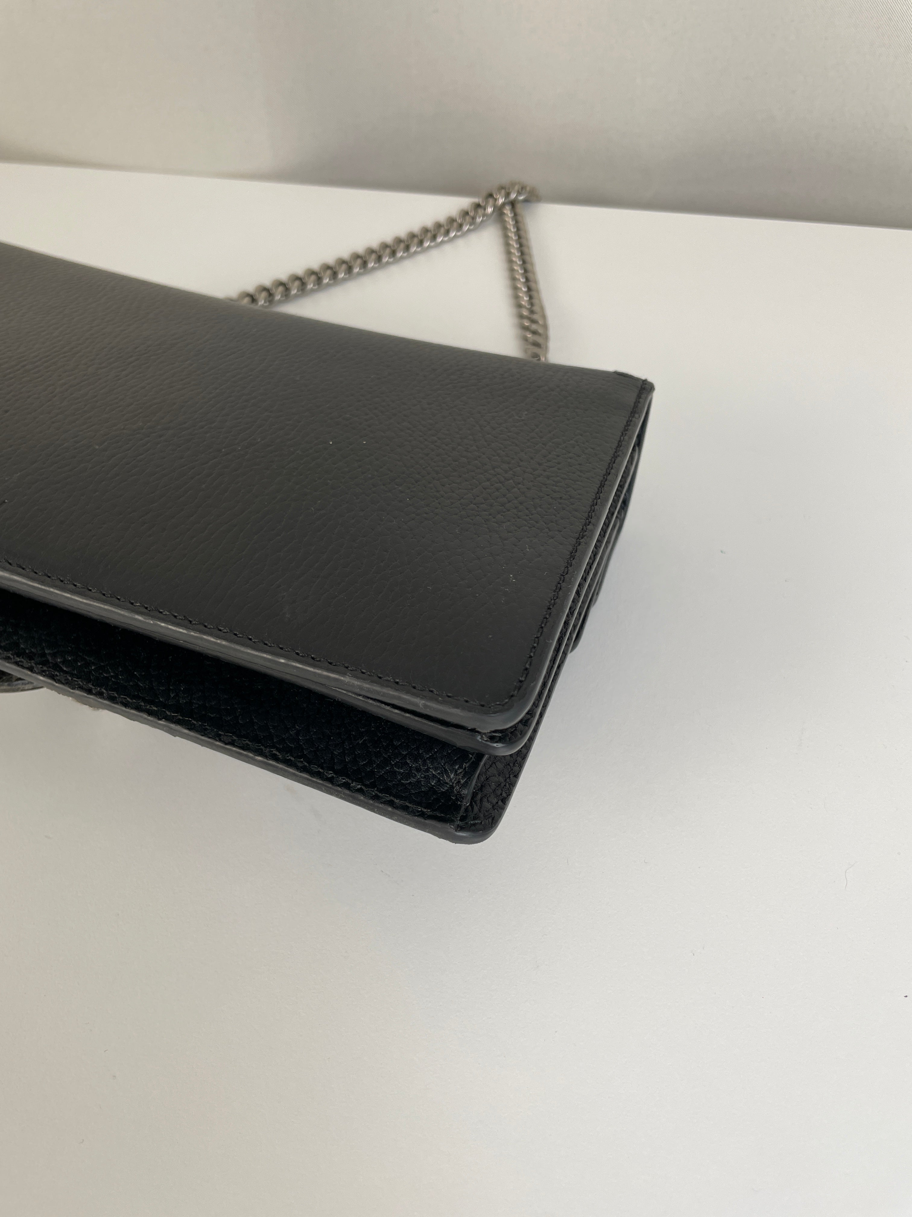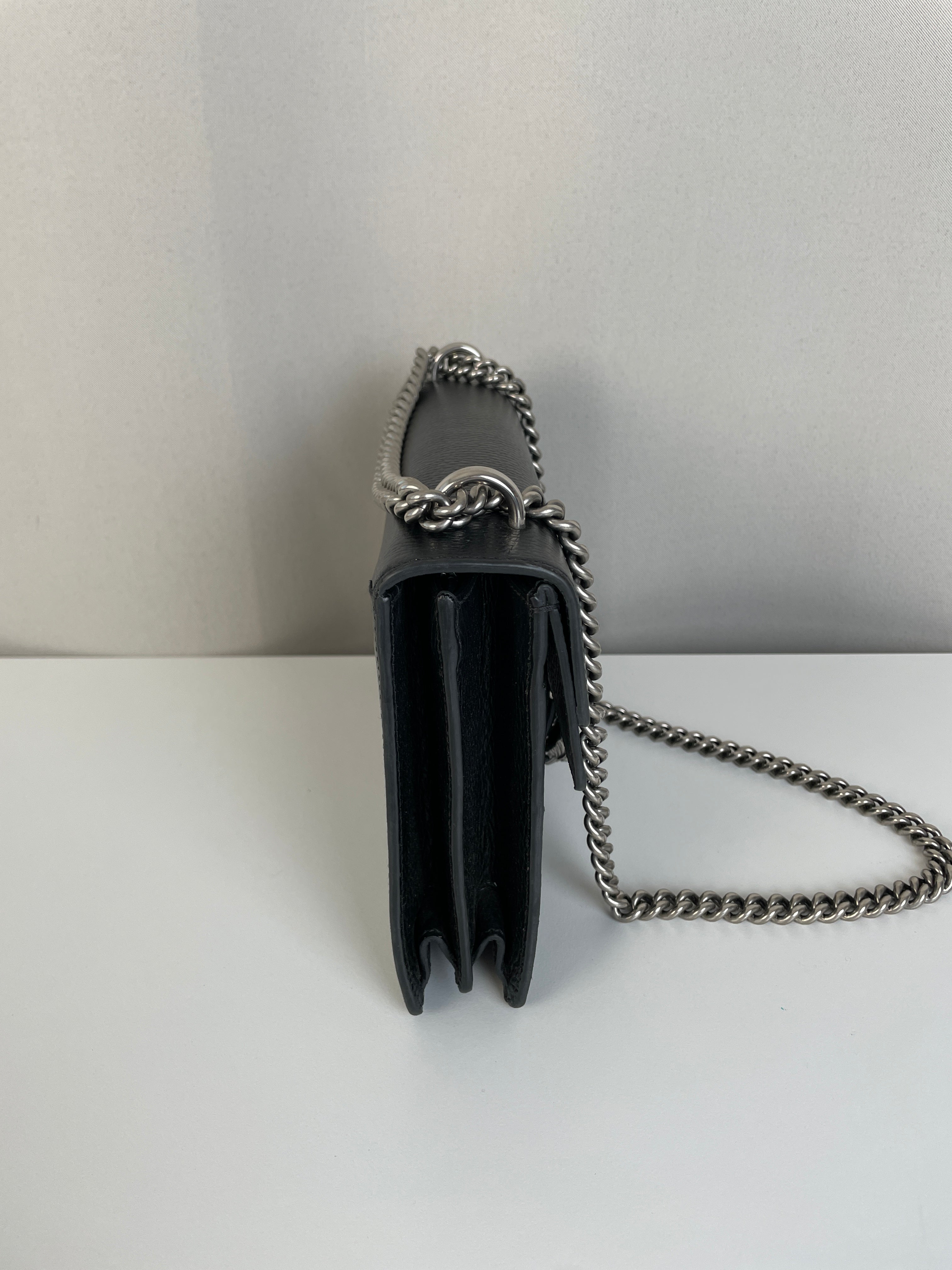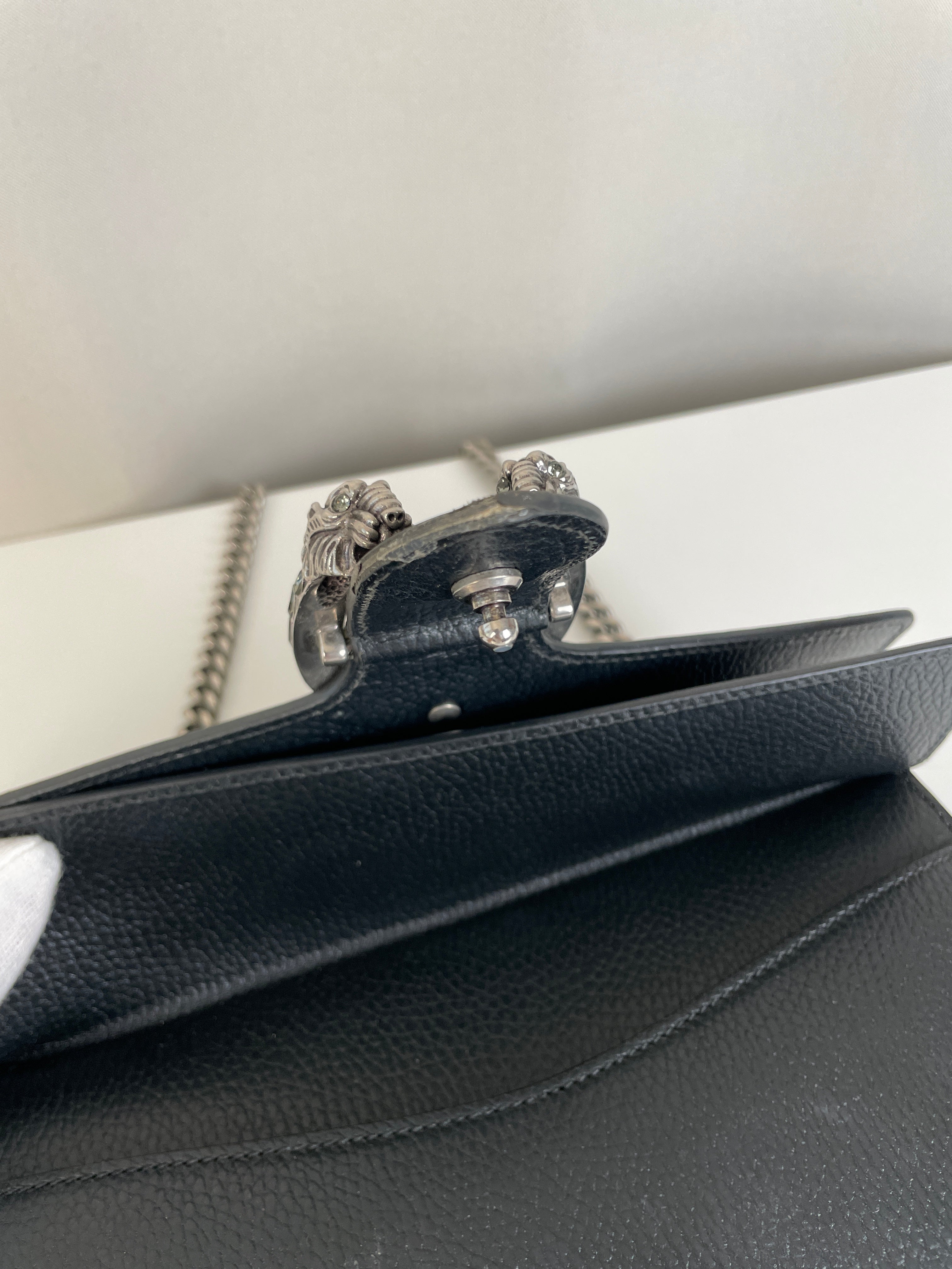 Ce sac Gucci Dionysus en cuir noir est en très bon état. Le cuir est en très bon état. Les coins sont en très bon état, un peu frottés. La chaine est en très bon état. Les côtés d'ouverture du sac sont un peu frottés en raison de l'utilisation normale et de l'ouverture du sac. L'intérieur est en très bon état, quelques petites taches.