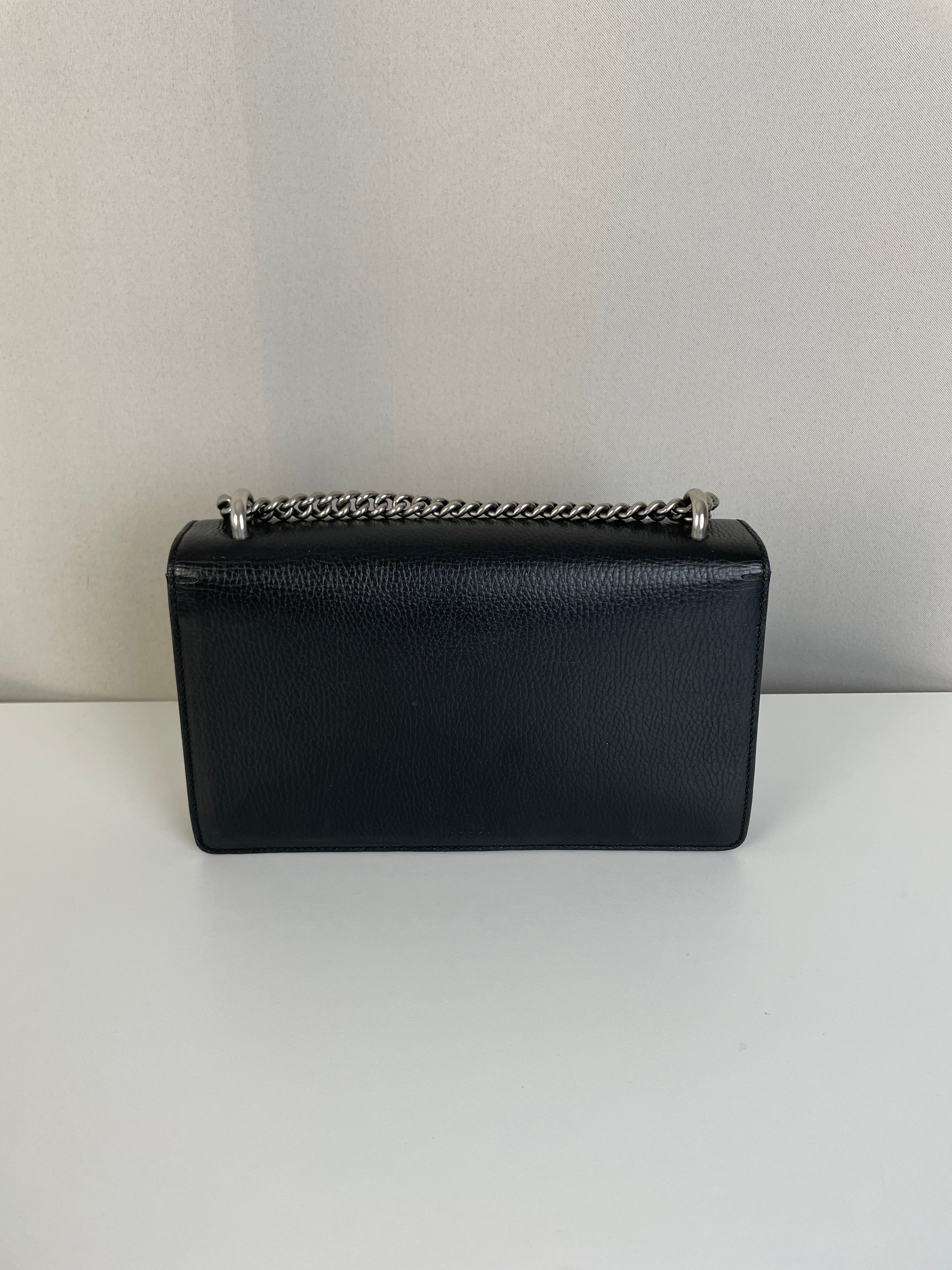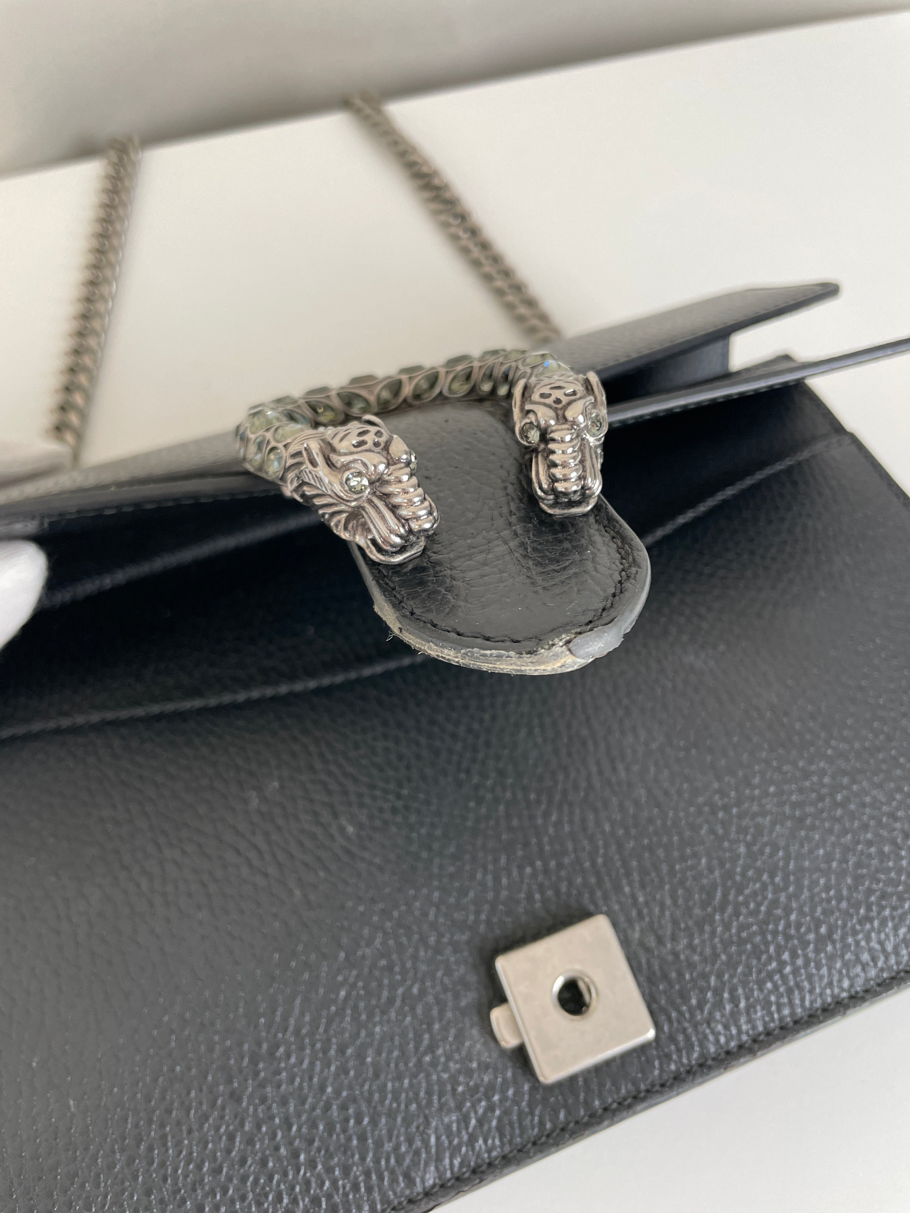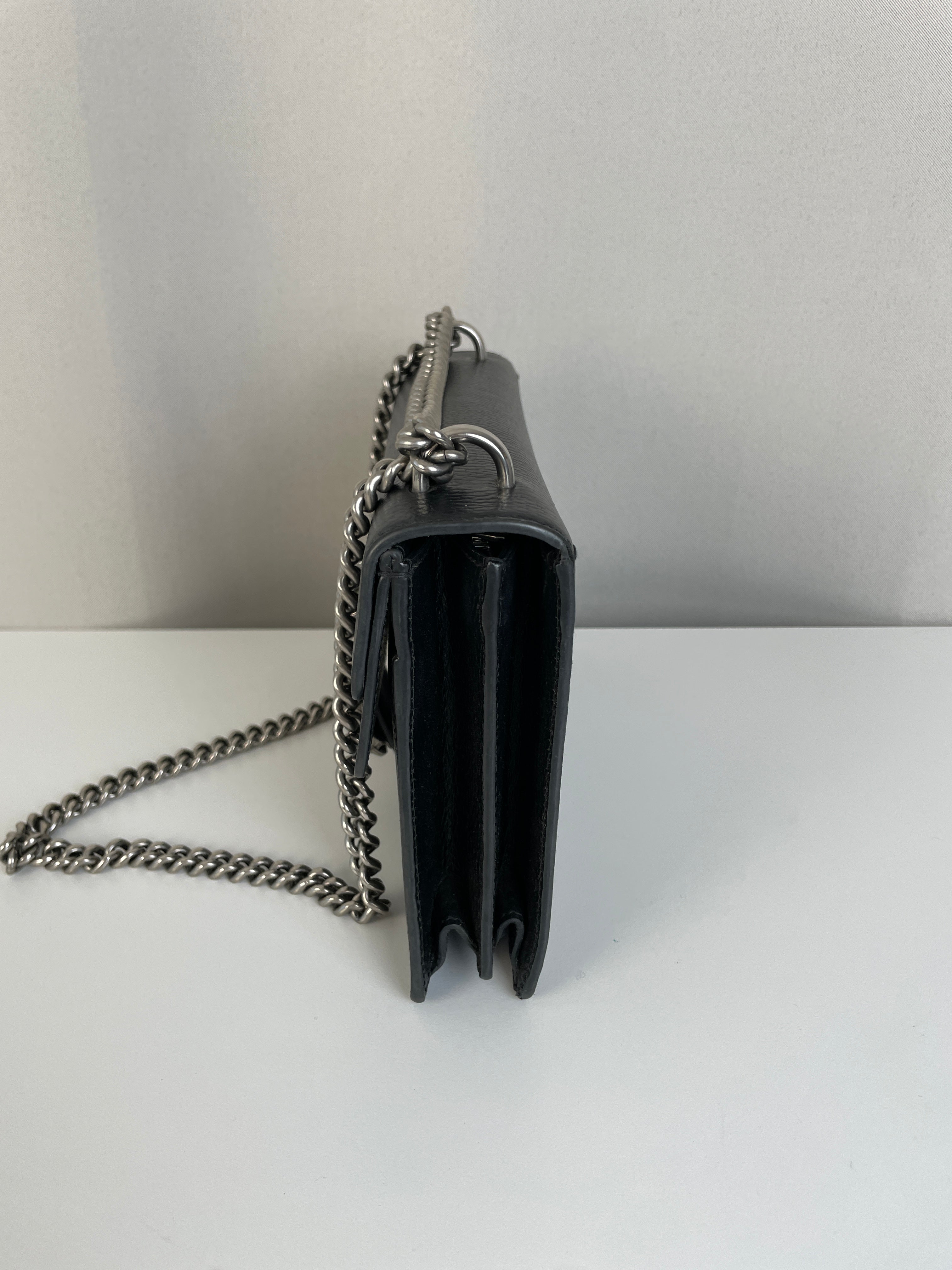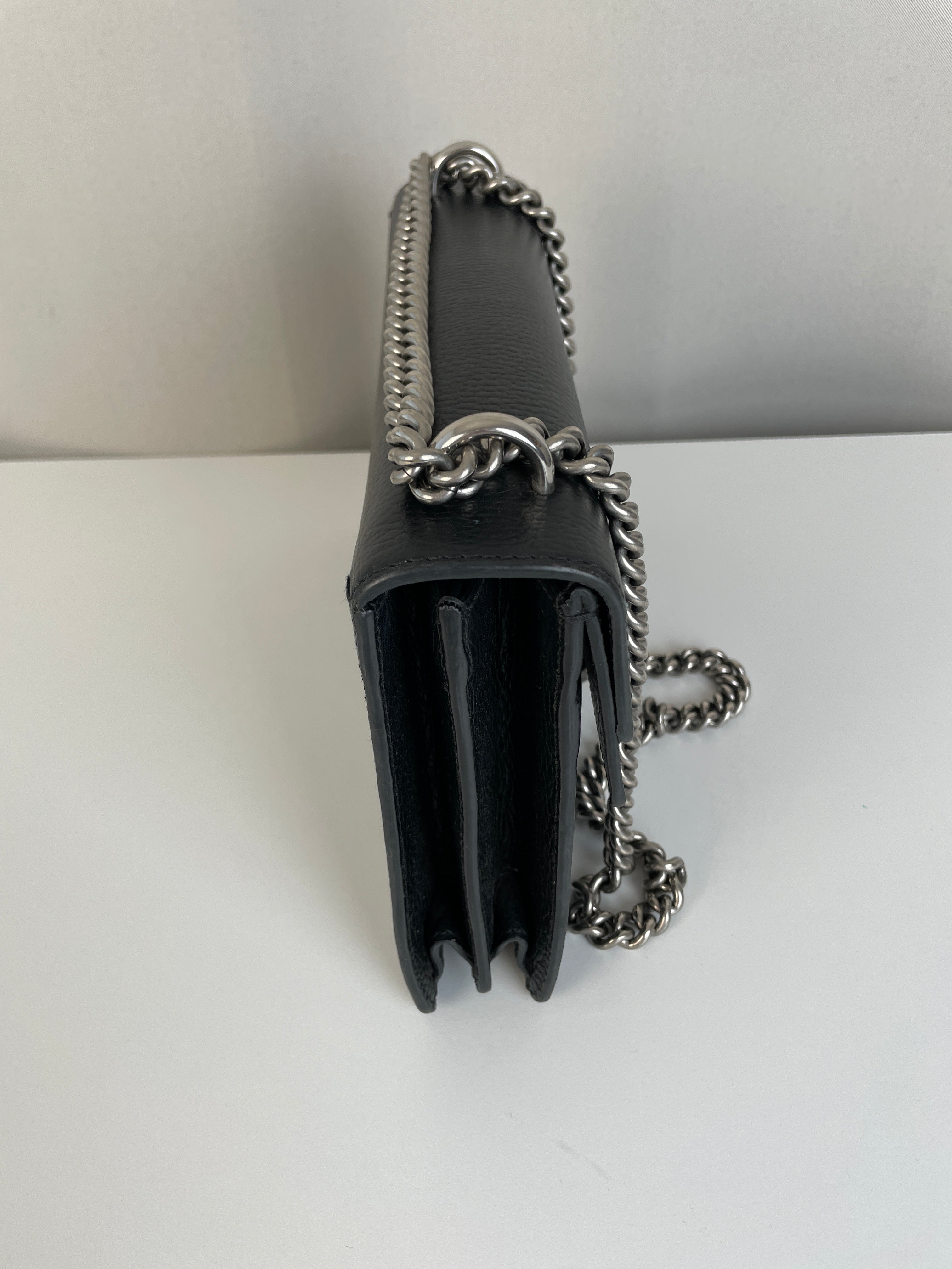 Ce sac Gucci Dionysus en cuir noir est en très bon état. Le cuir est en très bon état. Les coins sont en très bon état, un peu frottés. La chaine est en très bon état. Les côtés d'ouverture du sac sont un peu frottés en raison de l'utilisation normale et de l'ouverture du sac. L'intérieur est en très bon état, quelques petites taches.
