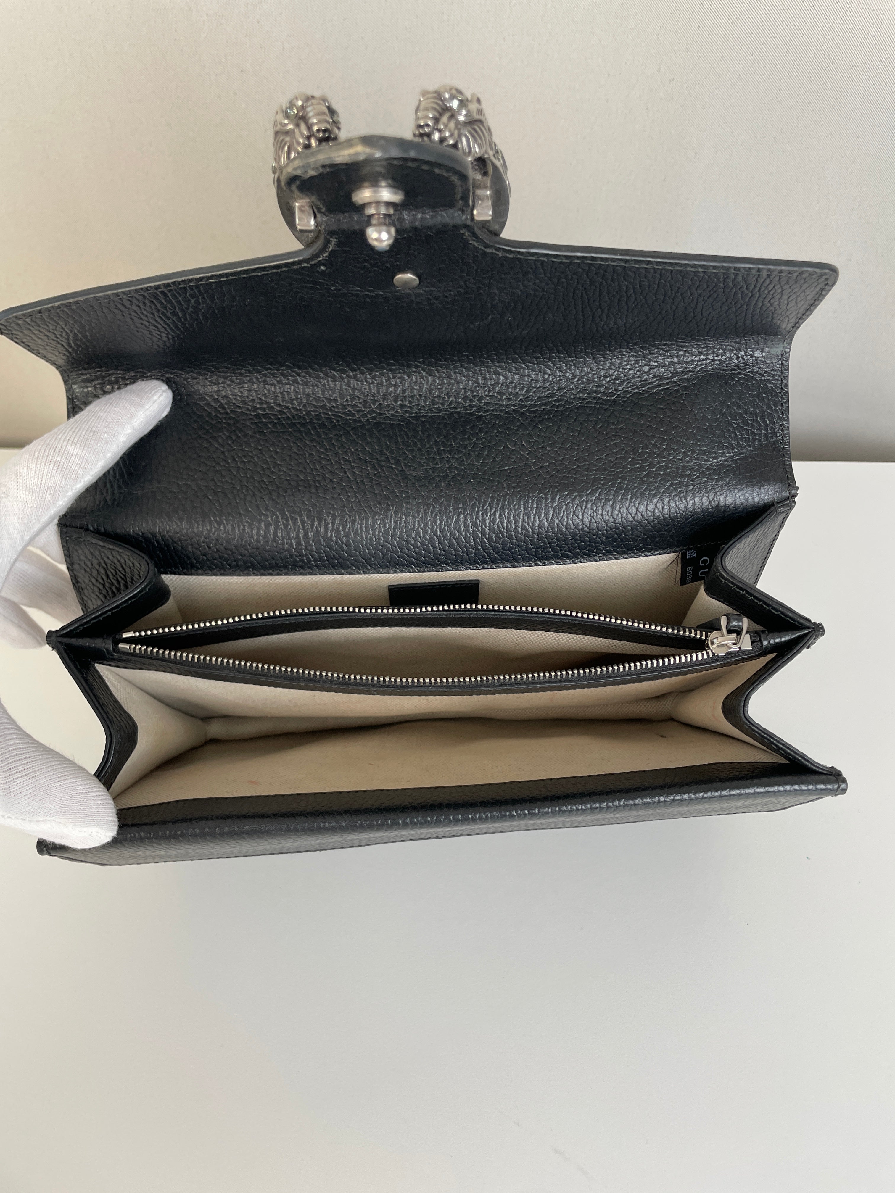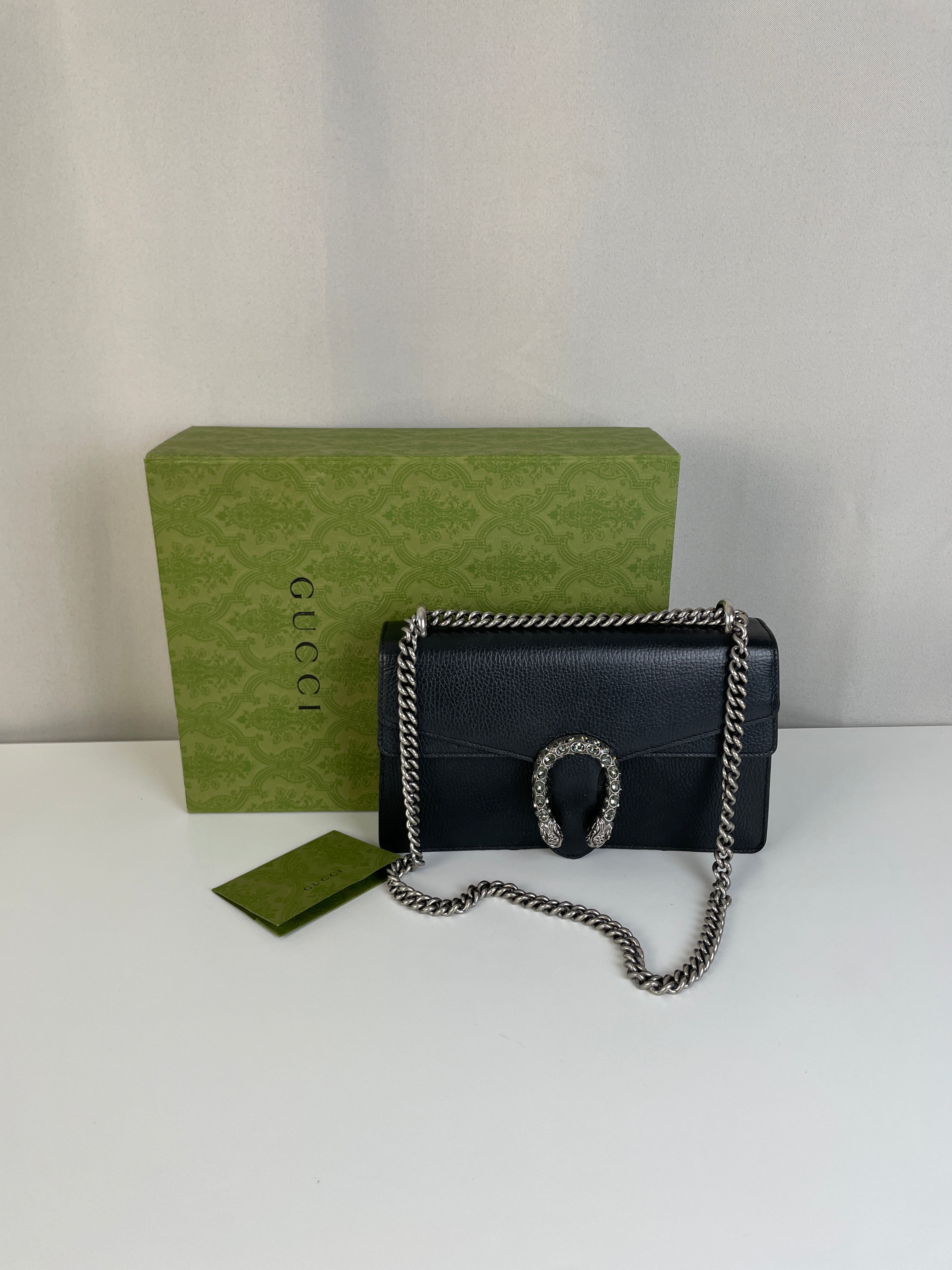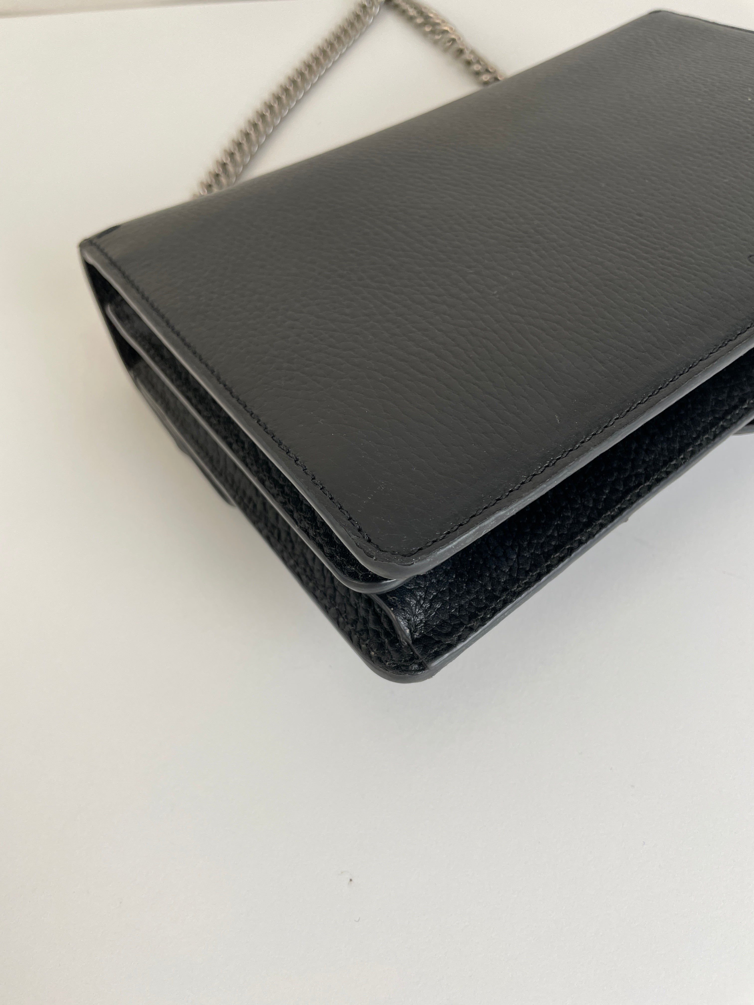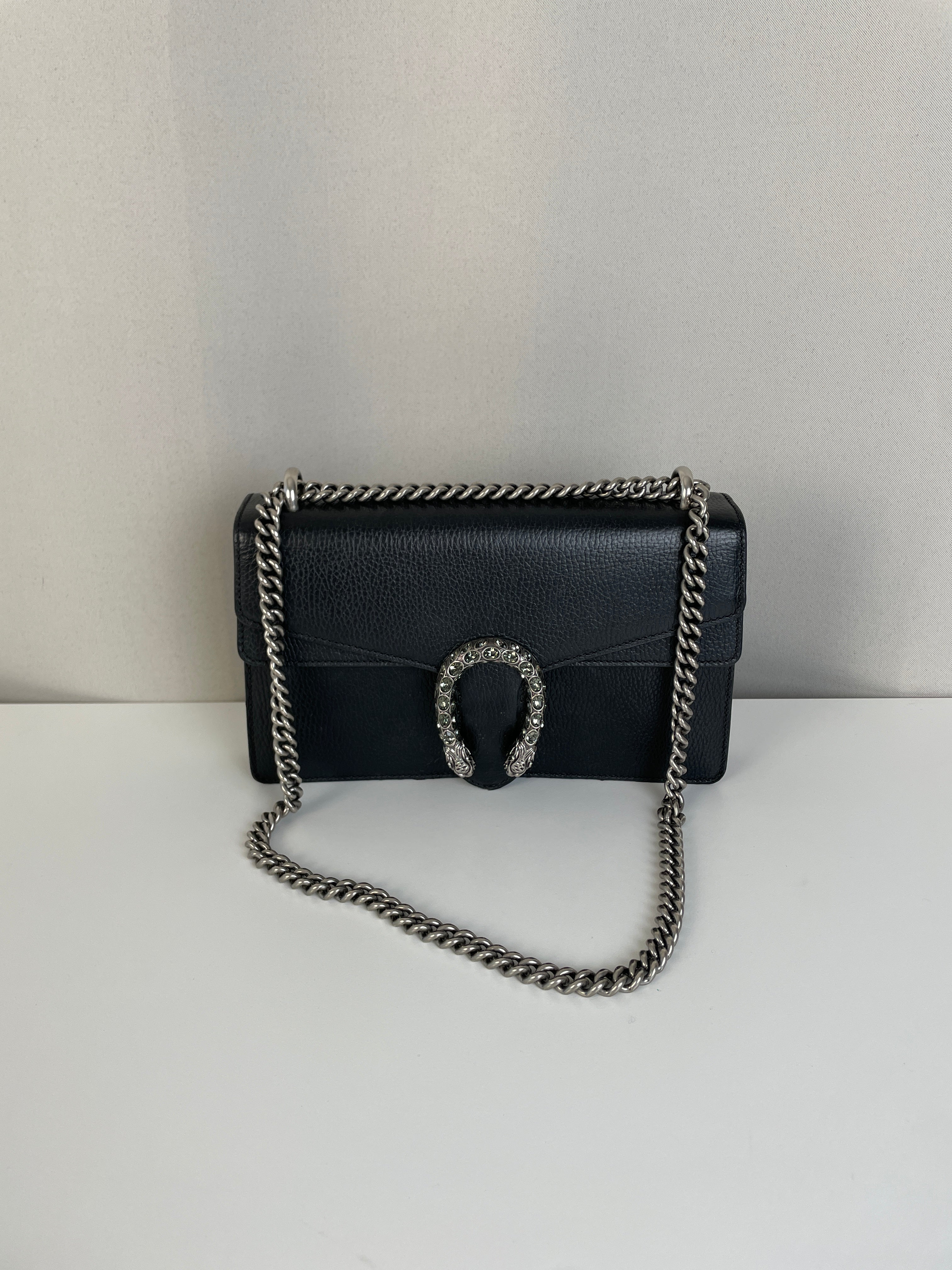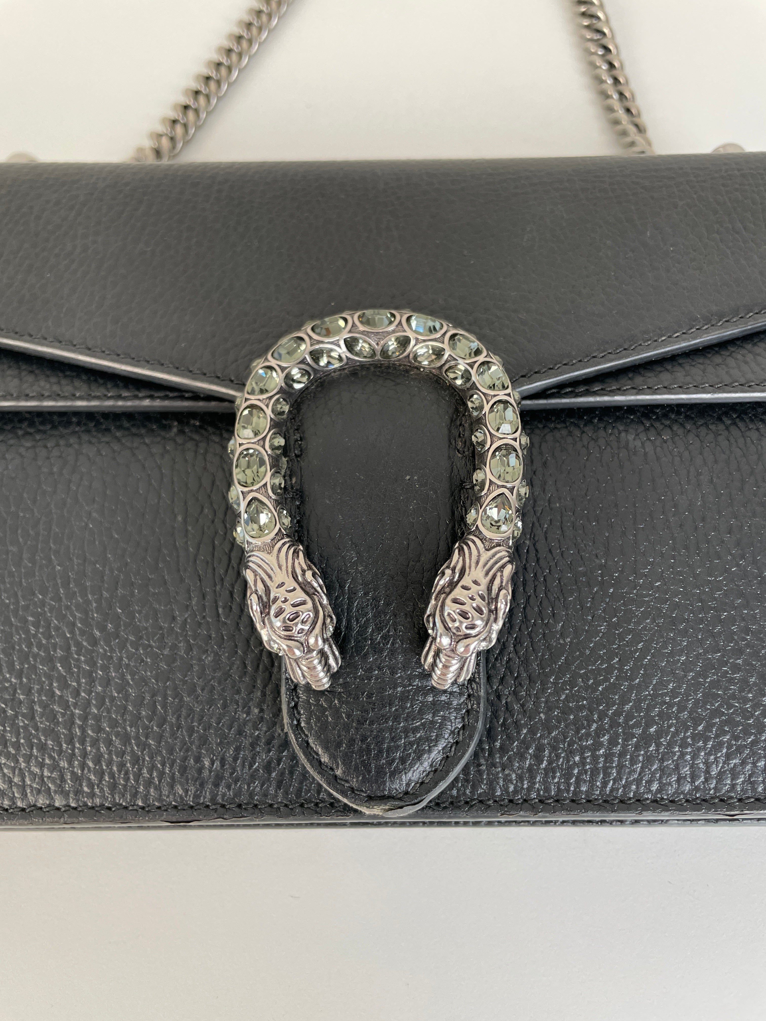 Ce sac Gucci Dionysus en cuir noir est en très bon état. Le cuir est en très bon état. Les coins sont en très bon état, un peu frottés. La chaine est en très bon état. Les côtés d'ouverture du sac sont un peu frottés en raison de l'utilisation normale et de l'ouverture du sac. L'intérieur est en très bon état, quelques petites taches.