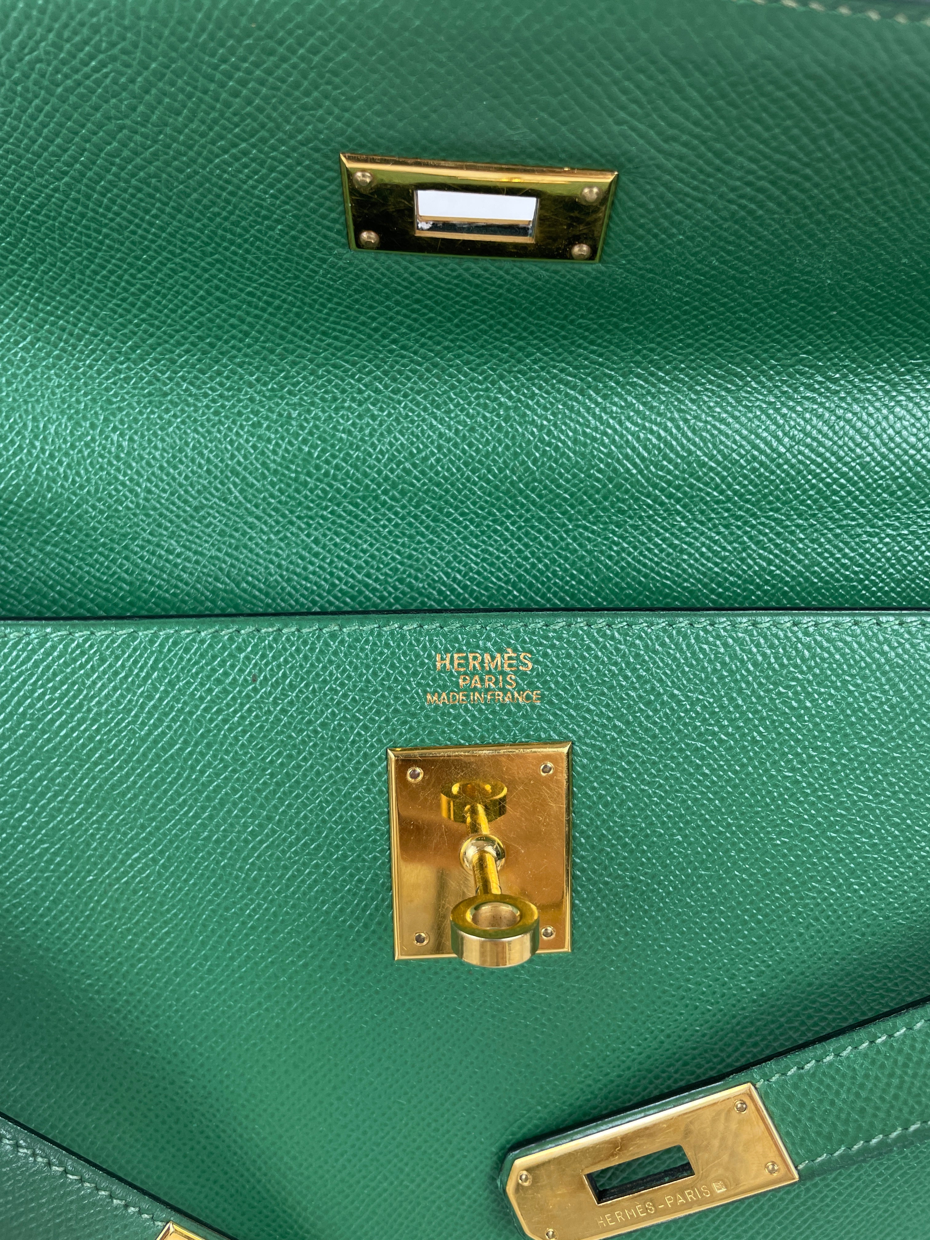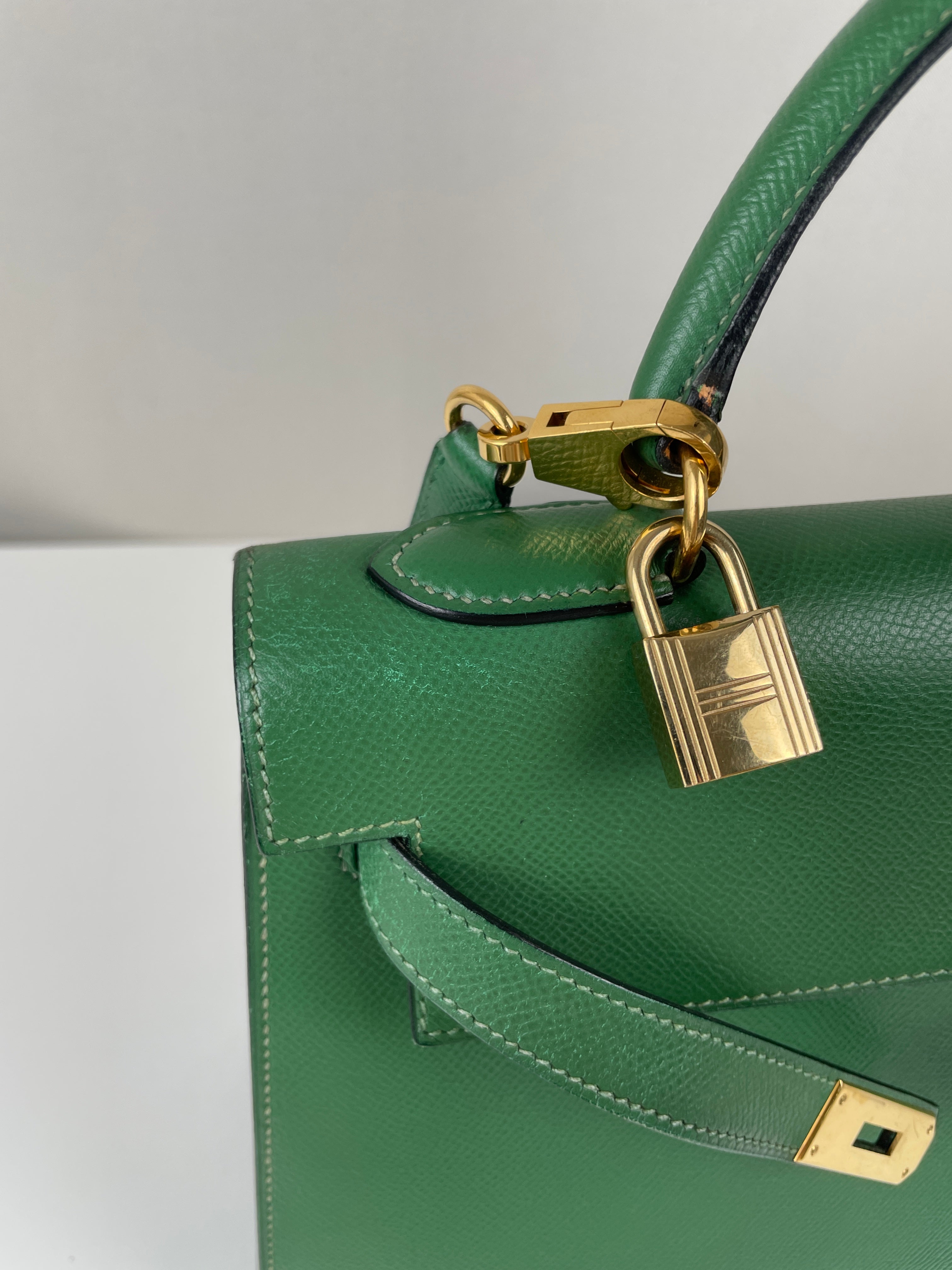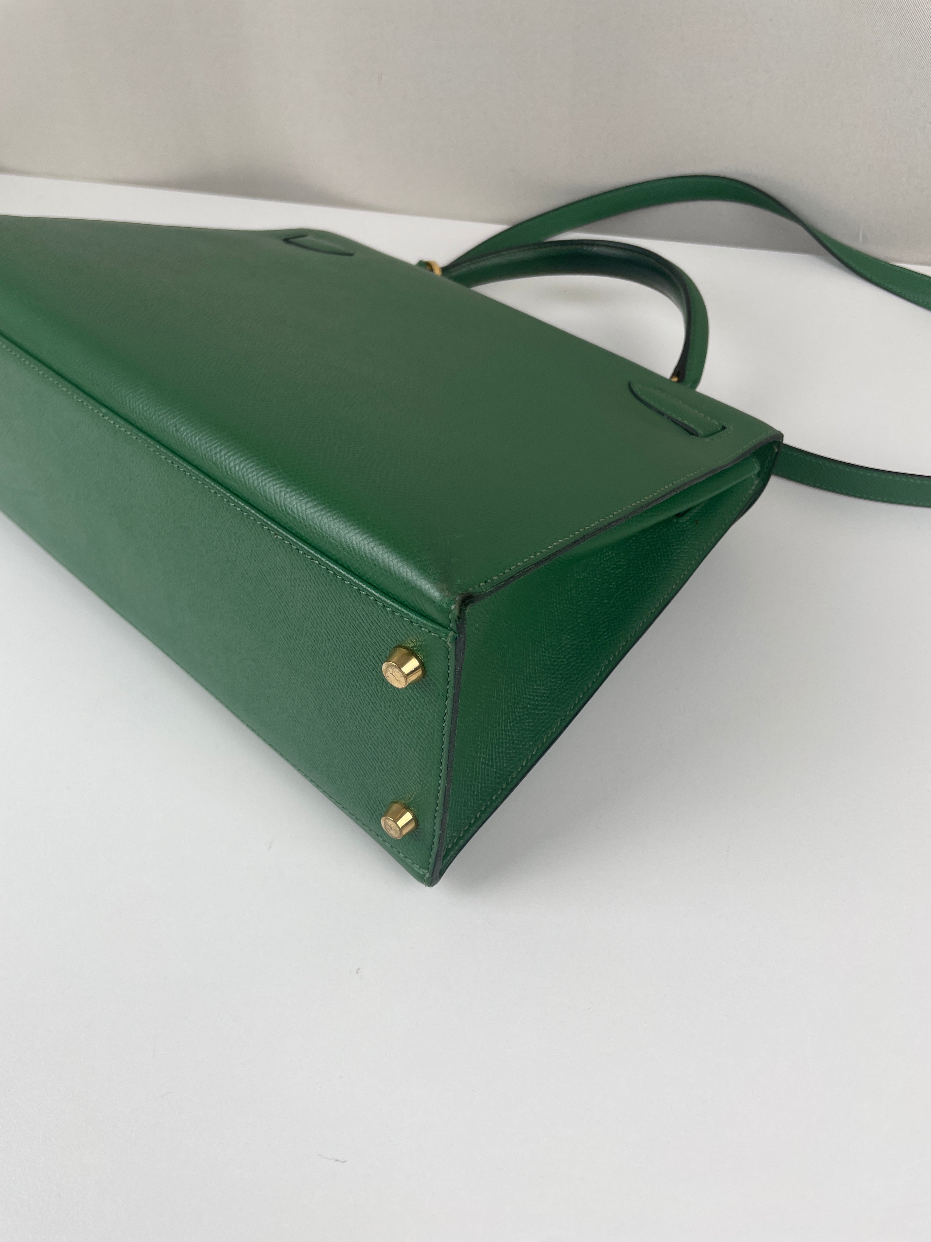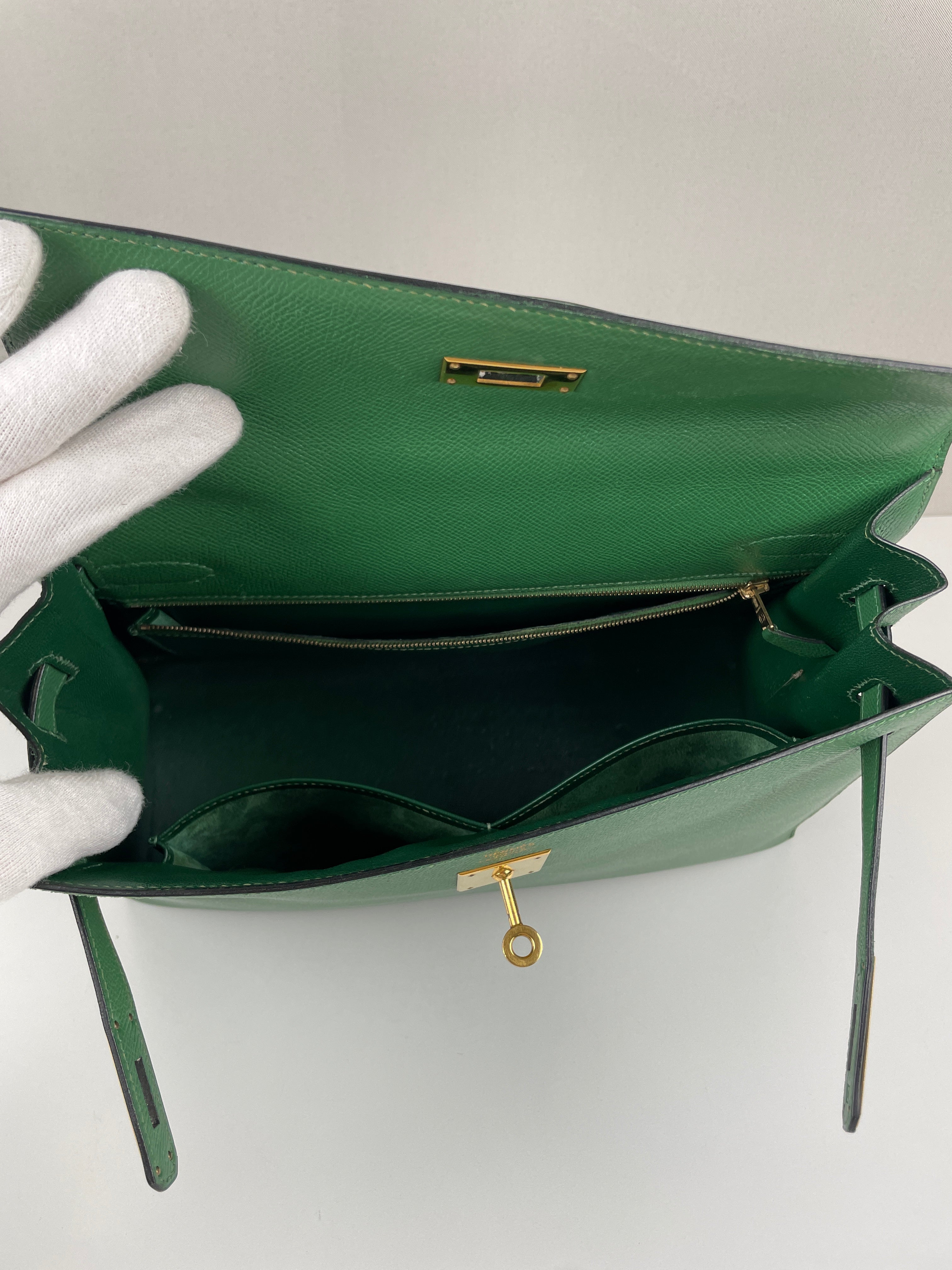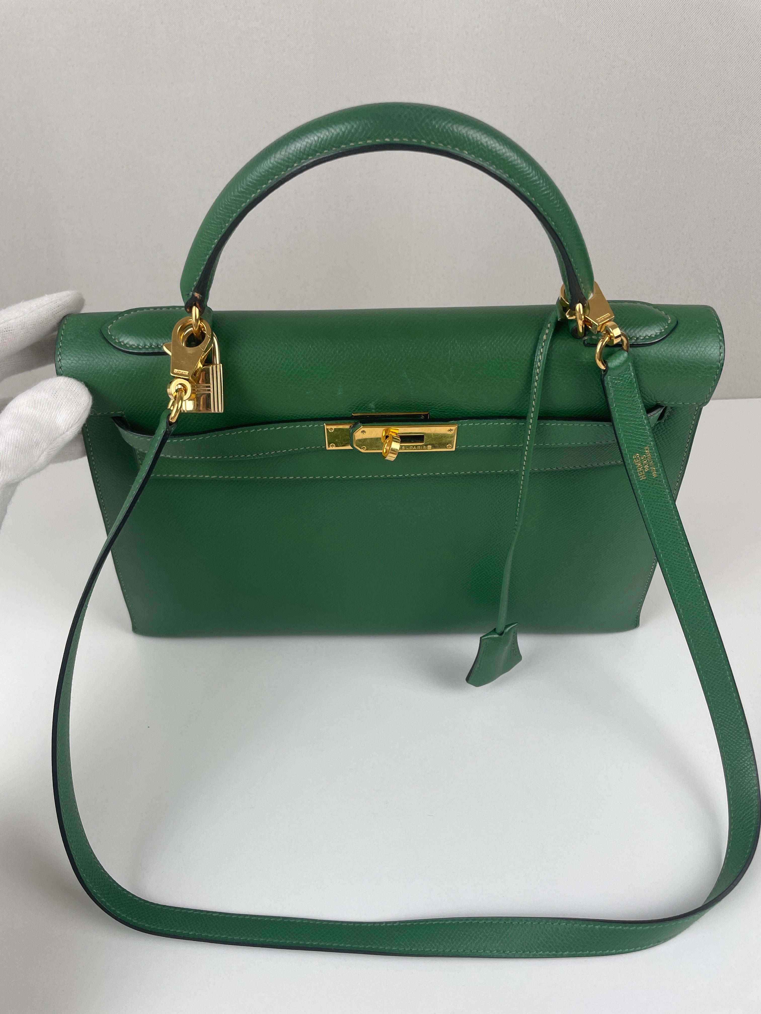 Ce sac Kelly 32 Hermès est en bon / très bon état. Il est de couleur Vert Bengal, un beau vert. Réalisé en cuir Courchevel, très proche du cuir epsom. Le sac date de 1997. Le cuir est en bon état, on peut voir quelques traces d'usure sur le devant au dessus de la fermeture du sac. C'est tout à fait normal sur un sac de 1997, il a 28 ans. L'intérieur est en très bon état. La bandoulière est en très bon état avec seulement des signes d'usure mineurs. Les coins sont un peu frottés. Il est livré avec un dustbag, un cadenas et une clé, un certificat Entrupy et notre certificat d'authenticité. Voir les photos.