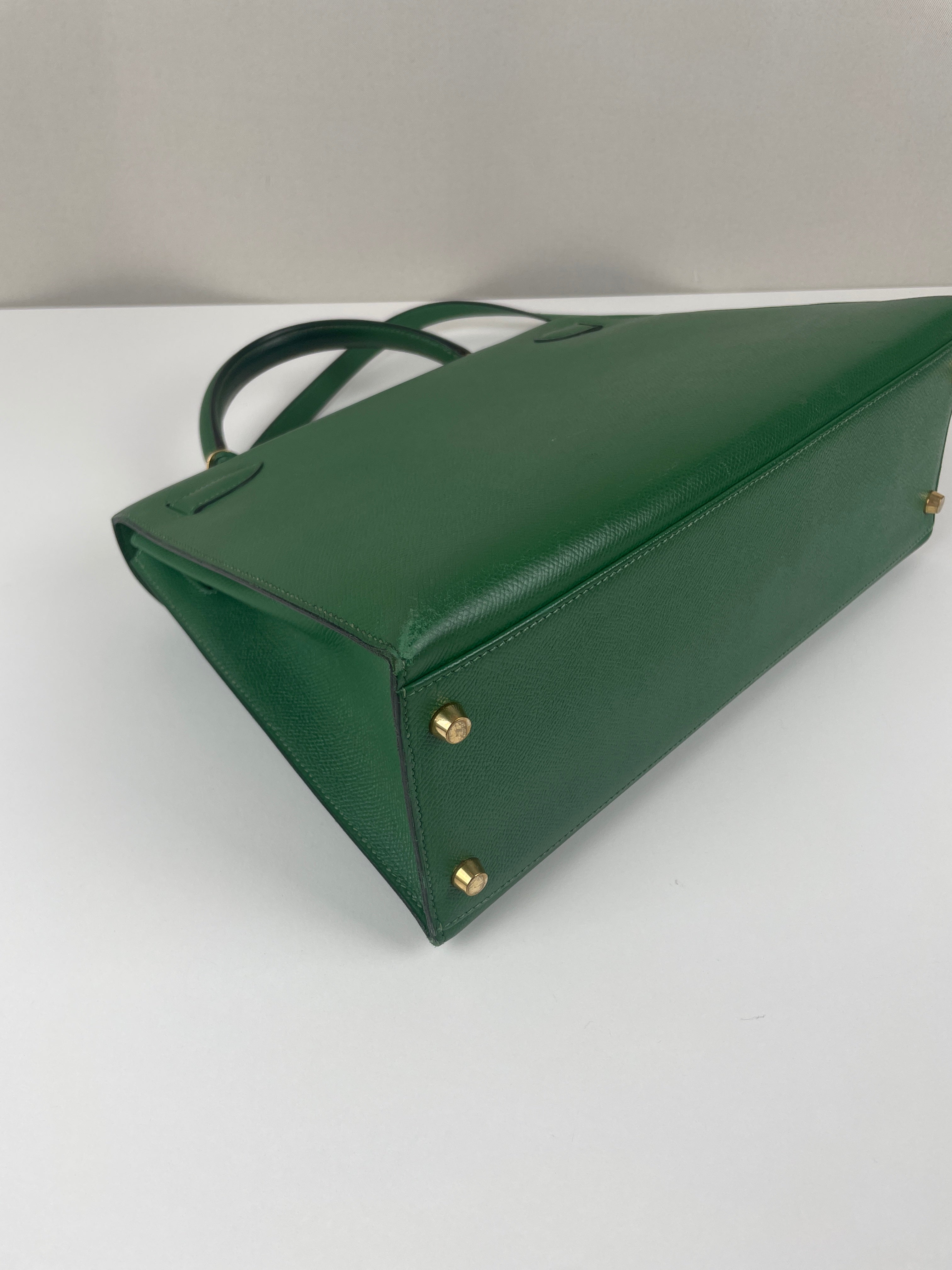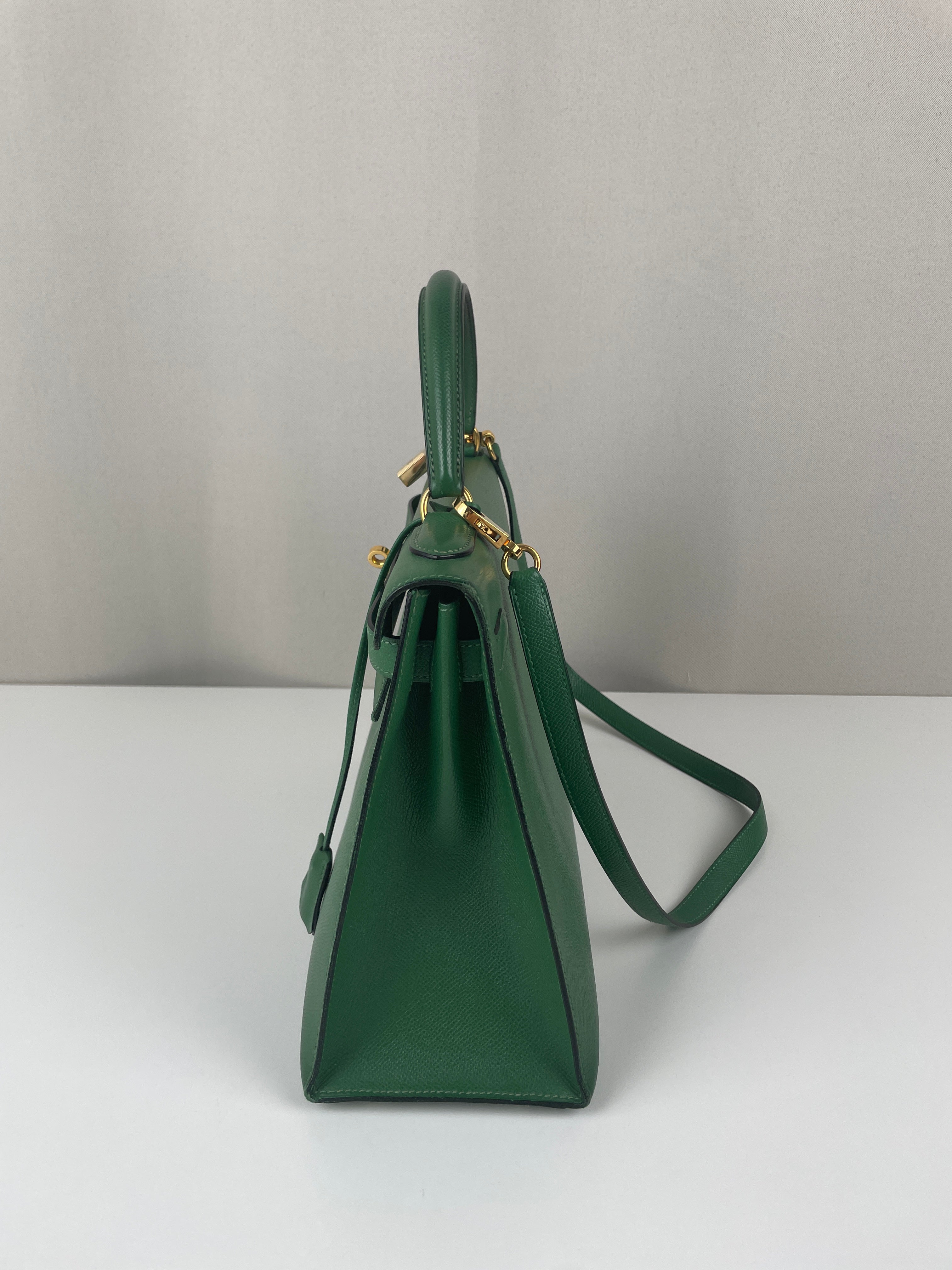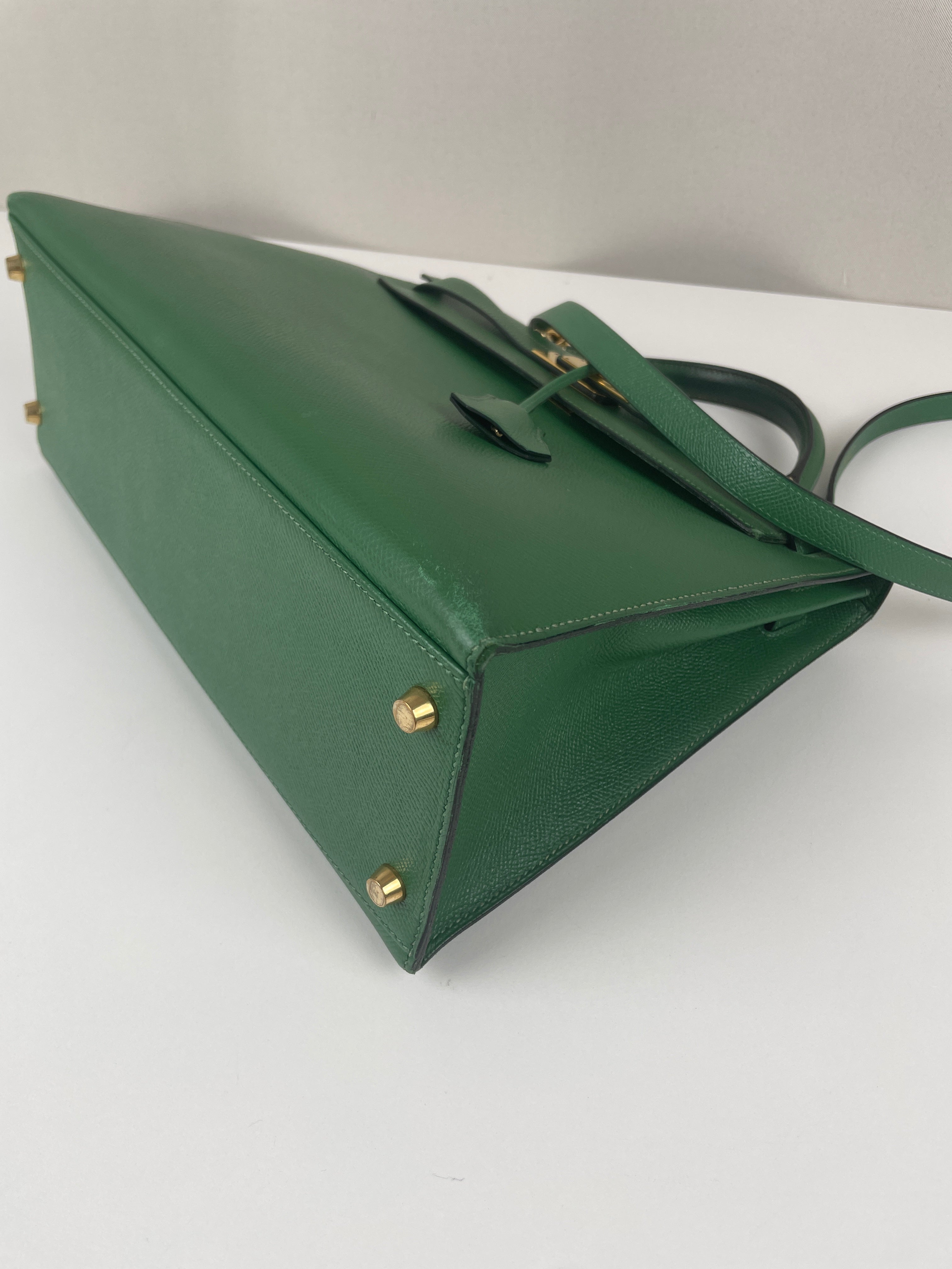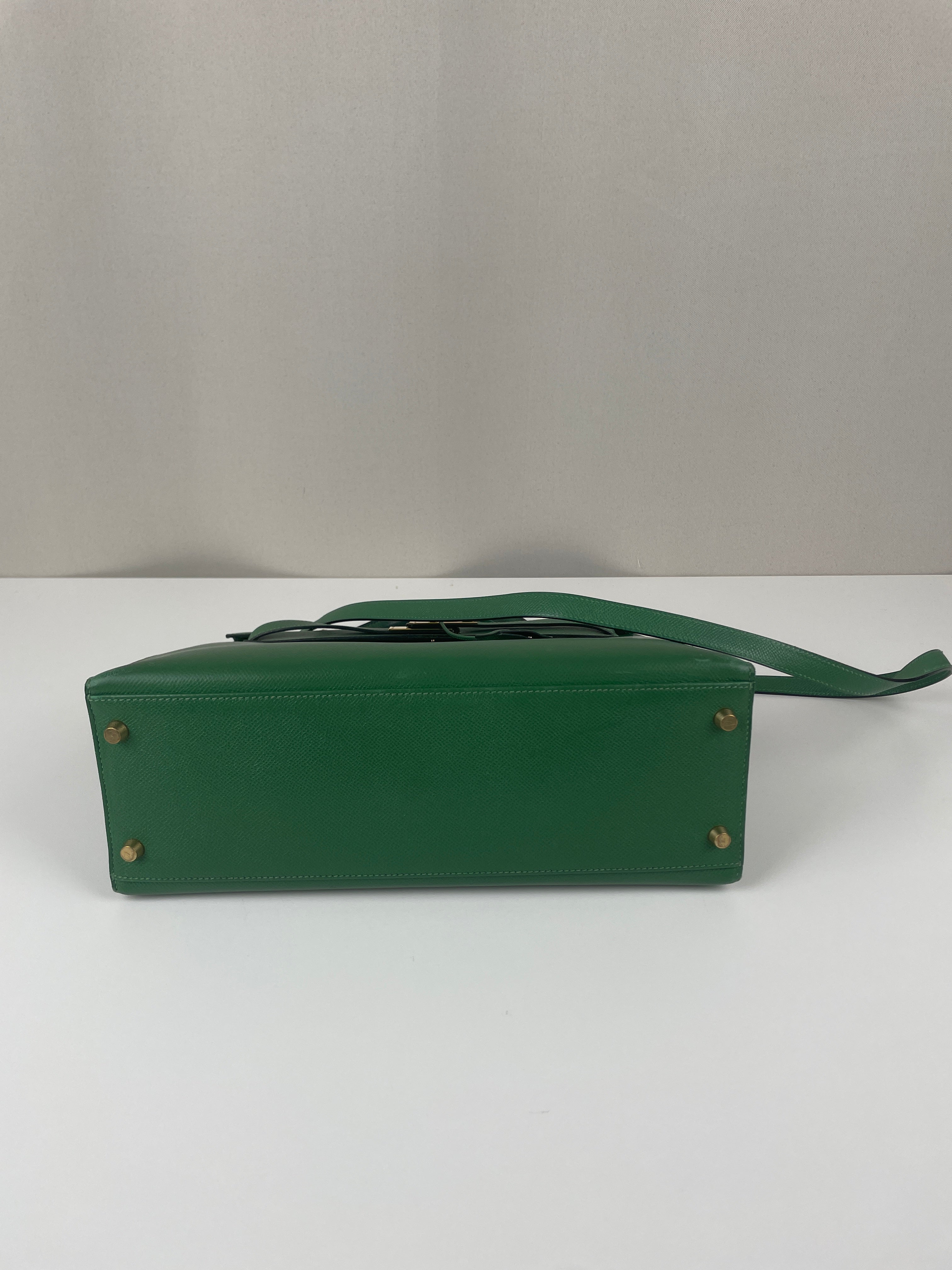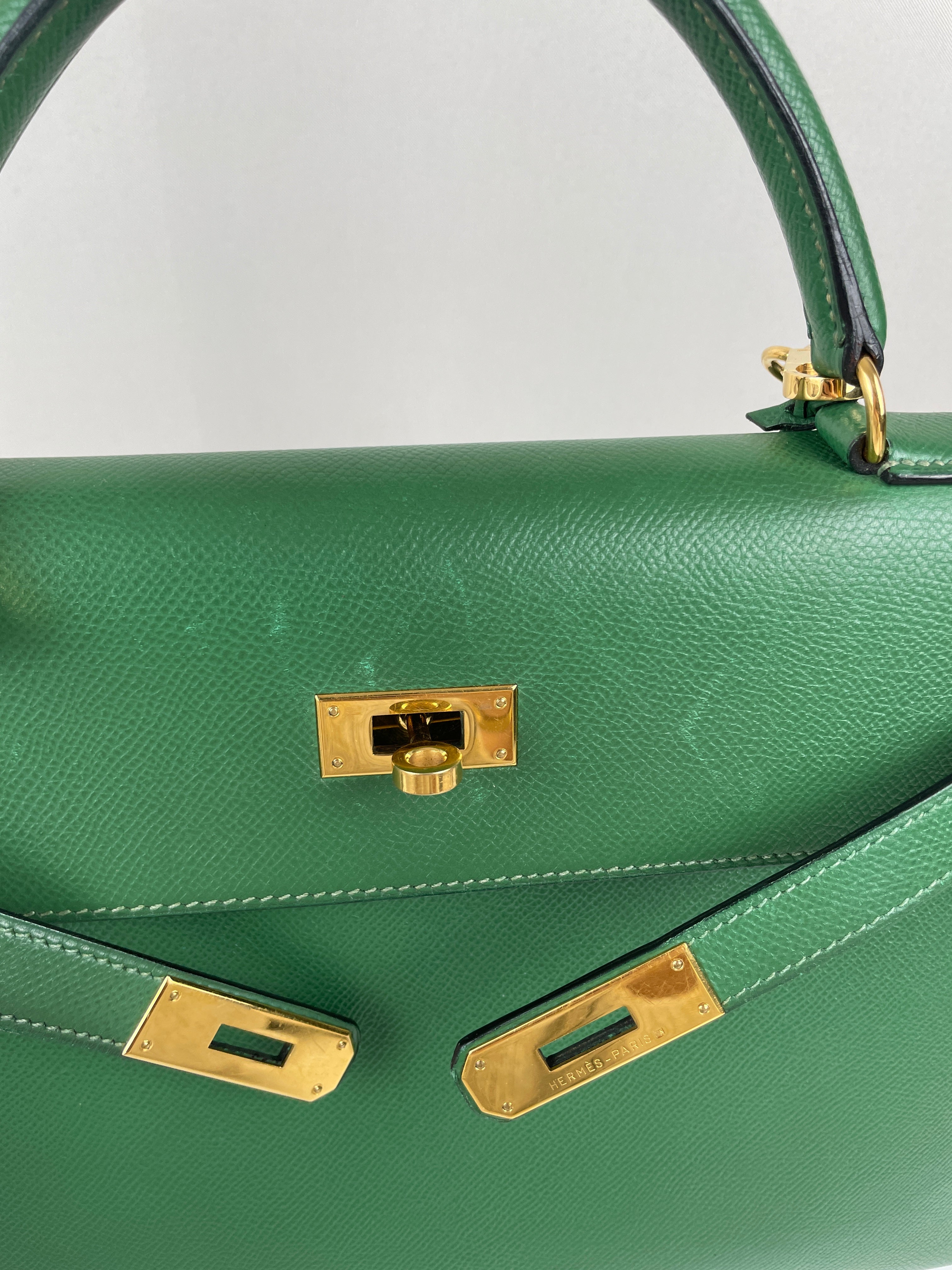 Ce sac Kelly 32 Hermès est en bon / très bon état. Il est de couleur Vert Bengal, un beau vert. Réalisé en cuir Courchevel, très proche du cuir epsom. Le sac date de 1997. Le cuir est en bon état, on peut voir quelques traces d'usure sur le devant au dessus de la fermeture du sac. C'est tout à fait normal sur un sac de 1997, il a 28 ans. L'intérieur est en très bon état. La bandoulière est en très bon état avec seulement des signes d'usure mineurs. Les coins sont un peu frottés. Il est livré avec un dustbag, un cadenas et une clé, un certificat Entrupy et notre certificat d'authenticité. Voir les photos.