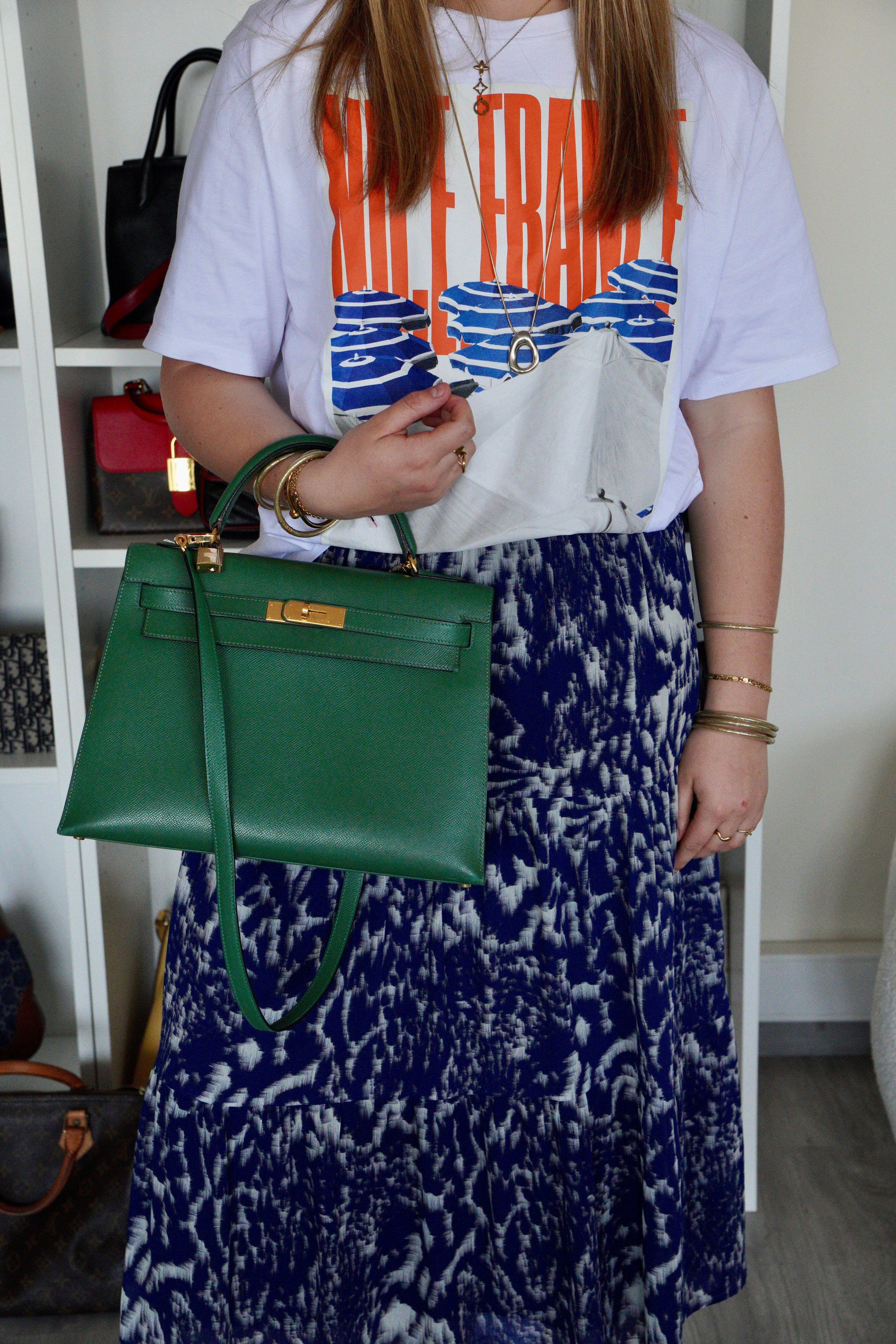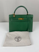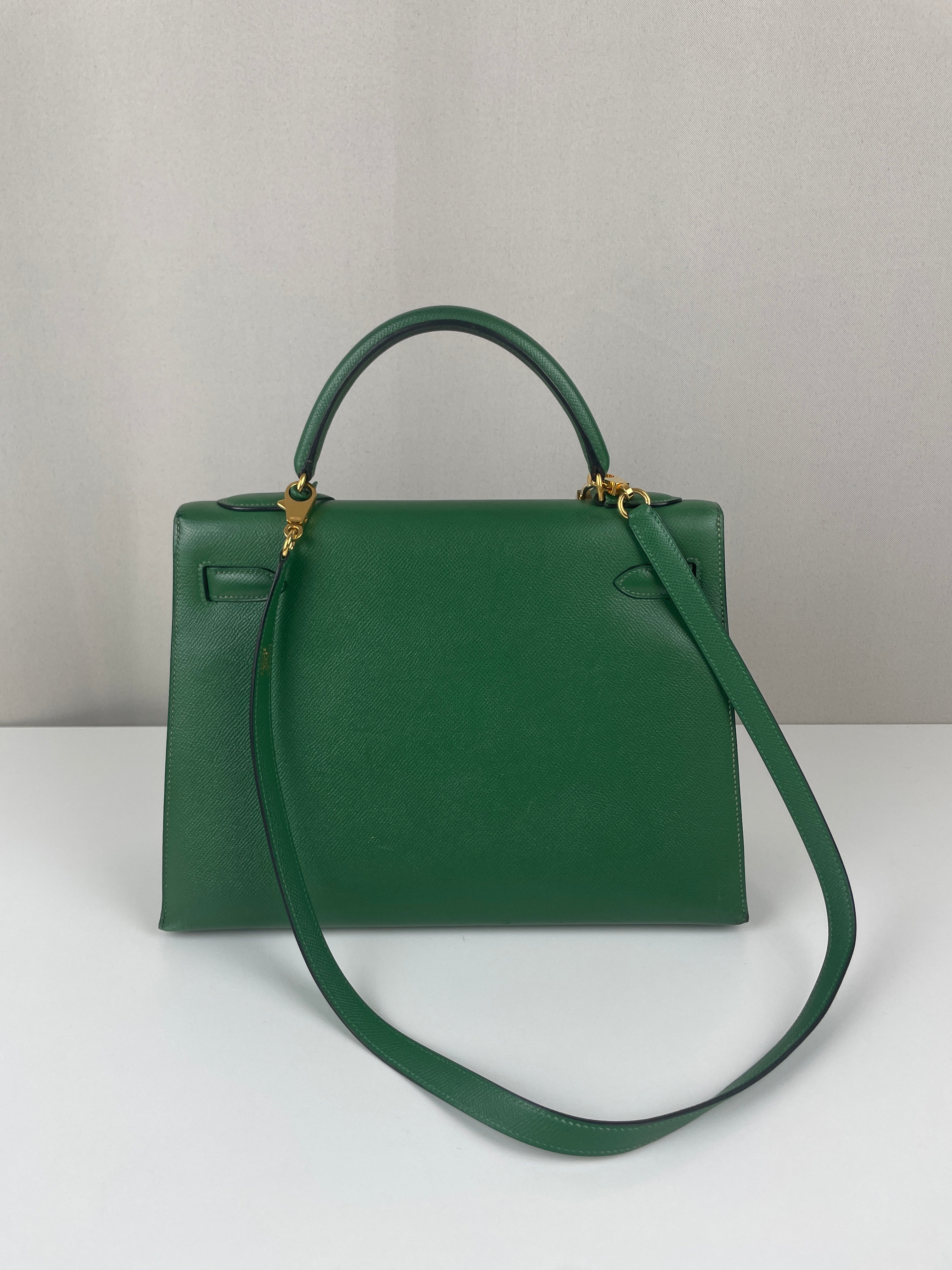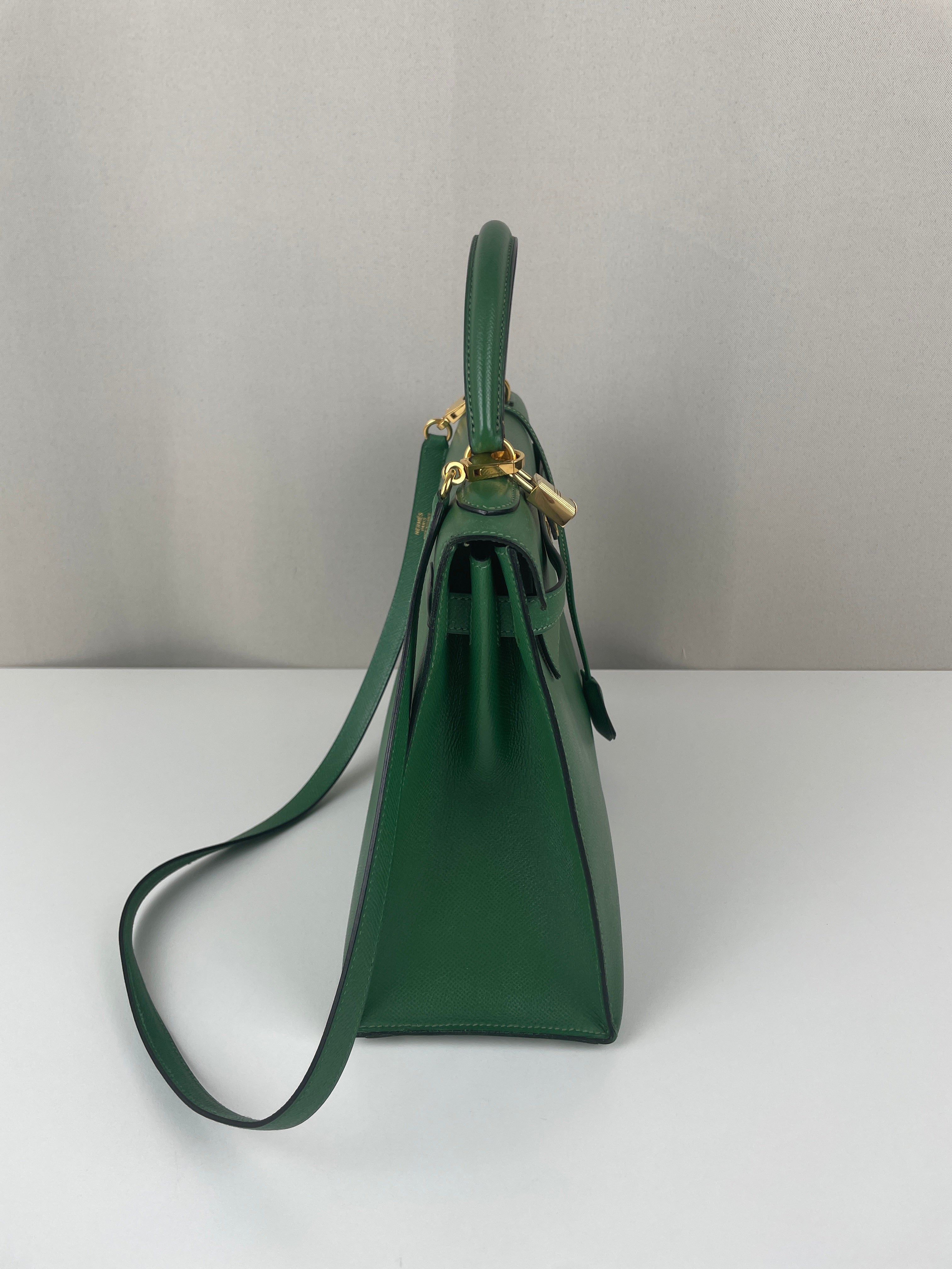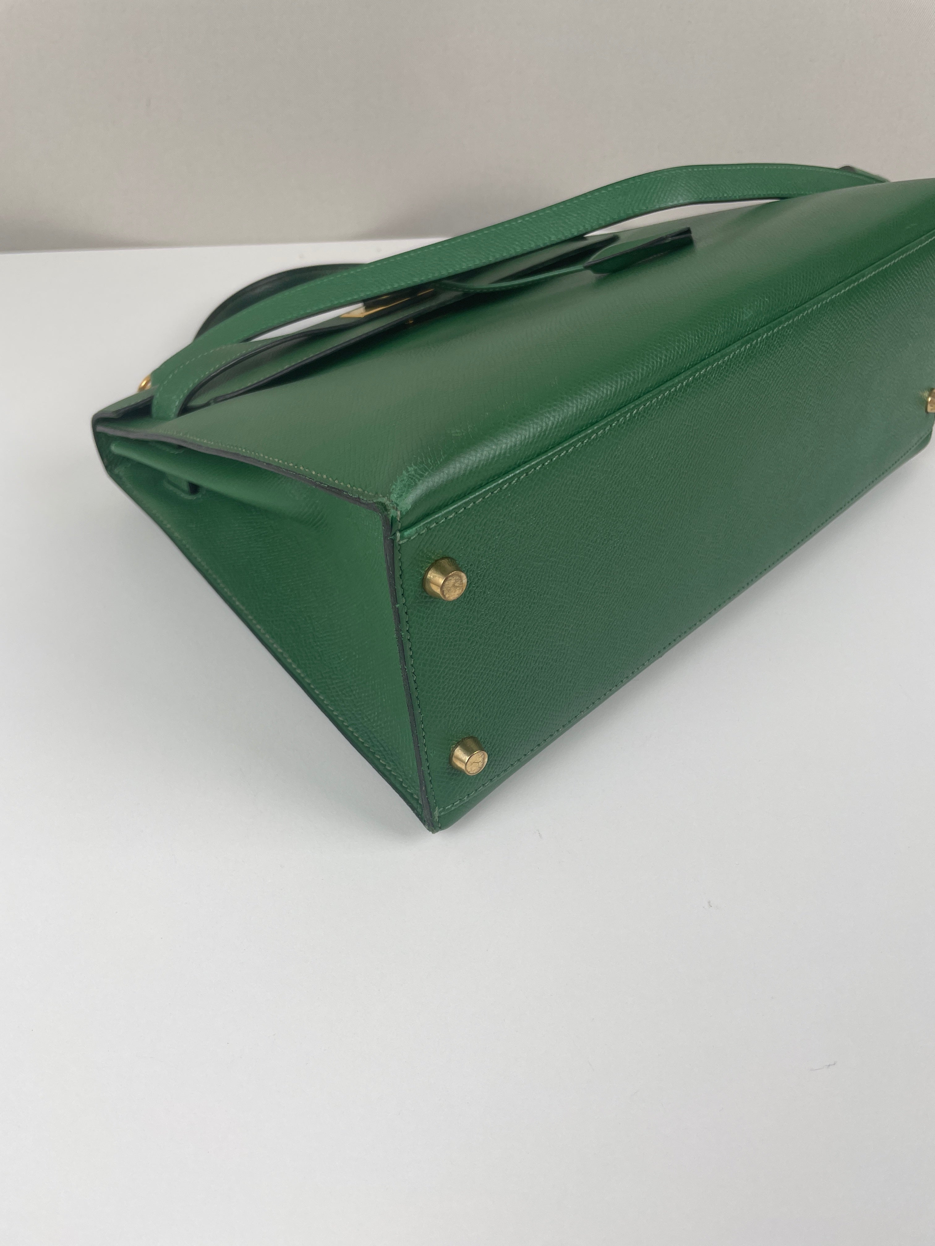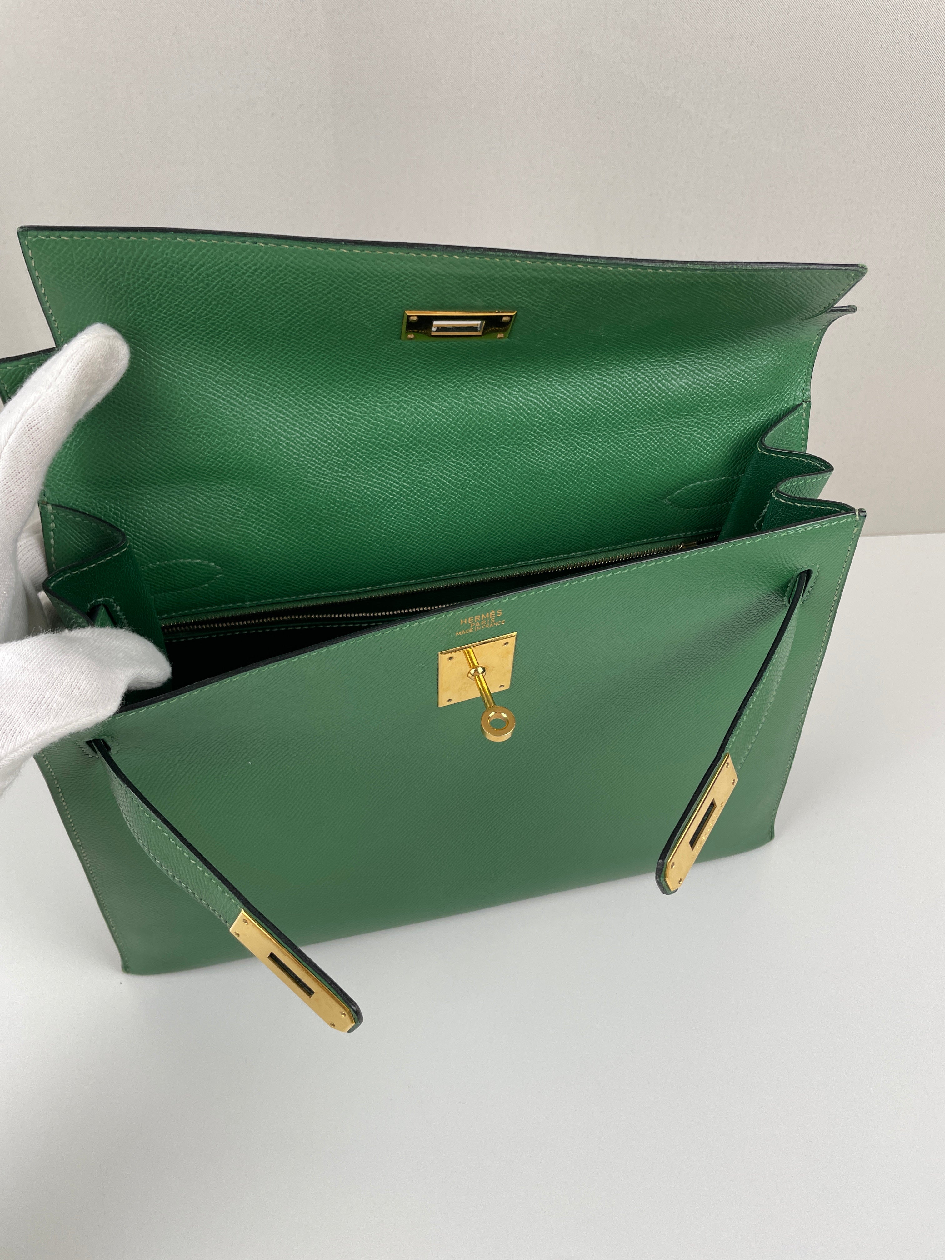 Ce sac Kelly 32 Hermès est en bon / très bon état. Il est de couleur Vert Bengal, un beau vert. Réalisé en cuir Courchevel, très proche du cuir epsom. Le sac date de 1997. Le cuir est en bon état, on peut voir quelques traces d'usure sur le devant au dessus de la fermeture du sac. C'est tout à fait normal sur un sac de 1997, il a 28 ans. L'intérieur est en très bon état. La bandoulière est en très bon état avec seulement des signes d'usure mineurs. Les coins sont un peu frottés. Il est livré avec un dustbag, un cadenas et une clé, un certificat Entrupy et notre certificat d'authenticité. Voir les photos.
