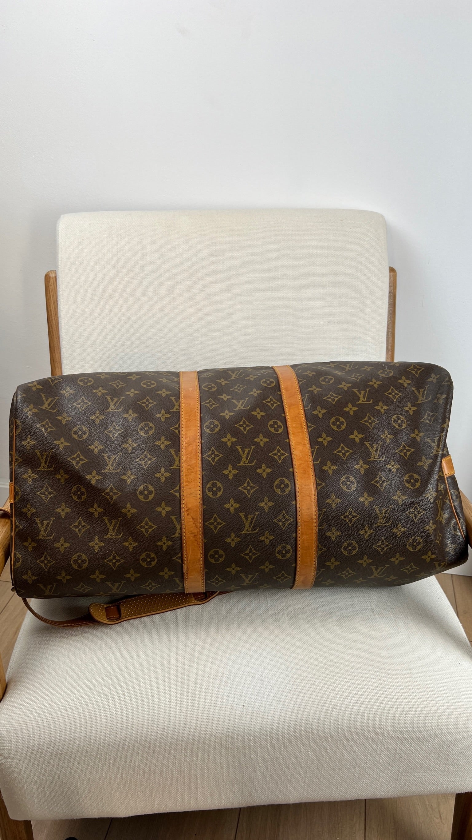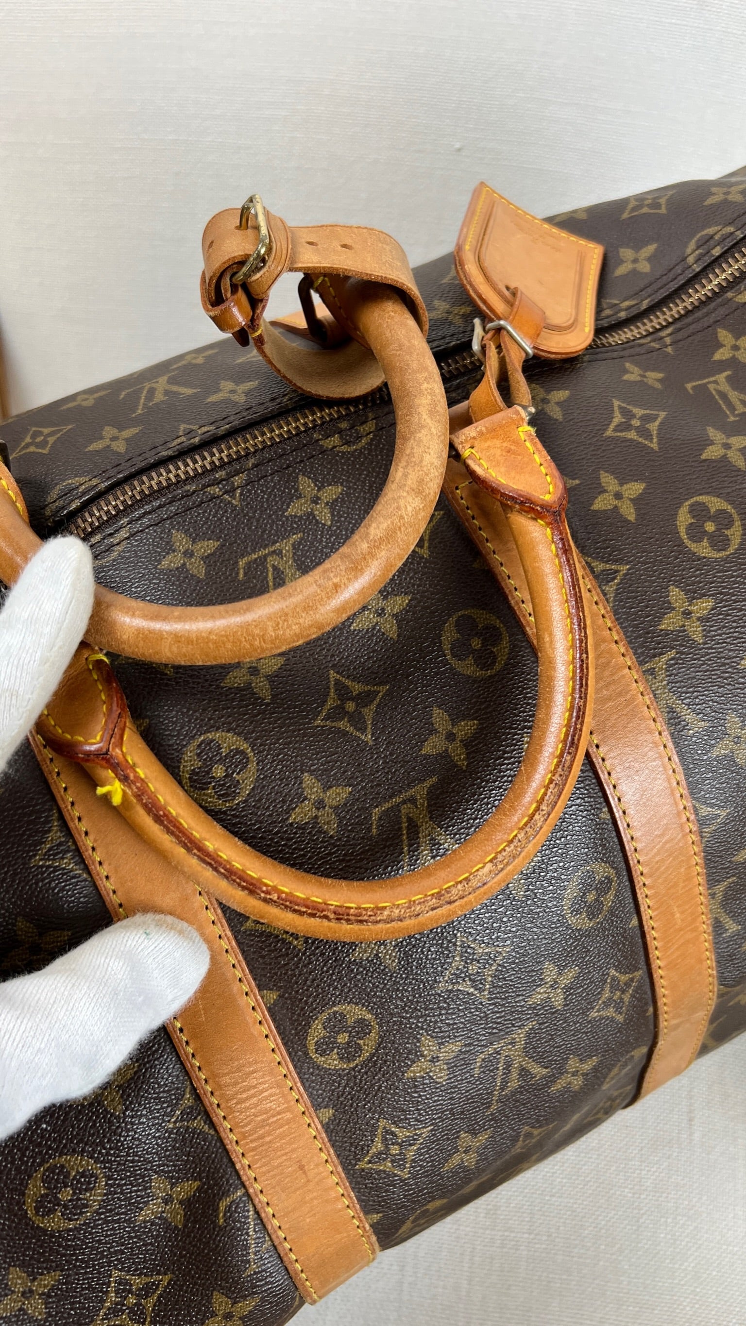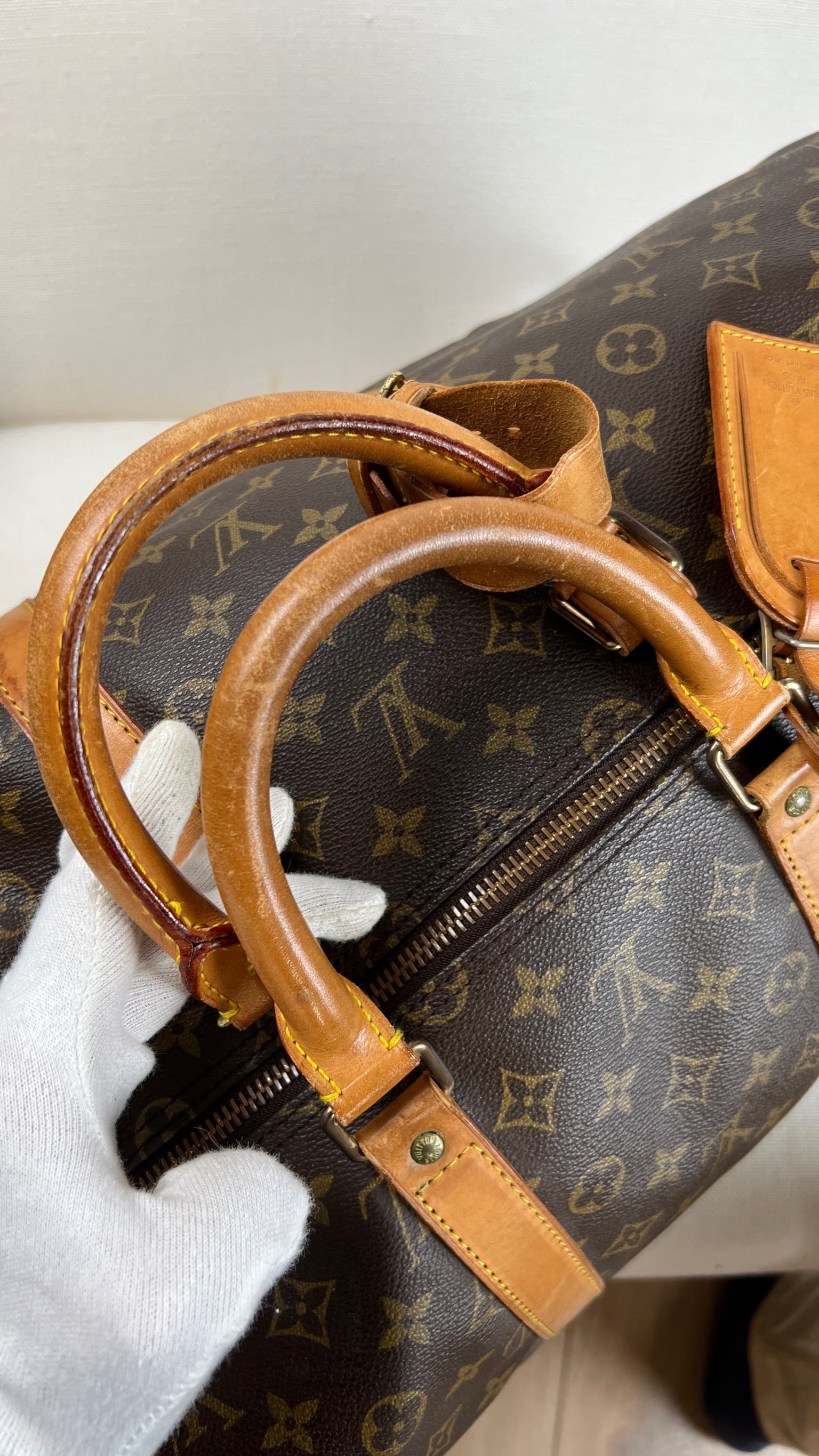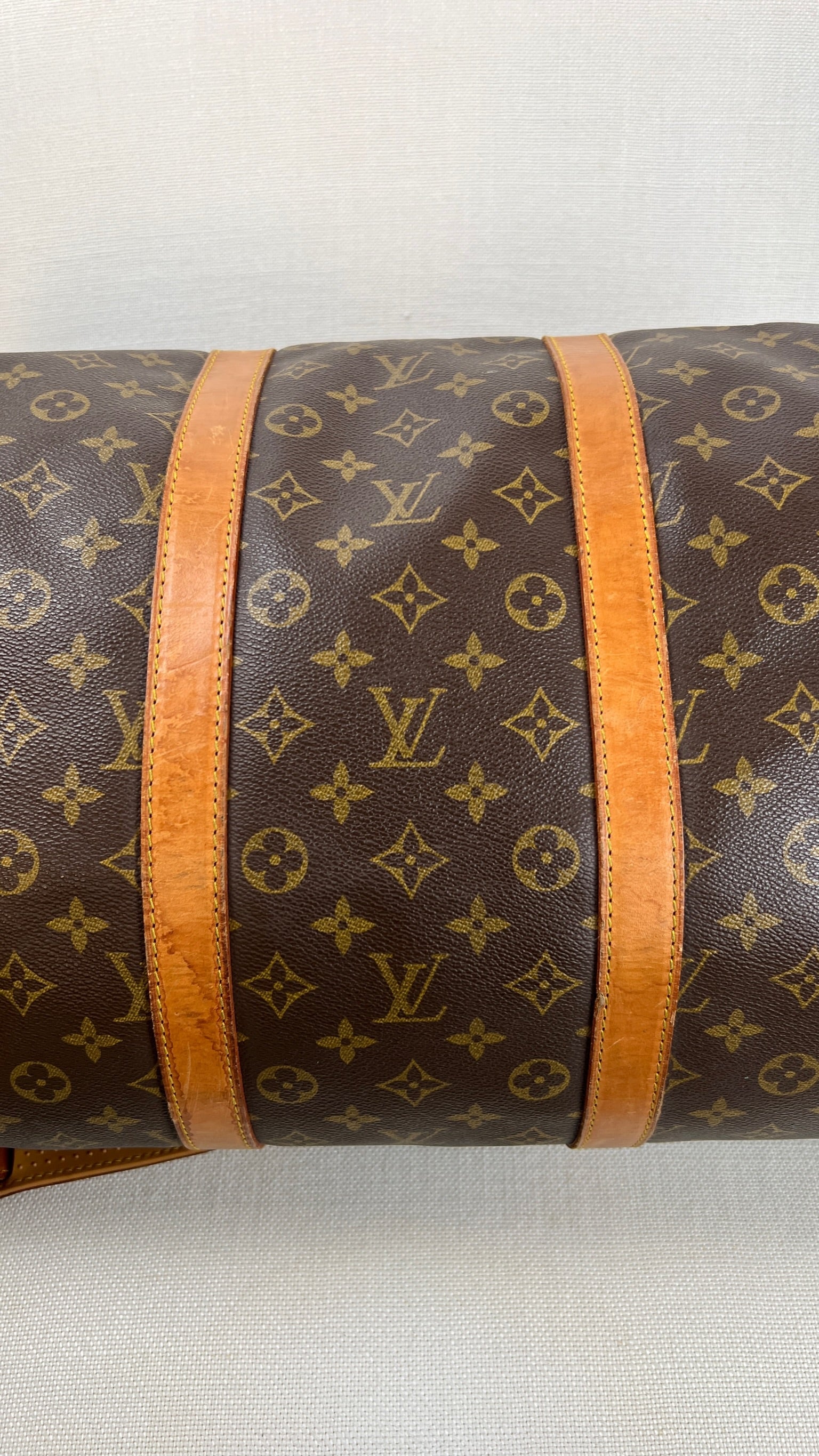 Ce Louis Vuitton Keepall 55 est en bon état. Le cuir est tanné et le fond présente de légères traces d'usure. La toile est en très bon état. Les coins sont un peu éraflés. L'intérieur est en très bon état. Le matériel est usé suite à une utilisation normale. L'étiquette du nom a une petite tache.