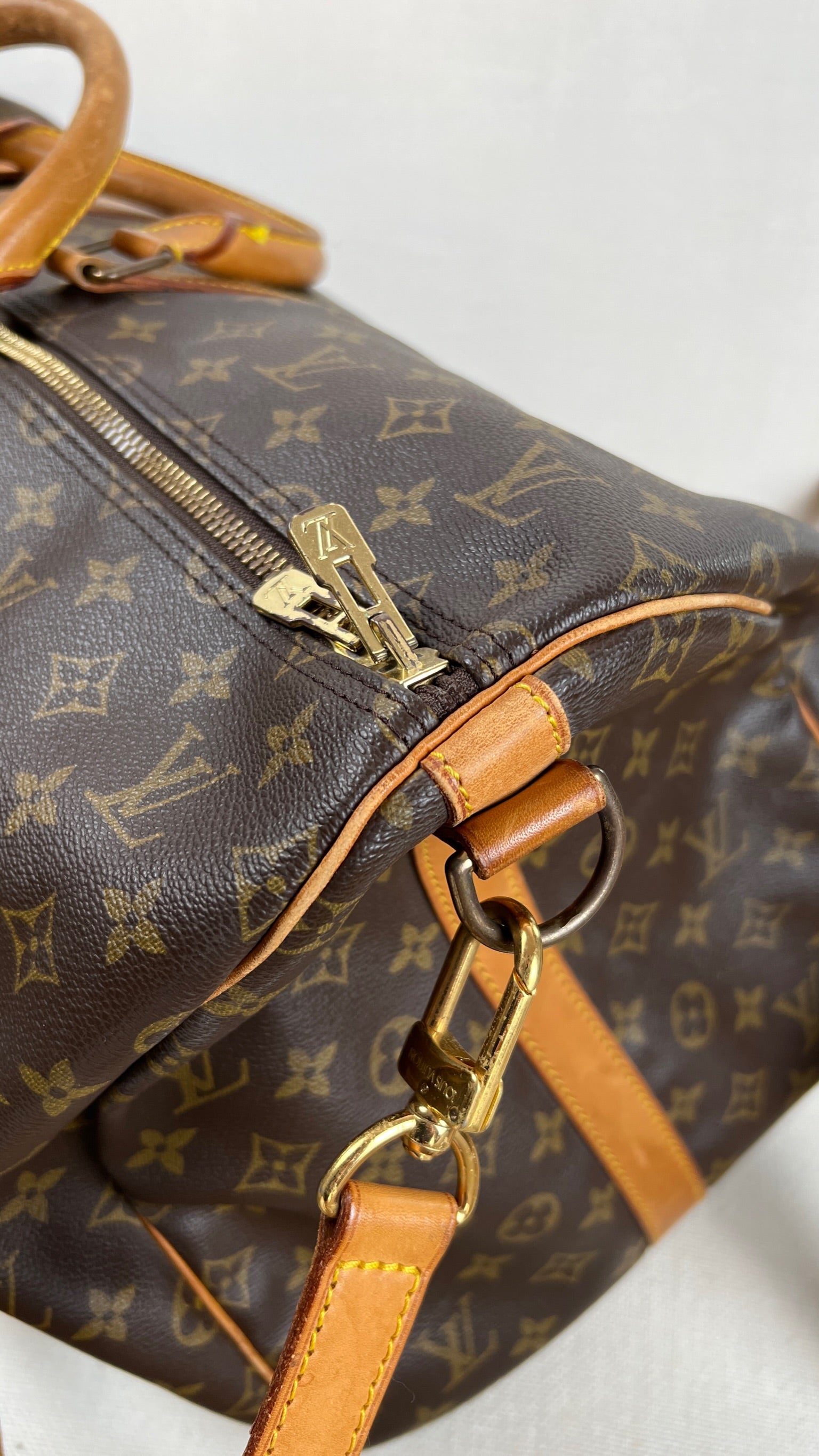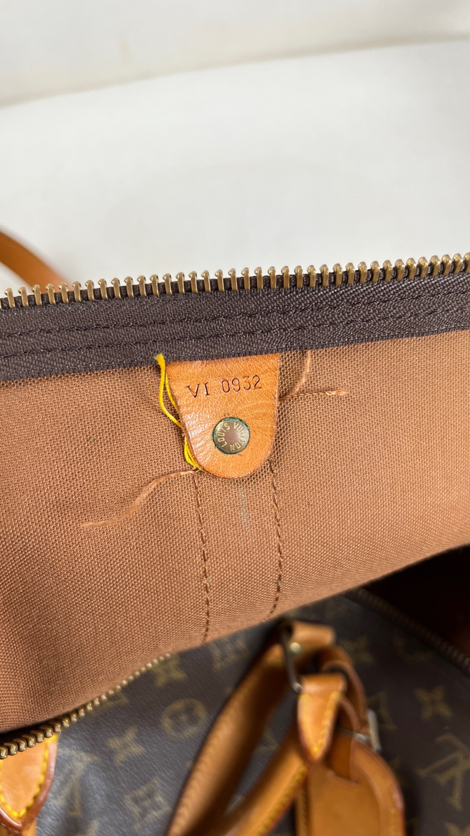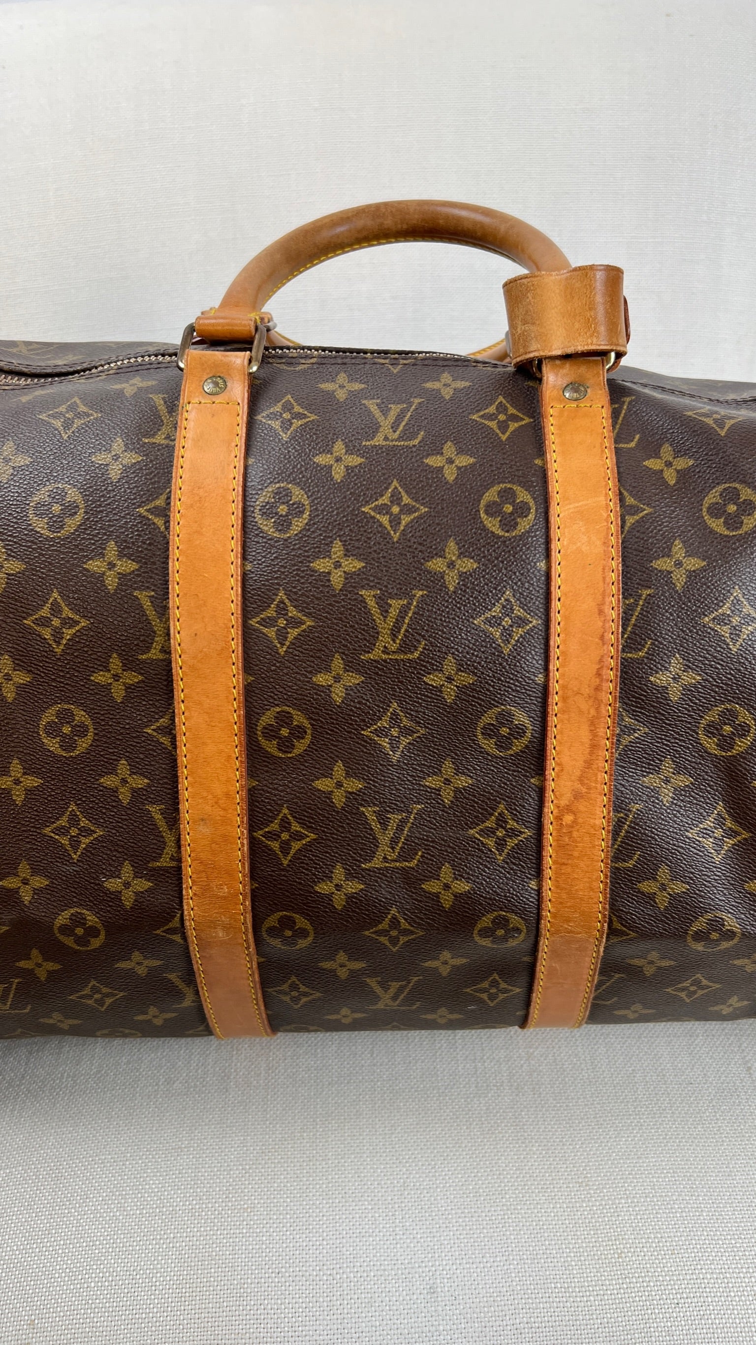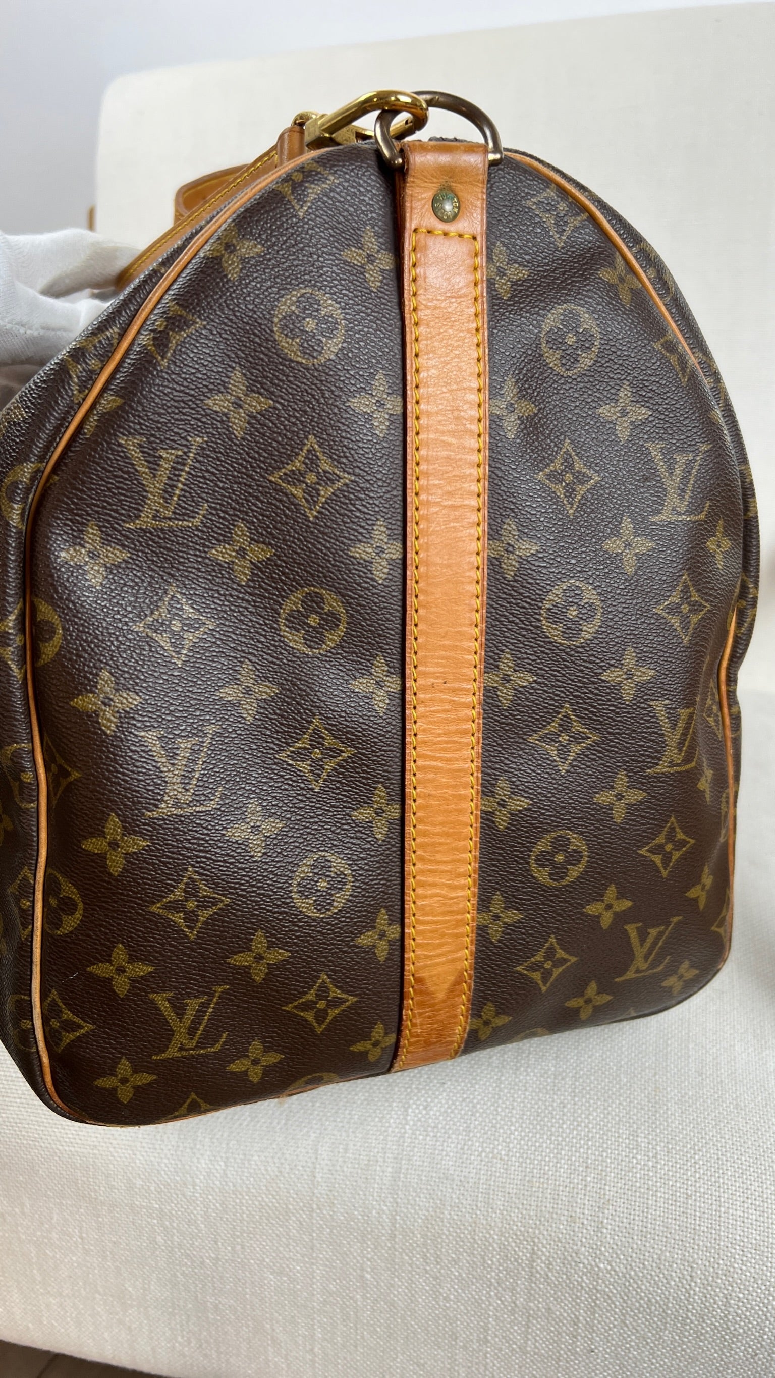 Ce Louis Vuitton Keepall 55 est en bon état. Le cuir est tanné et le fond présente de légères traces d'usure. La toile est en très bon état. Les coins sont un peu éraflés. L'intérieur est en très bon état. Le matériel est usé suite à une utilisation normale. L'étiquette du nom a une petite tache.
