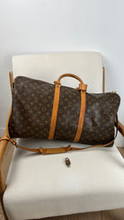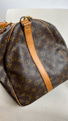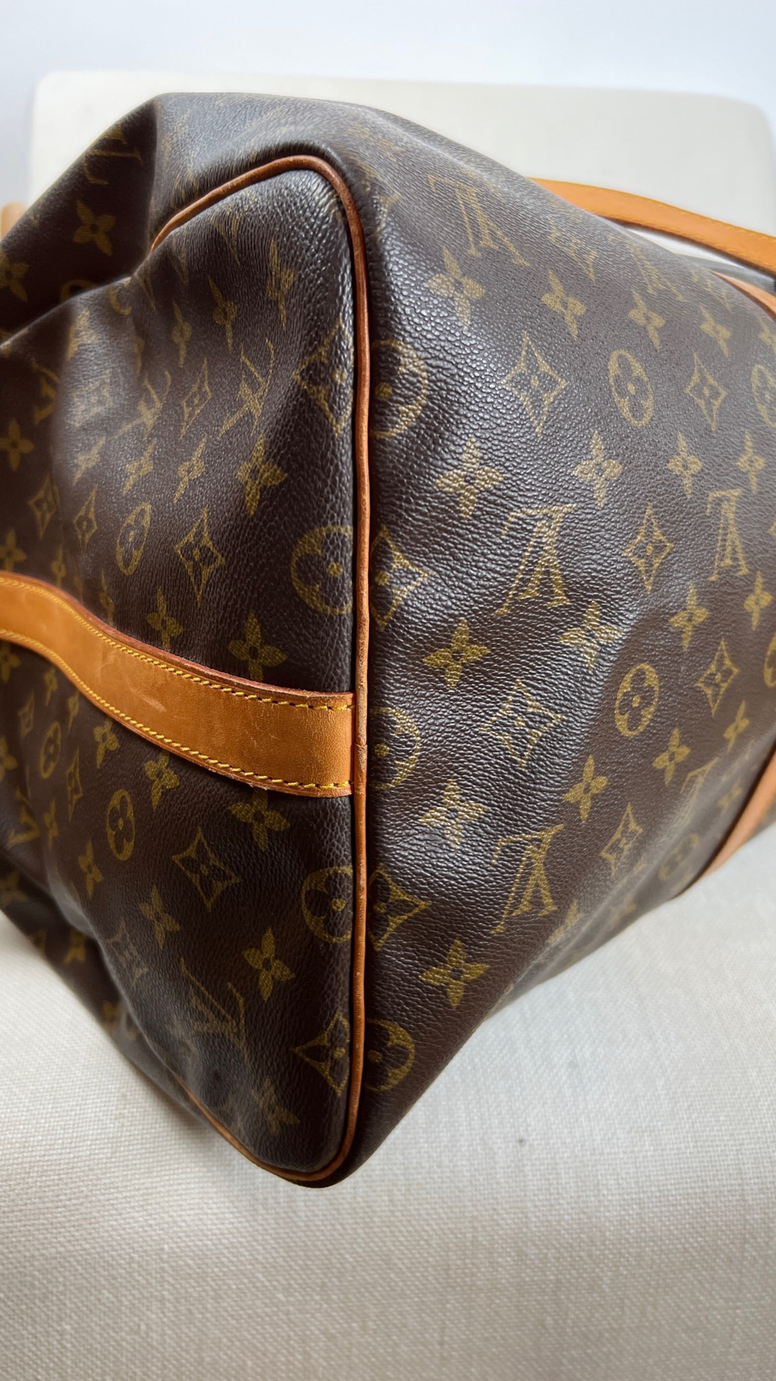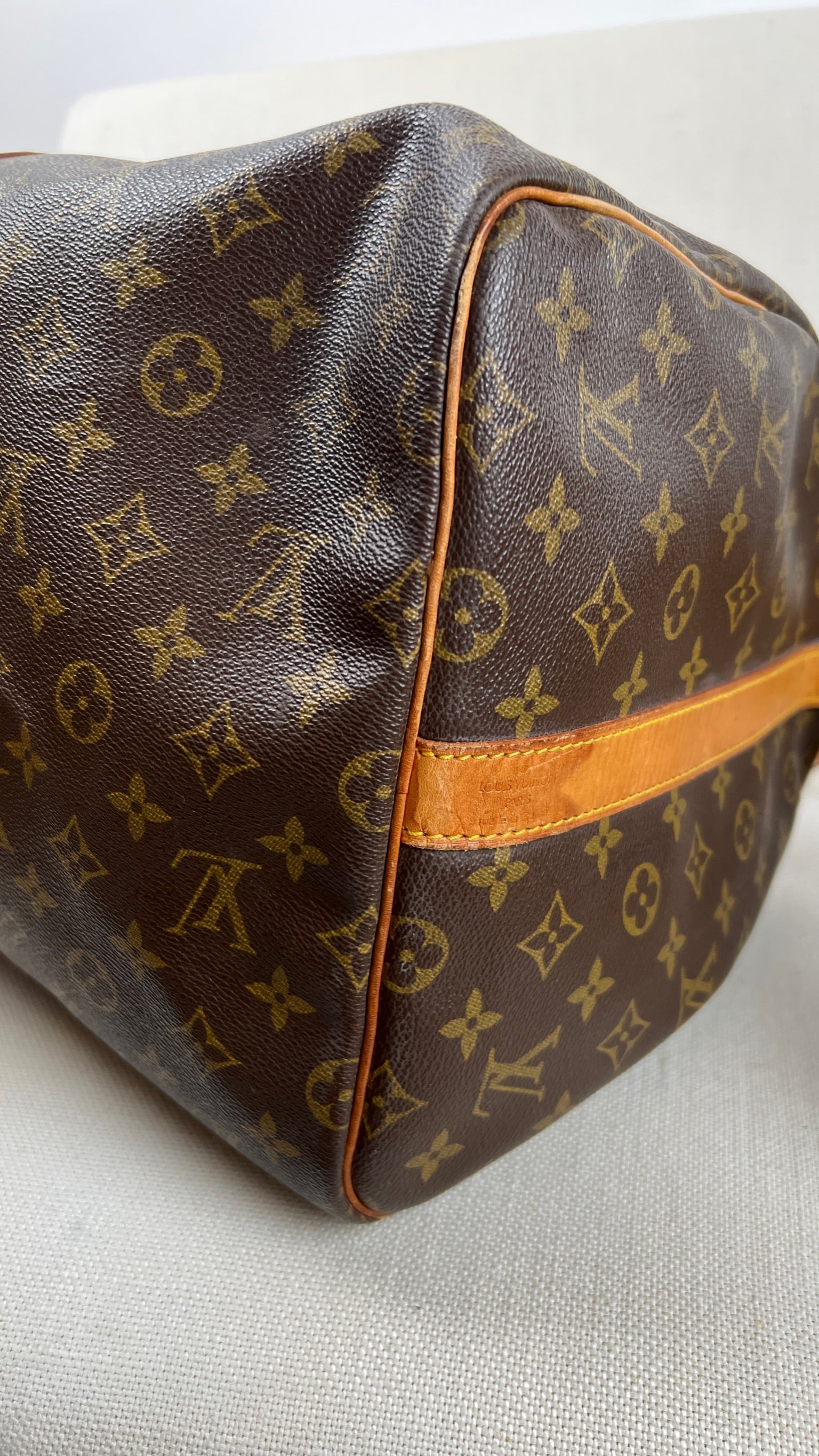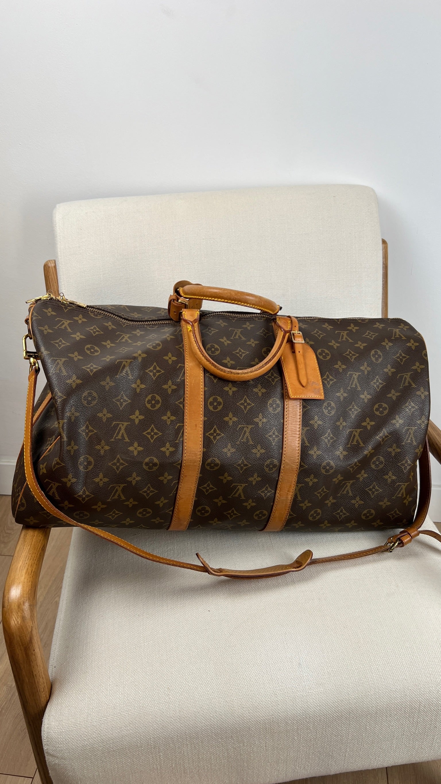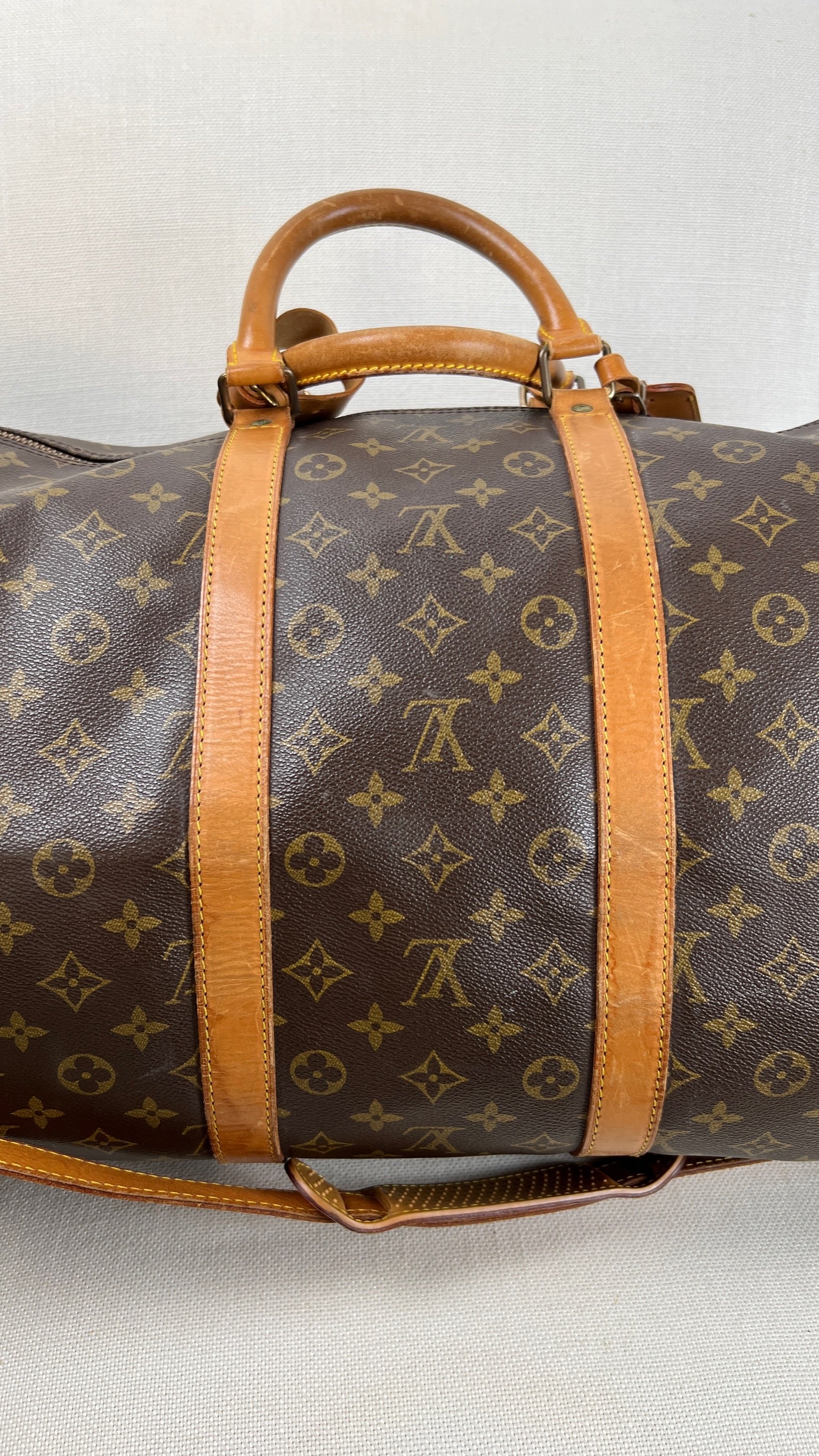 Ce Louis Vuitton Keepall 55 est en bon état. Le cuir est tanné et le fond présente de légères traces d'usure. La toile est en très bon état. Les coins sont un peu éraflés. L'intérieur est en très bon état. Le matériel est usé suite à une utilisation normale. L'étiquette du nom a une petite tache.
