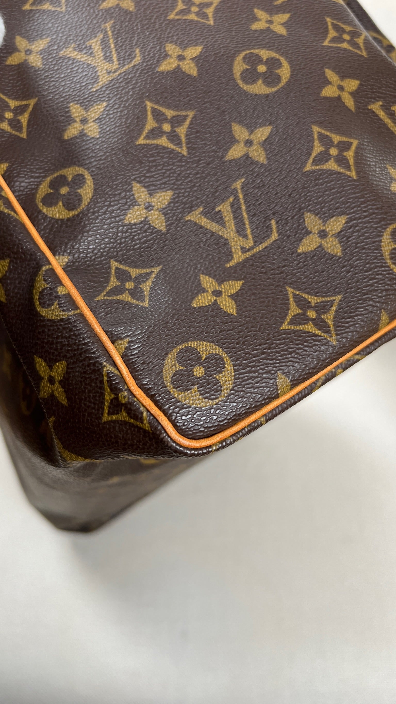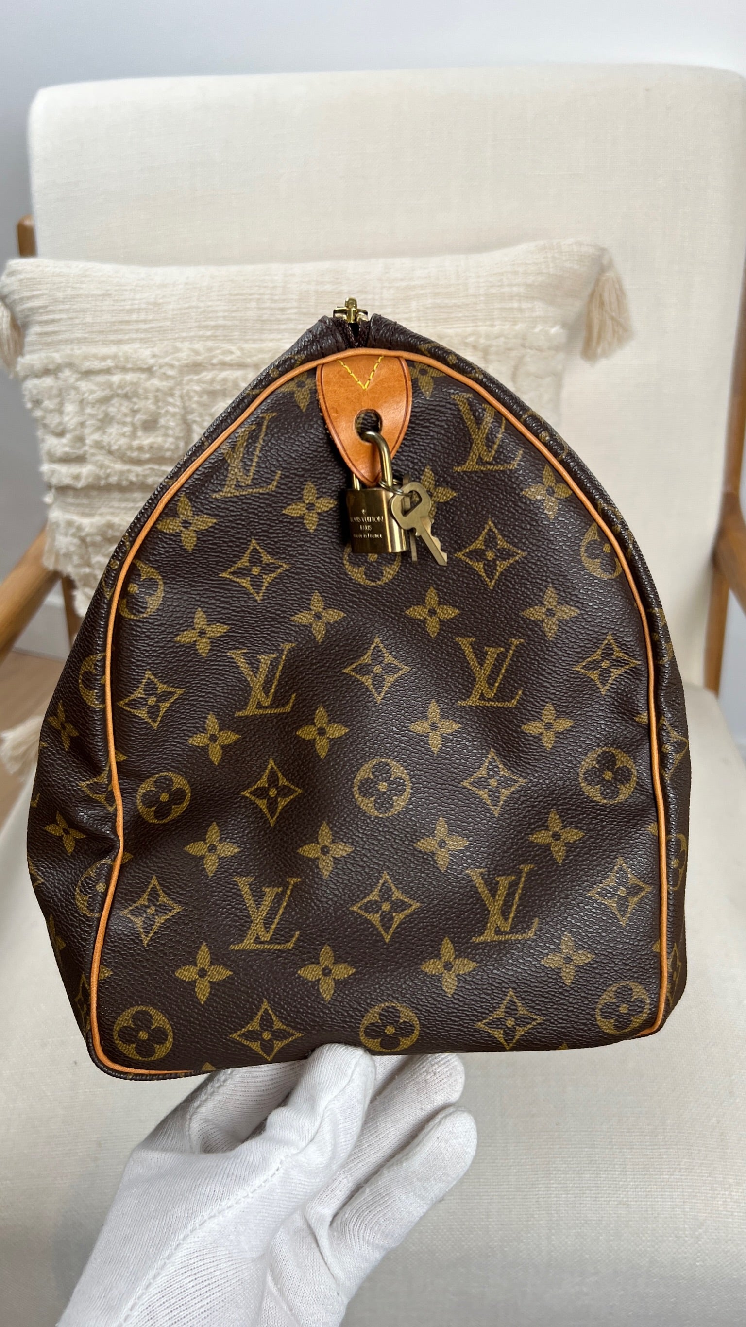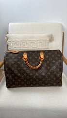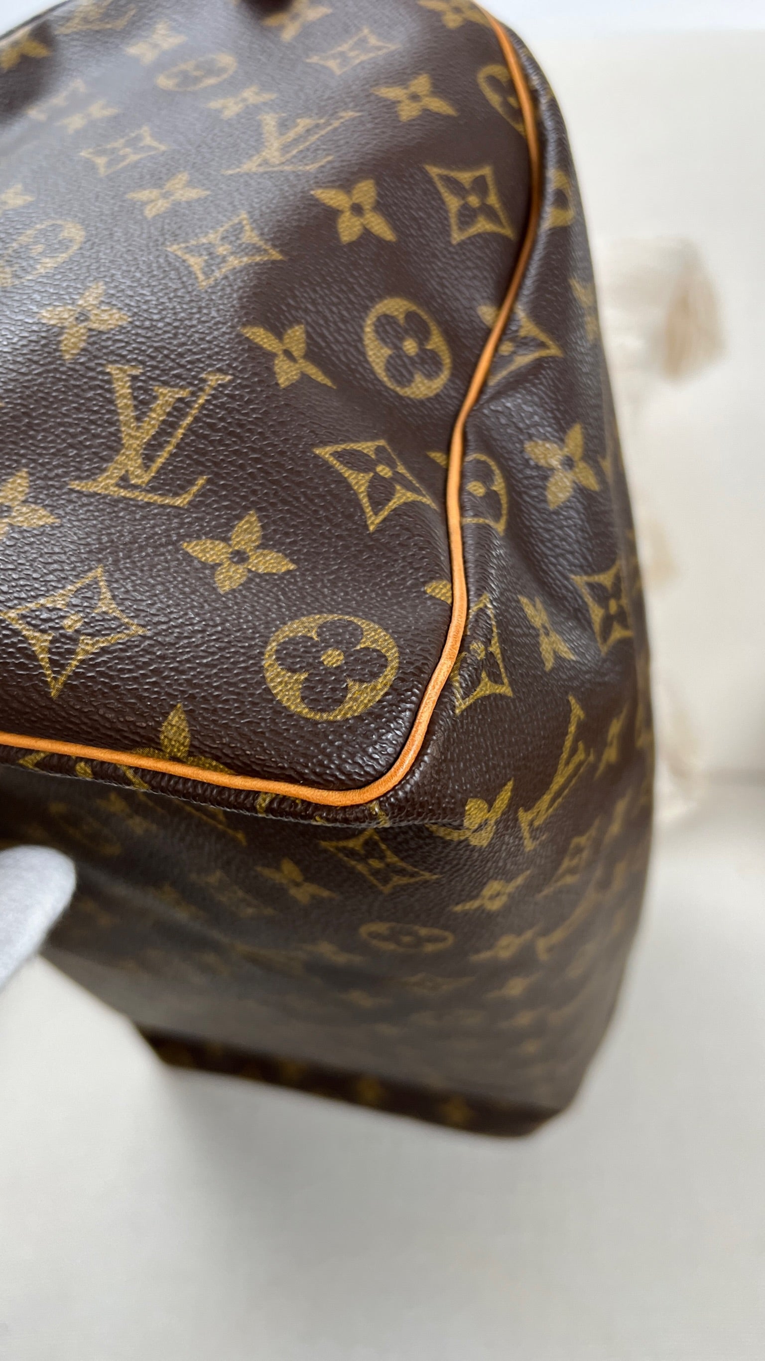 Ce sac Louis Vuitton Monogram Speedy 40 est en très bon état. La toile est en très bon état. L'intérieur du sac est également en très bon état, ainsi que les coins. Le matériel est usé suite à une utilisation normale.