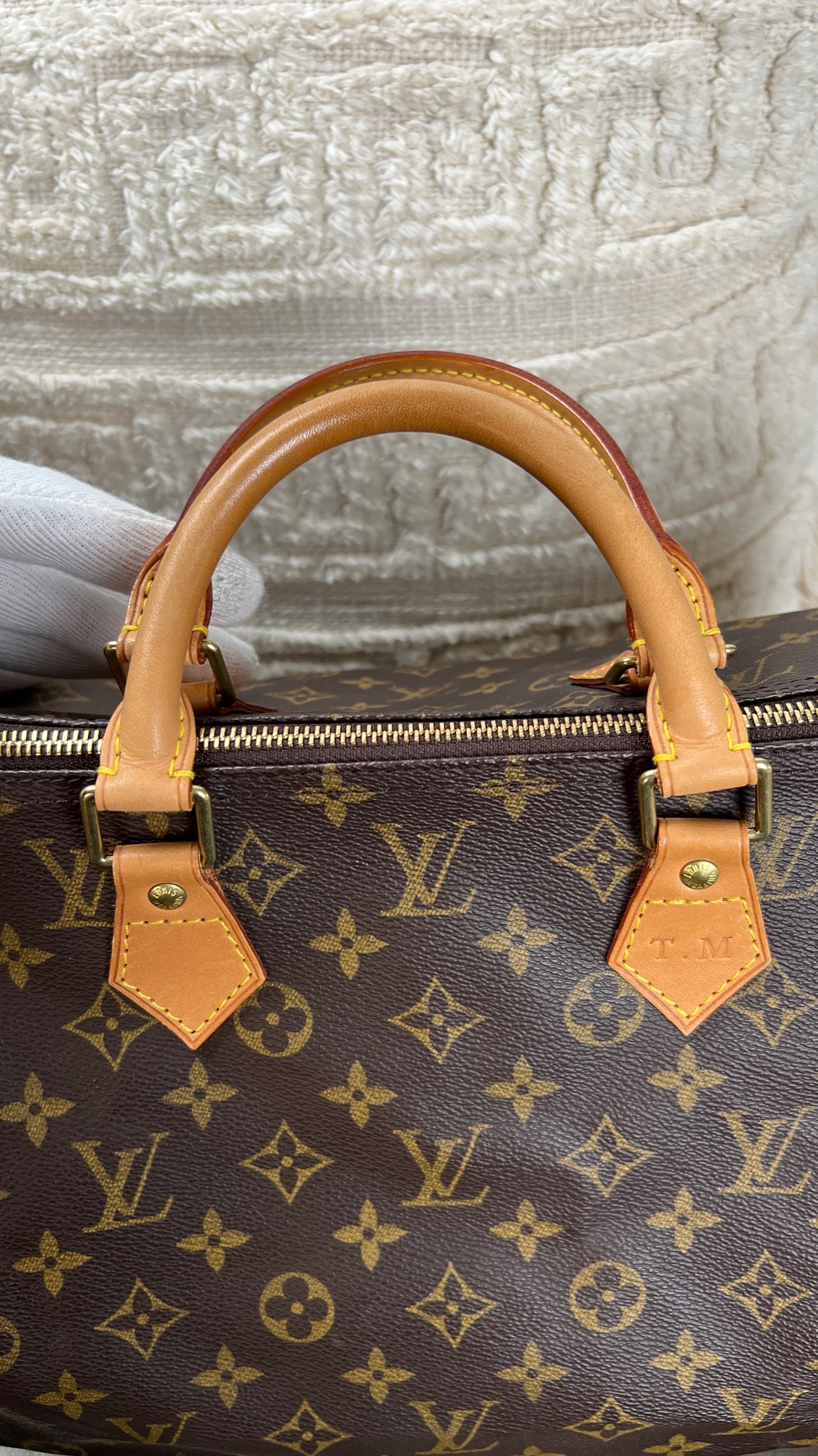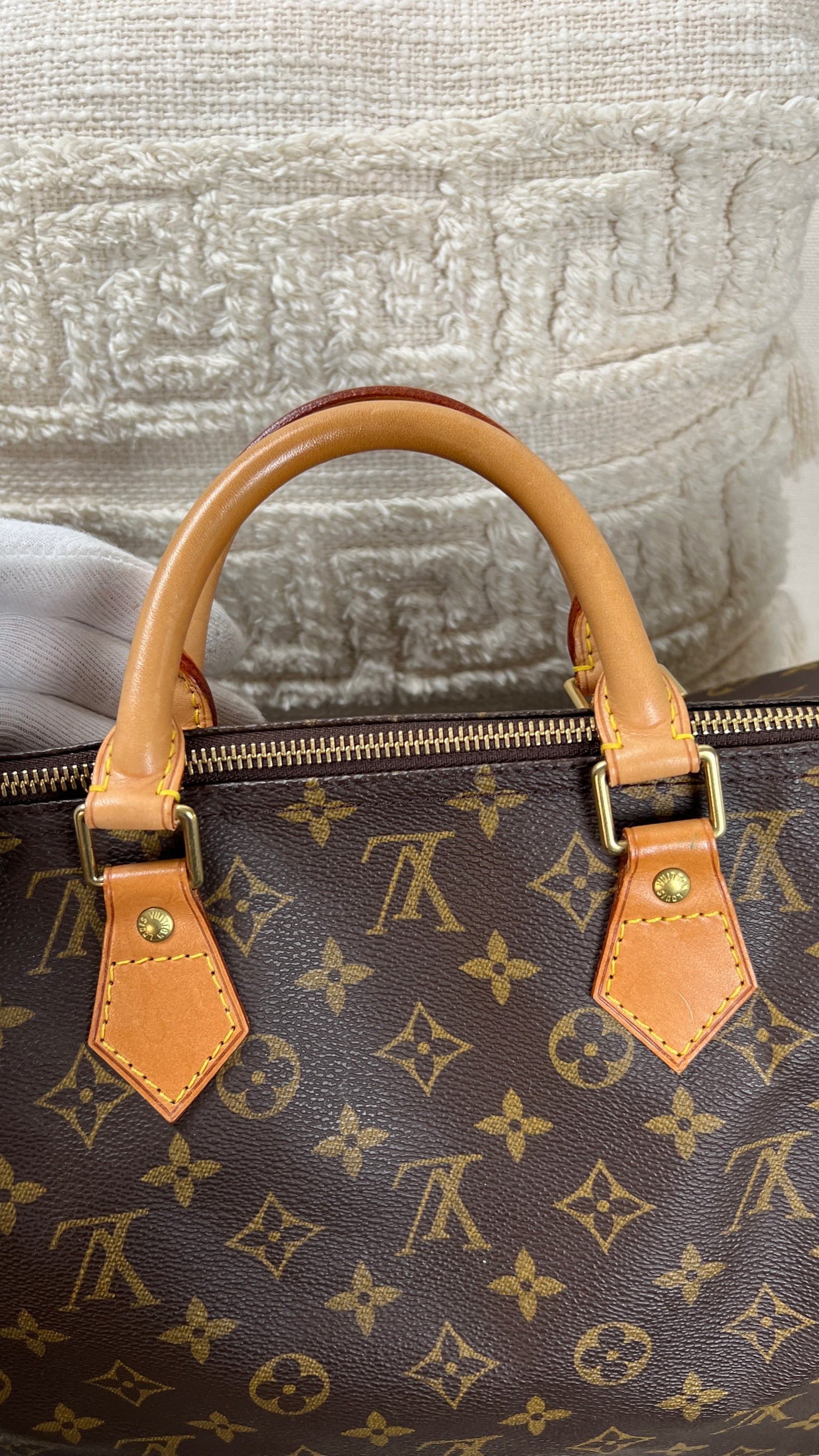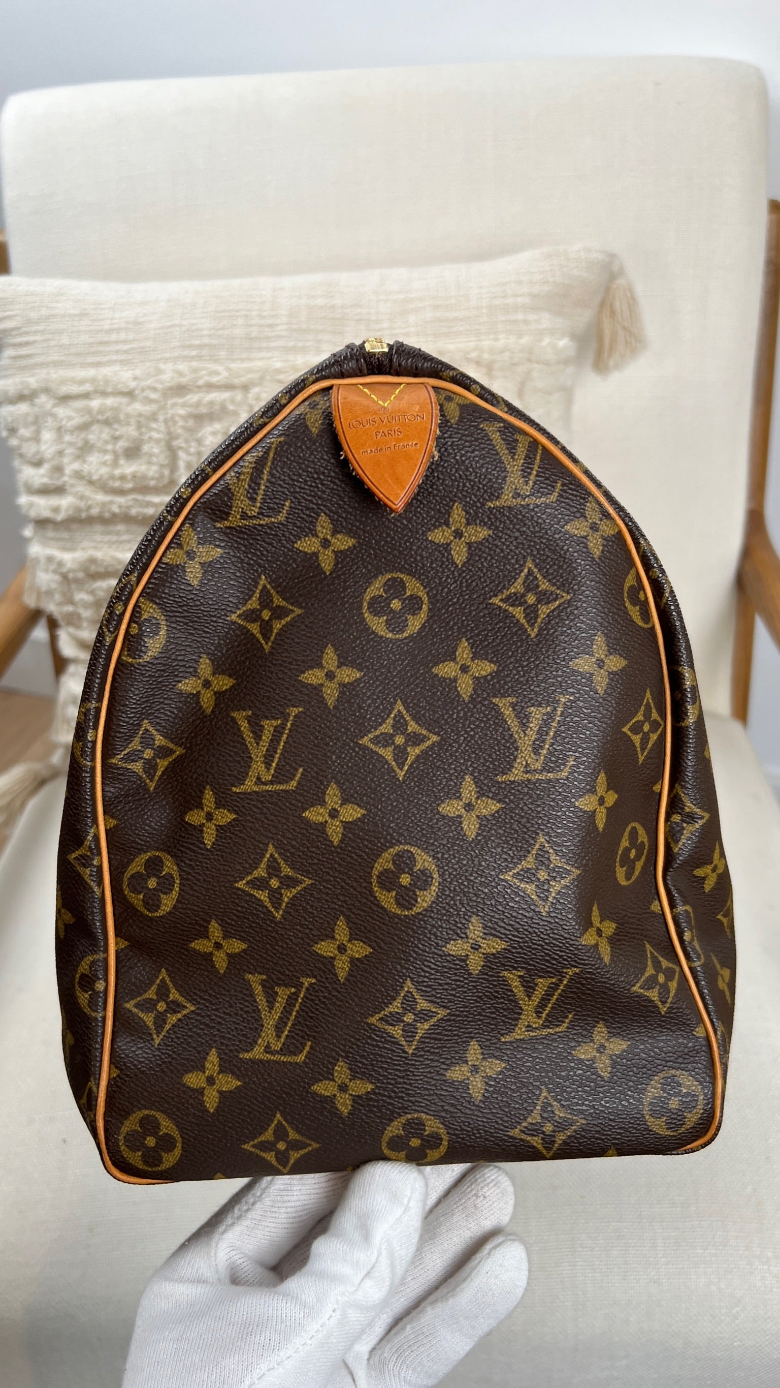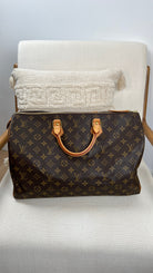 Ce sac Louis Vuitton Monogram Speedy 40 est en très bon état. La toile est en très bon état. L'intérieur du sac est également en très bon état, ainsi que les coins. Le matériel est usé suite à une utilisation normale.