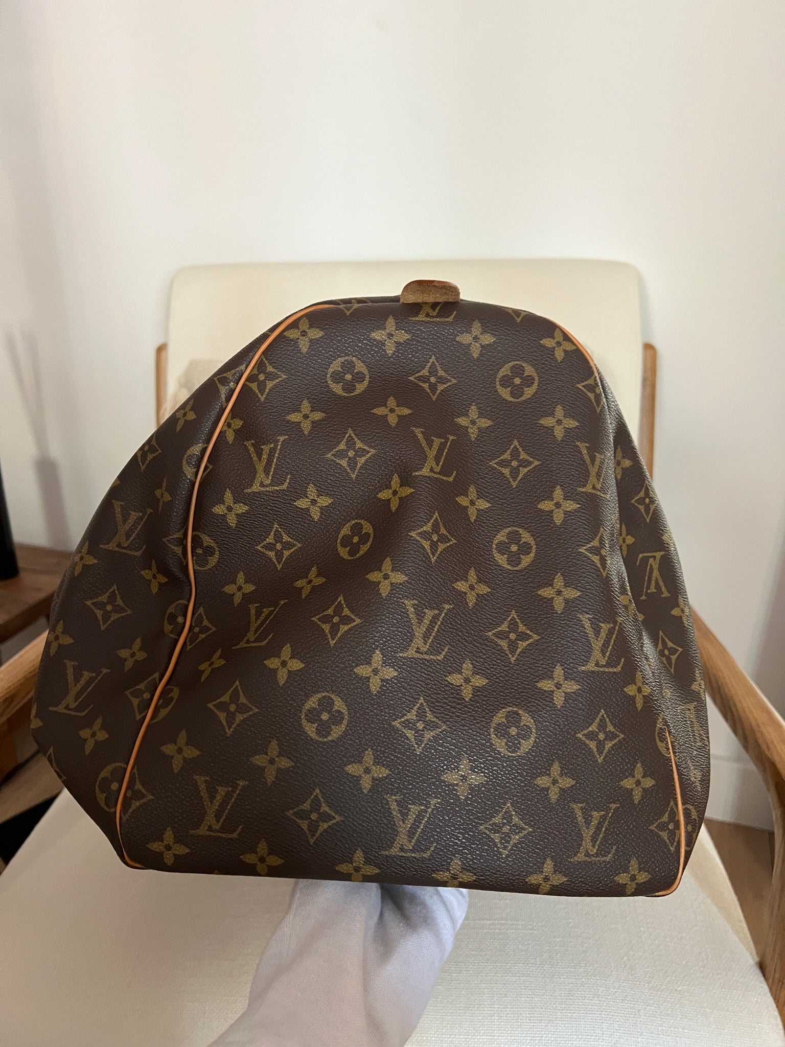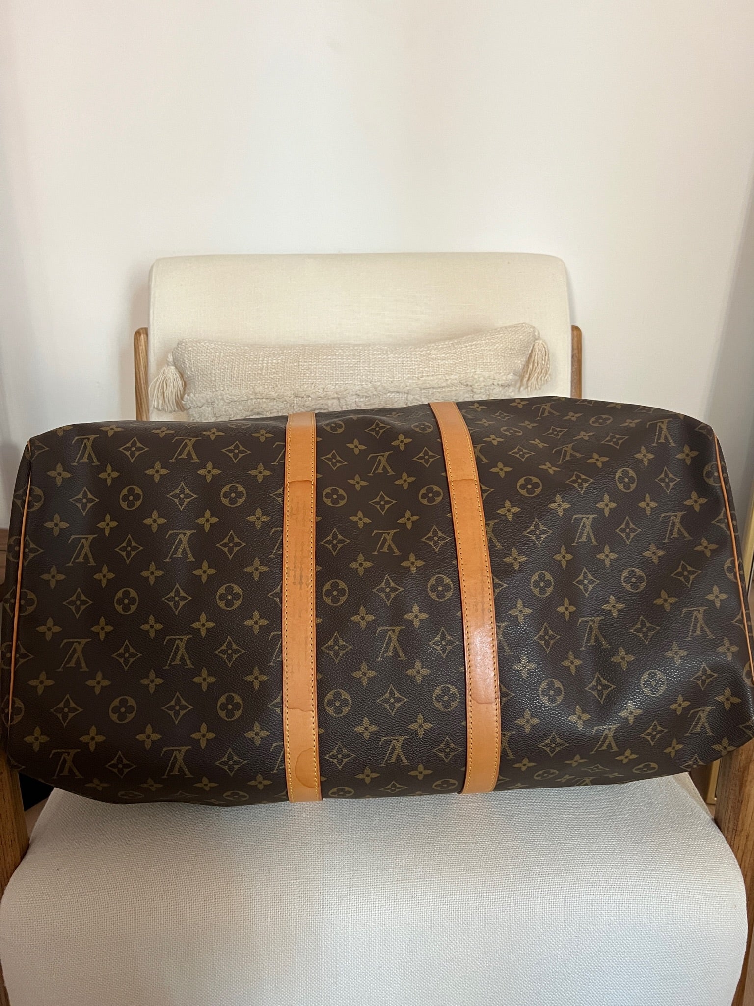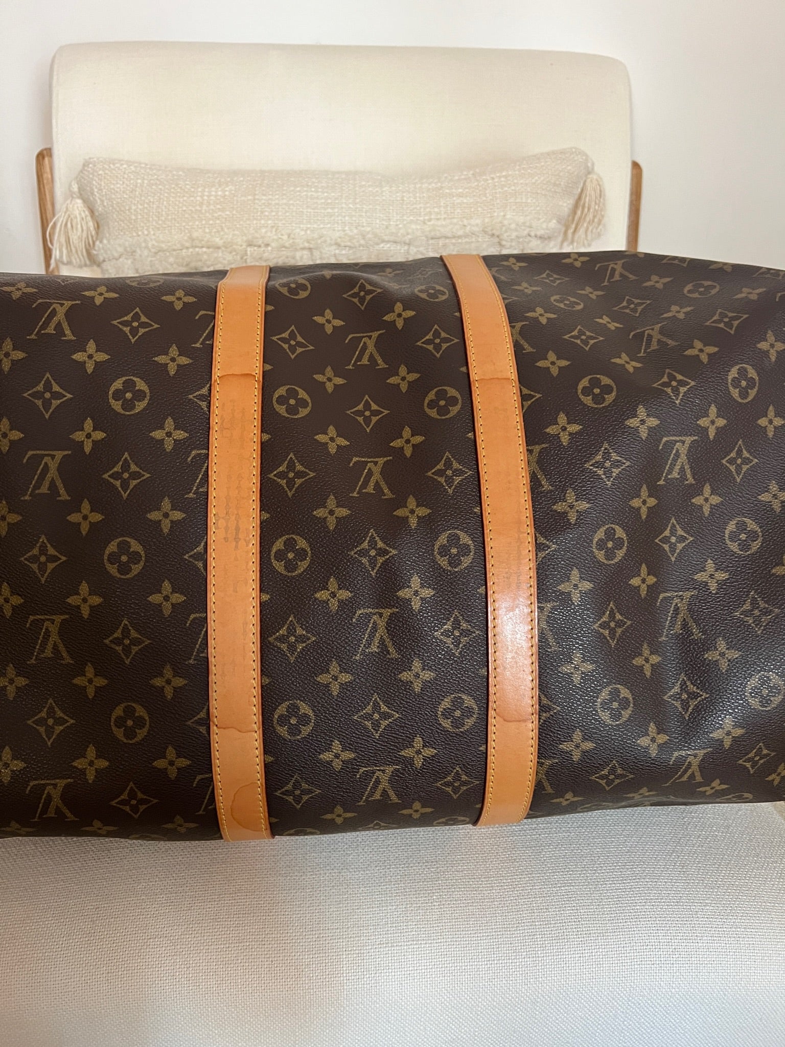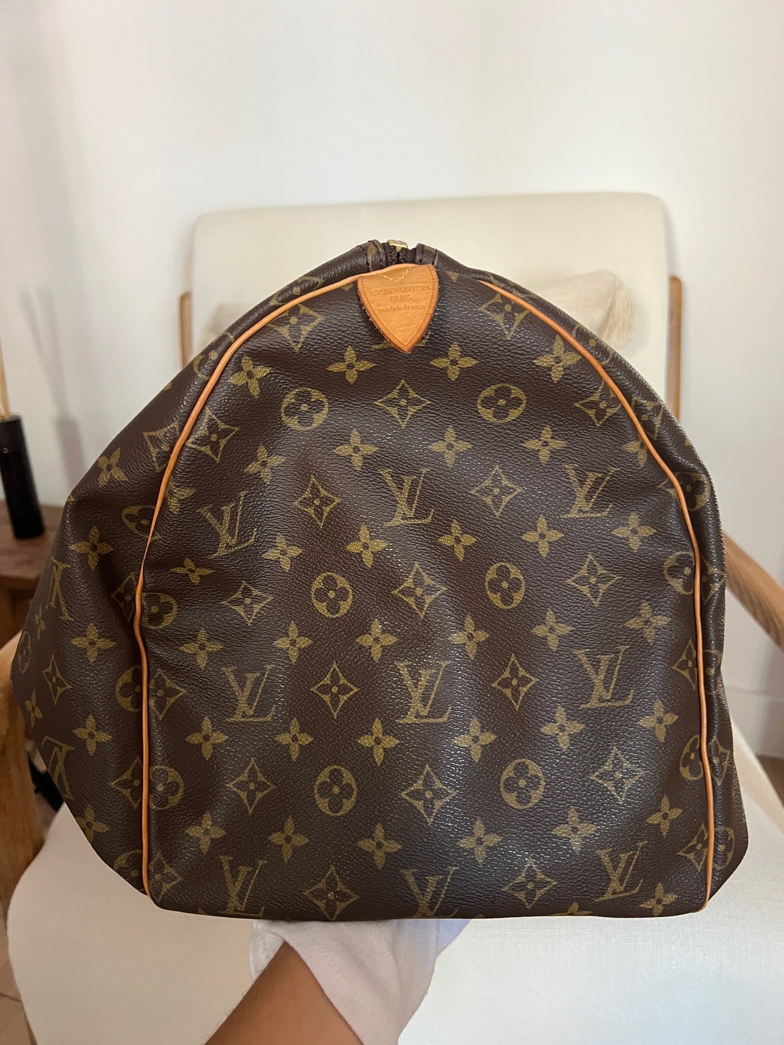 Ce sac monogramme en toile Louis Vuitton Keepall 55 est en bon état. La toile est en très bon état. Les coins sont en bon état. L'intérieur est également en bon état mais vous avez de petites taches. Le cuir présente des taches et quelques-unes sous le sac.