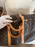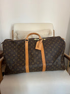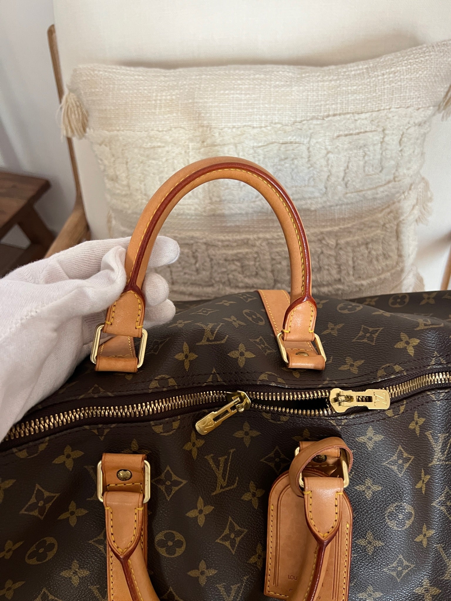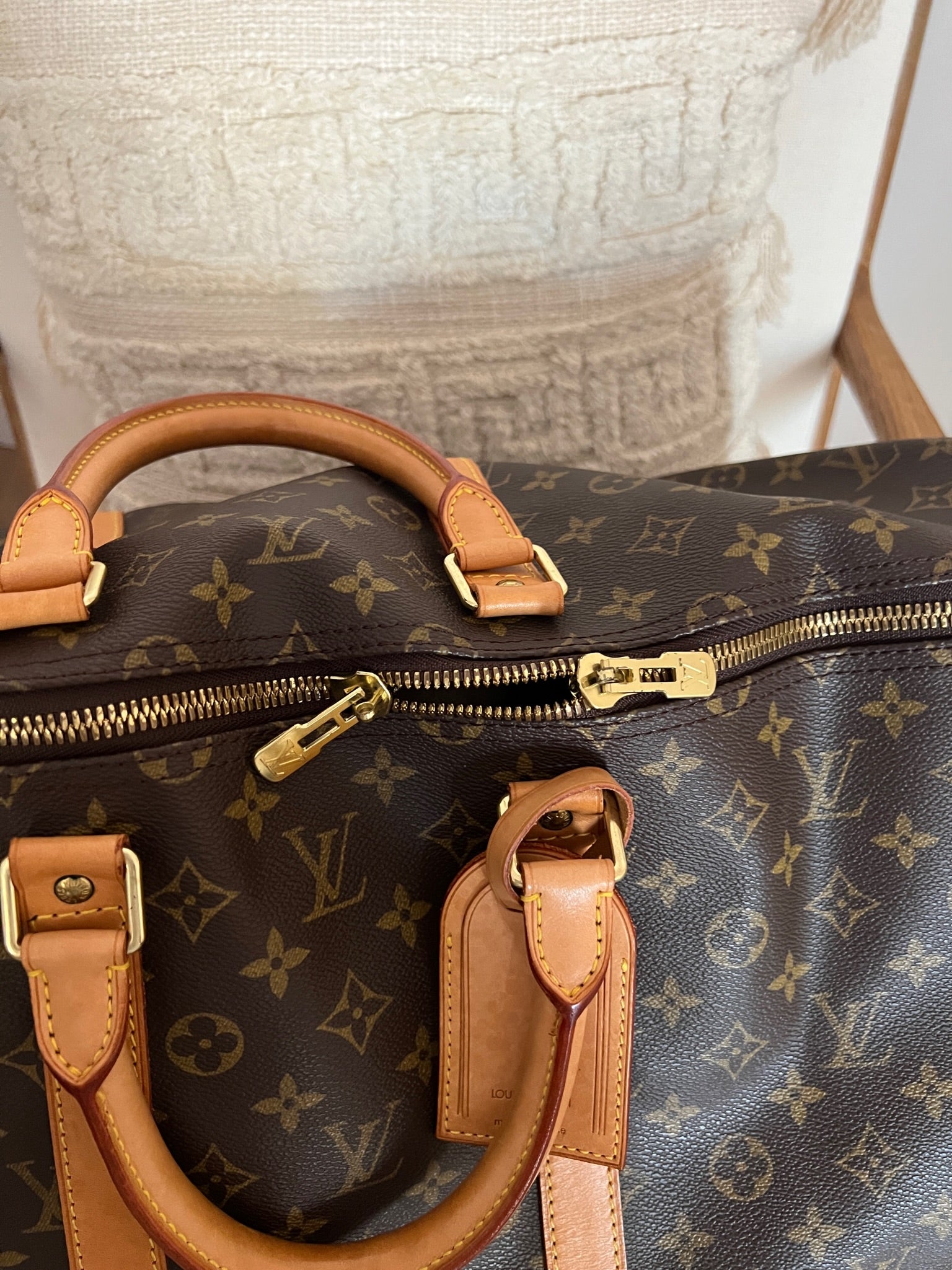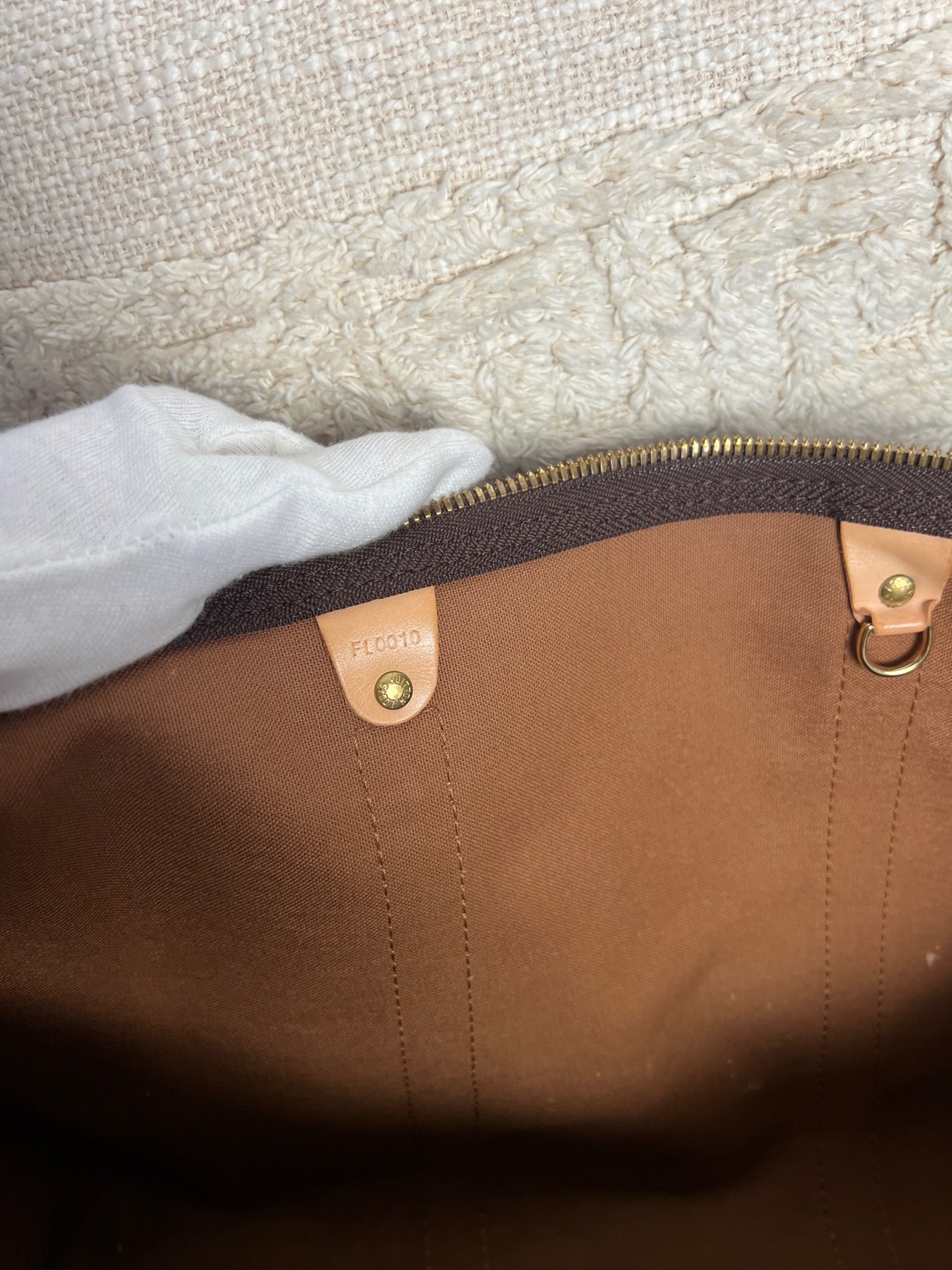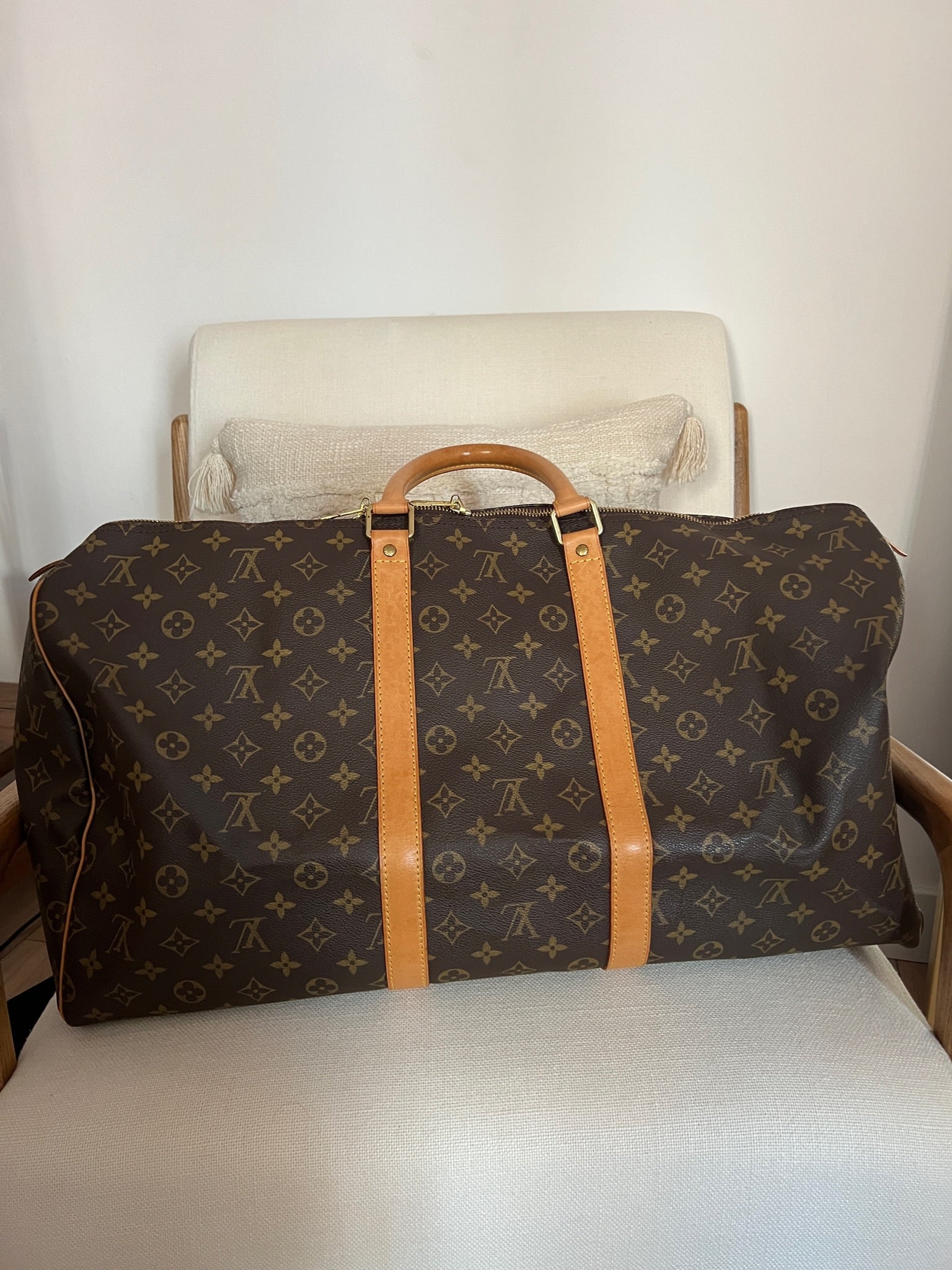 Ce sac monogramme en toile Louis Vuitton Keepall 55 est en bon état. La toile est en très bon état. Les coins sont en bon état. L'intérieur est également en bon état mais vous avez de petites taches. Le cuir présente des taches et quelques-unes sous le sac.