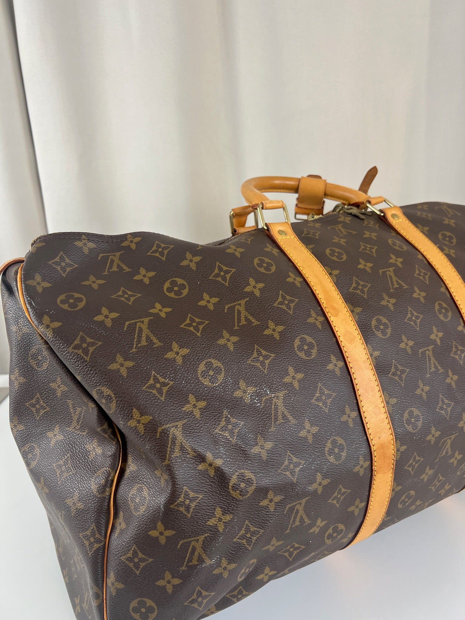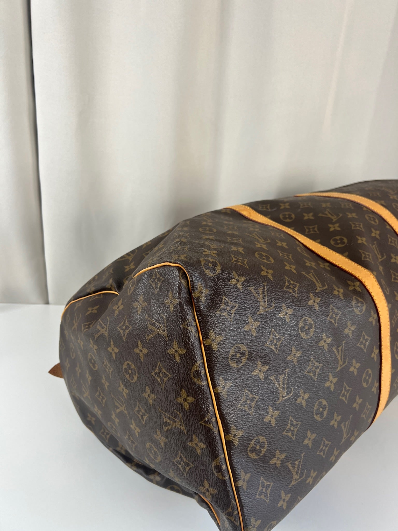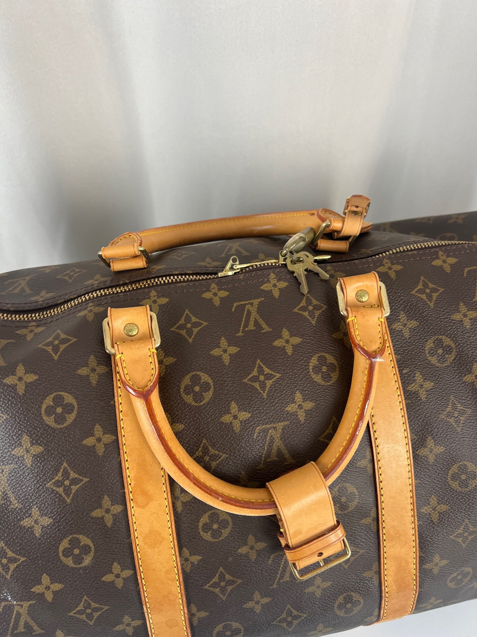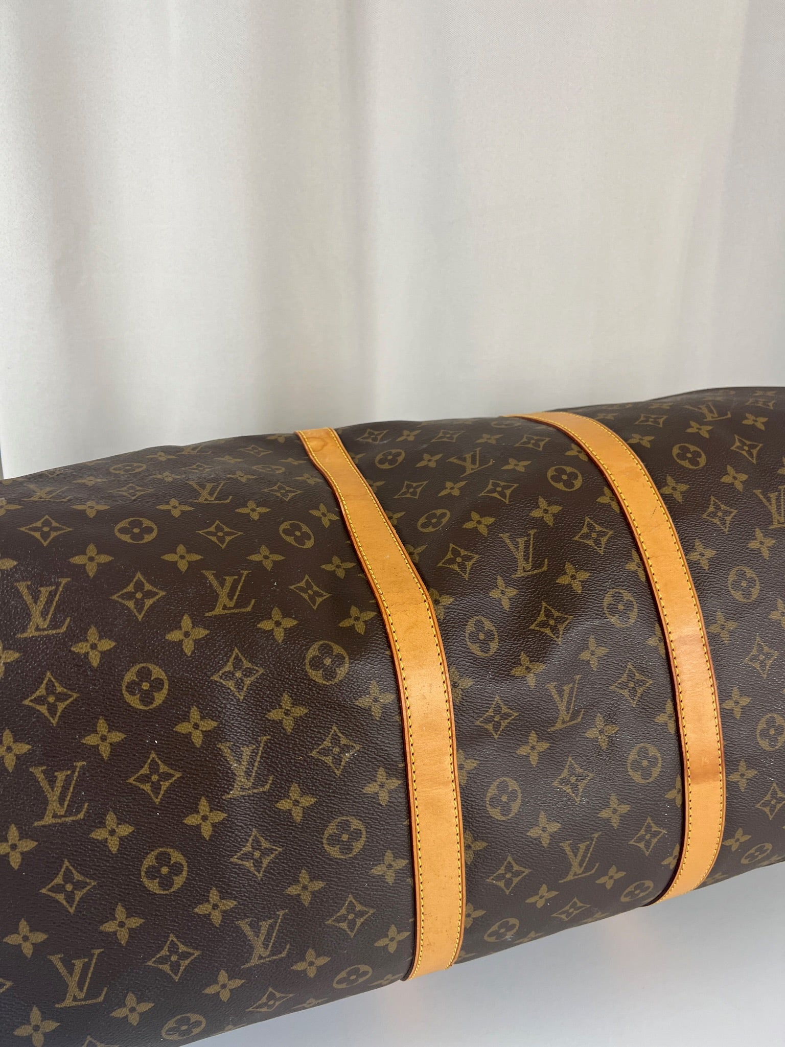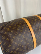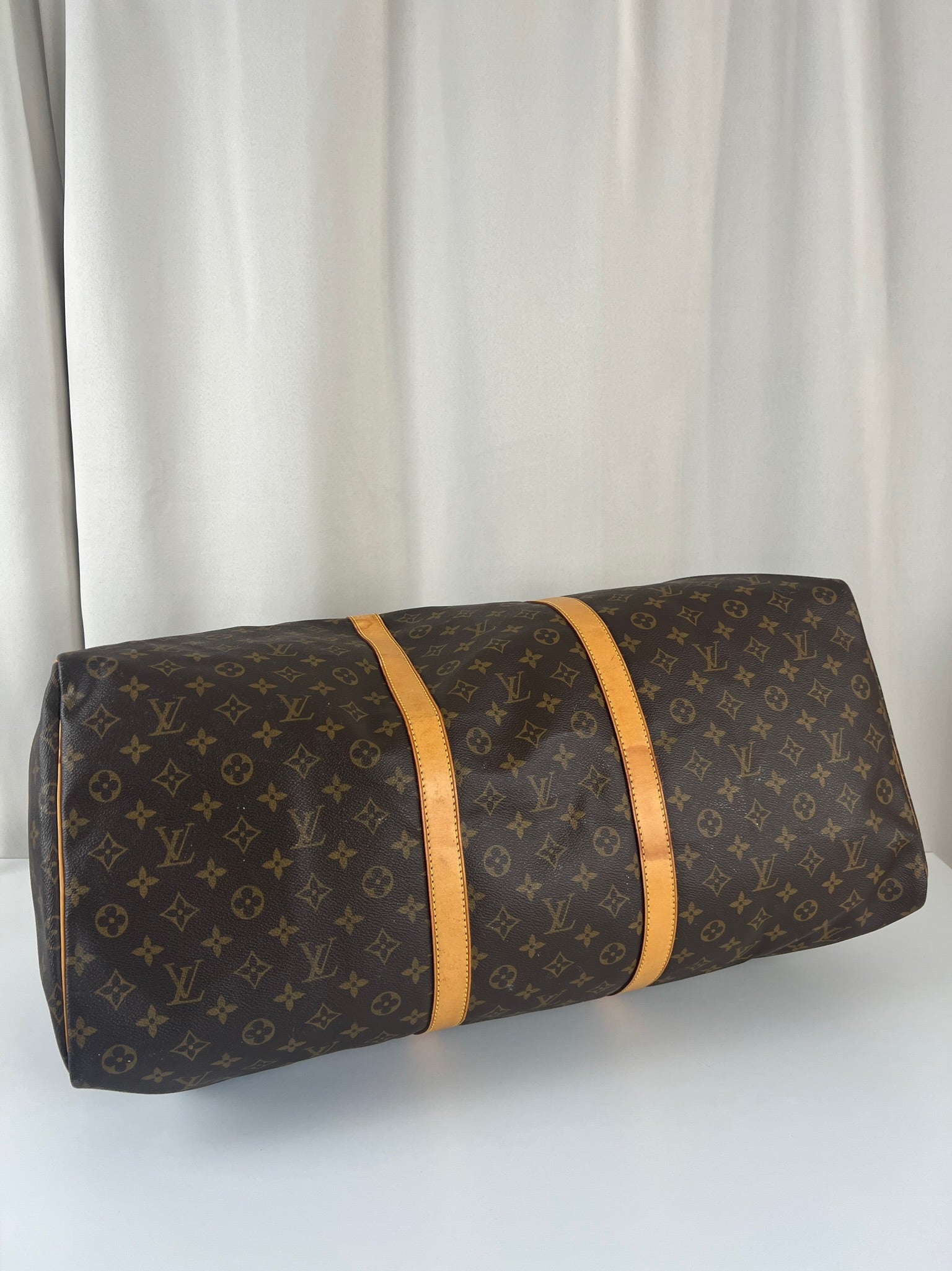 Ce sac de voyage Louis Vuitton Keepall 60 monogramme est en bon état. La toile est en bon état mais il y a des petites taches blanches c'est très petit.. Les coins sont peu frottés. Les parties en cuir sont en bon état avec quelques taches. Les poignées sont en bon état. L'intérieur est en bon état avec de petites tâches seulement.