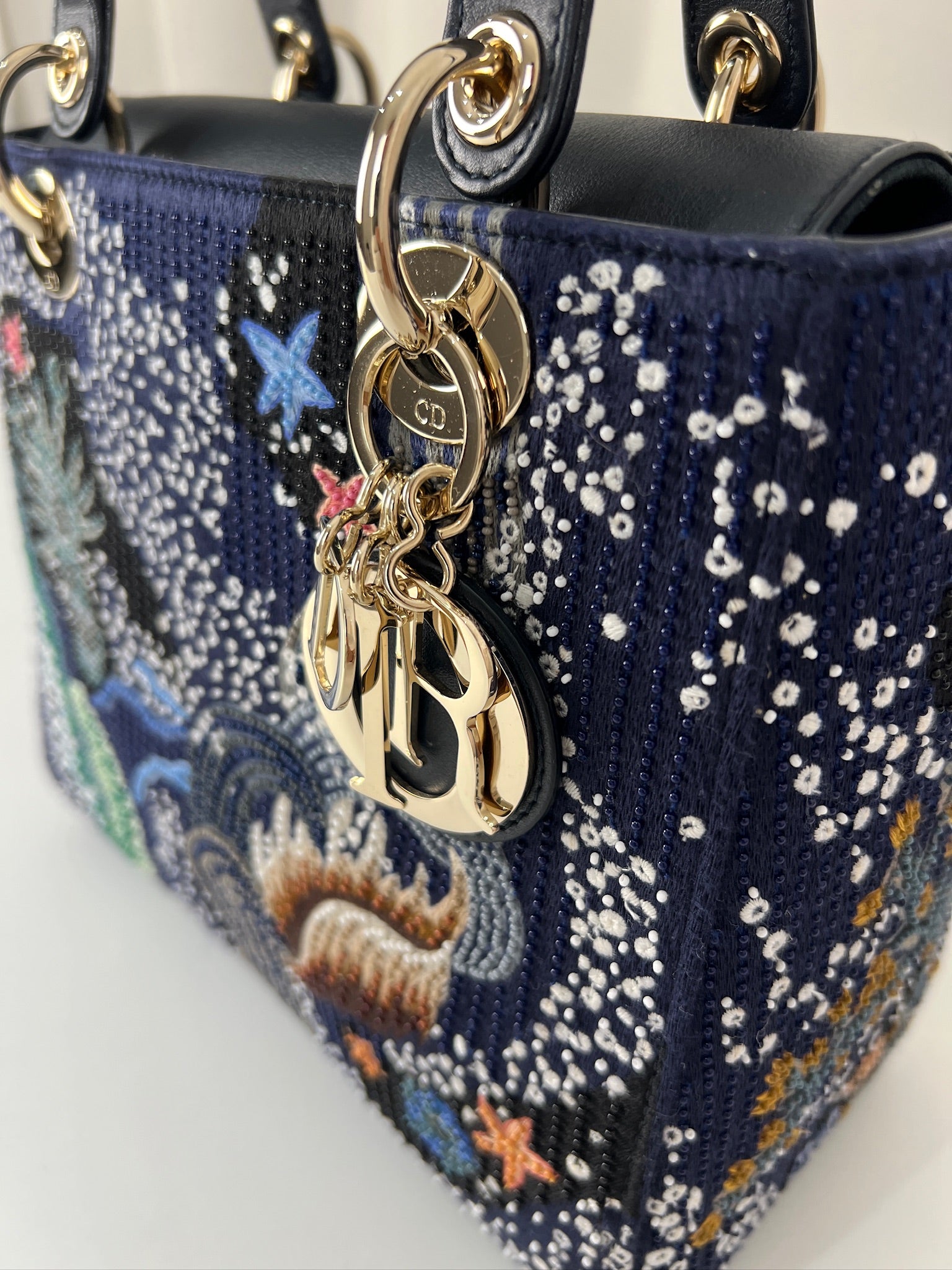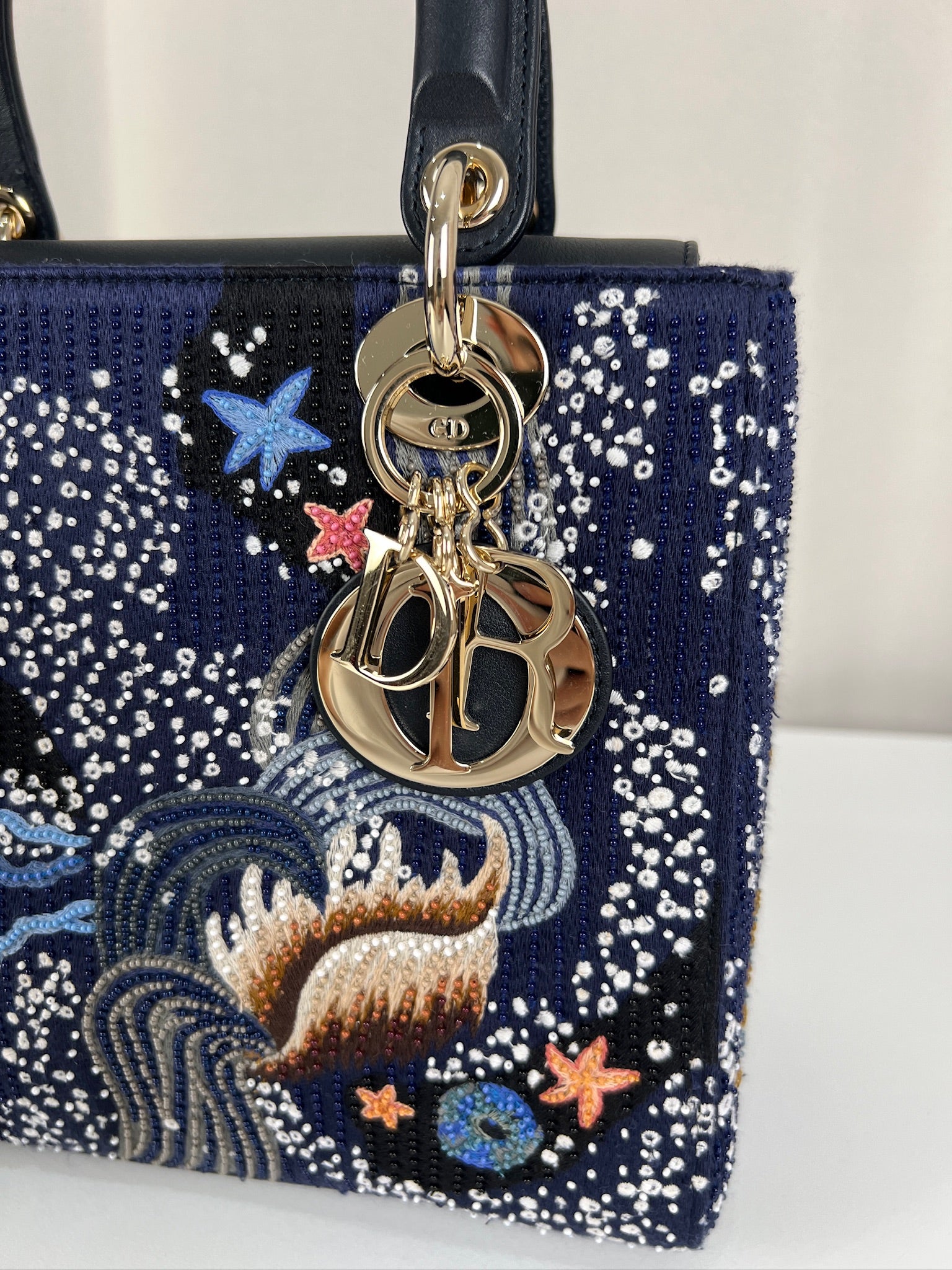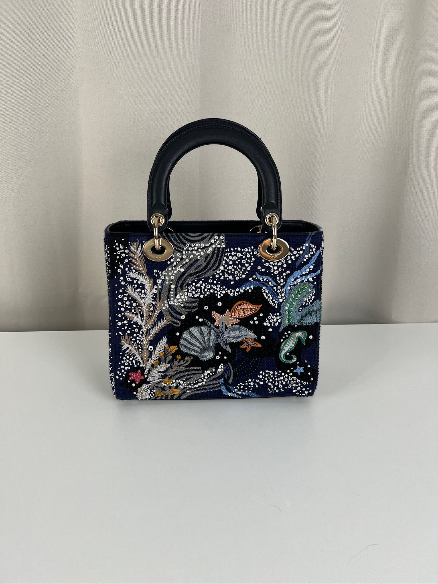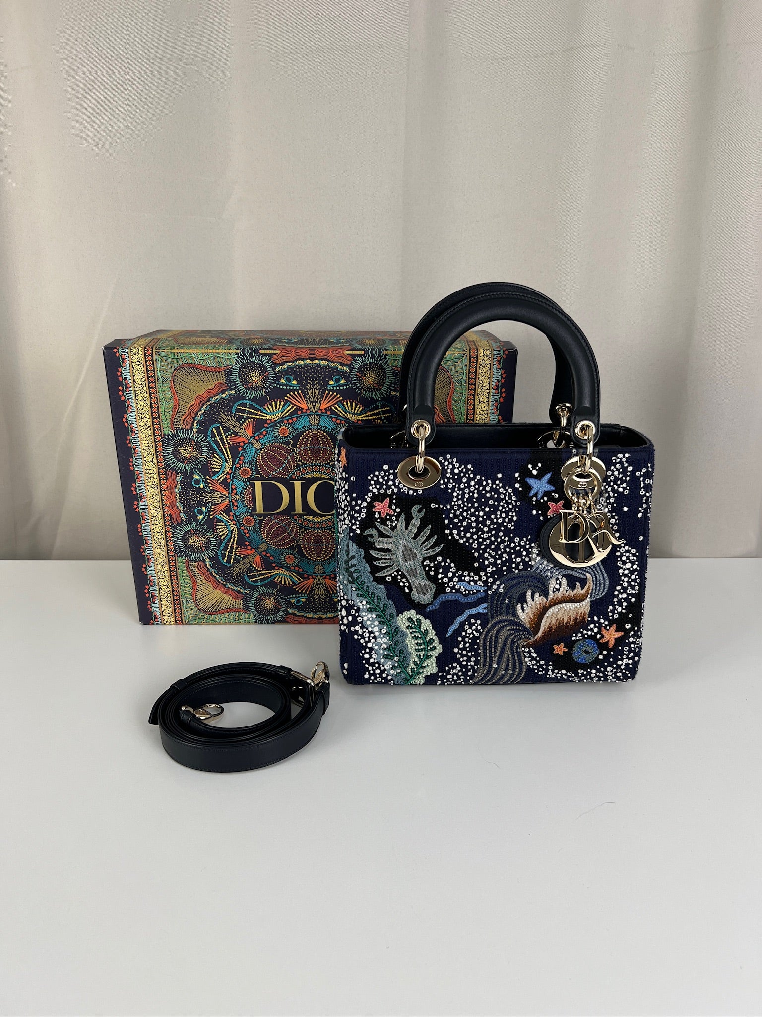Cet étonnant sac Lady Dior est une édition limitée. Il a une mer sauvage brodée sur le sac sur un fond d'une couleur bleu marine. Le sac est en super état. C'est un sac très récent de 2019, vous avez le rabat fermant le sac. Un des coins est très légèrement frotté, c'est tout petit. La bandoulière est amovible et en parfait état. Il s'agit d'une taille moyenne. Ce sac est de l'art ! Il est livré avec boîte, dustbag, sangle, carte d'authenticité, papiers, certificat Entrupy + un organiseur de sac.
