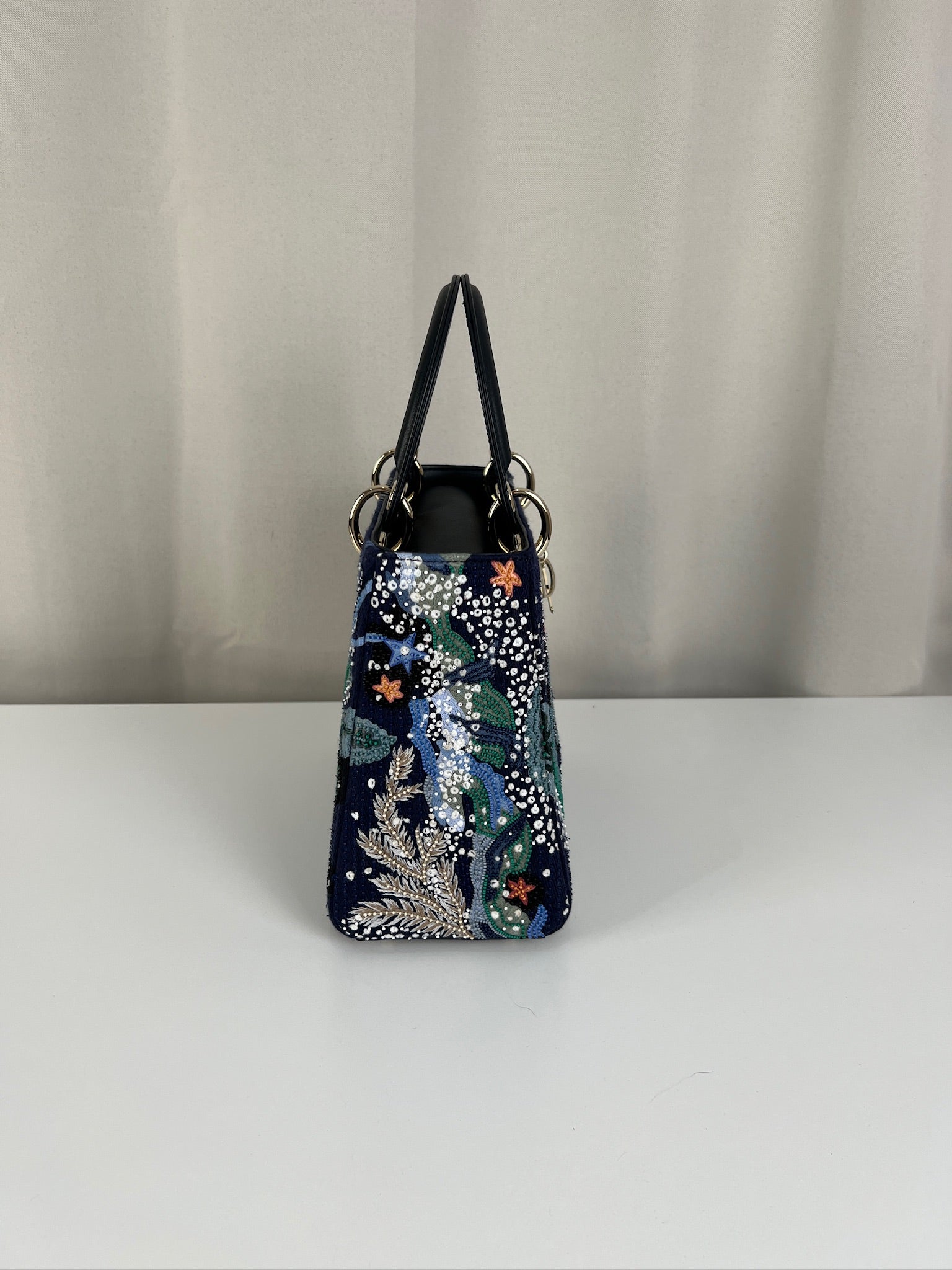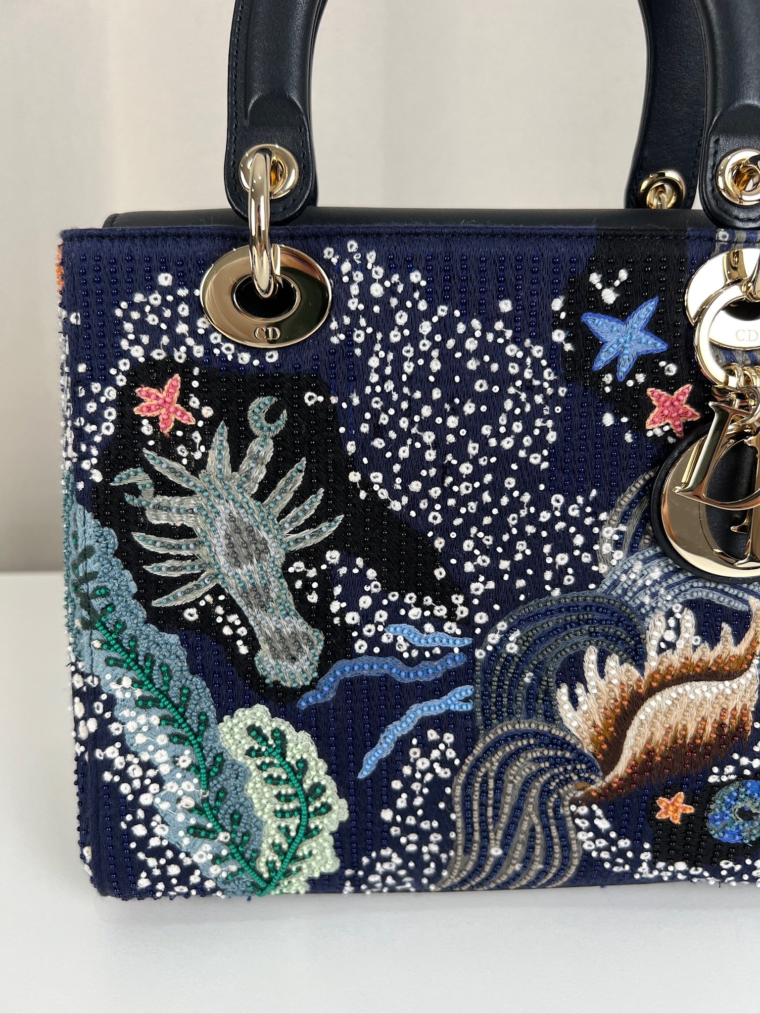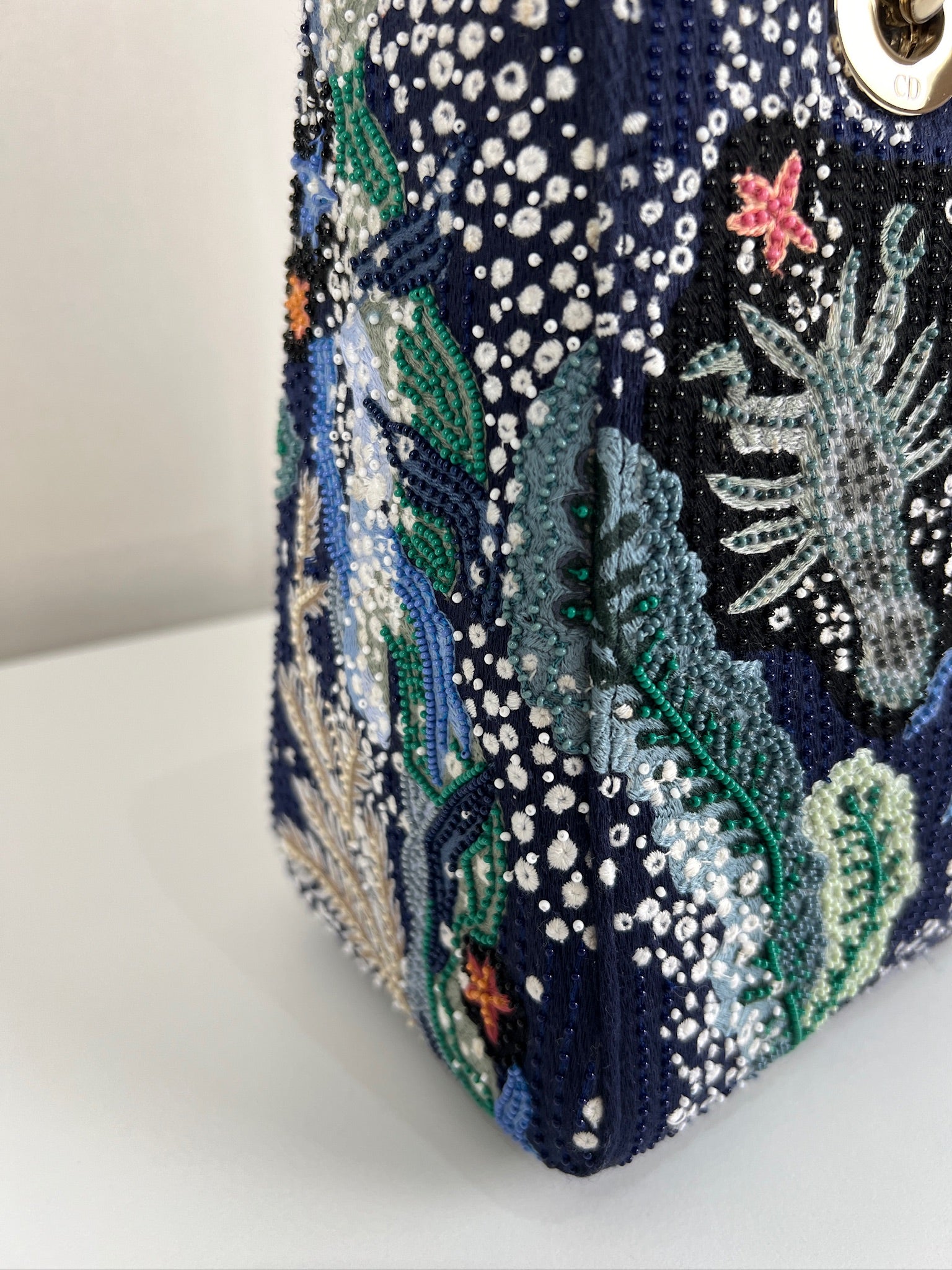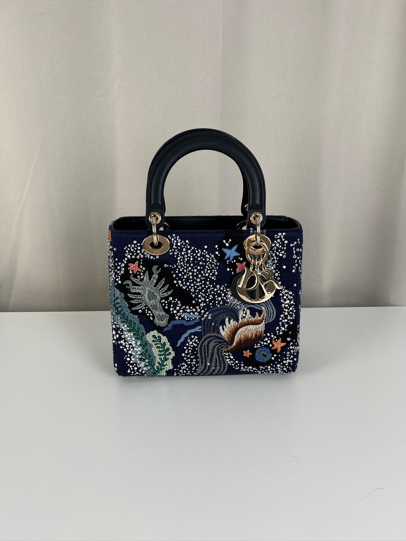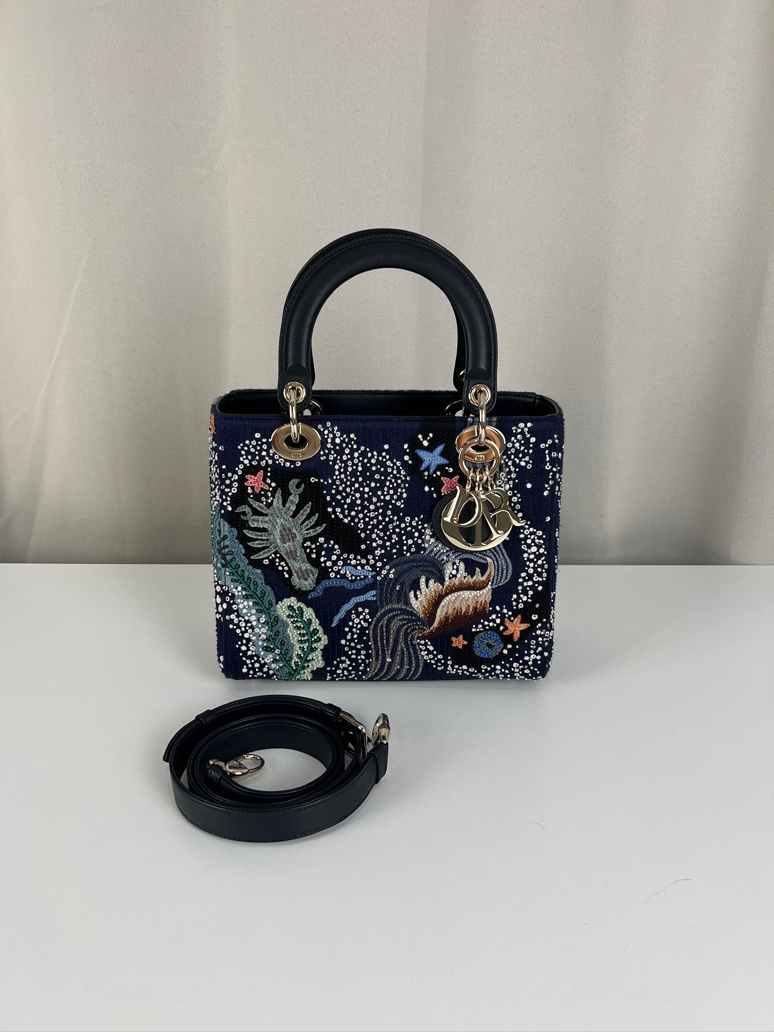 Cet étonnant sac Lady Dior est une édition limitée. Il a une mer sauvage brodée sur le sac sur un fond d'une couleur bleu marine. Le sac est en super état. C'est un sac très récent de 2019, vous avez le rabat fermant le sac. Un des coins est très légèrement frotté, c'est tout petit. La bandoulière est amovible et en parfait état. Il s'agit d'une taille moyenne. Ce sac est de l'art ! Il est livré avec boîte, dustbag, sangle, carte d'authenticité, papiers, certificat Entrupy + un organiseur de sac.