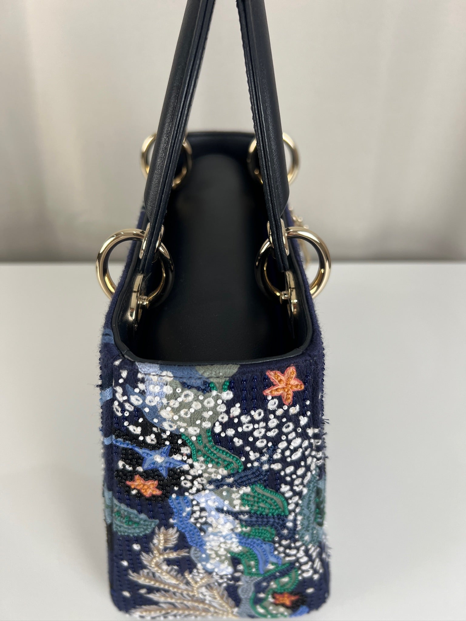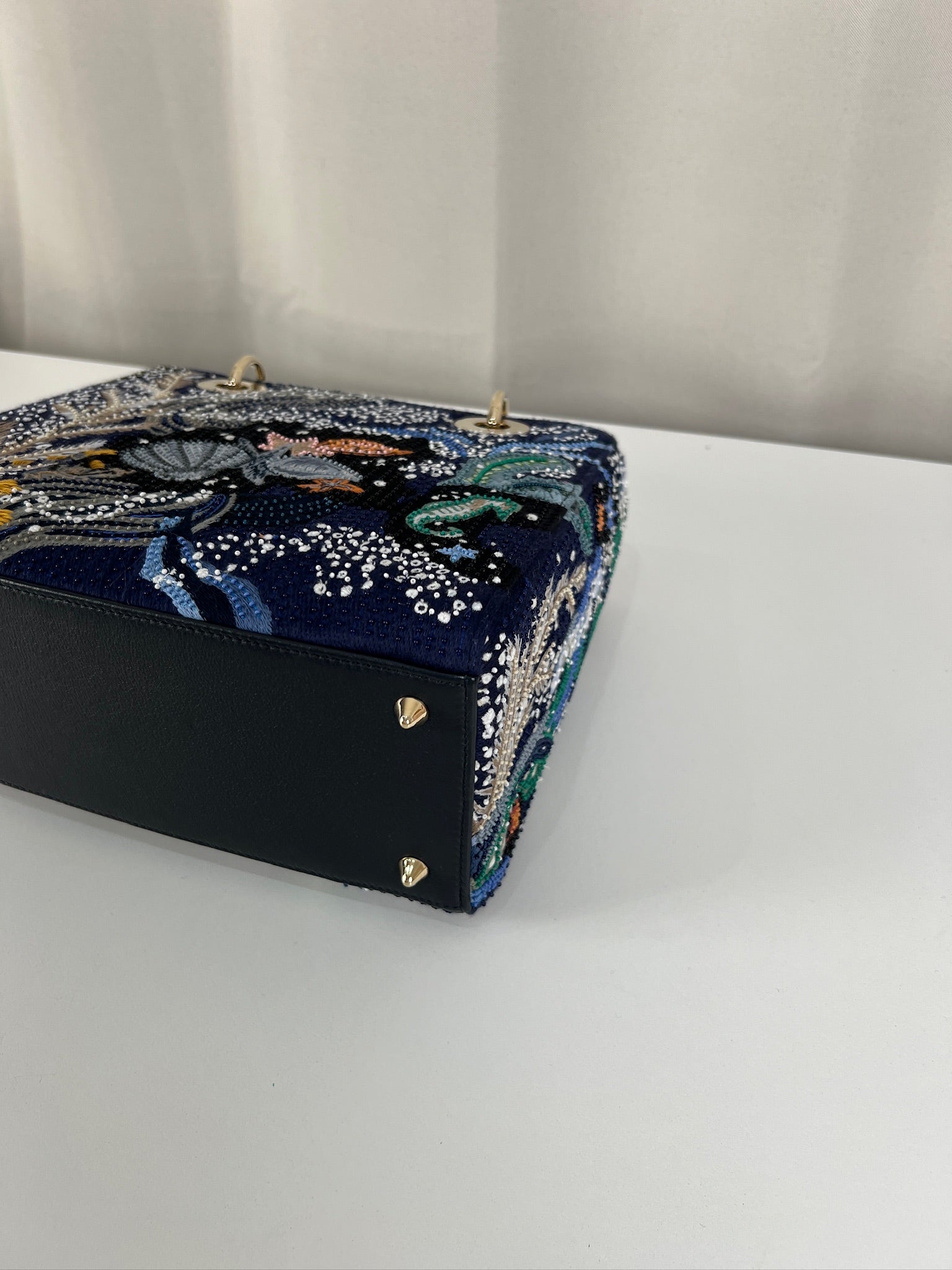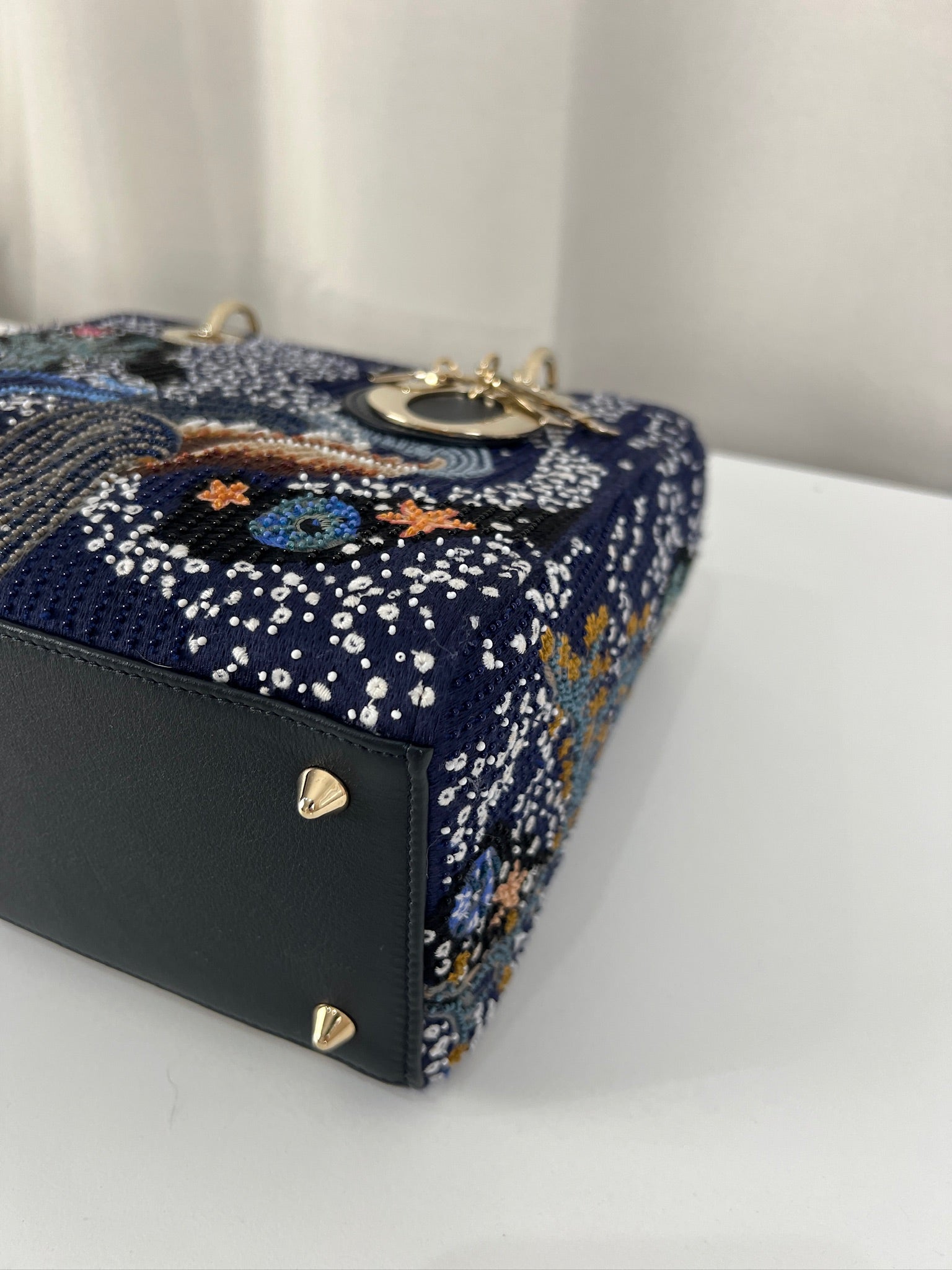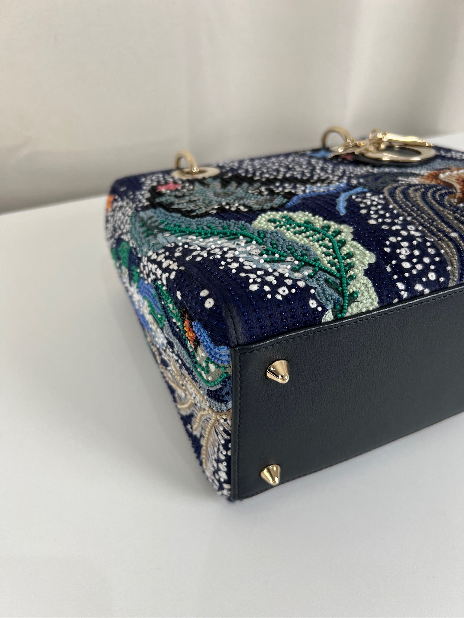 Cet étonnant sac Lady Dior est une édition limitée. Il a une mer sauvage brodée sur le sac sur un fond d'une couleur bleu marine. Le sac est en super état. C'est un sac très récent de 2019, vous avez le rabat fermant le sac. Un des coins est très légèrement frotté, c'est tout petit. La bandoulière est amovible et en parfait état. Il s'agit d'une taille moyenne. Ce sac est de l'art ! Il est livré avec boîte, dustbag, sangle, carte d'authenticité, papiers, certificat Entrupy + un organiseur de sac.