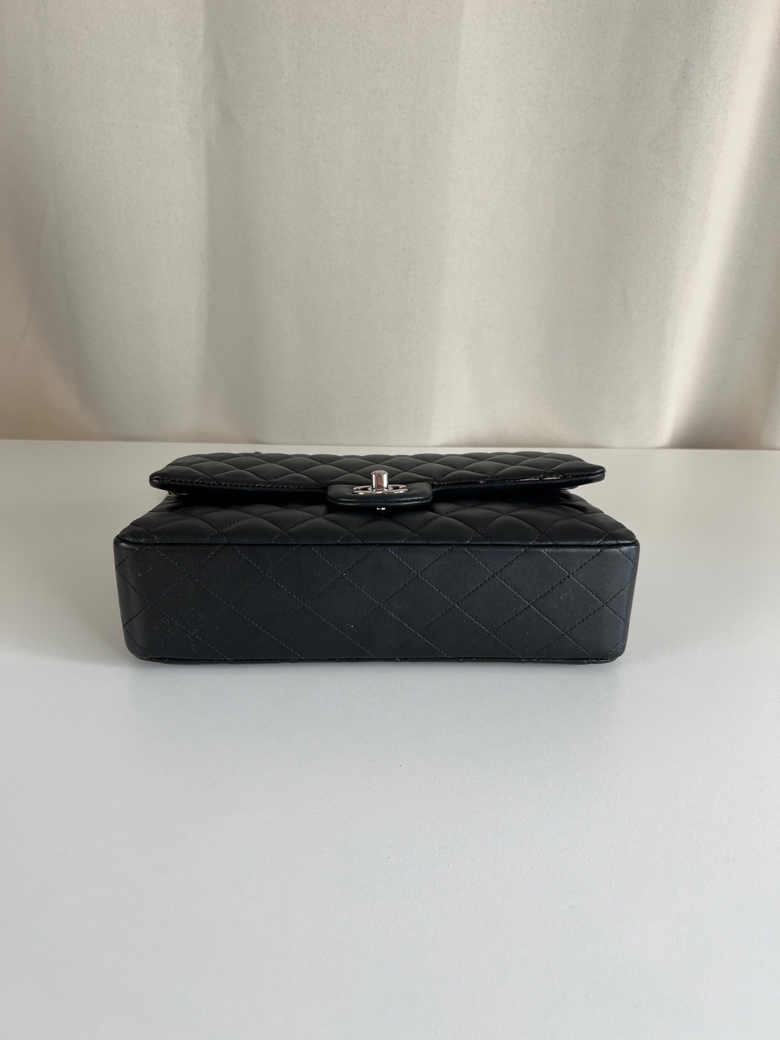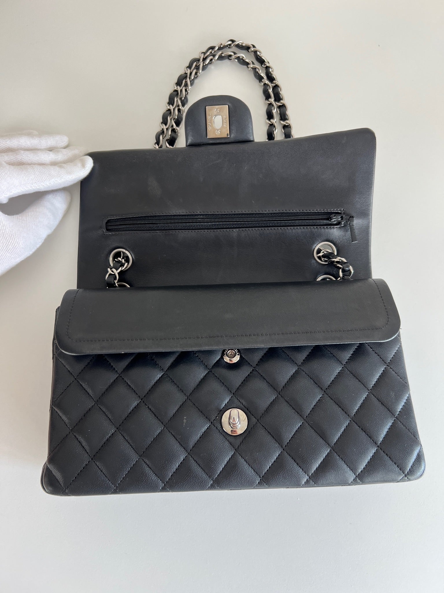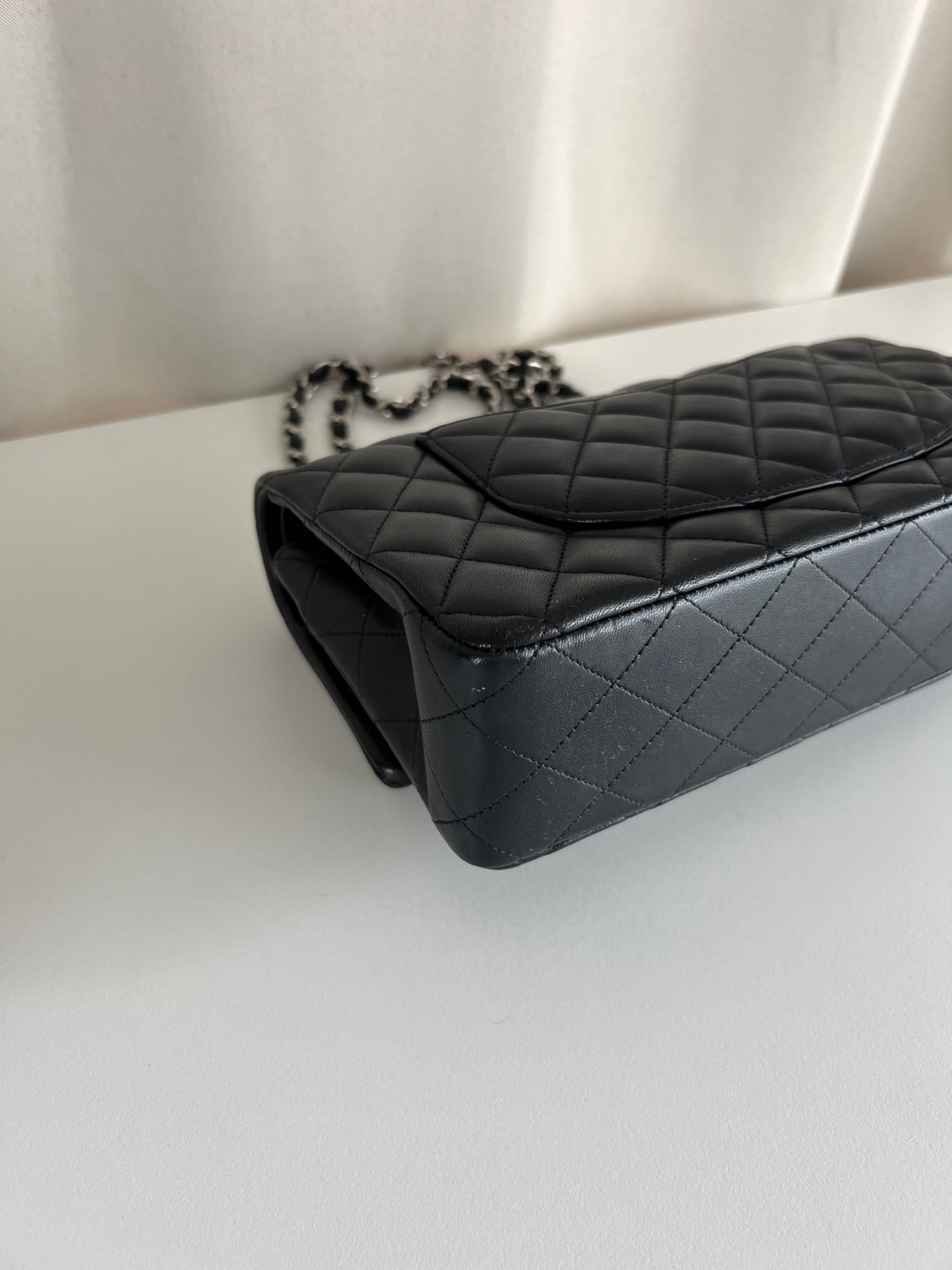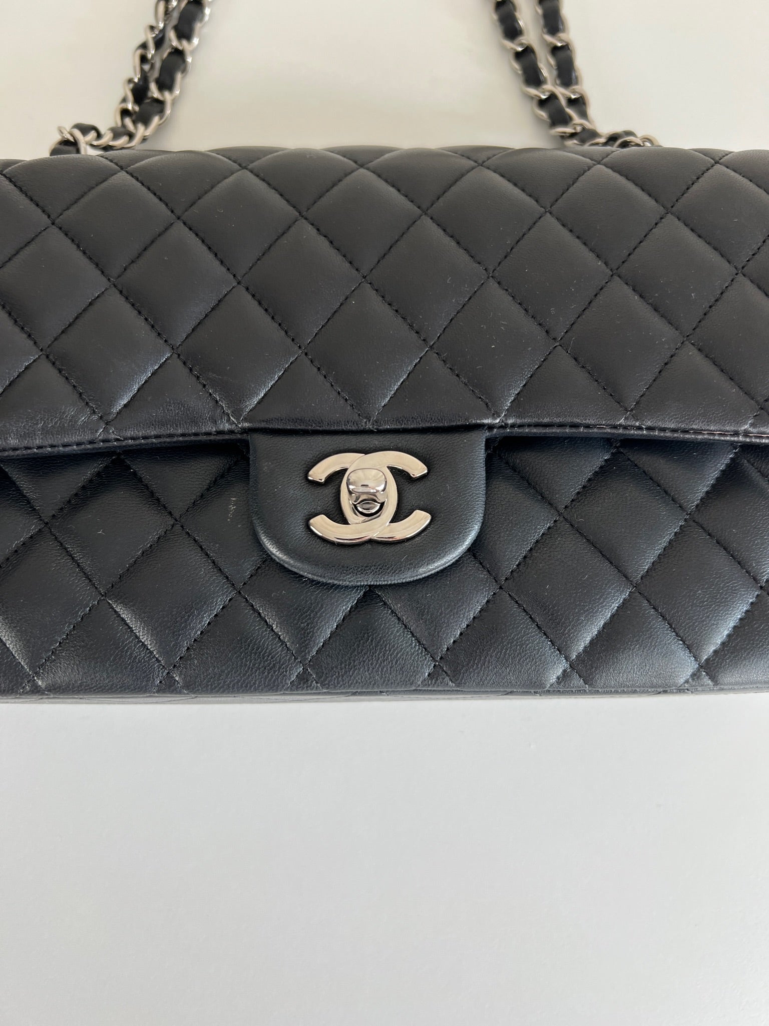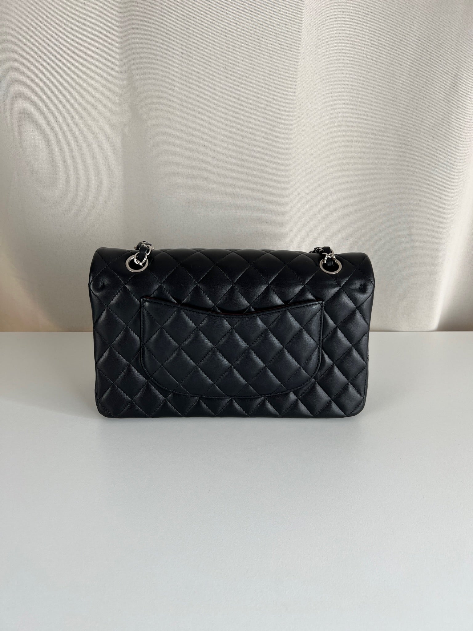 Ce sac rabat classique Chanel timeless est en très bon état et est très récent. Le cuir est en très bon état avec une petite tache sur le devant très mini. Les coins sont en parfait état. La bojouterie est argenté. L'intérieur est en très bon état, on voit des traces d'utilisation, il a été un peu utilisé mais pas énorme. Il est sublime. Il est livré avec boîte, dustbag, carte d'authentification et certificat Entrupy.