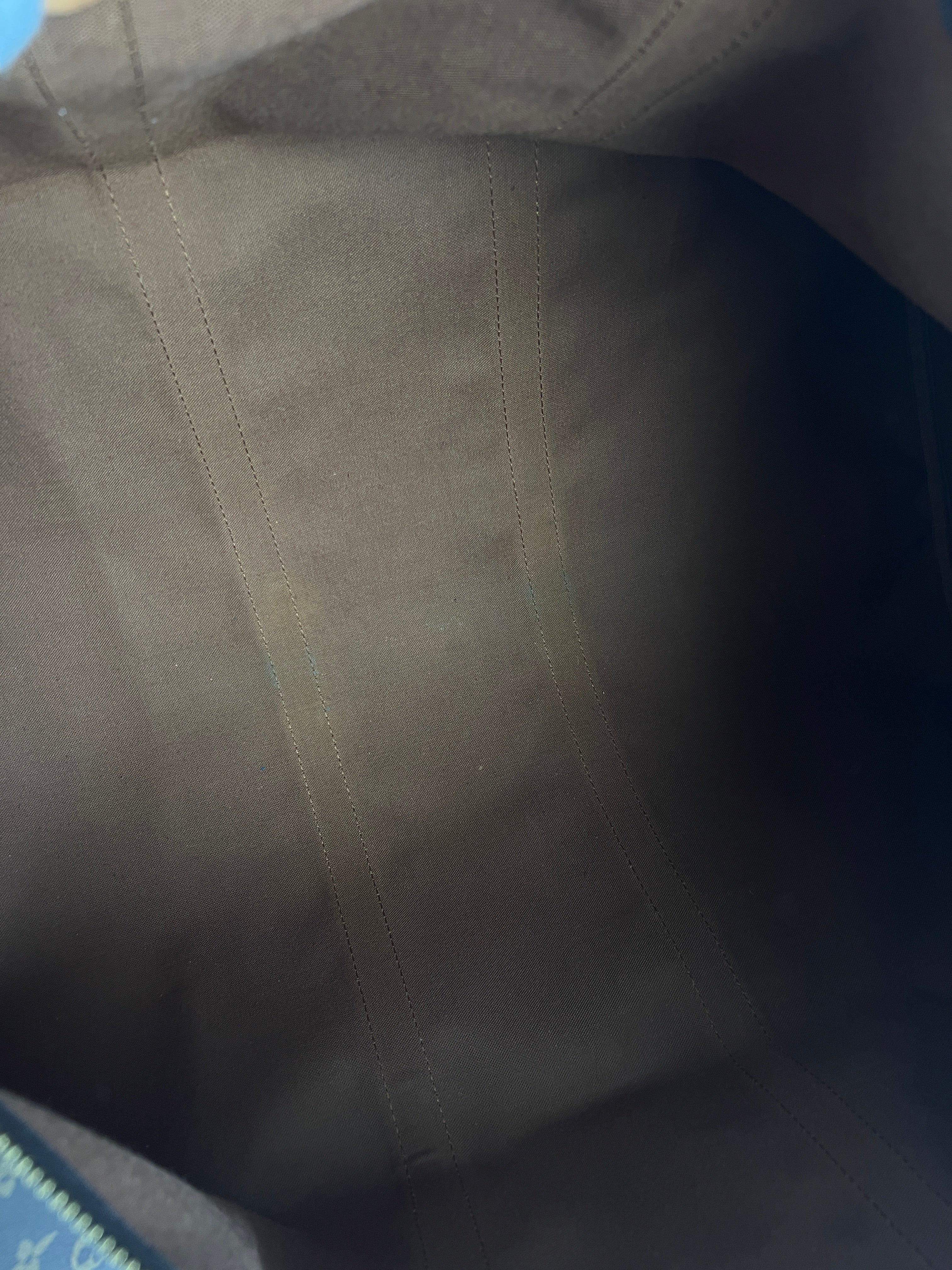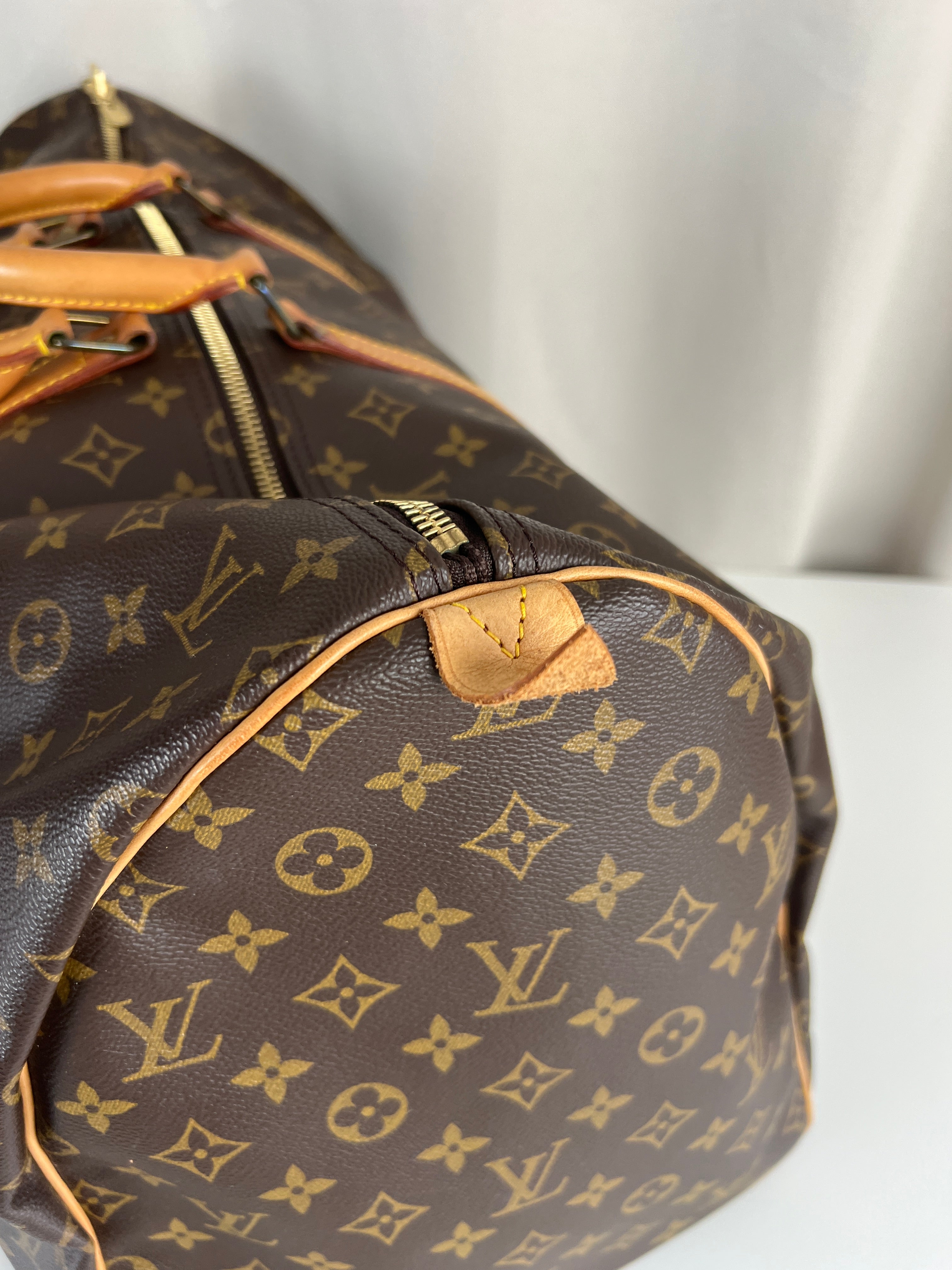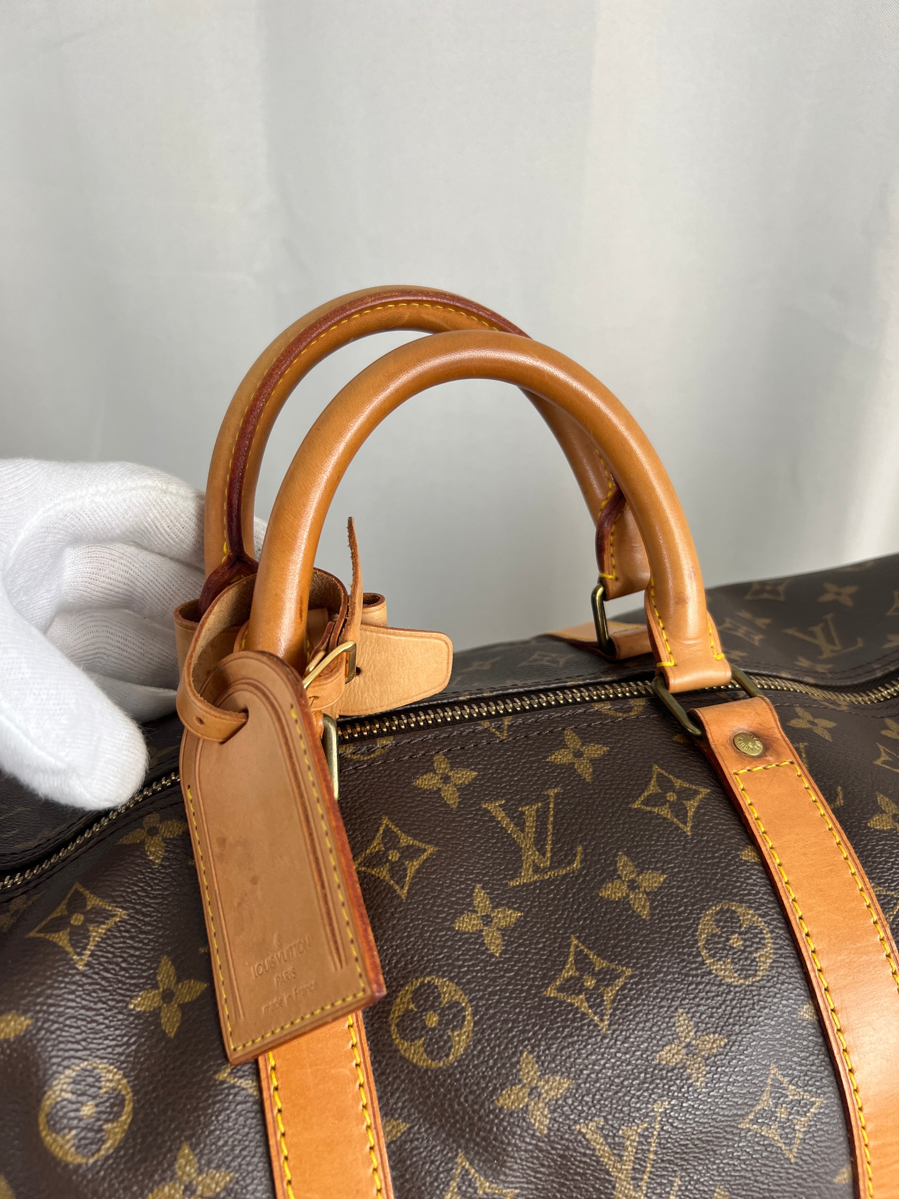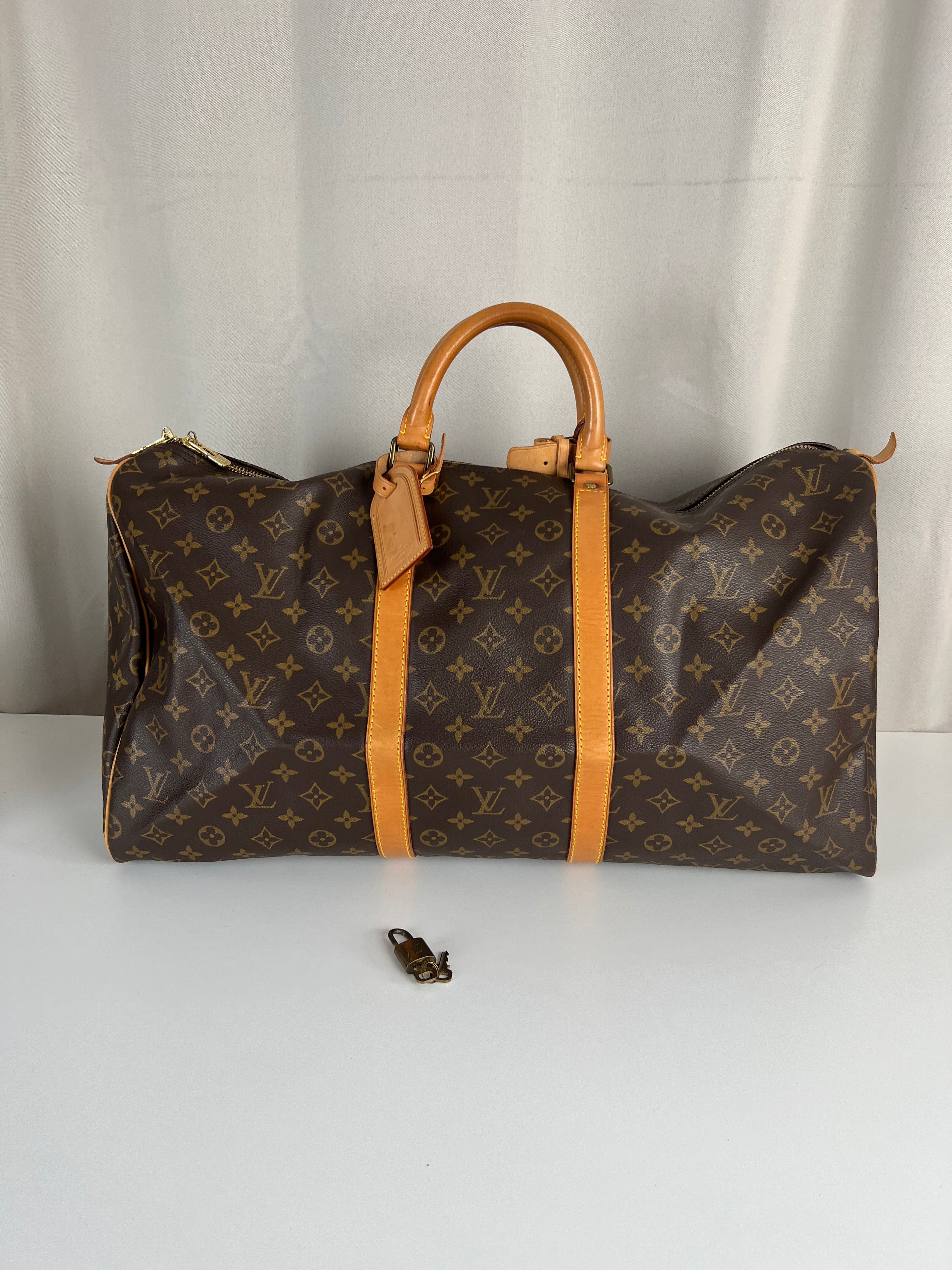 Ce sac Louis Vuitton Keepall 55 Monogram est en très bon état. Le cuir est tanné mais normalement. Les coins et poignées sont en très bon état. L'intérieur est en très bon état aucune tache. La bijouterie est légèrement usé suite à une utilisation normale. Livré avec son porte-nom, son attache, son cadenas et sa clé.