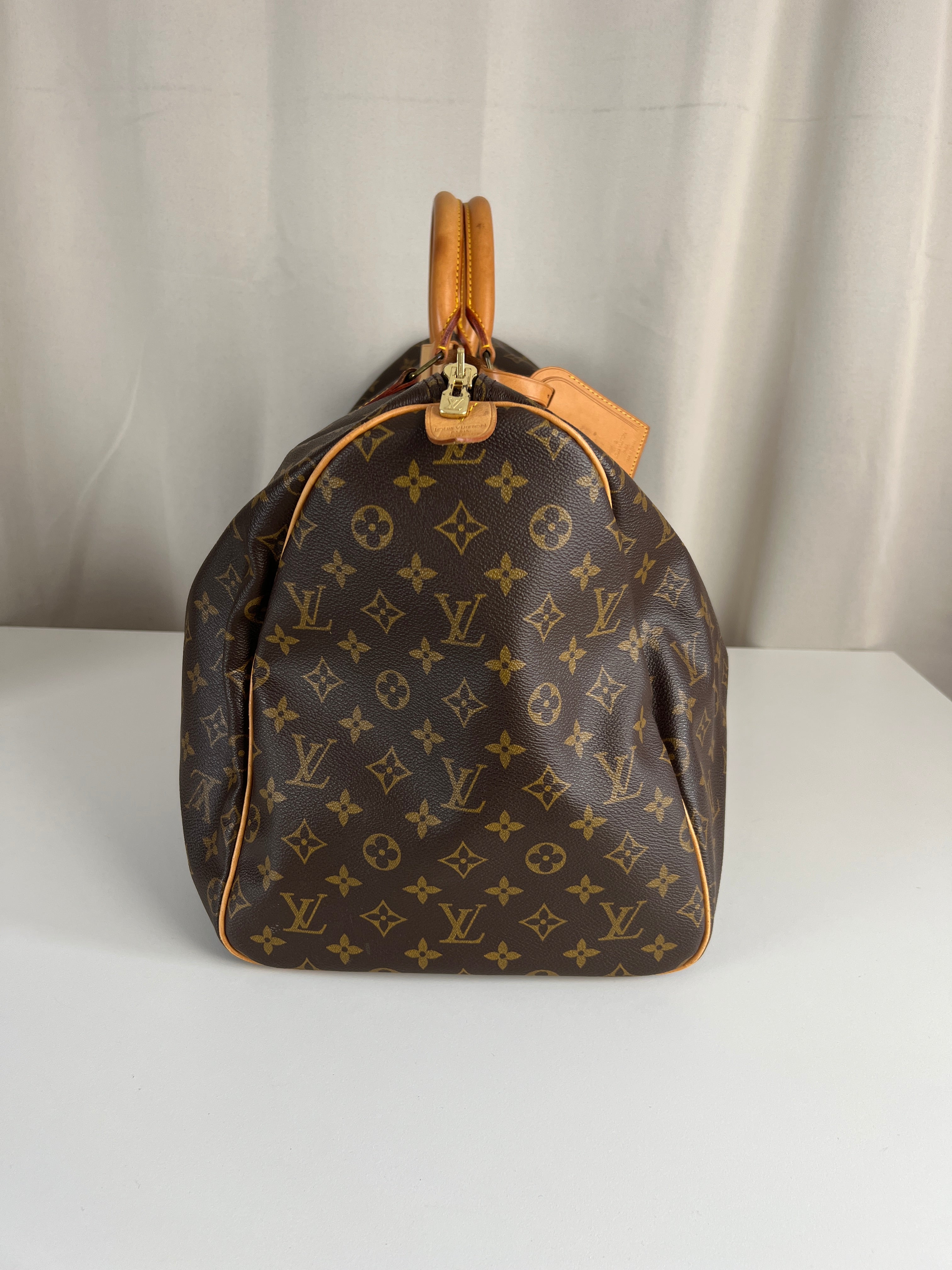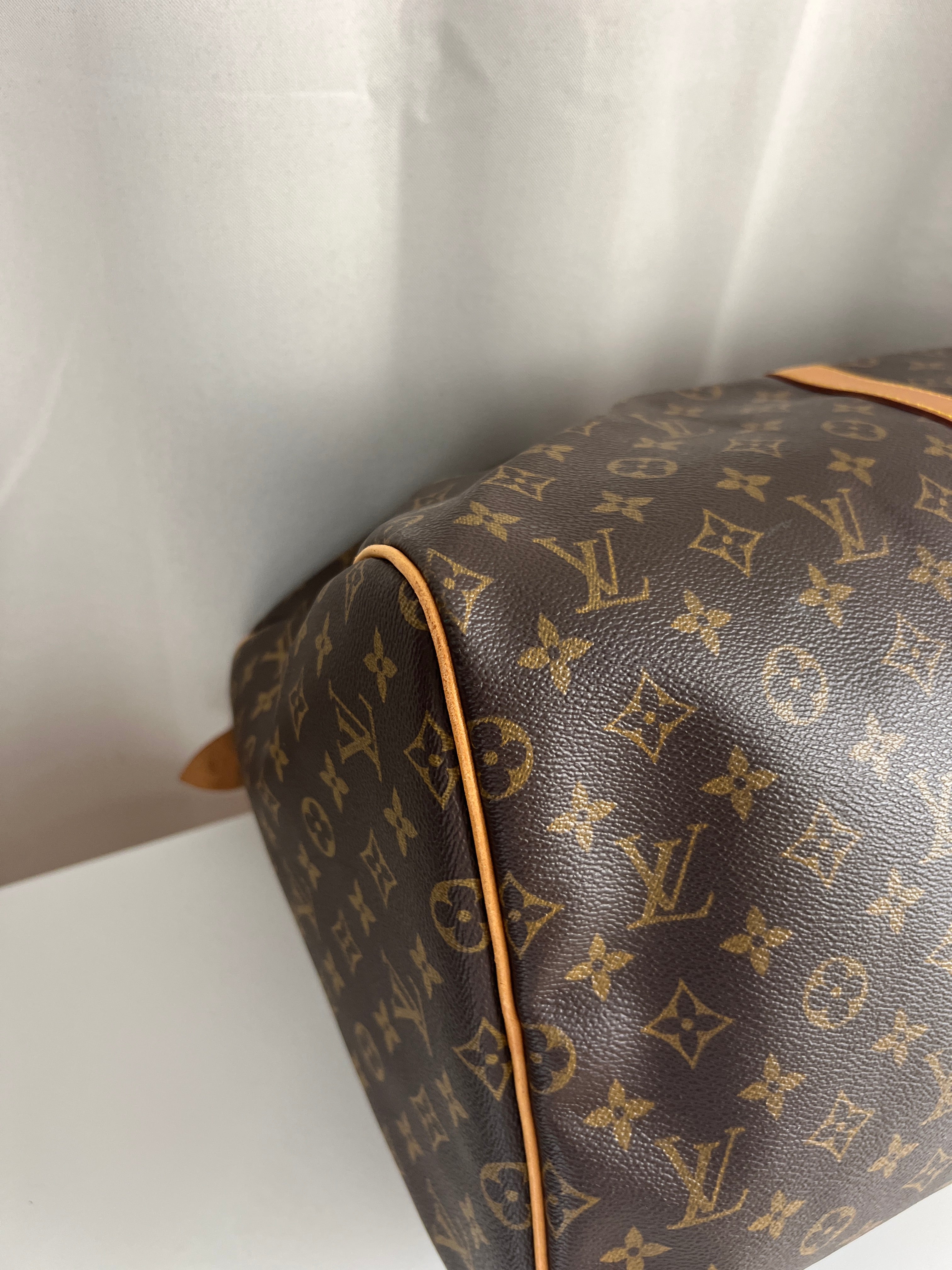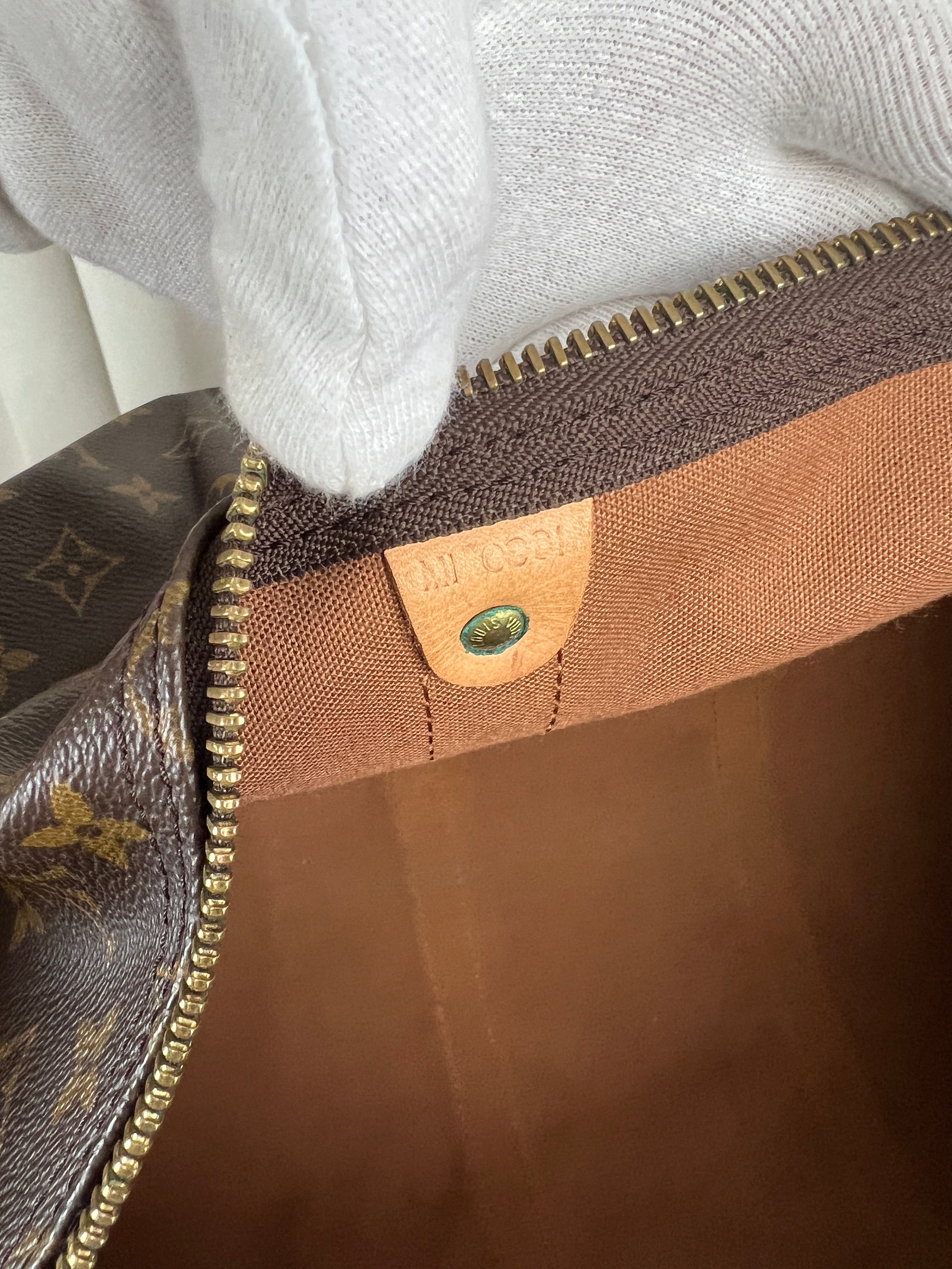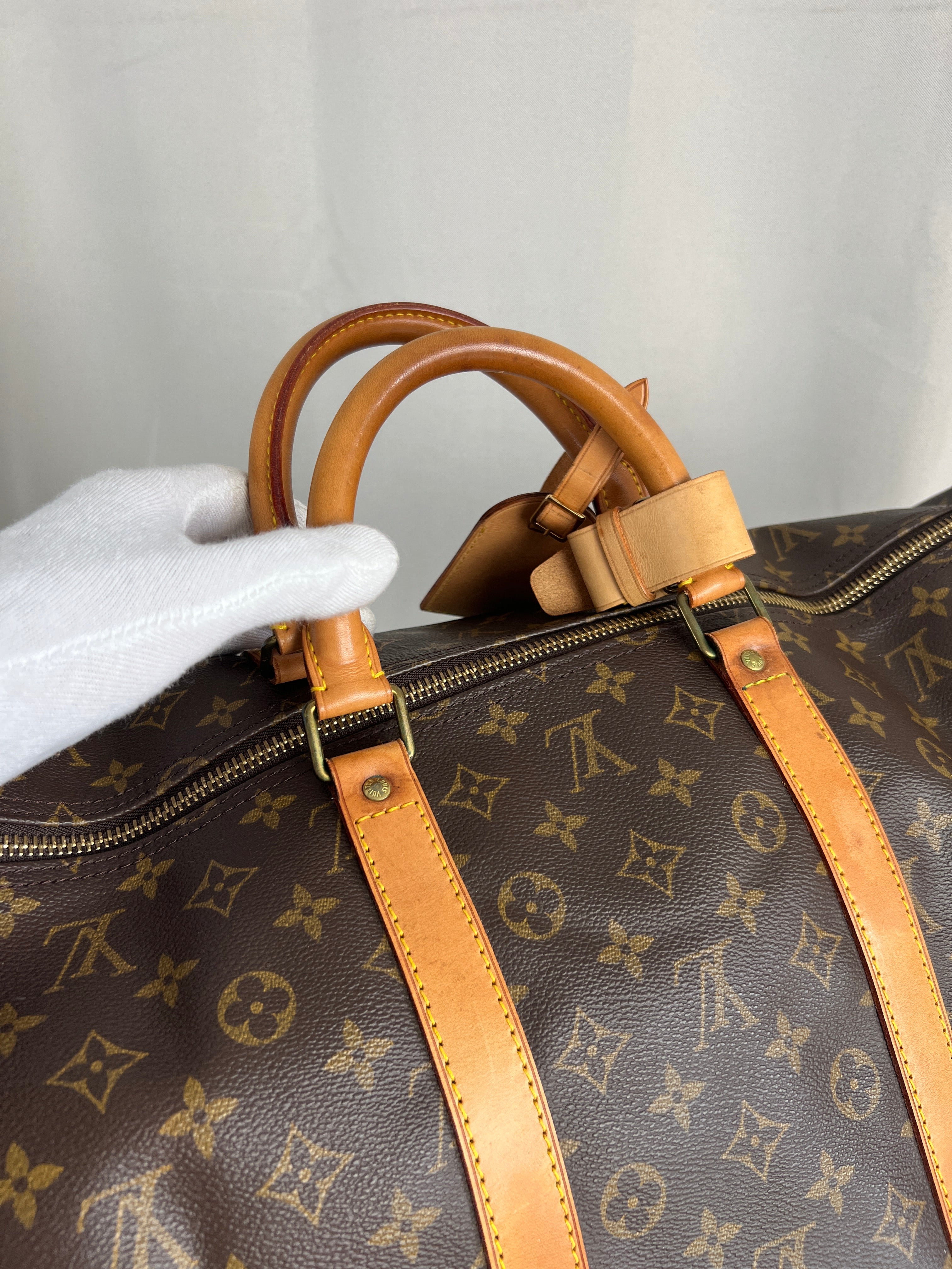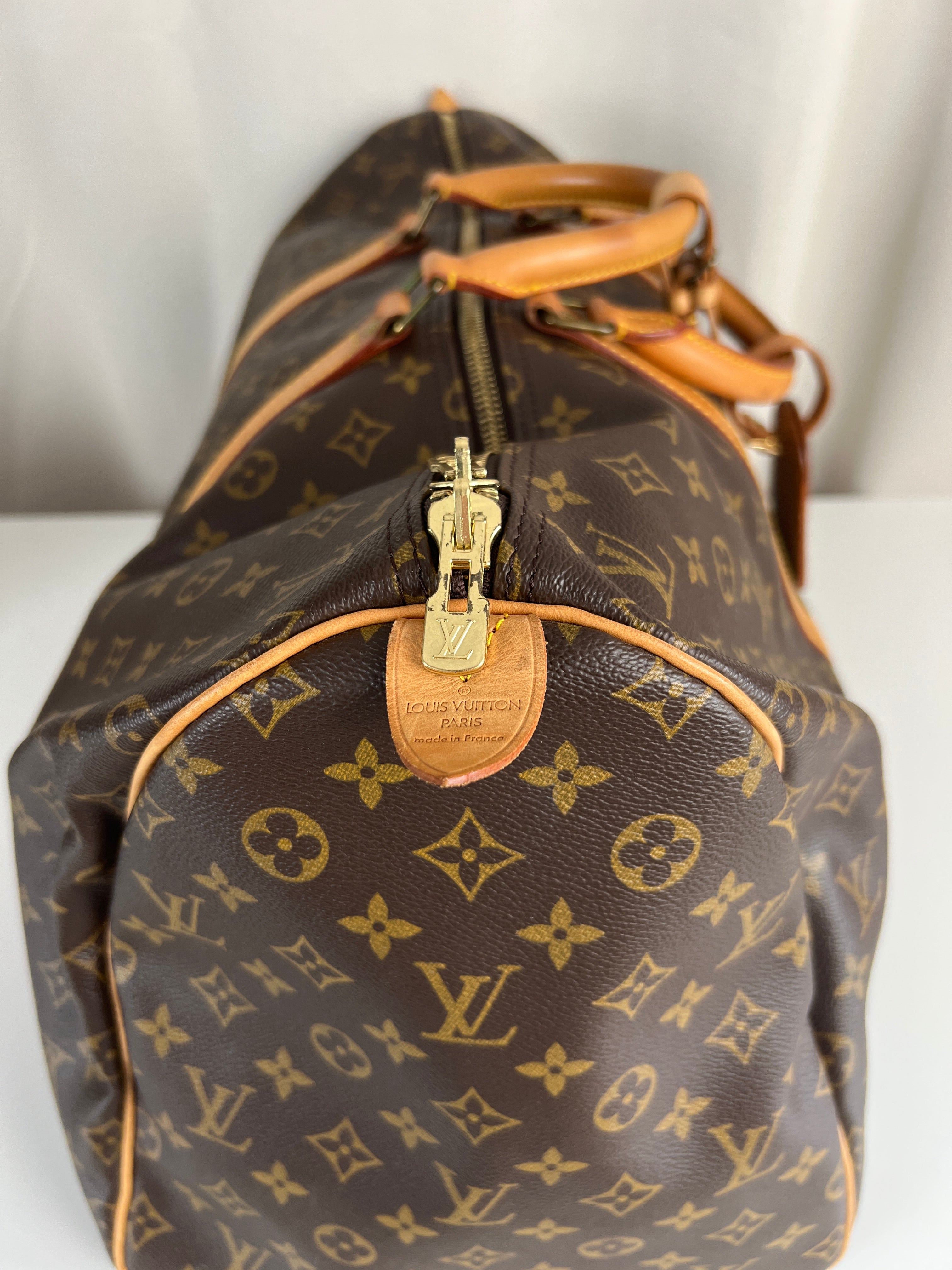 Ce sac Louis Vuitton Keepall 55 Monogram est en très bon état. Le cuir est tanné mais normalement. Les coins et poignées sont en très bon état. L'intérieur est en très bon état aucune tache. La bijouterie est légèrement usé suite à une utilisation normale. Livré avec son porte-nom, son attache, son cadenas et sa clé.