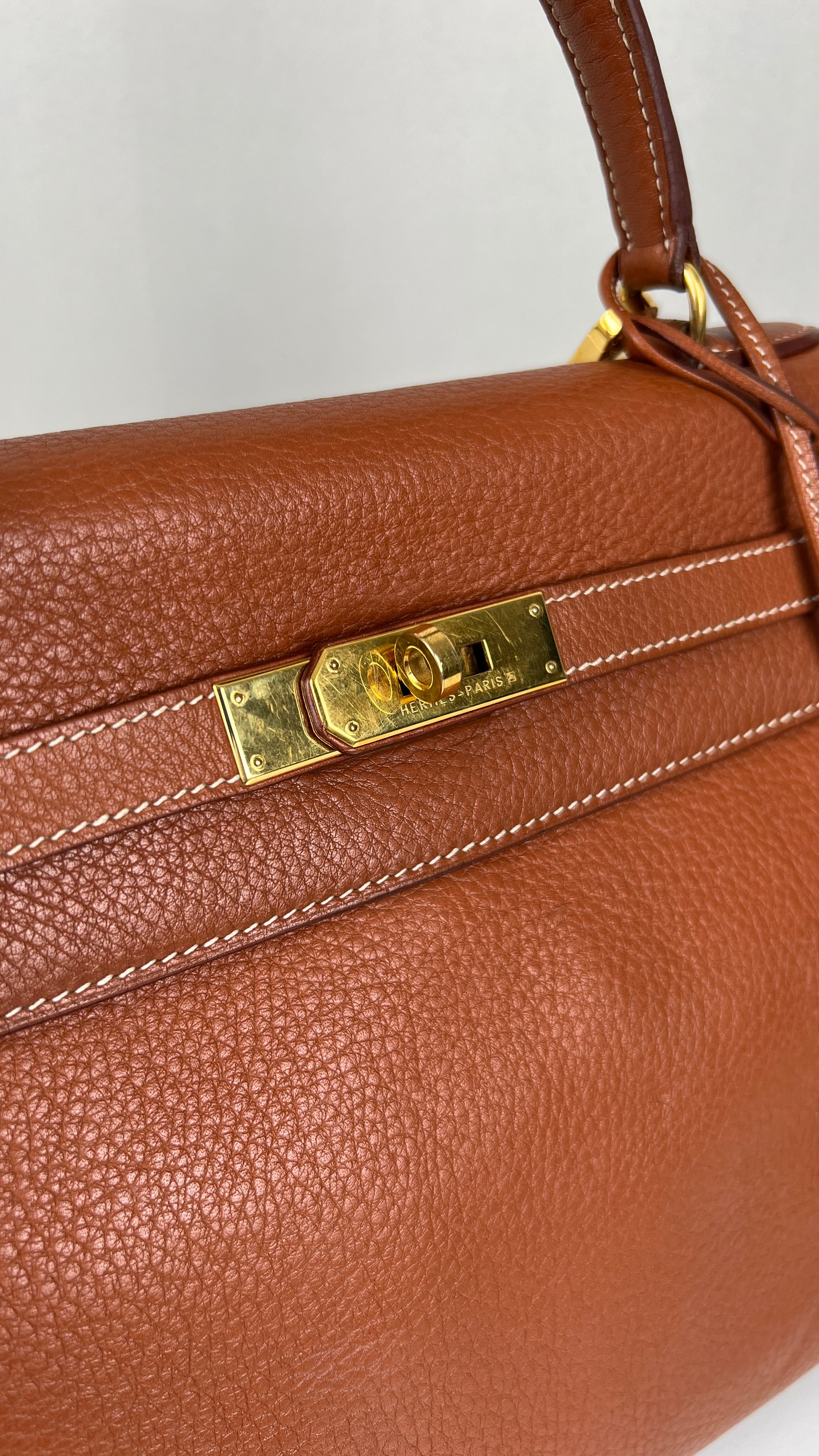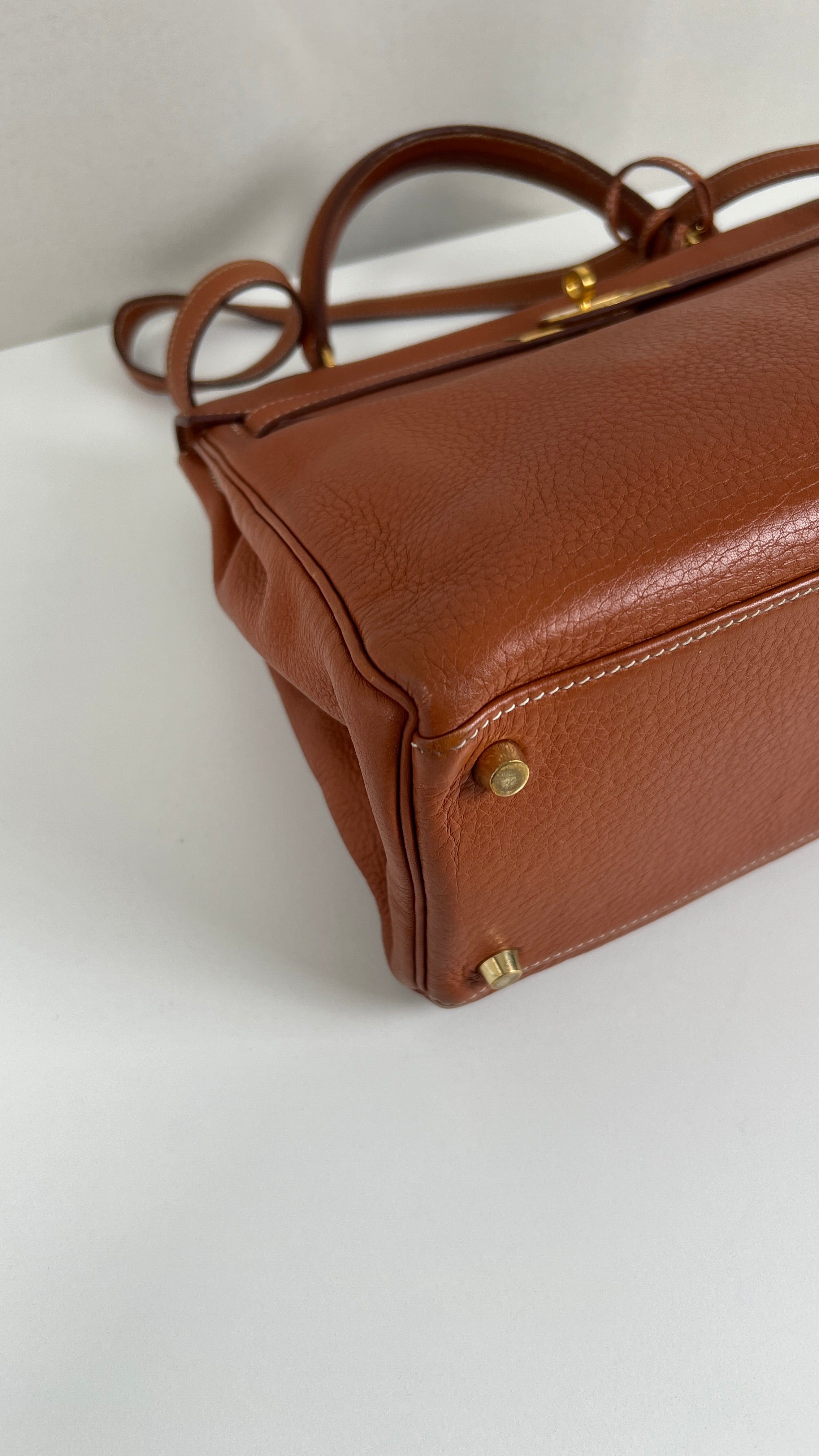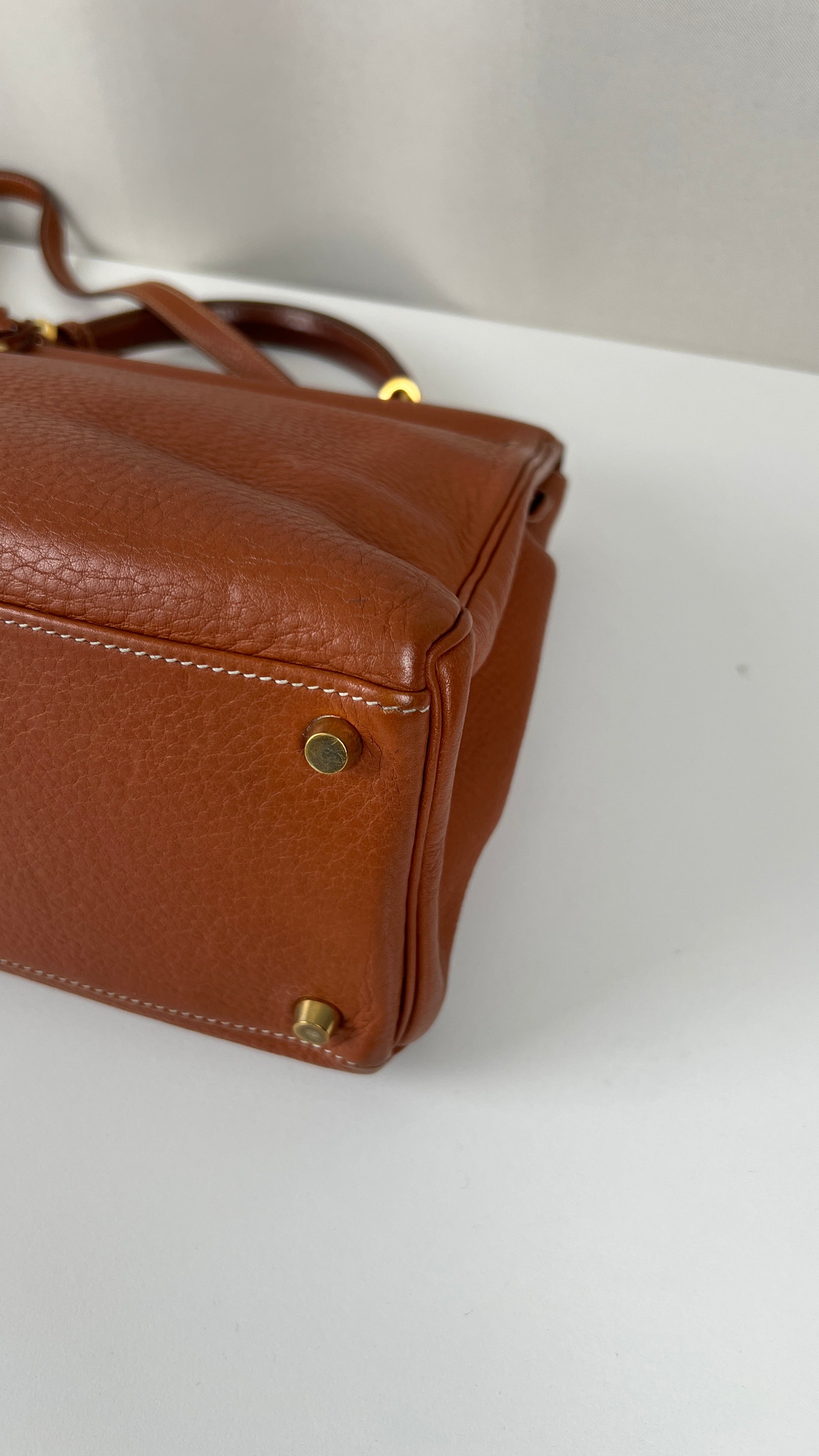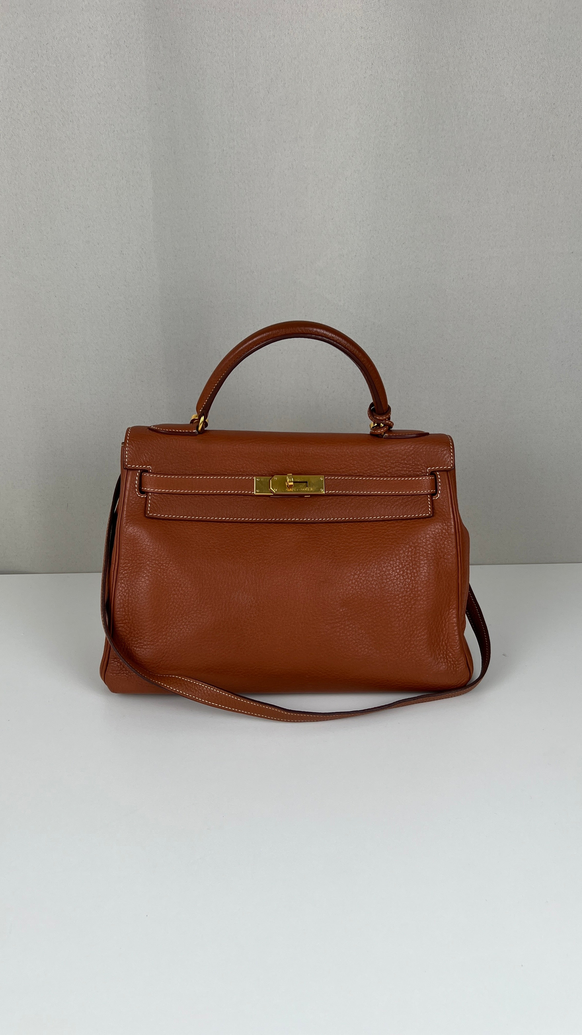 Ce sac Kelly 32 Togo Retourné Hermès est en bon / très bon état. Le cuir est de couleur Cognac. Accastillage doré. Il est livré avec le dustbag, cadenas et clé, le sac imperméable, la facture du spa Hermès + certificat d'Entrupy. Le cuir est en très bon état, vous avez des traces naturelles de portés mais assez naturelles. Les coins sont très biens. La bijouterie présente de petites marques d'usure et rayures (normales). L'intérieur du sac est en très bon état. Une seule mini tache dans une petite poche, très petite. Sinon très bon état pour le sac. C'est un retourné pas un sellier. Il est passé au spa Hermès (facture incluse) donc il est super ! Ce qui a été fait : nettoyage et entretien des coins, une couture dans la poche intérieure, petite couture sur soufflet, remplacement de la bandoulière. Beau sac et très bon état c'est un must.