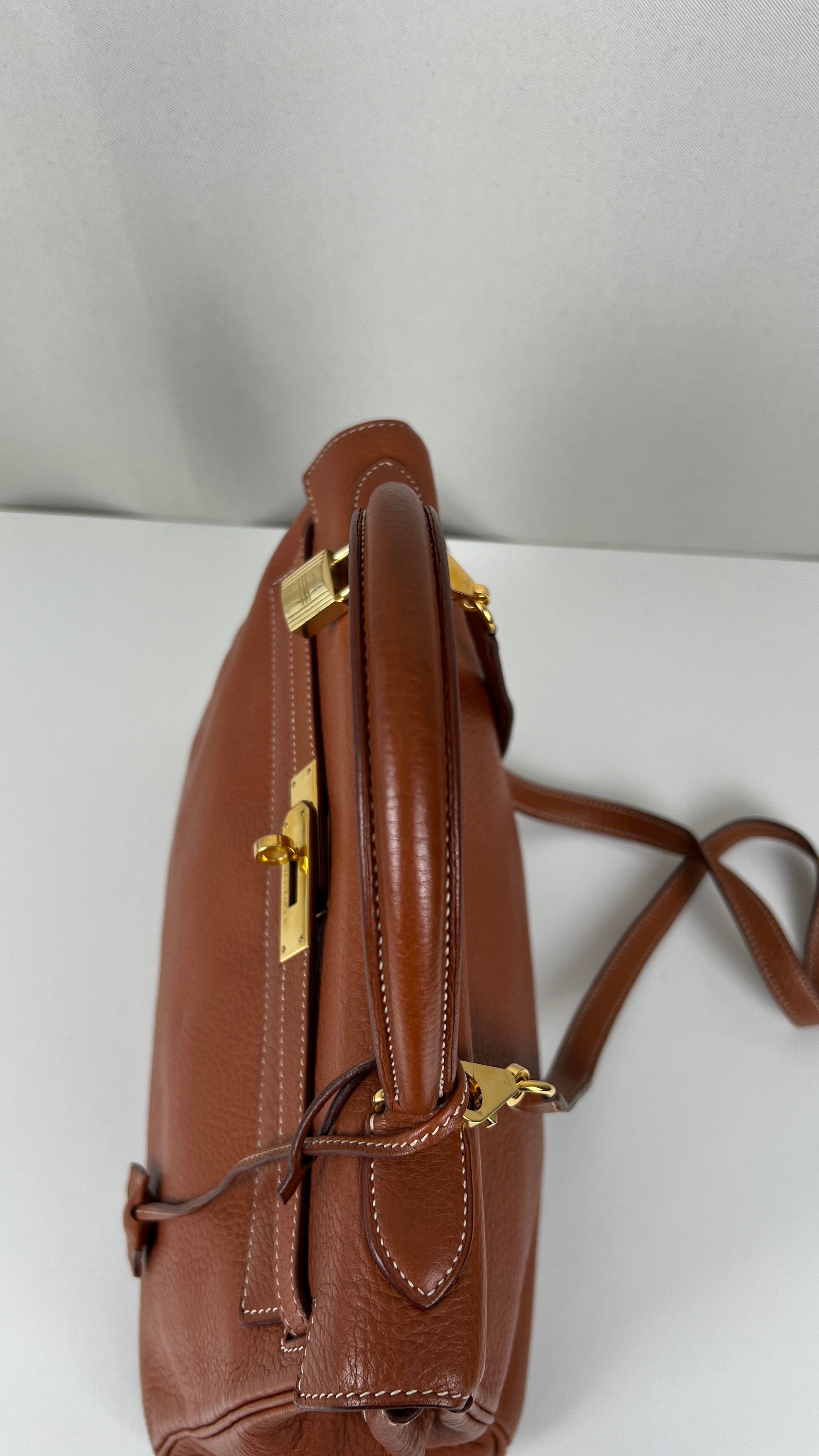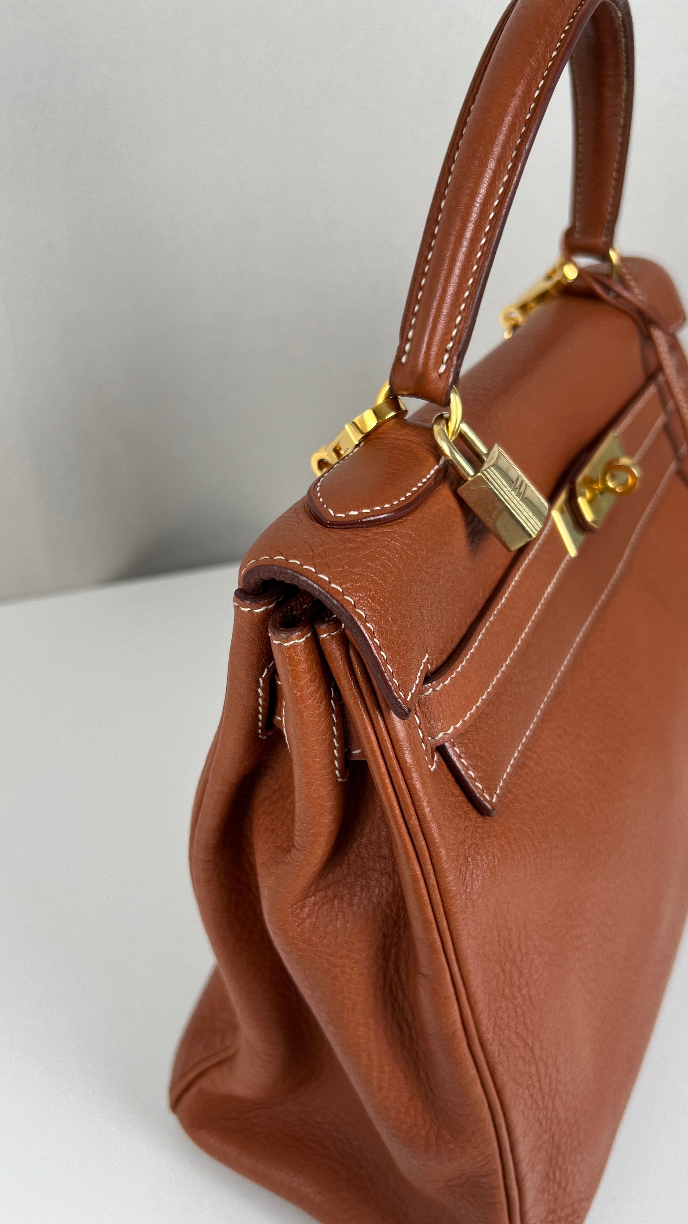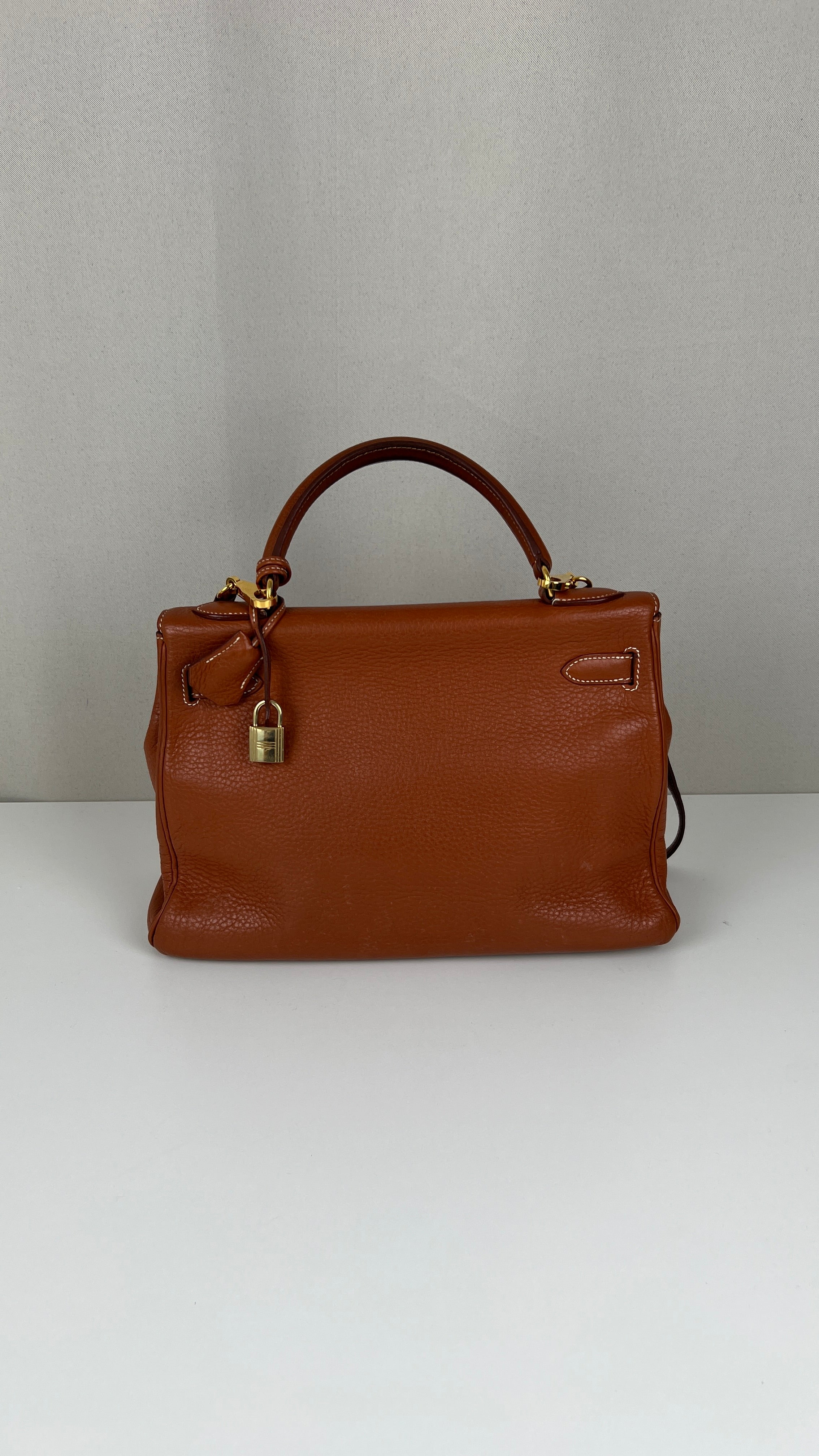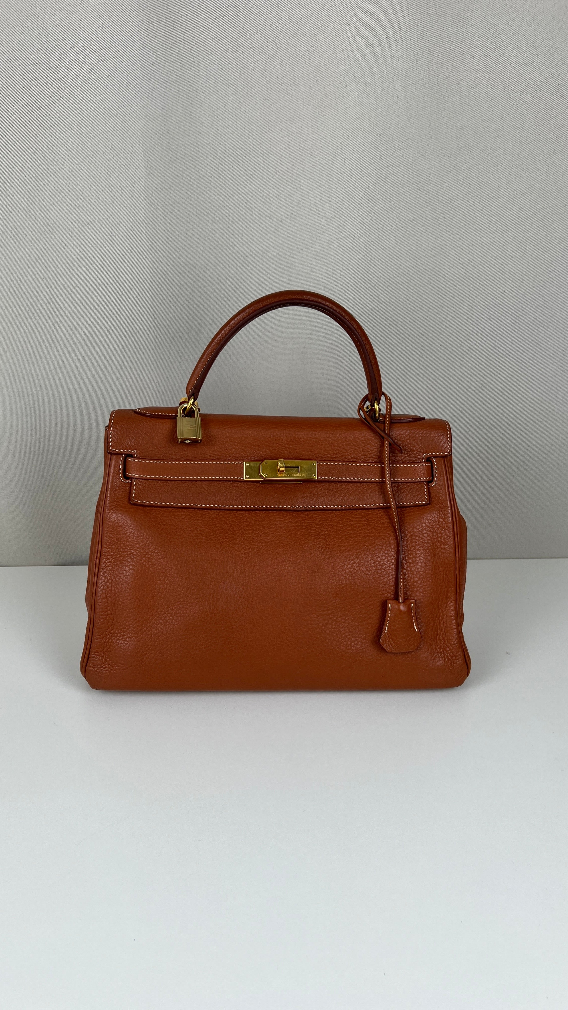 Ce sac Kelly 32 Togo Retourné Hermès est en bon / très bon état. Le cuir est de couleur Cognac. Accastillage doré. Il est livré avec le dustbag, cadenas et clé, le sac imperméable, la facture du spa Hermès + certificat d'Entrupy. Le cuir est en très bon état, vous avez des traces naturelles de portés mais assez naturelles. Les coins sont très biens. La bijouterie présente de petites marques d'usure et rayures (normales). L'intérieur du sac est en très bon état. Une seule mini tache dans une petite poche, très petite. Sinon très bon état pour le sac. C'est un retourné pas un sellier. Il est passé au spa Hermès (facture incluse) donc il est super ! Ce qui a été fait : nettoyage et entretien des coins, une couture dans la poche intérieure, petite couture sur soufflet, remplacement de la bandoulière. Beau sac et très bon état c'est un must.
